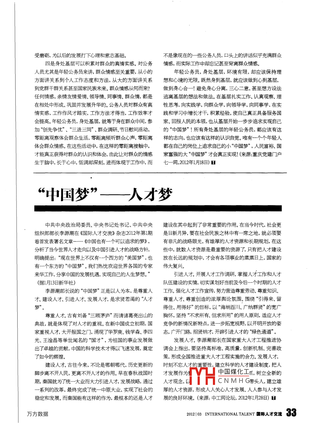 受磨礪,為以后的發(fā)展打下心理和意志基礎。不是像現(xiàn)在的一些公務人員,口頭上的講話似乎充滿群眾四是身處基層可以積累對群眾的真情實感。對公務情感,而實際工作中卻忘記甚至背離群眾情感。員尤其是年輕公務員來講,群眾情感至關重要,從小的年輕公務員,身處基層,環(huán)境有限,卻應該保持理方面講關系到個人工作態(tài)度和方法,從大的方面講關系想和心境的無限。既然身到基層,就應該做到心到基層,到黨群干群關系甚至國家民族未來。群眾情感從何而來?做到身心合一!避免身心分離,三心二意,甚至想方設法任何情感,親情友情愛情、領導情、同事情、群眾情,都是逃離基層的想法和做法。在基層扎實工作、認真觀察、理在相處中形成、鞏固并發(fā)展升華的。公務人員對群眾有真性思考,向?qū)嵺`學,向群眾學,向領導學,向同事學,在實情實感,工作作風才踏實,工作方法才得當,工作效率才踐和學習中增長才干,積累經(jīng)驗,使自己真正具備服務國會提高。年輕公務員,身處基層,就等于身在群眾中間,參家、回報人民的本領,也從基層開始一步步追求實現(xiàn)自己加“創(chuàng)先爭優(yōu)”、“三進三同”、群眾調(diào)研、節(jié)日慰間活動,的“中國夢”!所有身處基層的年輕公務員,都應該有這零距離觀察體會群眾生活,零距離傾聽群眾心聲,零距離樣的志向,也應該有這樣的認識自覺。唯有一個個年輕人體會群眾情感。在這些活動中,在這樣的零距離接觸中,都在自己的崗位上追求自己的小“中國夢”,人民富裕、國才能真正獲得對群眾的認識和體會,由此讓對群眾的情感家富強的大“中國夢”才會真正實現(xiàn)!(來源重慶黨建門戶生于腦中,長于心中,低調(diào)卻深刻,進而體現(xiàn)于工作中,而七一網(wǎng),2012年月18日)“中國夢”—人才夢中共中央政治局委員、中央書記處書記、中共中央建設在其中起到了非常重要的作用。在當今時代,社會更組織部部長李源潮在《國際人才交流》雜志2012年第1期是日新月異,要在社會民族之林中有一席之地,就必須要卷首發(fā)表署名文章——《中國也有一個可以追求的夢》,有非凡的戰(zhàn)略眼光,有雄厚的人才資源和長期規(guī)劃,在這分析了當今世界人才走向以及中國引進人才的戰(zhàn)略方針,些中,就數(shù)人才資源是最重要的資源了,只有把人才建設明確提出:“現(xiàn)在世界上不僅有一個西方的“美國夢”,也放在長遠的規(guī)劃中,才會有各項事業(yè)的蒸蒸日上,國家的有一個東方的“中國夢”。我們熱忱歡迎世界各國的專家偉大復興來華工作,分享中國的發(fā)展機遇,實現(xiàn)自己的人生夢想。引進人才。開展人才工作調(diào)研,掌握人才工作和人才(據(jù)1月13日新華社)隊伍建設的實情,切實謀劃好當前及今后一個時期的人才李源潮部長說的“中國夢”正是以人為本,是尊重人工作。強化人才工作宣傳努力營造尊重芳動、尊重知識才、建設人才、引進人才、發(fā)展人才,是求賢若渴的人才尊重人才、尊重創(chuàng)造的濃厚輿論氛圍。圍繞“引得來、留得住、用得好”的目標,以“海納百川、廣納群賢”的寬廣尊重人才。古有劉備“三顧茅廬”而請諸葛亮出山的胸懷,堅持“不求所有、但求所用”的用人原則,適應人才典故,就是體現(xiàn)了對人才的重視。在新中國成立初期,國競爭的新情況新特點,進一步拓寬視野,以開明開放的姿家重視人才,大開報國之門,涌現(xiàn)了華羅庚、錢學森、李四態(tài),廣開門路,招賢納才,開辟引進人才的“綠色通道”。光、王淦昌等舉世聞名的“國才”,為祖國的事業(yè)發(fā)展做發(fā)展人才。李源潮部長在國家重大人才工程推進協(xié)出了卓越的貢獻,中國的科學技術才得以飛速發(fā)展,奠定調(diào)會上指出,要堅持高標準、高質(zhì)量,創(chuàng)新機制、完善政了如今的輝煌。策,形成全國推進重大人才工程實施的合力。發(fā)展人才,建設人才。古往今來,不論是哪朝哪代,歷史更新的時刻不忘人才的重要性,建立科學的人才建設制度,把人腳步離不開人民,更離不開人才的作用。早在春秋戰(zhàn)國時才發(fā)展作為中國煤化工抓,樹立全新的期,秦國就為了統(tǒng)一大業(yè)而大力引進人才,發(fā)展戰(zhàn)略,通過人才觀念,以CNMHG帶頭人,建立雄系列的改革,最終完成了統(tǒng)一中原大業(yè),實現(xiàn)了社會的厚的人才資源,形成人人關心人才發(fā)展、人人參與人才發(fā)穩(wěn)定和發(fā)展。而秦國能有這樣的作為,最根本的還是人才展的良好環(huán)境。(來源:中工網(wǎng)論壇,2012年1月28日)■20210607N0 NAL TALENT圍際人才交33