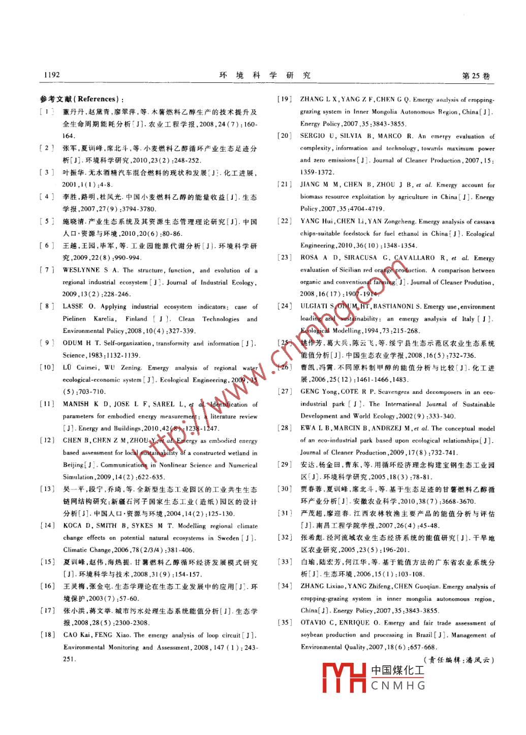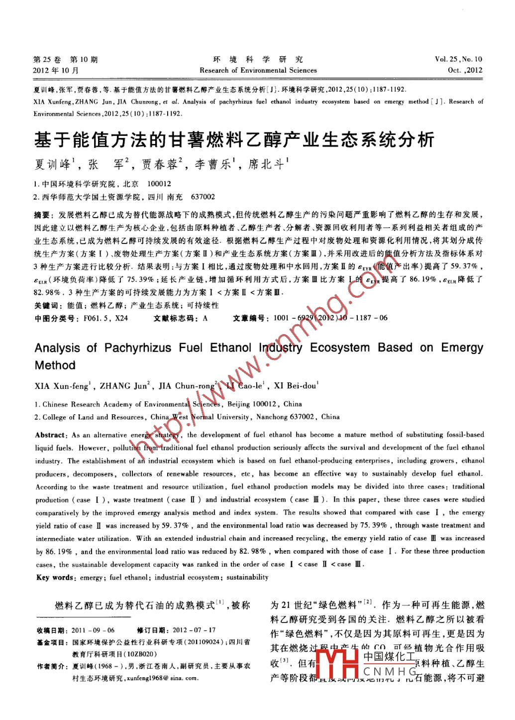 第25卷第10期環(huán)境科學(xué)研究Vol 25. No. 10012年10月Research of Environmental sciences0ct.,2012夏訓(xùn)峰,張軍,賈春蓉,等.基于能值方法的甘薯燃料乙醇產(chǎn)業(yè)生態(tài)系統(tǒng)分析[J}.環(huán)境科學(xué)研究,2012,25(10):1187-1192XIA Xunfeng, ZHANG Jun, JIA Chunrong, et aL. Analysis of pachyrhizus fuel ethanol industry ecosystem based on emergy method J]. Research ofEnvironmental Sciences, 2012, 25(10): 1187-1192基于能值方法的甘薯燃料乙醇產(chǎn)業(yè)生態(tài)系統(tǒng)分析夏訓(xùn)峰',張軍2,賈春蓉2,李曹樂1,席北斗1.中國環(huán)境科學(xué)研究院,北京1000122.西華師范大學(xué)國土資源學(xué)院,四川南充637002摘要:發(fā)展燃料乙醇已成為替代能源戰(zhàn)略下的成熟模式,但傳統(tǒng)燃料乙醇生產(chǎn)的污染問題嚴(yán)重影響了燃料乙醇的生存和發(fā)展因此建立以燃料乙醇生產(chǎn)為核心企業(yè),包括由原料種植者、乙醇生產(chǎn)者、分解者、資源回收利用者等一系列利益相關(guān)者組成的產(chǎn)業(yè)生態(tài)系統(tǒng),已成為燃料乙醇可持續(xù)發(fā)展的有效途徑.根據(jù)燃料乙醇生產(chǎn)過程中對(duì)廢物處理和資源化利用情況,將其劃分成傳統(tǒng)生產(chǎn)方案(方案I)廢物處理生產(chǎn)方案(方案Ⅱ)和產(chǎn)業(yè)生態(tài)系統(tǒng)方案(方案Ⅲ),并采用改進(jìn)后的能值分析方法及指標(biāo)體系對(duì)3種生產(chǎn)方案進(jìn)行比較分析結(jié)果表明:與方案I相比,通過廢物處理和中水回用,方案Ⅱ的s(能值產(chǎn)出率)提高了59.37%,επ(環(huán)境負(fù)荷率)降低了75.39%;延長產(chǎn)業(yè)鏈,增加循環(huán)利用方式后,方案Ⅲ比方案Ⅰ的εεγ提高了86.19%,εε降低了8298%,3種生產(chǎn)方案的可持續(xù)發(fā)展能力為方案I<方案Ⅱ<方案Ⅲ關(guān)鍵詞:能值;燃料乙醇;產(chǎn)業(yè)生態(tài)系統(tǒng);可持續(xù)性中圖分類號(hào):F061.5,X24文獻(xiàn)標(biāo)志碼:A文章編號(hào);1001-6929(2012)10-1187-06Analysis of Pachyrhizus Fuel Ethanol Industry Ecosystem Based on EmergyMethodXIA Xun-feng, ZHANG Jun, JIA Chun-rong, LI Cao-le', XI Bei-dou1. Chinese Research Academy of Environmental Sciences, Beijing 100012, China2. College of Land and Resources, China West Normal University, Nanchong 637002, ChinaAbstract: As an alternative energy strategy, the development of fuel ethanol has become a mature method of substituting fossil-basedliquid fuels. However, pollution from traditional fuel ethanol production seriously affects the survival and development of the fuel ethanolndustry. The establishment of an industrial ecosystem which is based on fuel ethanol-producing enterprises, including growers, ethanolroducers, decomposers, collectors of renewable resources, etc, has become an effective way to sustainably develop fuel ethanolAccording to the waste treatment and resource utilization, fuel ethanol production models may be divided into three cases: traditionalproduction (case I), waste treatment case I) and industrial ecosystem( case I). In this paper, these three cases were studiedcomparatively by the improved emergy analysis method and index system. The results showed that compared with case I, the emergyyield ratio of case I was increased by 59. 37%, and the environmental load ratio was decreased by 75. 39%, through waste treatment andintermediate water utilization. With an extended industrial chain and increased recycling, the emergy yield ratio of case Il was increasedby 86. 19%, and the environmental load ratio was reduced by 82.98%, when compared with those of case I. For these three prcases, the sustainable development capacity was ranked in the order of case I