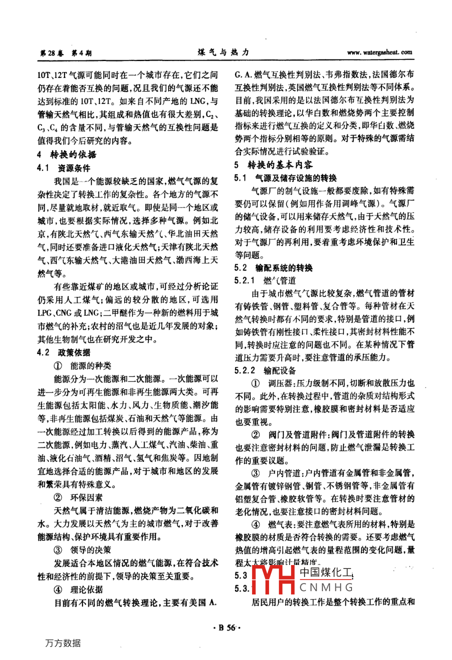 第28卷第4期煤氣與熱力2008年4月gas heatApr.2008燃?xì)夤こ探ㄔO(shè)與發(fā)展st8et88s8s8s888中國城市天然氣轉(zhuǎn)換綜述王啟,高文學(xué)(中國市政工程華北設(shè)計(jì)研究院煤氣設(shè)計(jì)研究所,天津300384)摘要:分析了我國城市天然氣的現(xiàn)狀和發(fā)展趨勢,闡述了城市燃?xì)廪D(zhuǎn)換的方向及轉(zhuǎn)換工作的基本內(nèi)容和流程??偨Y(jié)了適合我國國情的天然氣轉(zhuǎn)換經(jīng)驗(yàn),提出了天然氣轉(zhuǎn)換時(shí)應(yīng)注意的問題關(guān)鍵詞:城市然氣;天然氣轉(zhuǎn)換;轉(zhuǎn)換方法中圖分類號(hào):TU996文獻(xiàn)標(biāo)識(shí)碼:A文章編號(hào):1000-4416(2008)04-0B54-0Overview on City Natural Gas Conversion in ChinaWANG Qi, GAO Wen-xueAbstract: The present status and development tendency of city natural gas in China are analyzedand the direction, basic content and process of city gas conversion are expatiated. The natural gas conver-sion experiences suitable for Chinese situation are summarized, and the problems to which attentionshould be paid in natural gas conversion are put forwardKey words: city gas; natural1天然氣時(shí)代的到來我國隨著西氣東輸工程的全面竣工和投入使20世紀(jì)50年代以后,一些發(fā)達(dá)國家已在開發(fā)用海上天然氣登陸,川氣東輸油田伴生氣就近供或進(jìn)口天然氣進(jìn)行人工煤氣或液化石油氣向天然應(yīng),LNG引進(jìn),以及俄氣南下等項(xiàng)目的加速建設(shè)和氣的轉(zhuǎn)換。到20世紀(jì)80年代轉(zhuǎn)換工作基本結(jié)束,籌備,一幅橫跨大陸東西,連接沿海縱貫?zāi)媳钡奶旎具M(jìn)入了使用天然氣的時(shí)代。表1是部分國家實(shí)然氣框架藍(lán)圖已經(jīng)呈現(xiàn)出來這必然為我國城市燃現(xiàn)天然氣轉(zhuǎn)換時(shí)間。氣的發(fā)展提供可靠的保障和難得的機(jī)遇。表1部分國家天然氣轉(zhuǎn)換時(shí)間1999我國天然氣產(chǎn)量達(dá)234.37×103m3/a,國家實(shí)現(xiàn)天然氣轉(zhuǎn)換時(shí)間氣源2000年產(chǎn)量達(dá)204.60×103m3/a,001年產(chǎn)量達(dá)美國1945年-1958年管道天然氣為主30302×103m3/a,2002年繼續(xù)高速增長,產(chǎn)量達(dá)前蘇聯(lián)1948年-1%年管道天然氣為主328.14×103m3/a,2003年產(chǎn)量約341.28×103m37英國1964年-19年前期用LNG,后期用管道天然氣a,2004年產(chǎn)量達(dá)356×10m3/a。200年產(chǎn)量約法國1962年-1982年LNG與管道天然氣」499.50×103m3/a,200年產(chǎn)量達(dá)585.50x10°m3/a德國1960年190年以管道天然氣為主,截至2005年底,全國天然氣管道總長度約28少量LNG澳大利亞1976年-1986年管道天然氣x104km,其中管徑大于426mm的管道總長度為日本「199年-18年1.7×10km。中國煤化工惠度將明顯超過煤CNMHG基金項(xiàng)目:“十一五”國家科技支計(jì)劃課題(2006BAJ03B02)B54www.watergasheat.com王啟,等:中國城市天然氣轉(zhuǎn)換綜述第28卷第4期炭和石油。到2010年,天然氣在能源需求總量中所我國城市燃?xì)夥诸惖脑瓌t和依據(jù)是以燃?xì)獾娜A占比例將從1998年的2.1%增加到6.0%,到200白數(shù)為主,兼顧燃?xì)獾娜紵齽?基本體現(xiàn)了同類燃?xì)饽陮⑦M(jìn)一步增至10.0%。屆時(shí)天然氣需求量估計(jì)的互換性原則將分別達(dá)到938×103m3/a和2037×103m3/a我國城市燃?xì)獾姆诸惡图夹g(shù)要求詳見《城鎮(zhèn)燃2我國城市燃?xì)獾默F(xiàn)狀氣分類和基本特性》標(biāo)準(zhǔn)。我國的天然氣氣源也①城市燃?xì)夥诸惣皻庠吹男阅軈?shù)非常復(fù)雜,表2是我國各地的天然氣參數(shù)表2我國各地的天然氣參數(shù)體積分?jǐn)?shù)商熱值低熱位華自數(shù)相對(duì)甲烷乙烷丙烷異丁烷正丁烷戊烷氮?dú)馍涎趸糾)陜甘寧天然氣9470050081000010003.63820344750.2637890.578塔里木天然氣%2717|0.3000600801313940.2736.365299|39.850.578廣西北海天然氣80.3812481.800080.1100650943.16392146853030849成都天然氣9150.250010.000.00003593847347050938420.570忠武線輸送天然氣9001:50050000000000100401832753.164090571東海天然氣|88.486.680.350.000.000.00428364051.839390.60青島天然氣9561.340.3002000016039893668527397140742昌邑天然氣98.060.22|0120130001473947356152.58|39560729渤海夫然氣83578.08008444133702339南海東方1-177521.500290.070.0331.7028.603420天然氣②各種燃?xì)獾谋壤蕿?2.2%,比上年增加了0.7個(gè)百分點(diǎn)。當(dāng)前城建設(shè)部《2005年城市建設(shè)統(tǒng)計(jì)公報(bào)》顯示:到市燃?xì)庑袠I(yè)正處在一個(gè)大發(fā)展時(shí)期,人工煤氣和液00年末,我國設(shè)市城市共64個(gè),城市人口為化石油氣作為城市燃?xì)庵饕獨(dú)庠吹木置鎸㈦S著天35894×10人。2005年,在城市用氣總量中,人工煤氣供應(yīng)總量為255.8×10°m3/a,天然氣供應(yīng)總量然氣在城市燃?xì)庵械难杆僭鲩L發(fā)生根本性轉(zhuǎn)變。為210.5×103m3/a,液化石油氣供應(yīng)總量為122③各種燃?xì)獾陌l(fā)展趨勢10kg/a。各種燃?xì)馑急壤?按熱量計(jì))大致根據(jù)有關(guān)部門的統(tǒng)計(jì),我國近年來的城市燃?xì)鉃?人工煤氣為25%,液化石油氣為32%,天然氣為發(fā)展的歷史數(shù)據(jù)表明,天然氣的應(yīng)用增長速度比較43%。城市用氣人口為29488x×10人,燃?xì)馄占翱?。近年來的城市燃?xì)庥脷饬恳姳?。表3我國近年來的城市燃?xì)庥脷饬磕攴?995年196年1997年1998年199年人工煤氣用氣量/(m3·a-1)127×103135x103126×103167×103132x103152×105天然氣用氣量/(m3·al67×1064×10°66×0「6×10·80×o:2×10液化石油氣用氣量/(t·a49×10·56×1055×