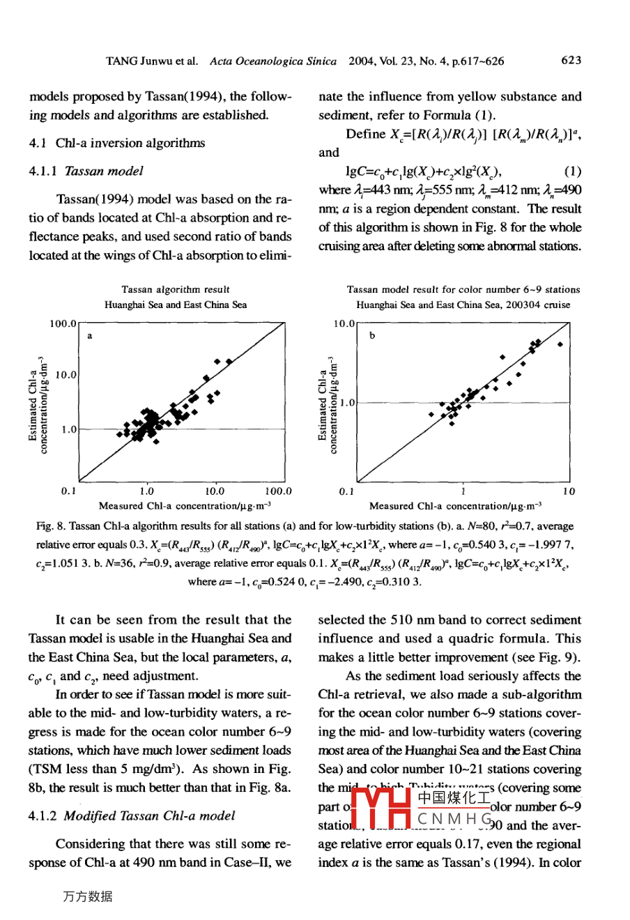 Acta Oceanologica Sinica 2004, Vol. 23, No. 4, p.617~626http://www .oceanpress.com.cnE- mail:hyxbe@263.netThe statistic inversion algorithms of water constituentsfor the Huanghai Sea and the East China SeaTANG Junwu', WANG Xiaomei, SONG Qingjun', LI Tongji?,CHEN Jiezhong', HUANG Haijun', REN Jingping41. National Satellite Ocean Application Service (NSOAS), State Oceanic Administration, Beijing 100081, China2. National Ocean Technology Center(NOTC), State Oceanic Administration, Tianjin 3001 11, China3. Hong Kong University of Science and Technology, Hong Kong, China4. Institute of Oceanology, Chinese Academy of Sciences, Qingdao 266071, ChinaReceived 11 March 2004; accepted 20 August 2004AbstractA group of statistical algorithms are proposed for the inversion of the three major components of Case -II waters inthe coastal area of the Huanghai Sea and the East China Sea. The algorithms are based on the in situ data collected inthe spring of 2003 with strict quality assurance according to NASA ocean bio optic protocols. These algorithms arethe first ones with quantitative confidence that can be applied for the area. The average relative error of the inversedand in situ measured components' concentrations are: Chl-a about 37%, total suspended matter (TSM) about 25%,respectively. This preliminary result is quite satisfactory for Case II waters, although some aspects in the modelneed further study. The sensitivity of the input error of 5% to remote sensing reflectance (Rrs) is also analyzed andit shows the algorithms are quite stable. The algorithms show a large difference with Tassan' s local SeaWiFSalgorithms for different waters, except for the Chl-a algorithm.Key words: ocean color sensing, Case -II water algorithms, statistic model1 Introductionwaters, and no universal Case -II model is avail-able so far. Another reason is that the standardThe inversion of constituents' concentra-atmospheric correction algorithm suitable totions for Case -II waters is one of the difficultCase -I waters fails over Case -II waters to sepa-tasks and also a hot topic of ocean color sens-rate accurately the aerosol scattering and wa-ing (Sathyendranath, 2000). The reasons areter-leaving radiance signals, because the Wa-multifold. One is the intrinsic complexity ofter-leaving radiances in NIR bands are not 0.the Case- -II waters. Many independently vari-The operational Case -II atmospheric correc-able components with variable localized param-tion中國(guó)煤化工ccuracy and adapt-eters influence the optic characteristics of theabilTYHCNMHG:aters has not been* Corresponding author, E- mail: jwtang@mail.nsoas.gov.cnIn China, the development of Case -II wa-618TANG Junwu et al. Acta Oceanologica Sinica 2004, Vol. 23, No. 4, p.617-626ter color sensing has also been retarded by theneuron network (NN), optimization and princi-measurement technologies until recently. In thepal component analysis (PCA), etc. Because ofyear 2000, under the support of HY-1(firstthe difficulties in Case- -II water atmosphericmarine satellite of China, means Ocean-1) sat-correction, some researchers proposed theellite ground application system, the Nationalmethod of direct inversion with top-of- atmo-Satellite Ocean Application Service (NSOAS)sphere ocean color signals with NN or optimi-invested about half million US dollars to importzation technologies based on the fact that aero-ocean color and bio- optic instruments of firstsol scatterings of different bands are followingclass and state-of art performance in the world.a much simple or“l(fā)at" way in most atmosphereAfter more than 3 a persistent efforts to im-conditions (Lee et al., 2003; Doerffer andprove the technologies of in situ measurements,Schiller, 1998; Lee et al, 2002).data processing and analysis, the quality of quan-Tassan (1994) proposed a set of empiricaltitative ocean color data set, including opticlocal algorithms for the coastal waters of theproperties and the three major constituents' con-Gulf of Naples in the Mediterranean Sea to re-centrations (Chl-a, suspended matter, the yel-trieve the concentrations of the three majorlow substance), has been improved greatly andcomponents, chlorophyll-a, suspended sedimentmade it possible for us to establish local algo-and the yellow substance or CDOM. The bands'rithms in typical China coastal waters.selection and combination are derived by theCase-II water algorithms can be classi-AOPs spectra and the IOPs features of differ-fied into three types (Sathyendranath, 2000):ent components, so the model is of good guid-(1) Empirical algorithms, which are tradition-ance to other waters. The algorithms proposedally band ratios and regression based algorithmsin this paper are partly learnt from Tassan'sand regress directly the apparent optic proper-models.ties (AOPs) or AOPs' ratios, such as water-leaving radiances, remote sensing reflectance2 Cruise area and data setor diffuse reflectance, with concentrations ofwater constituents. Although the model's gen-The Huanghai Sea and the East China Seaerality and adaptability to diverse Case -II wa-Case- -II spring cruise was carried out in Aprilter bodies are limited, it may be the most prac-2003. See Fig.1 for the cruise area and casttical and applicable one before we can obtainstations.better inherent optic properties (IOPs) and ana-The data set and the measurement tech-1ytical algorithms; (2) semi- analytical algo-nologies are given below. Most of the measure-rithms, which are based on the geophysical re-ments were taken by strictly following NASAlations of the IOPs and water components'SIMBIOS ocean optic protocols (Mueller andconcentrations, combining with some empiri-Fargion, 2002).cal relations; this type of algorithm is the most2.1中國(guó)煤化工; (AOPs)promising one in the near future but it needsaccurate measurements of the IOPs. Currently,YHC N M H Grofling and above-IOPs analyses are difficult tasks and not accu-water measurements. In the high turbidity watersrate enough