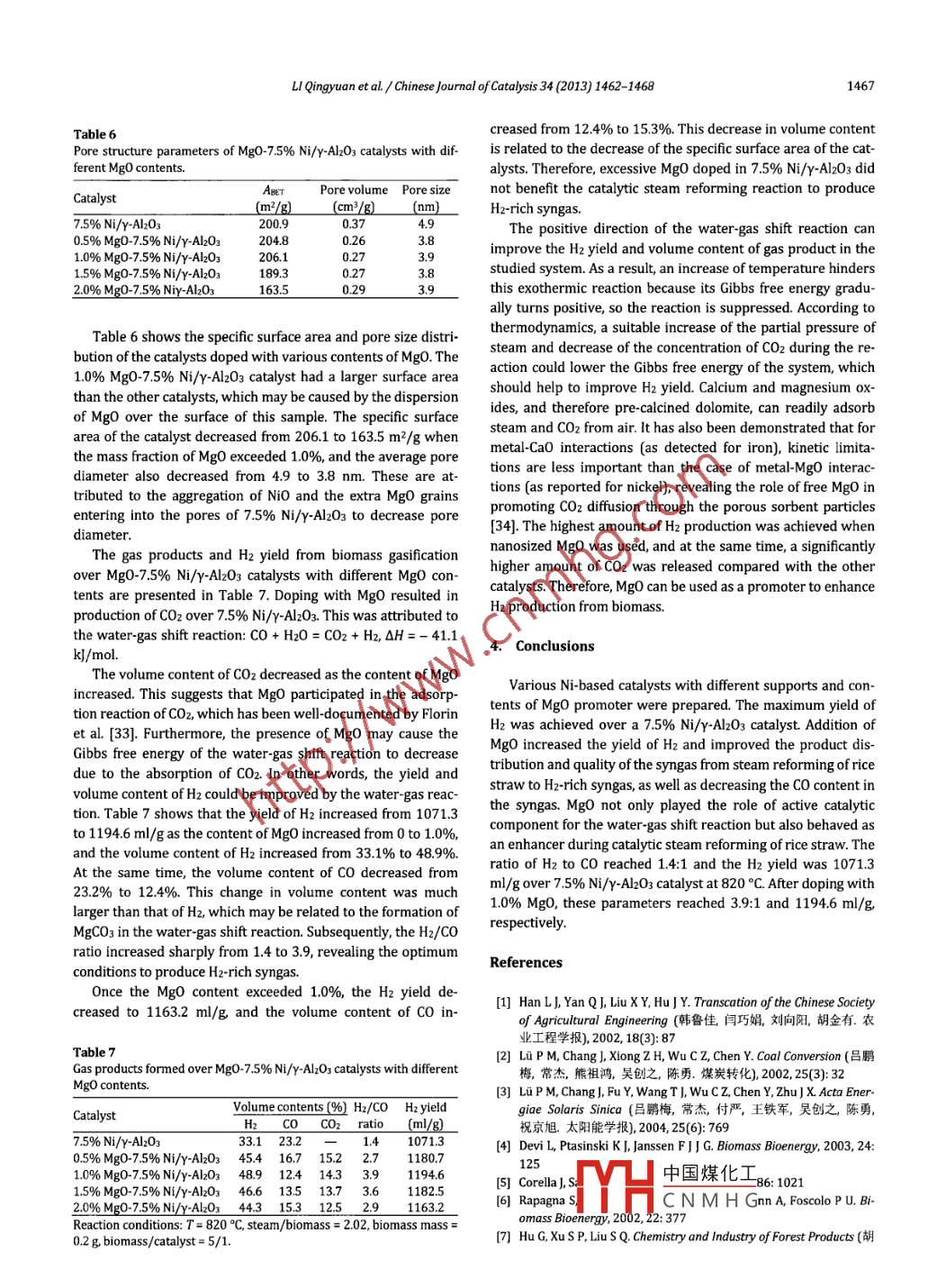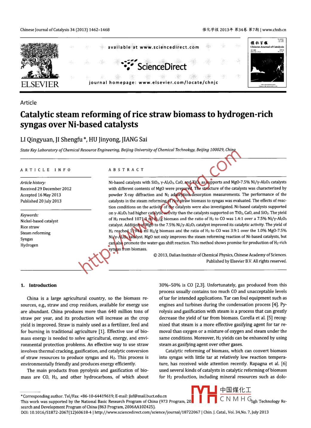 Chinese Journal of Catalysis 34 (2013) 1462-1468催化學報2013年第34卷第7期Iwww.chxb.cn信化了availableatwww.sciencedirect.comChinese Journai of CatalysisSciencedirectELSEVIERjournalhomepagewww.elsevier.com/locate/chnjcArticleCatalytic steam reforming of rice straw biomass to hydrogen-richsyngas over Ni-based catalystsLI Qingyuan, JI Shengfu*, HU Jinyong, JIANG SaiState Key Laboratory of Chemical Resource Engineering, Beijing University of Chemical Technobgy, Beijing 100029, ChinaARTICLE IN F OA B STRACTArticle history:Ni-based catalysts with SiOz, Y-Al2O3, CaO, and TiOz as supports and Mg0-7.5% Ni/y- 03 catalystsReceived 29 December 2012with different contents of Mgo were prepared. The structure of the catalysts was characterized byAccepted 16 May 2013powder X-ray diffraction and Nz adsorption-desorption measurements. The performance of thePublished 20 July 2013catalysts in the steam reforming of rice straw biomass to syngas was evaluated. The effects of reac.tion conditions on the activity of the catalysts were also investigated Ni-based catalysts supportedeywords:on y-Al203 had higher catalytic activity than the catalysts supported on TiOz, CaO, and SiOz. The yieldickel-based catalystof H2 reached 1071.3 ml H2/g biomass and the ratio of Hz to Co was 1.4: 1 over a 7.5%Ni/Y-Al203Rice strawcatalyst Addition of Mgo to the 7.5% Ni/Y-Al203 catalyst improved its catalytic activity. The yield ofSteam reforminH2 reached 1194.6 ml Hz/g biomass and the ratio of H2 to CO was 3.9: 1 over the 1.0% Mg0-7.5%Ni/y-Al2O3 catalyst Mgo not only improves the steam reforming reaction of Ni-based catalysts, butcan also promote the water-gas shift reaction. This method shows promise for production of Hz-richsyngas from biomass@2013, Dalian Institute of Chemical Physics, Chinese Academy of SciencesPublished by Elsevier B V. All rights reserved.1. Introduction30%-50% is CO [2, 3 ]. Unfortunately, gas produced from thisprocess usually contains too much CO and unacceptable levelsChina is a large agricultural country, so the biomass re- of tar for intended applications. Tar can foul equipment such assources,e.g, straw and crop residues, available for energy use engines and turbines during the condensation process [4]. Pyare abundant. China produces more than 640 million tons of rolysis and gasification with steam is a process that can greatlystraw per year, and its production will increase as the crop decrease the yield of tar from biomass. Corella et al. [5] recogyield is improved. Straw is mainly used as a fertilizer feed and nized that steam is a more effective gasifying agent for tar refor burning in traditional agriculture [1]. Effective use of bio- moval than oxygen or a mixture of oxygen and steam under theronmeney sy is needed to solve agricultural, energy, and envi- same conditions. Moreover, H2 yields can be enhanced by usingprotection problems. An effective way to use straw steam as gasifying agent over other gases.involves thermal cracking, gasification, and catalytic conversionCatalytic reforming of biomass, which can convert biomasf straw resources to produce syngas and H2. This process is into syngas with little tar at relatively low reaction tempera-environmentally friendly and produces energy efficientlyture, has received wide attention recently. Rapagna et al.[6]The main products from pyrolysis and gasification of bio- used several kinds of catalysts in catalytic reforming of biomassmass are CO, H2, and other hydrocarbons, of which about for H2 production, including mineral resources such as dolo中國煤化工Corresponding author. Tel/Fax: +86-10-64419619; E-mamail. buctedu cnThis work was supported by the National Basic Research Program of China(973 Program, 20lHCNMHGgh Technology re-search and Development Program of China(863 Program,102425)Dol:10.1016/s1872-2067(12)60618-4ihttp://www.sciencedirect.com/science/journal/18722067IcHin.J.CatalvOl.34,No.7,July2013LI Qingyuan et al Chinese Journal of Catalysis 34(2013) 1462-14681463mite,magnesite, zeolite, and olivine, as well as Ni-based and Chemical Industrial Co., China), or Cao (Tianjin Fuchen Cheminoble metal catalysts. Dolomite is the most commonly used cal Reagents Factory, China) was added to an aqueous solutioncatalyst of this group because it is cheap and has a tar removal of Ni(NO3)2( Beijing Yili Fine Chemical Co., Ltd. Each mixturefunction. Despite its high catalytic activity, dolomite has some was stirred to form a uniform slurry and then left undisturbeddisadvantages such as low mechanical strength, which restricts at room temperature overnight. The samples were dried at 110its further application [7]. Ni-based catalysts have been used C for 12 h and then calcined at 550C for 5 h in air to give 7.5extensively for gasification, tar conversion, and reforming light wt% Ni-based catalysts on different supports. The same meth-hydrocarbons because of their high tar destruction activity and od was used to prepare Ni/y-Al203 catalysts with Ni contentsability to improve the content of syngas in the produced gas ranging from 2.5 wt% to 15 wt%. Mg0-7.5%Niyy-Al203 cata[8-13]. However, the rapid deactivation of Ni-based catalysts lysts with Mgo loadings of 0.5 wt%-20 wt% were also pre-by carbon deposition and sintering of active Ni particles seri- pared by incipient wetness impregnation. First, a Ni/y-Alz03ously impede their application. For these reasons, many novel precursor with a Ni loading of 7 5wt%was prepared. The pre-catalysts have been developed for gasification of biomascursor was then impregnated with mg(NO3)2 solution. Finally,Wang et al. [ 14] investigated biomass air-steam gasification the catalyst was dried at 100C overnight and calcined at 550in a bubbling bed biomass gasifier with Nio-Mgo as a catalyst. C for 5 h in airThey found that their Nio-Mgo catalyst showed better catalyticactivity and anti-coke ability at high temperature( 750C) 2. 2. Catalyst characterizationthan a commercial Ni-based reforming catalyst. Nakamura