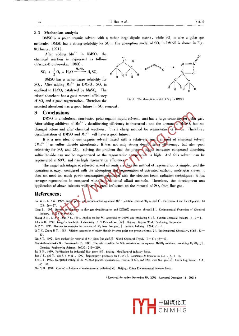 Journal of Entiratental Sciences Vul. 15, No. 1. pp 92-96. 2003Article D:10O10742(203)01409205CLC number: X511 Document code: ADesulfurizing absorbent for flue gas and its absorption mechanismLI Hua", CHEN Wan-ren, LIU Da-zhuang(I Chemical Engineering College, Zhengzhou University, Zhenghou 450002, China. E- mail: Lihua e zzu, edu. en; li husa(e wohu.con:Abstract: A new desulfurizing absorbent for flue gassmall amount of chemical solvent( Mn2.)was studiedabsorbent was improved. And its absorption and reaction mechanism are discussedKeywords: liquid absorption; desulfurization: nue gasIntroductionRemoval of SO,, CO, and other acidic gas from nue gas is one of very important research pnthe world. In order to find effective method, various desulfurization technique( Zhu, 1998; Li, 1996Lin, 1992; Chen, 1997; Tai, 1999; Yeh, 1992; Tan, 1999 ), such as activated carbon, molecularsieve,the electron-beam radiation technique, chemical method, physical solvents etc. are all attemptedompared with these methods, organic solvent absorption has some advantages as low investment, high SO,absorption efficiency and desorption efficiency and worth to further research. In this paper, we study andselect a liquid organic absorbent with a high absorption and desorption efficiency for high selectivity to SOwith low toxicity and low price, And this absorbent will be used to remove SO, from nue gas to solveindustrial problem for flue gas purification1 EThe experiment includes two sections: (1)the solubility experiments and the optimum absorbentlection;(2)technological conditio1.1 Experimental apparatusThe apparatus for So, solubility and regeneration(Li, 1987). The technological process is shown in Fig.A1「掉Theahsrinoapraasotctrolgalcondtionisana l tAs absorption lube with sandglass. The sulfur dioxide with anole fraction purity x(S02)>0. 997, pure nitrogenwith a purity×(N2)≥0.9999 are both frumcylinders. The sulfur dioxide and nitrogen are mixed by agas mixer with static agitation unil lo simulate the fluegas. A flowrator is used to control the flow. The S0analyzer with SO2 sensor( type NTS 100, Nanjing. ChinaFig. I The technological proress of sow器sused for the SO2 analysis ofCI: $0,cylinder:C2:N,cylinder:B1-B2: walve: A1-feed gas and the tail gas. The SO, concentralion in the gas1. a gas mixer with statie agitation unit: 2, absorption tube;phase before and after3. constant temperature bath: 4. inlet gas to $ 2 analyser; analyzer, then the purification efficiency is calculated5, outletFoundation item: The Key Project of Science and Technology of Henan Province, China(No. 001200420)中國煤化工CNMHGDesulfurizing absorbent for flue gas and its absorption mechanismC-CThe purification efficiency(n)is: nCo 100%, where, Co is the SO, concentration beforebsorption:C is the SO, concentration after absorption. All the chemical reagents used are AR grade. Thewater is purified and deionized with a conductivity <0. 06 js/em1. 2 Determination method0, solubility deternination: The whole apparatus is evacuated and flushed several times with nitrogento ensure complete exclusion of oxygen and carbon dioxide, then it is evacuated again, A known amount ofdegassed absorbent is sucked into the absorption tube the weight of which is initial weight W,. Put it inthe thermostatic bath, and let SO, go through the absorption lube al a rate of 25 ml/ min at differenttemperatures till its saturation( constant weight is W,)SO, solubility(gS02 /g solvent)sWhere, W, is the initial weight(g)= solvent absorption tube: W, is the end weigh(g)= solventabsorption tube+ $02: V is the solvent volume( ml ); d is the solvent density(g/ml)Desorption capacity determination: The above-mentioned saturated sulfur dioxide absorption tube( theweight is W2) is regenerated by heating at 60C and bubbling nitrogen at a rate of 25 ml/ min till a constantweight occurs( the weight is W,)W=HSo, desorption efficiency( %W2-W,X100%1.3 Test of apparatusIn ordler to ensure proper operation of Table I Comparison between experimental data for Sot solubility inthe apparatus, the solubility of so, in waterater and literature datais measured and compared with the values Temperaturereported in the literature( John, 1999)g100gl20g/100gHO Leviation,%The experimental measurements agreed with0.12the reporled values with a mean deviation of0. 67%. The measured result is listed in30Table I6,51322 Result and discussion2.1 The selection of absorbents2.1.1 Solubility and desorption of So, in difTerent solventsThe experiment results in Fig. 2 and Table 2 show that the solubilities of SO, in different solvents insequence are: DMSO> DMF DMA>SuHinol >PEG400 TBP>DEA. Thus there are goodsolubility and good regeneration for SO2 in DMSO. Therefore DMSO is fit for as a desulfurizing absorbentfor flue gas purification, and worth further studies2.1.2 The effect of additive on the removal of SO,In order to increase purification efficiency, some additives such as Fe,Mnand thiophene wereadded to liquid absorbents to test the effect of additives on SO, removalExperiment conditions: temperature: 24C, gas now rate: 80 ml/min, inlet SO,concentration0. 1798%.The experiment result is shown in Fig. 3The result mentioned above showed that the addition of Mn in DMSO can increase purificationfficiency: the addition of Fe'increases removing efficiency only at the beginning of absorption, butdecreases as the time goes: the addition of thiophene to DMSO showed negative effect on the removing中國煤化工CNMHG1. I Hua et alefficiency compared with pure DMSO. The addition of Mn"in DMSO can increase purification efficiencyTable2 SO, solubility and desorption in different solventsDMSODMAurinalPEC40020551.14200.960.40180.30250.1%.22920.【8700.87900,990,8750.13730.7890000.61220.18870.16670.1250Desorption efficieneyof so., %Notes: DMF:N. N-dimethyformamide: DMSO: dimethyl sulfoxide: DMA: N N-dimethyl acetamide: PEG400: polyethyleneglycol: TBPtributyl phosphate; DEA: diethanolamineNDMSO+MDMSO4101520SO, so
