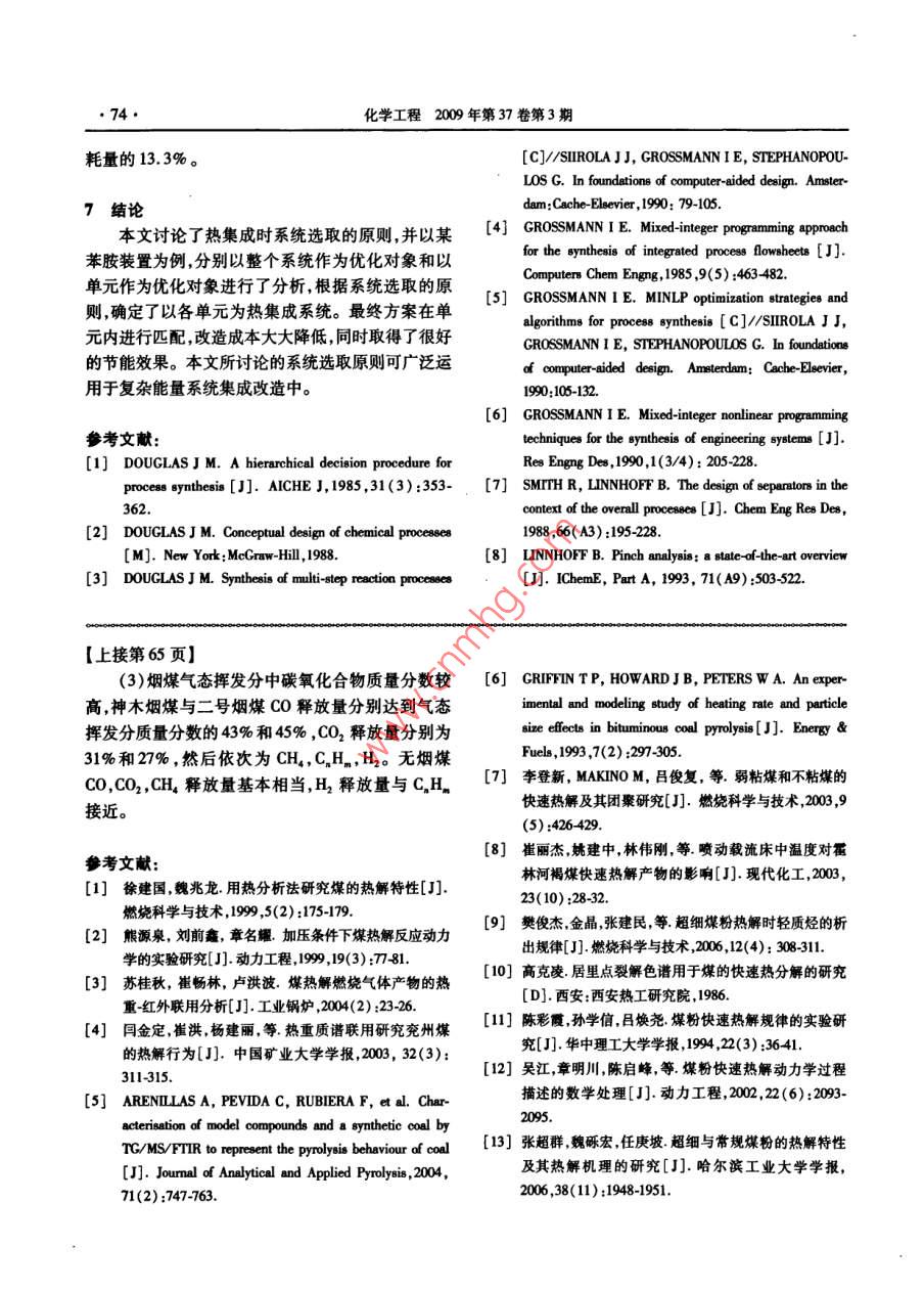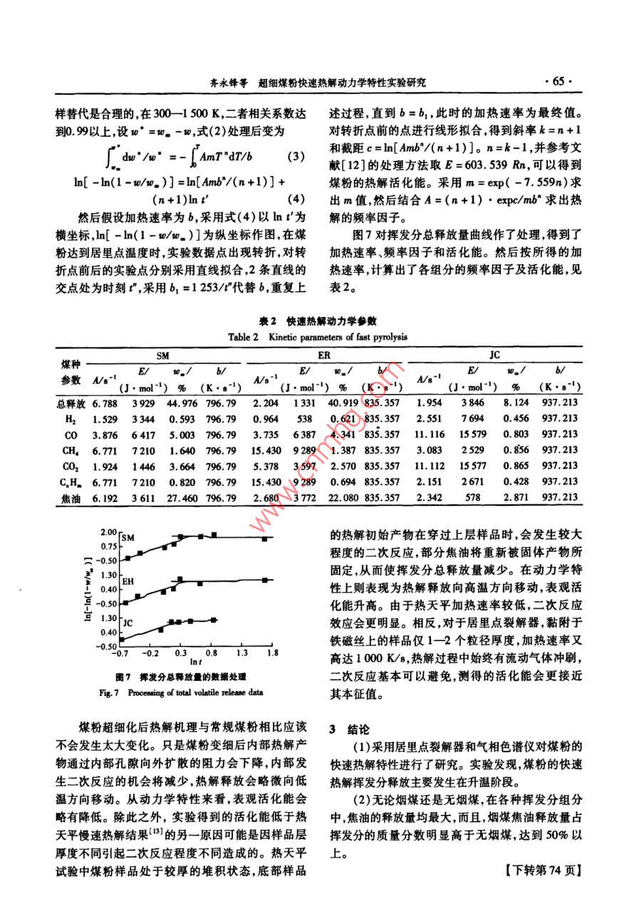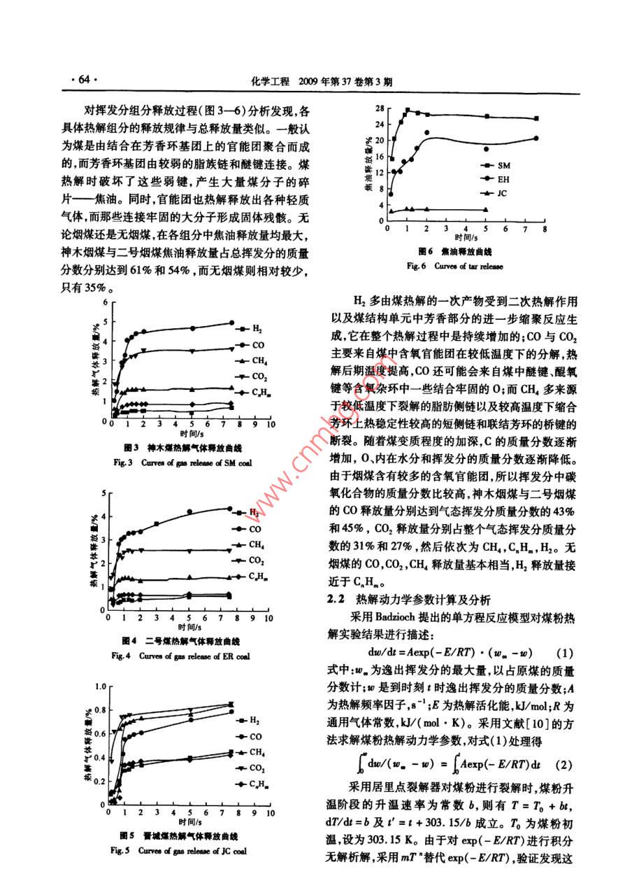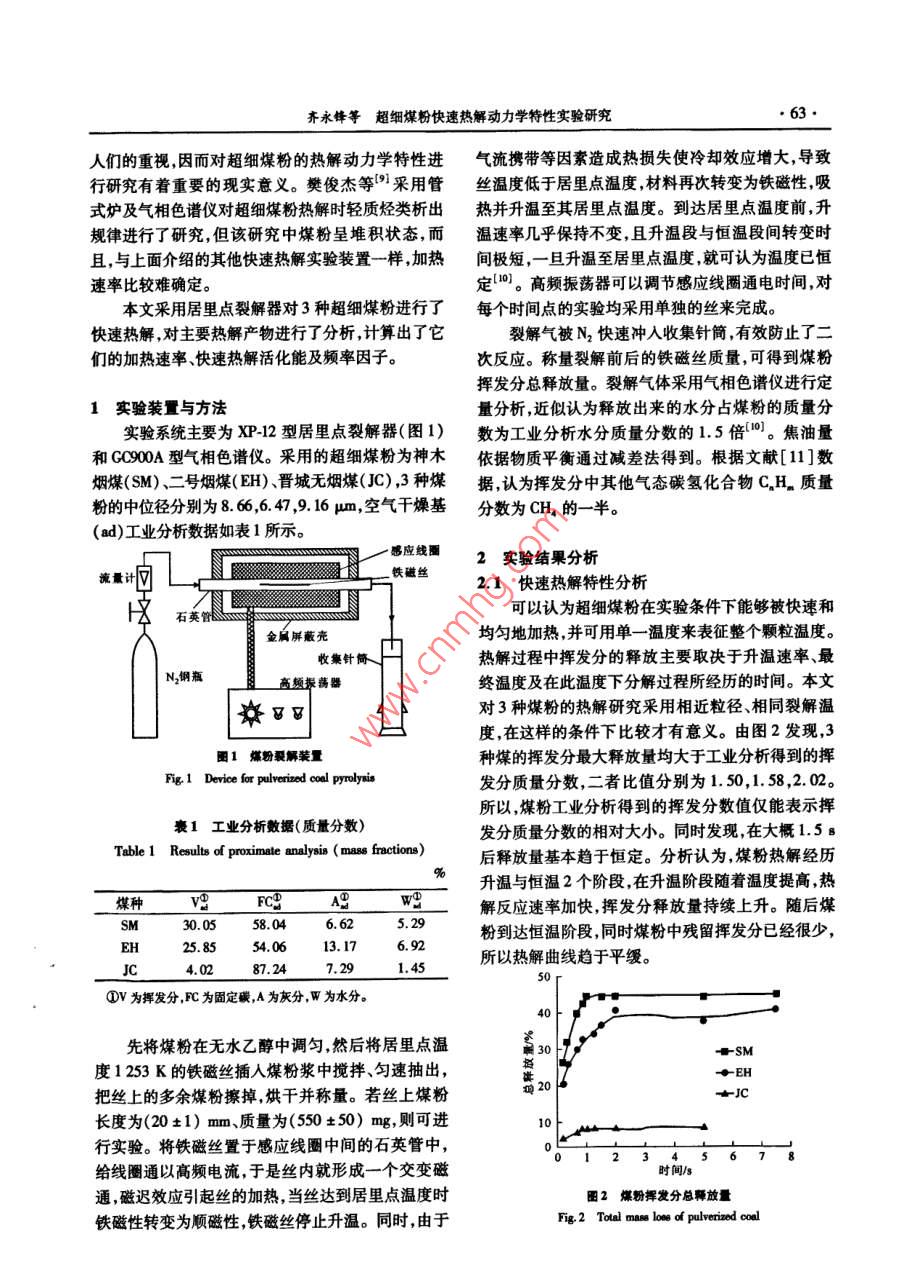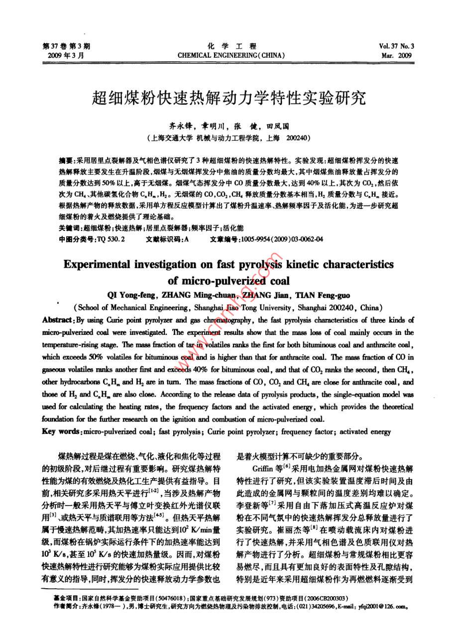 第37卷第3期化學工程VoL.37 No.32009年3月CHEMICAL ENGINEERING( CHINA)Mar.2009超細煤粉快速熱解動力學特性實驗研究齊永鋒,章明川,張健,田鳳國(上海交通大學機械與動力工程學院,上海200240)摘要:采用居里點裂解器及氣相色譜儀研究了3種超細煤粉的快速熱解特性。實驗發(fā)現(xiàn):超細煤粉揮發(fā)分的快速熱解釋放主要發(fā)生在升溫階段,煙煤與無煙煤揮發(fā)分中焦油的質(zhì)量分數(shù)均最大,其中煙煤焦油釋放量占揮發(fā)分的質(zhì)量分數(shù)達到50%以上,高于無煙煤。煙煤氣態(tài)揮發(fā)分中co質(zhì)量分數(shù)最大,達到40%以上,其次為CO2 ,然后依次為CH、其他碳氫化合物C.H. ,H2。無煙煤的CO,CO2 ,CH,釋放質(zhì)量分數(shù)基本相當,H2質(zhì)量分數(shù)與C.H.接近。根據(jù)熱解產(chǎn)物的釋放數(shù)據(jù),采用單方程反應模型計算出了煤粉升溫速率、熱解頻率因子及活化能,為進- -步研究超細煤粉的著火及燃燒提供了理論基礎。關鍵詞:超細煤粉;快速熱解;居里點裂解器;頻率因子;活化能中圈分類號:TQ 530.2文獻標識碼:A文章編號109942003-0062-04Experimental investigation on fast pyrolysis kinetic characteristicsof micro-pulverized coalQI Yong-feng, ZHANG Ming chuan, ZHANG Jian, TIAN Feng-guo( School of Mechanical Engineering, Shanghai Jiao Tong University, Shanghai 200240, China)Abstract:By using Curie point pyrolyzer and gas chromatogaphy, the fast pyrolysis characteristics of three kinds ofmicro-pulverized coal were investigated. The experiment results show that the mass los8 of coal mainly occurs in thetemperature-rising stage. The mass fraction of tar in volatiles ranks the first for both bituminous coal and anthracite coal,which exceeds 50% volatiles for bituminous coal and is higher than that for anthracite coal. The mass fraction of CO ingascous volatiles ranks another first and exceeds 40% for bituminous coal, and that of CO2 ranks the second, then CH4,other hydrocabons C,H_ and H are in tum. The mass fractions of CO, CO2 and CH are close for anthracite coal, andthose of H2 and C.H. are also close. According to the release data of pyrolysis products, the single equation model wasused for calculating the heating rates, the frequency factors and the activated energy, which provides the theoreticalfoundation for the further rearch on the ignition and combustion of micro- pulverized coel.Key words:micro-pulverized coal; fast pyrolysis; Curie point pyrolyzer; frequency factor; activated energy煤熱解過程是煤在燃燒、氣化、液化和焦化等過程是著火模型計算不可缺少的重要部分。的初級階段,對后繼過程有重要影響。研究煤熱解特Grifin等()采用電加熱金屬網(wǎng)對煤粉快速熱解性能為煤的有效燃燒及熱化工生產(chǎn)提供有益指導。目特性進行 了研究,但該實驗裝置溫度滯后時間及由前,相關研究多采用熱天平進行[12) ,當涉及熱解產(chǎn)物此造成的金屬網(wǎng)與顆粒間的溫度差別均難以確定。分析時一般采用熱天平與傅立葉變換紅外光譜儀聯(lián)李登新等7]采用自由下落加壓式高溫反應爐對煤用)、或熱天平與質(zhì)譜聯(lián)用等方法[45)。但熱天平熱解粉在不同氣氛中的快速熱解揮發(fā)分總釋放量進行了屬于慢速熱解范疇,其加熱速率只能達到102 K/min量實驗研究。崔麗杰等[8)]在噴動載流床內(nèi)對煤粉進級,而煤粉在鍋爐實際運行條件下的加熱速率能達到行了快速熱解,并采用氣相色譜及色質(zhì)聯(lián)用儀對熱10 K/s,甚至10 K/s的快速加熱量級。因而,對煤粉解產(chǎn)物進行 了分析。超細煤粉與常規(guī)煤粉相比更容快速熱解特性進行研究能夠為煤粉實際應用提供比較易燃盡,而且具有更加良好的表面特性及孔隙結(jié)構(gòu),有意義的指導,同時,揮發(fā)分的快速釋放動力學參數(shù)也特別是近年來采用超細煤粉作為再燃燃料逐漸受到荔金項目:國家自然科學基金資助項目(50476018) ;國家重點基礎研究發(fā)展規(guī)劃(973)資助項目(2006CB200303)作者簡介:齊水鋒(1978- ) ,男,博士研究生,研究方向為燃燒熱物理及污染物排放控制,電話:(021 )34205696,E-mail: yfqi2001@ 126. oom。齊永鋒等超細煤粉快速熱解 動力學特性實驗研究.63●人們的重視,因而對超細煤粉的熱解動力學特性進氣流攜帶等因素造 成熱損失使冷卻效應增大,導致行研究有著重要的現(xiàn)實意義。樊俊杰等[91 采用管絲溫度低于居里點溫度,材料再次轉(zhuǎn)變?yōu)殍F磁性,吸式爐及氣相色譜儀對超細煤粉熱解時輕質(zhì)烴類析出熱并升溫至其居里點溫度。到達居里點溫度前,升規(guī)律進行了研究,但該研究中煤粉呈堆積狀態(tài),而溫速率幾乎保持不變 ,且升溫段與恒溫段間轉(zhuǎn)變時且,與上面介紹的其他快速熱解實驗裝置一樣,加熱間極短, -旦升溫至居里點溫度,就可認為溫度已恒速率比較難確定。定10]。高頻振蕩器可以調(diào)節(jié)感應線圈通電時間,對本文采用居里點裂解器對3種超細煤粉進行了每個時間點的實驗均采用單獨的絲來完成。快速熱解,對主要熱解產(chǎn)物進行了分析,計算出了它裂解氣被N2快速沖人收集針簡,有效防止了二們的加熱速率、快速熱解活化能及頻率因子。次反應。稱量裂解前后的鐵磁絲質(zhì)量,可得到煤粉揮發(fā)分總釋放量。裂解氣體采用氣相色譜儀進行定1實驗裝置與方法量分析,近似認為釋放出來的水分占煤粉的質(zhì)量分實驗系統(tǒng)主要為XP-12型居里點裂解器(圖1)數(shù)為工業(yè)分析水分質(zhì)量分數(shù)的1.5倍0。焦油量和CC900A型