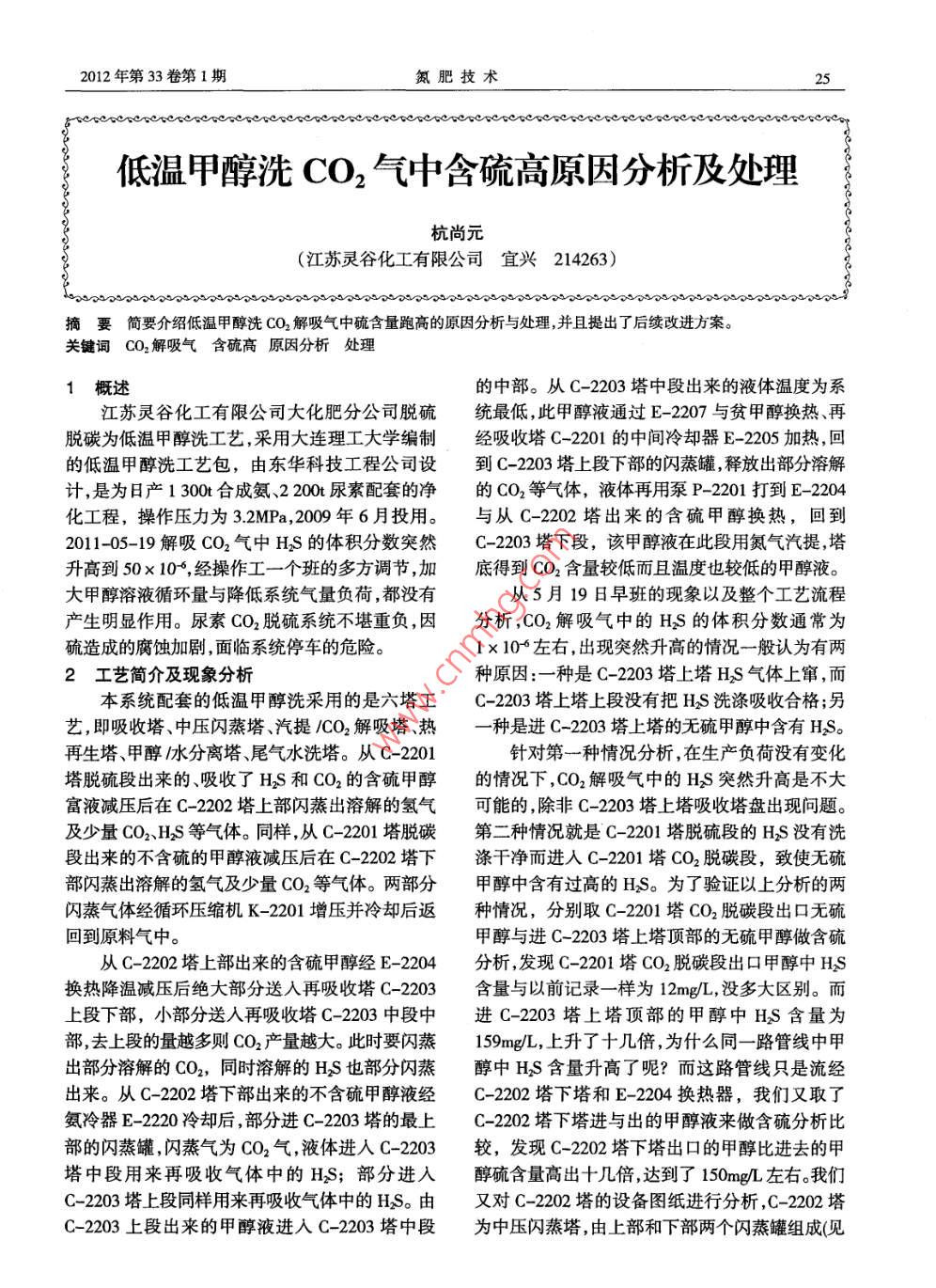 低溫甲醇洗CO2氣中含硫高原因分析及處理