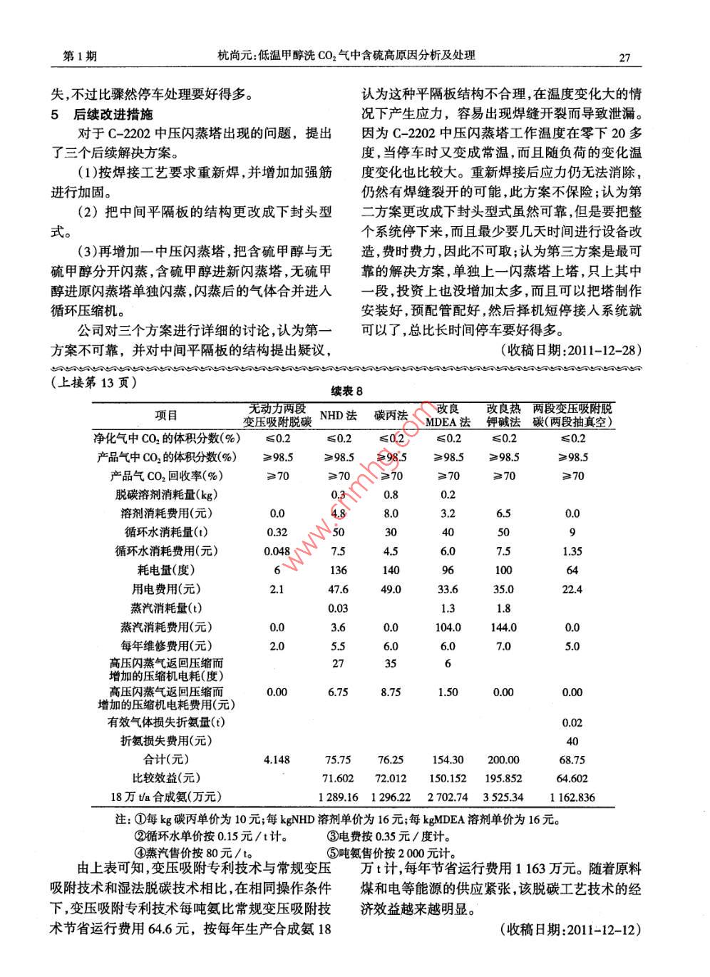012年第33卷第1期氮肥技術(shù)低溫甲醇洗CO2氣中含硫高原因分析及處理杭尚元(江蘇靈谷化工有限公司宜興214263)摘要簡要介紹低溫甲醇洗CO2解吸氣中硫含量跑高的原因分析與處理,并且提出了后續(xù)改進(jìn)方案。關(guān)鍵詞CO2解吸氣含硫高原因分析處理概述的中部。從C-2203塔中段出來的液體溫度為系江蘇靈谷化工有限公司大化肥分公司脫硫統(tǒng)最低,此甲醇液通過E-2207與貧甲醇換熱、再脫碳為低溫甲醇洗工藝,采用大連理工大學(xué)編制經(jīng)吸收塔C-2201的中間冷卻器E-2205加熱,回的低溫甲醇洗工藝包,由東華科技工程公司設(shè)到C-2203塔上段下部的閃蒸罐,釋放出部分溶解計,是為日產(chǎn)130t合成氨、2200t尿素配套的凈的CO2等氣體,液體再用泵P-201打到E-204化工程,操作壓力為32MPa,200年6月投用。與從C-2202塔出來的含硫甲醇換熱,回到2011-05-19解吸CO2氣中HS的體積分?jǐn)?shù)突然C-2203塔下段,該甲醇液在此段用氮?dú)馄?塔升高到50×106,經(jīng)操作工一個班的多方調(diào)節(jié),加底得到CO2含量較低而且溫度也較低的甲醇液。大甲醇溶液循環(huán)量與降低系統(tǒng)氣量負(fù)荷,都沒有從5月19日早班的現(xiàn)象以及整個工藝流程產(chǎn)生明顯作用。尿素CO2脫硫系統(tǒng)不堪重負(fù),因分析,CO2解吸氣中的HS的體積分?jǐn)?shù)通常為硫造成的腐蝕加劇,面臨系統(tǒng)停車的危險。1×106左右,出現(xiàn)突然升高的情況一般認(rèn)為有兩工藝簡介及現(xiàn)象分析種原因:一種是C-203塔上塔HS氣體上竄,而本系統(tǒng)配套的低溫甲醇洗采用的是六塔工C-2203塔上塔上段沒有把HS洗滌吸收合格;另藝,即吸收塔、中壓閃蒸塔、汽提/CO2解吸塔、熱一種是進(jìn)C-2203塔上塔的無硫甲醇中含有HS。再生塔、甲醇/分離塔、尾氣水洗塔。從C-2201針對第一種情況分析,在生產(chǎn)負(fù)荷沒有變化塔脫硫段出來的、吸收了HS和CO2的含硫甲醇的情況下,CO2解吸氣中的HS突然升高是不大富液減壓后在C-2202塔上部閃蒸出溶解的氫氣可能的,除非C-2203塔上塔吸收塔盤出現(xiàn)問題。及少量CO2、HS等氣體。同樣,從C-2201塔脫碳第二種情況就是C-2201塔脫硫段的HS沒有洗段出來的不含硫的甲醇液減壓后在C-2202塔下滌干凈而進(jìn)入C-2201塔CO2脫碳段,致使無硫部閃蒸出溶解的氫氣及少量CO2等氣體。兩部分甲醇中含有過高的HS。為了驗(yàn)證以上分析的兩閃蒸氣體經(jīng)循環(huán)壓縮機(jī)K-2201增壓并冷卻后返種情況,分別取C-2201塔CO2脫碳段出口無硫回到原料氣中甲醇與進(jìn)C-2203塔上塔頂部的無硫甲醇做含硫從C-2202塔上部出來的含硫甲醇經(jīng)E-2204分析,發(fā)現(xiàn)C-2201塔CO2脫碳段出口甲醇中HS換熱降溫減壓后絕大部分送入再吸收塔C-203含量與以前記錄一樣為12mg/L,沒多大區(qū)別。而上段下部,小部分送人再吸收塔C-2203中段中進(jìn)C-2203塔上塔頂部的甲醇中HS含量為部,去上段的量越多則CO2產(chǎn)量越大。此時要閃蒸159mg/,上升了十幾倍,為什么同一路管線中甲出部分溶解的CO2,同時溶解的HS也部分閃蒸醇中HS含量升高了呢?而這路管線只是流經(jīng)出來。從C-2202塔下部出來的不含硫甲醇液經(jīng)C-2202塔下塔和E-2204換熱器,我們又取了氨冷器E-2220冷卻后部分進(jìn)C-2203塔的最上C-2202塔下塔進(jìn)與出的甲醇液來做含硫分析比部的閃蒸罐,閃蒸氣為CO2氣,液體進(jìn)人C-2203較,發(fā)現(xiàn)C-202塔下塔出口的甲醇比進(jìn)去的甲塔中段用來再吸收氣體中的H;部分進(jìn)入醇硫含量高出十幾倍,達(dá)到了150mg/左右。我們C-2203塔上段同樣用來再吸收氣體中的HS。由又對C-2202塔的設(shè)備圖紙進(jìn)行分析,C-2202塔C-2203上段出來的甲醇液進(jìn)入C-203塔中段為中壓閃蒸塔,由上部和下部兩個閃蒸罐組成見氮肥技術(shù)2012年第33卷圖1:C-2202塔局部示意圖),因此推斷C-22023處理措施塔上下塔中間隔板可能泄漏,上塔含硫甲醇泄漏針對這一設(shè)備事故情況,經(jīng)過對設(shè)計圖紙及到下塔無硫甲醇中,導(dǎo)致下塔甲醇中HS含量上現(xiàn)場設(shè)備管道細(xì)致的研究后,對從C-2201塔脫升,然后到C-2203上塔解吸時H2S進(jìn)入CO2解硫段出來的含硫甲醇進(jìn)行閃蒸短接,不經(jīng)過中壓吸氣中使CO2解吸氣中HS含量升高。閃蒸直接進(jìn)入C-2203,這樣就沒有C-2202塔上部的含硫甲醇泄漏到下塔無硫甲醇中去了,并且上塔能在不停車情況下完成改造,見圖2。虛線部分為升氣帽改造后配的管線。隔板配管改造分三步在線進(jìn)行:第一步,首先調(diào)整三個自調(diào)閥組旁路(含硫甲醇進(jìn)C-2202中壓閃蒸塔自調(diào)閥組、含硫甲醇進(jìn)下塔C-2203汽提/CO2解吸塔上下塔兩閥組),切斷三閥組自調(diào)閥進(jìn)出截止閥,流量液位由旁路手動調(diào)圖1c2202塔局部示意圖解吸CO2氣中壓閃蒸氣含硫甲醇屬W無硫甲醇E-2204氣氨中壓閃蒸塔↑E-2220汽提/CO2解吸塔液氨圖2流程改造簡圖節(jié)蒸塔上塔含硫甲醇液位降低,CO2解吸氣中的第二步,相應(yīng)的短接配管處加裝盲板,置換HS的體積分?jǐn)?shù)逐漸恢復(fù)到1×106左右,這證明合格后就可以配管相連分析判斷完全正確。其次對CO2解吸氣氫含量進(jìn)第三步,配管結(jié)束置換后導(dǎo)入甲醇,就可以行分析,氫的體積分?jǐn)?shù)由原來03%上升至04%關(guān)閉自調(diào)旁路用自調(diào)閥進(jìn)行調(diào)節(jié),只是含硫甲醇左右,這是由于含硫甲醇中氫氣沒有經(jīng)