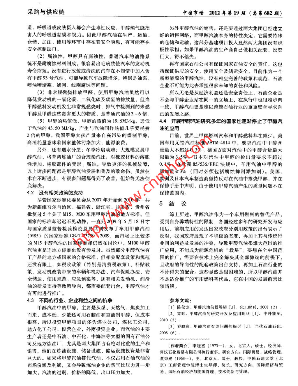 李曉塞,等:甲醇汽油在中國(guó)的前景研究.采購(gòu)與供應(yīng)鏈甲醇汽油在中國(guó)的前景研究李曉塞,董秀成(中國(guó)石油大學(xué)(北京),北京102249)[摘要]面對(duì)能源危機(jī),能源價(jià)格高漲,我們渴望新型能源,甲醇汽油巳作為一種車用燃料的替代品在中國(guó)備受關(guān)注。本文對(duì)一些發(fā)達(dá)國(guó)家對(duì)甲醇汽油的研究并應(yīng)用經(jīng)驗(yàn)進(jìn)行借鑒,并對(duì)甲醇汽油本身特性、國(guó)家政策、行業(yè)壁壘,及.我國(guó)能源結(jié)構(gòu)進(jìn)行深入分析后,得出它在中國(guó)發(fā)展的前景是暗淡的結(jié)論。[關(guān)鍵詞]甲醇;甲醇汽油;汽車[中圖分類號(hào)] F416. 22[文獻(xiàn)標(biāo)識(shí)碼] A[文章編號(hào)] 1005 -6432 (2012) 19 -0077 -02油銷售網(wǎng)絡(luò);日本也以公共汽車,大型載貨車為M85和1甲醇及甲醇汽油的介紹M100甲醇汽油做道路試驗(yàn),并由本田汽車公司研制汽油、甲醇汽油是指把甲醇部分添加在汽油里,用甲醇燃料甲醇自由混合雙燃料車;在歐洲,瑞典在1975年正式提的助溶劑復(fù)配的M系列混合燃料。其中: M15 (在汽油出甲醇可以作為汽車代用燃料,大力推廣M15甲醇汽油。里添加15%甲醇)清潔甲醇汽油為車用燃料,分別應(yīng)用80年代中期,我國(guó)也開(kāi)始研究這一技術(shù),90年代末于各種汽油發(fā)動(dòng)機(jī),可以在不改變現(xiàn)行發(fā)動(dòng)機(jī)結(jié)構(gòu)的條件投入實(shí)際應(yīng)用。目前已有山西、陜西、黑龍江、福建等地下,替代成品汽油使用,并訶與成品油混用。甲醇混合燃出臺(tái)地方標(biāo)準(zhǔn),試點(diǎn)推廣甲醇燃料。其中,山西是國(guó)內(nèi)最料的熱效率、動(dòng)力性、啟動(dòng)性、經(jīng)濟(jì)性良好,具有降低排早開(kāi)展甲醇汽油產(chǎn)業(yè)研究和推廣的省份,煤制甲醇摻混車放、節(jié)省石油、安全方便等特點(diǎn)。世界各國(guó)根據(jù)不同國(guó).用燃料已經(jīng)在該省運(yùn)作了20幾年。上海華諳、奇瑞小轎情,研發(fā)了M3、M5、M15、M20、M50、M85、 M100等車、一汽晉燁大車三家企業(yè)為高比例甲醇汽油( M85、不同摻和比的甲醇汽油(M代表甲醇,M后面的數(shù)字代M100)車生產(chǎn)企業(yè),于2011年5月在上海、陜西、山西表甲醇的摻人比例)。目前,商用甲醇主要為M8S (85%全面啟動(dòng)試點(diǎn)工作,試點(diǎn)階段將持續(xù)到2013年。雖然這甲醇+15%汽油)和M100,M100 性能優(yōu)于M85,是完全是國(guó)家層面首次主導(dǎo)開(kāi)展甲醇汽油推廣試點(diǎn)工作,但也僅由甲醇改性的燃料。是小范圍的幾個(gè)地區(qū)、幾家企業(yè),很難看出推導(dǎo)的力量。甲醇是甲醇汽油的重要組成部分,在我國(guó)甲醇的產(chǎn)量3甲醇汽油的尷尬境遇大,產(chǎn)能嚴(yán)重過(guò)剩。產(chǎn)量較高的省份有:山東、內(nèi)蒙古、河南、山西。隨著神華包頭、神華寧煤、大唐多倫、新奧目前甲醇汽油仿佛走人了死胡同,呈現(xiàn)了國(guó)外禁、國(guó)內(nèi)蒙古等十幾套大型甲醇項(xiàng)目的建成投產(chǎn),2015年我國(guó)內(nèi)堵的兩難境地。在國(guó)際上,國(guó)際燃油標(biāo)準(zhǔn)將甲醇的含量甲醇總產(chǎn)能將達(dá)到5000萬(wàn)噸。豐富的甲醇資源及嚴(yán)重過(guò)進(jìn)行了限制,在歐洲85/536/EEC法規(guī)中,車用汽油中甲剩的產(chǎn)能,導(dǎo)致甲醇價(jià)格相對(duì)較低,與汽油出廠價(jià)通常有醇的添加量≤3%(同時(shí)必須包括腐蝕抑制添加劑)。世3000~4000元的差價(jià)。甲醇資源豐富和產(chǎn)能過(guò)剩的地方界各大汽車制造商在其用戶手冊(cè)上公開(kāi)聲明:使用甲醇汽政府,為了為甲醇找出路,解決成品油短缺和價(jià)格高漲的油的車輛發(fā)生損害不在汽車的保修范闈之內(nèi)。壓力,積極支持推行甲醇汽油,在地方區(qū)域內(nèi)試點(diǎn)推廣。在國(guó)內(nèi),國(guó)家標(biāo)準(zhǔn)越來(lái)越嚴(yán)格2004年9月1日起實(shí)施的車用無(wú)鉛汽油國(guó)家標(biāo)準(zhǔn)規(guī)定:“不得人為加入甲醇, 車2甲醇汽油在世界上的發(fā)展歷程用無(wú)鉛汽油中的甲醇檢出限量為不大于0.1%。”而且國(guó)家甲醇汽油起源于德國(guó),采用人工合成汽油技術(shù)生產(chǎn)出壟斷石油公司中石油和中石化的態(tài)度是不積極的,MI5的的甲醇汽油。受第二次石油危機(jī)的影響,美國(guó)、德國(guó)、日甲醇汽油需要的主要原料還是汽油,銷售的方向還是加油本、歐洲等地都投入了大量的人力、物力進(jìn)行甲醇燃料及站,而中石油和中石化目前還是牢牢地掌握著全國(guó)汽柴油甲醇汽車技術(shù)的研發(fā)。美國(guó)主要是開(kāi)發(fā)M85和M100的甲的采購(gòu)和銷售命脈,雖然有一些地方政府的支持,但參與醇汽油,并由福特公司及美國(guó)銀行,共同合作改裝甲醇汽的民營(yíng)企業(yè)無(wú)論如何也不可能繞過(guò)兩大集團(tuán)的政策約束。車,試用甲醇燃料,并開(kāi)發(fā)了可使用汽油或醇與汽油以任4原因分析 .意比例混合的燃料的靈活燃料汽車(FFV); 德國(guó)也開(kāi)始研制甲醇發(fā)動(dòng)機(jī),并于1979年制定了“用于公路運(yùn)輸?shù)?.1甲醇汽油的自身特性的弊端使其陷入發(fā)展的困境醇類燃料”研制開(kāi)發(fā)的規(guī)劃,將M15運(yùn)用于汽車上,在(1)毒性,甲醇作為甲醇汽油的原料,具有較強(qiáng)的各