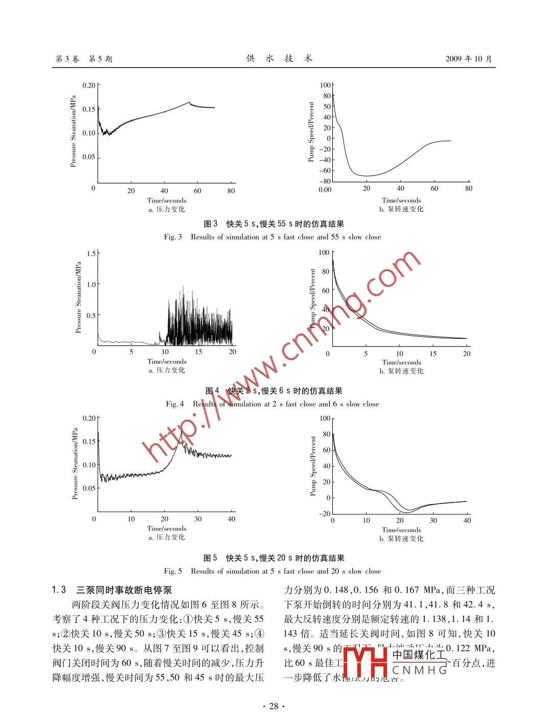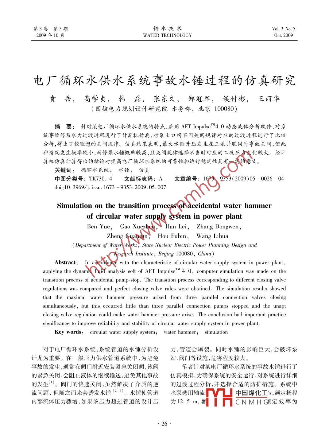 第3卷第5期供水技術(shù)Vol.3 No.52009年10月WATER TECHNOL0GYOct. 2009電廠循環(huán)水供水系統(tǒng)事故水錘過(guò)程的仿真研究賁岳,高學(xué)貞,韓磊,張東文,鄭冠軍,侯付彬,王麗華(國(guó)核電力規(guī)劃設(shè)計(jì)研究院水務(wù)部,北京100080)摘要:針對(duì)某電廠循環(huán)水供水系統(tǒng)的特點(diǎn),應(yīng)用AFT Impulse"M4.0 動(dòng)態(tài)流體分析軟件,對(duì)系統(tǒng)事故停泵水力過(guò)渡過(guò)程進(jìn)行了計(jì)算機(jī)仿真,對(duì)泵出口閥不同關(guān)閥規(guī)律對(duì)應(yīng)的過(guò)渡過(guò)程進(jìn)行了比較分析,得出了較理想的關(guān)閥規(guī)律。仿真結(jié)果表明,最大水錘升壓發(fā)生在三泵并聯(lián)同時(shí)事故關(guān)閥,但此種情況發(fā)生概率較小,而停泵水錘概率較高,且關(guān)閥規(guī)律選擇不當(dāng)時(shí)對(duì)應(yīng)的工況壓力變化較大。經(jīng)計(jì)算機(jī)仿真計(jì)算得出的結(jié)論對(duì)提高電廠循環(huán)水系統(tǒng)的可靠性和運(yùn)行穩(wěn)定性具有一定的意義。關(guān)鍵詞:循環(huán)水 系統(tǒng);水 錘;仿真中圖分類號(hào): TK730. 4文獻(xiàn)標(biāo)志碼: A文 章編號(hào): 1673 - 9353(2009 )05 -0026 -04doi:10. 3969/j. issn. 1673 - 9353.2009. 05. 007Simulation on the transition process of accidental water hammerof circular water supply system in power plantBen Yue,Gao Xuezhen ,Han Lei,Zhang Dongwen,Zheng Guanjun,Hou Fubin,W ang Lihua( Department of Water Works ,State Nuclear Electric Power Planning Design andResearch Institute, Beijing 100080, China )Abstract: In accordance with the characteristic of circular water supply system in power plant,applying the dynamic fluid analysis soft of AFT Impulse' M 4. 0, computer simulation was made on thetransition process of accidental pump-stop. The transition process corresponding to diferent closing valveregulations was compared and perfect closing valve rules were obtained. The simulation results showedthat the maximal water hammer pressure arised from three parallel connection valves closingsimultaneously, but this occurred little than three parallel connection pumps stopped and the unaptclosing valve regulation could make water hammer pressure arise. The conclusion had important practicesignifcance to improve reliability and stability of circular water supply system in power plant.Key words: circular water supply system; water hammer; simulation對(duì)于電廠循環(huán)水系統(tǒng),系統(tǒng)管道的水錘分析設(shè)力,管道會(huì)爆裂。同時(shí)水錘的影響巨大,會(huì)破壞泵計(jì)尤為重要。在一般壓力供水管道系統(tǒng)中,為避免站閥門(mén)等設(shè)施,危害程度較大。事故的發(fā)生,通常在閥門(mén)]附近安裝緊急關(guān)閉閥,該閥筆者針對(duì)某電廠循環(huán)水系統(tǒng)的事故水錘進(jìn)行了的緊急關(guān)閉,會(huì)阻止液體的繼續(xù)輸送,避免其他事故仿真模擬,為確保系統(tǒng)的安全運(yùn)行,對(duì)系統(tǒng)進(jìn)行詳細(xì)的發(fā)生”。閥門(mén)的快速關(guān)閉,雖然解決了介質(zhì)的逆的過(guò)渡過(guò)程分析,并選擇合適的防護(hù)措施。系統(tǒng)中流問(wèn)題,但隨之而來(lái)會(huì)誘發(fā)水錘[12- 3。水錘使管道水泵選用軸流中國(guó)煤化I's,額定揚(yáng)程內(nèi)部流體壓力驟增,如果該壓力超過(guò)管道的設(shè)計(jì)壓為12.5 m,MHCNMH G頓定效率為●26●2009年10月賁岳,等:電廠循環(huán)水供水系統(tǒng)事故水錘過(guò)程的仿真研究第3卷第5期88%,機(jī)組轉(zhuǎn)動(dòng)慣量為7300kg●m',泵出口閥選用基本一致,均是從穩(wěn)態(tài)壓力降低后逐漸升高到一定可控液控蝶閥。壓力再波動(dòng)降低,直至為零。同時(shí)也可以看出隨著1事故停泵過(guò)渡過(guò)程計(jì)算機(jī)仿真關(guān)閥時(shí)間的延長(zhǎng),閥門(mén)后壓力變化幅度減小,在快關(guān)采用AFTImpulse'M4.0流體分析軟件對(duì)事故5s,慢關(guān)55s的工況下壓力變化幅度最小,僅升高水錘情況進(jìn)行了分析,結(jié)合該循環(huán)水供水系統(tǒng)的實(shí)到0. 164 MPa, 而快關(guān)2 s慢關(guān)6s和快關(guān)2 s慢關(guān)8際情況,分別對(duì)三泵并聯(lián)運(yùn)行中- -臺(tái)事故斷電停泵、s的工況下,閥門(mén)后壓力均升至0.18 MPa。雖然快兩臺(tái)同時(shí)事故停泵及三臺(tái)同時(shí)事故停泵的過(guò)渡過(guò)程關(guān)5s,慢關(guān)55s的工況下壓力變化幅度最小,但是進(jìn)行計(jì)算機(jī)仿真,得出過(guò)渡過(guò)程中的泵組最不利參從圖中可以看出,三種工況下隨著關(guān)閥時(shí)間的延長(zhǎng)數(shù)。對(duì)于事故水錘采取兩階段關(guān)閥進(jìn)行考察,即快水泵倒轉(zhuǎn)較嚴(yán)重,最大反轉(zhuǎn)速度分別是額定轉(zhuǎn)速的關(guān)75° ,慢關(guān)15°1.1,1.26和1.7倍,過(guò)大的反轉(zhuǎn)速度直接導(dǎo)致水泵1.1一臺(tái)事故斷電停泵的損壞,一般水泵允許反轉(zhuǎn)速度是額定轉(zhuǎn)速的1.2三泵并聯(lián)一- 泵事故停泵的計(jì)算機(jī)模擬結(jié)果如圖倍左右。因此,三泵并聯(lián)一臺(tái)事故停泵的工況下,閥1至圖3,從圖中可以看出關(guān)閥后壓力曲線變化趨勢(shì)門(mén)要在10s內(nèi)關(guān)閉,以保證水泵不被損壞。0.20 t800.15, 6C400.05of-2010 1s2010Time/seca.壓力變化泵轉(zhuǎn)速變化圖1快關(guān)2 s,慢關(guān)6 s時(shí)的仿真結(jié)果Fig.1 Results of simulation at 2 s fast close and 6 s slow close0.20 r100604C0.1020-01:-40515Time/secondsb.泵轉(z