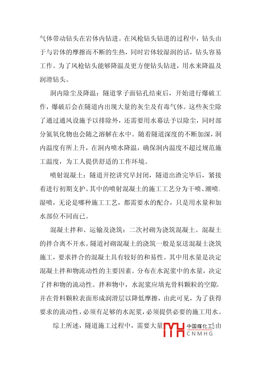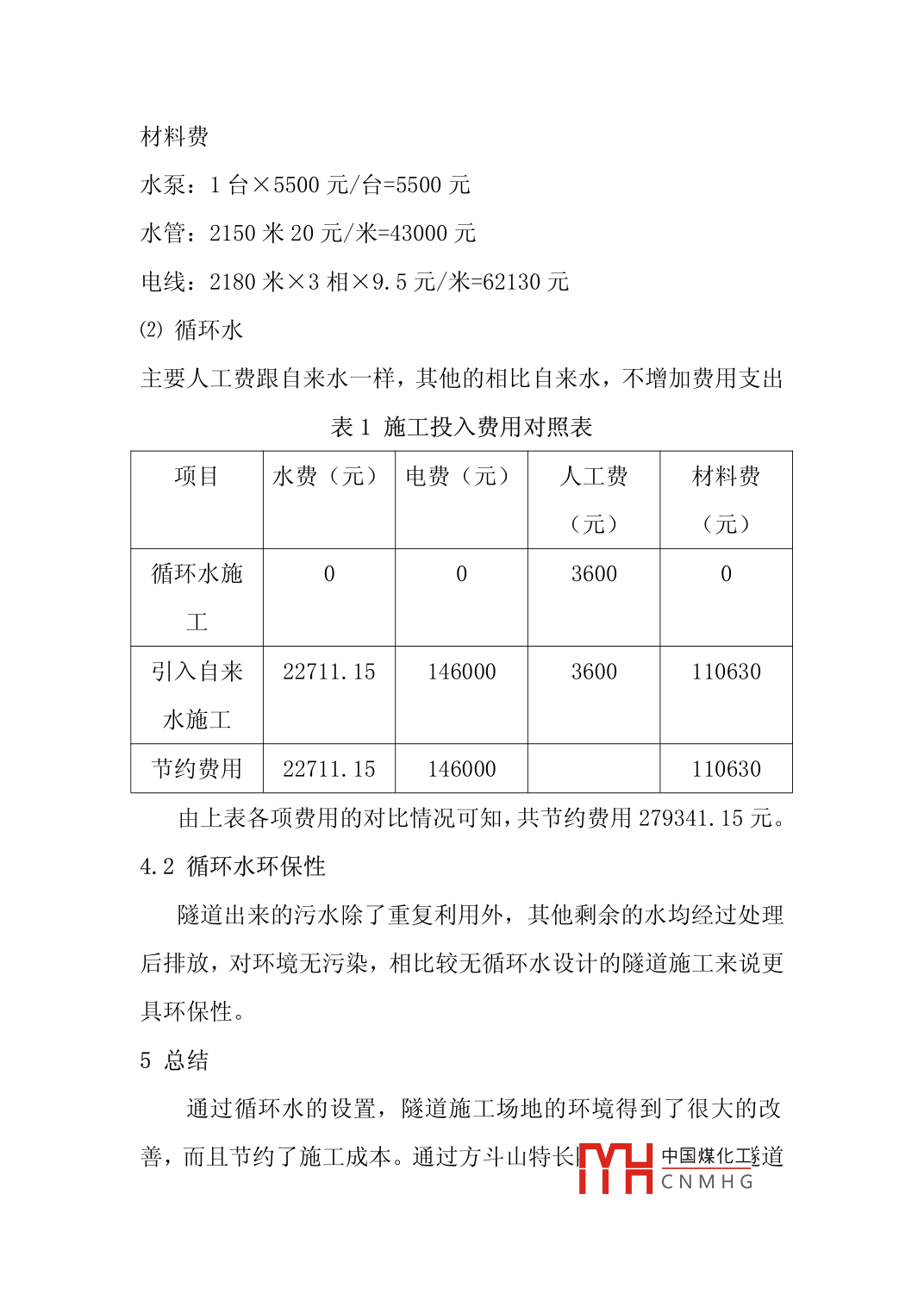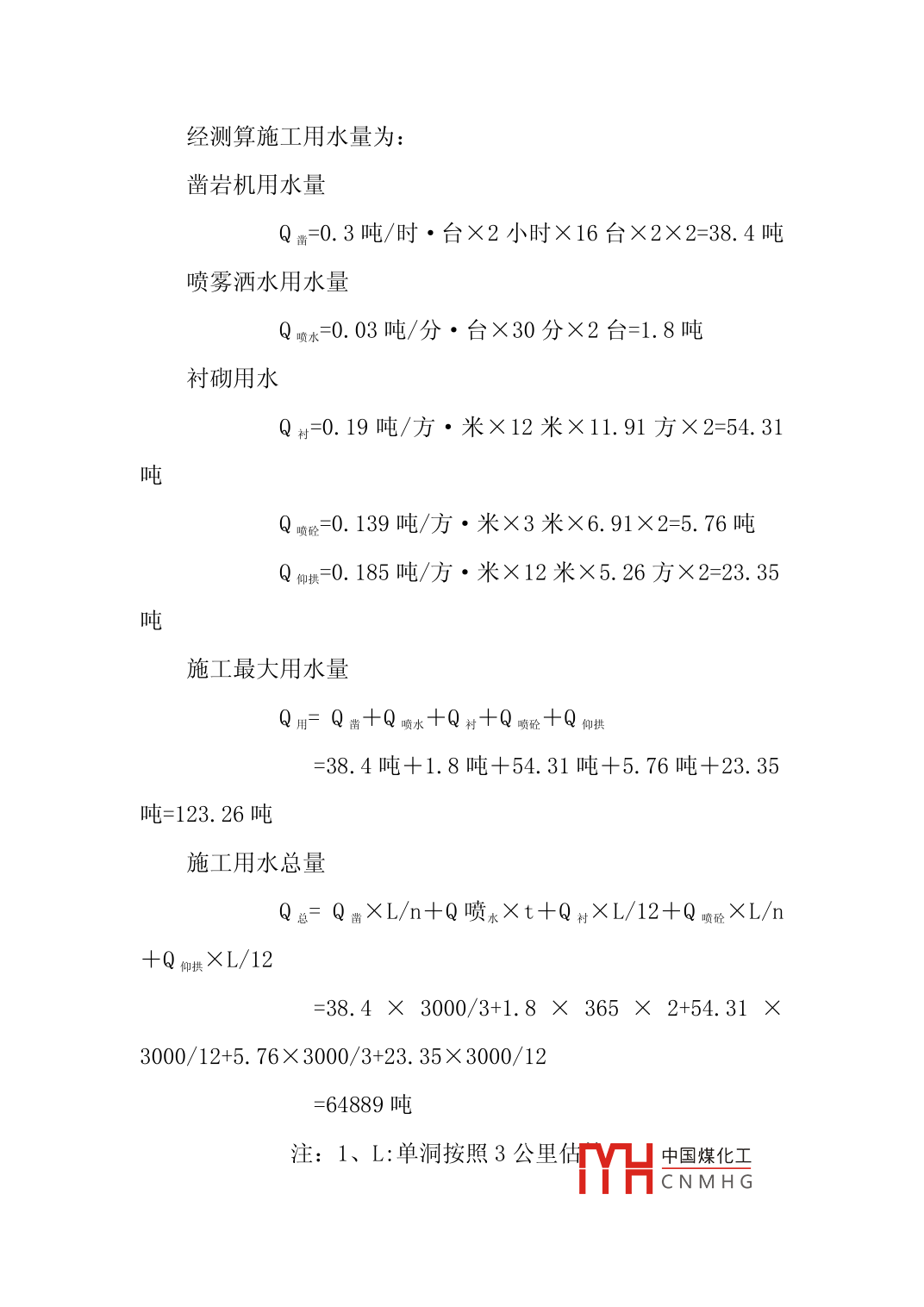 隧道施工循環(huán)水設(shè)計(jì)薛明英韓曉芳中交路橋華北工程有限公司北京摘要:為了保持洞內(nèi)施工場(chǎng)地的干燥,確保洞內(nèi)工人施工以及機(jī)械施工的安全,合理利用隧道開(kāi)挖過(guò)程中遇到水,節(jié)約施工成本關(guān)鍵詞:隧道循環(huán)水設(shè)計(jì)中圖分類(lèi)號(hào):U45文獻(xiàn)標(biāo)識(shí)碼:A工程概況方斗山特長(zhǎng)隧道設(shè)計(jì)為分離式隧道,左線長(zhǎng)7285m,右線長(zhǎng)7310m。隧道穿越的方斗山背斜構(gòu)造,區(qū)域性斷裂構(gòu)造—一橫梁子斷裂帶(F1)及次級(jí)斷層發(fā)育、分布規(guī)律,巖溶發(fā)育規(guī)律及水文地質(zhì)特征等。方斗山隧道隧址區(qū)地質(zhì)構(gòu)造復(fù)雜、巖溶發(fā)育、地下水豐富,屬水文地質(zhì)條件復(fù)雜的隊(duì)址。預(yù)計(jì)平水期隧道涌水量124180m3/d,雨季最大涌水量宜按五倍計(jì),為620900m3/d,屬涌水量特大隧道。隧址區(qū)地下水對(duì)砼無(wú)結(jié)晶類(lèi)、分解類(lèi)、結(jié)晶分解復(fù)合類(lèi)腐蝕性。2建設(shè)循環(huán)水設(shè)施的必要性在隧道工程施工過(guò)程中,水起到很重要的作用。需要水的方面很多,包括鑿巖機(jī)用水、噴霧灑水用水、襯砌用水、導(dǎo)管注漿用水等。從施工工藝上來(lái)簡(jiǎn)述以上幾個(gè)環(huán)節(jié)中水的重要性隧道開(kāi)挖:爆破開(kāi)挖是現(xiàn)代隧道開(kāi)挖中很重要的開(kāi)挖方式爆破開(kāi)挖需要用風(fēng)槍進(jìn)行鉆孔施,風(fēng)槍什H中國(guó)煤化工壓CNMHG氣體帶動(dòng)鉆頭在巖體內(nèi)鉆進(jìn)。在風(fēng)槍鉆頭鉆進(jìn)的過(guò)程中,鉆頭由于與巖體的摩擦而不斷的生熱,同時(shí)巖體較濕潤(rùn)的話,鉆頭容易工作。為了風(fēng)槍鉆頭能夠降溫及更方便鉆頭鉆進(jìn),用水來(lái)降溫及潤(rùn)滑鉆頭。泂內(nèi)除塵及降溫:隧道掌子面鉆孔結(jié)束后,開(kāi)始進(jìn)行爆破工作,爆破后會(huì)在隊(duì)道內(nèi)出現(xiàn)大量的灰塵及有毒氣體。這些灰塵除了通過(guò)通風(fēng)設(shè)施予以排除外,還需要用水幕法予以除塵,同時(shí)部分氮氧化物也會(huì)隨之溶解在水中。隨著隧道深度的不斷加深,洞內(nèi)溫度有所上升,在洞內(nèi)噴水降溫,確保洞內(nèi)溫度不超過(guò)規(guī)范施工溫度,為工人提供舒適的工作環(huán)境。噴射混凝土:隧道開(kāi)挖講究早封閉,隧道出渣完畢后,緊接著進(jìn)行初期支護(hù)。其中的噴射混凝土的施工工藝分為干噴、潮噴、濕噴,無(wú)論是哪種施工工藝,都需要水的配合,只是用水量和加水部位不同而已?;炷涟韬汀⑦\(yùn)輸及澆筑:二次襯砌為澆筑混凝土。混凝土的拌合離不開(kāi)水。隧道襯砌混凝土的澆筑一般是泵送混凝土澆筑施工,要求拌合的混凝土具有較好的和易性。其中用水量是決定混凝土拌和物流動(dòng)性的主要因素。分布在水泥漿中的水量,決定了拌和物的流動(dòng)性。拌和物中,水泥漿應(yīng)填充骨料顆粒的空隙,并在骨料顆粒表面形成潤(rùn)滑層以降低摩擦,由此可見(jiàn),為了獲得要求的流動(dòng)性,必須有足夠的水泥漿,必須提供必要的施工用水。綜上所述,隧道施工過(guò)程中,需要大量rV凵中國(guó)煤化工由CNMHG于方斗山隧道出口地處的特殊位置,地表附近沒(méi)有永久水源,水資源特別的寶貴,隧道出口端原先采用自來(lái)水施工,由于距離遠(yuǎn),水量小等原因,不僅影響施工進(jìn)度,而且增加了施工成本。3循環(huán)水的設(shè)計(jì)方案3.1隧道排、用水分析方斗山特長(zhǎng)隧道出口段在開(kāi)挖過(guò)程中,掌子面遇到地下水的水量比較大。為了確保工程按進(jìn)度計(jì)劃要求施工,保證工程質(zhì)量、工人施工安全以及機(jī)械工作安全,我們對(duì)地下水采取以防、截、排、堵相結(jié)合的綜合治理原則予以處理。在隧道排水的方案中重點(diǎn)強(qiáng)調(diào)對(duì)水的合理利用。掌子面匯集水仰拱匯集水其它匯集水洞口沉沙井沉淀池儲(chǔ)水池洞口沉沙井拌合站用水其它用水圖1循環(huán)水設(shè)置結(jié)構(gòu)圖3.2水量計(jì)算隧道內(nèi)出現(xiàn)的地下水,經(jīng)過(guò)化驗(yàn),水質(zhì)達(dá)到了施工要求,能夠直接用于施工。并且通過(guò)實(shí)際檢測(cè),左洞地下水流量為每小時(shí)5.52立方,右洞地下水流量為每小時(shí)5.36中國(guó)煤化工CNMHG經(jīng)測(cè)算施工用水量為:鑿巖機(jī)用水量Q鑿=0.3噸/時(shí)·臺(tái)×2小時(shí)×16臺(tái)×2×2=38.4噸噴霧灑水用水量Q水=0.03噸/分·臺(tái)×30分×2臺(tái)=1.8噸襯砌用水Q襯=0.19噸/方·米×12米×11.91方×2=54.31噸Q=0.139噸/方·×3米×6.91×2=5.76噸Q=0.185噸/方·米×12米×5.26方×2=23.35噸施工最大用水量Q用=Q鑿十Q水十Q襯十Q噴論十Q仰拱=38.4噸+1.8噸+54.31噸+5.76噸+23.35噸=123.26噸施工用水總量Qa=Q鑿×L/n+Q噴水×t十Q×L/12+Q噴×L/n十Q似拱×L/1238.4×3000/3+1.8×365×2+54.31×3000/12+5.76×3000/3+23.35×3000/1264889噸注:1、L:單洞按照3公里估V凵中國(guó)煤化工CNMHG2、n每循環(huán)掘進(jìn)按照3米估算3、t工作時(shí)間按照2年估算隧道進(jìn)口水量統(tǒng)計(jì)左洞每小時(shí)為3.52立方,右洞每小時(shí)為3.36立方總計(jì)水量Q澗=24時(shí)×(5.52+5.36)方/時(shí)=261.12噸Q用<故洞內(nèi)的地下水能夠滿足施工用水的要求,可以建設(shè)循環(huán)水設(shè)施。3.3循環(huán)水系
