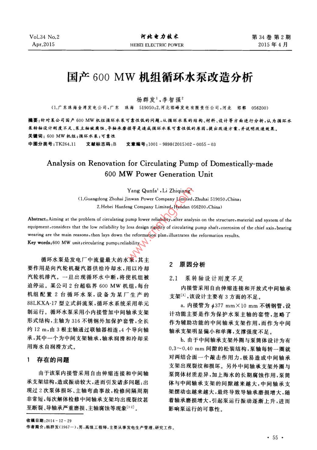 Vol.34 No.2河北電力技術(shù)第34卷第2期Apr.2015HEBEI ELECTRIC POWER2015年4月國產(chǎn)600MW機組循環(huán)水泵改造分析楊群發(fā)1,李智強?(1.廣東珠海金灣發(fā)電公司,廣東珠海519050;2.河北邯峰發(fā)電有限責任公司,河北 邯鄲056200)摘要:針對某公司國產(chǎn)600 MW機組循環(huán)水泵可靠性低的問題,從循環(huán)水泵的結(jié)構(gòu)、材料、設(shè)計等方面進行分析,認為循環(huán)水泵轉(zhuǎn)軸設(shè)計剛度不足、泵主軸被腐蝕、導(dǎo)軸承磨損等是造成循環(huán)水泵可靠性低的原因,提出改造方案,并說明改造效果。關(guān)鍵詞: 600 MW機組;循環(huán)水泵;可靠性中圖分類號:TK264.11文獻標志碼:B文章編號:1001 - 9898(2015)02 - 0055 -03Analysis on Renovation for Circulating Pump of Domestically- made600 MW Power Generation UnitYang Qunfa' ,Li Zhiqiang?(1.Guangdong Zhuhai Jinwan Power Company Limited, Zhuhai 519050 ,China;2.Hebei Hanfeng Company Limited, Handan 056200 ,China)Abstract: Aiming at the problem of circulating pump lower reliability,after analysis on the structure, material and system of theequipment,considers that the low relibility by less design rigidity of circulating pump shaft,corrosion of the chief axis , bearingwearing are the main reasons, then lays down the reformation plan,illustrates the reformation results.Key words:600 MW unit;circulating pump; reliability循環(huán)水泵是發(fā)電廠中流量最大的水泵,其主2原因分析要作用是向汽輪機凝汽器供給冷卻水,用以冷卻汽輪機排汽。一旦出現(xiàn)循環(huán)水中斷,將使機組被2.1 泵轉(zhuǎn)軸設(shè)計剛度不足迫停運。某公司2臺超臨界600MW機組,每臺.內(nèi)接管采用自由伸縮連接和開放式中間軸承機組配置2臺循環(huán)水泵,設(shè)備為某廠生產(chǎn)的支架[B],該設(shè)計主要有3方面的不足。88LKXA-17型立式斜流泵,循環(huán)水系統(tǒng)采用單元a.內(nèi)接管為φ377 mmX10 mm不銹鋼管,設(shè)制運行。循環(huán)水泵采用小內(nèi)接管加中間軸承支架計功能主要是作為保護水泵主軸的套管,忽略了形式結(jié)構(gòu),主軸為316不銹鋼外加保護套管,全長作為輔助功能的中間軸承支架作用,而作為中間約12m,由3根主軸通過聯(lián)軸器相連,4個導(dǎo)向軸軸承支架明顯偏小和單薄,支撐強度不足。承,其中一個為中間支架軸承,軸承潤滑和冷卻采b.由于中間軸承支架外圈與泵簡體設(shè)計為有用海水自潤滑方式。0.3~0.40 mm間隙的松裝結(jié)構(gòu),泵軸每轉(zhuǎn)- - 圈就1存在的問題對兩結(jié)合面一個敲擊作用力,極易造成中間軸承支架出現(xiàn)裂紋和損壞。另外中間軸承支架外圈與由于該泵內(nèi)接管采用自由伸縮連接和中間軸泵簡體材質(zhì)差異,加上海水的長期腐蝕作用,泵簡承支架結(jié)構(gòu),造成振動較大,進而引發(fā)諸多問題:出體與中間軸承支架的間隙越來越大,中間軸承支現(xiàn)過2次泵體損壞、主軸彎曲事故,檢修間隔周期架擺動也越來越大,最終導(dǎo)致導(dǎo)軸承磨損增大,隨非常短,每次解體檢修中間軸承支架均出現(xiàn)裂紋甚著軸承磨損增大,引起泵運行振動逐漸上升,進而.至斷裂、導(dǎo)軸承嚴重磨損、主軸腐蝕等現(xiàn)象1[12]。影響泵運行的可靠性。收稿日期:2014-12- 29作者簡介:楊群發(fā)(1967-).男.高級工程師,主要從事發(fā)電生產(chǎn)管理.研究工作。55●Vol.34 No.2河北電力技術(shù)第34卷第2期Apr.2015HEBEI ELECTRIC POWER2015年4月.c.原內(nèi)接管與泵體支撐板處填料函體連接方困難,要動用火焰加熱烘燒方式來拆卸或破壞性式為自由伸縮結(jié)構(gòu),最大可達45 mm。這樣能夠拆卸,極易拉毛損傷套簡聯(lián)軸器及主軸,也容易造降低了泵轉(zhuǎn)軸的剛度和抗干擾能力,特別是在循.成主軸彎曲和脫落。環(huán)水泵啟停和海水潮位變化時,因受泵的導(dǎo)流體3改造方案上浮推力而引起泵較大的振動變化。2.2泵主軸腐蝕嚴重a.對于泵轉(zhuǎn)軸設(shè)計剛度不足問題,主要改造主軸表面主要受到點蝕嚴重,主軸原設(shè)計采三方面的設(shè)計和結(jié)構(gòu):將內(nèi)接管由原φ377mmX用SU316材料,后又采用更換材料(改用SU316L10mm改為φ660mmX16mm,材料由原316L材料)以及在內(nèi)接管上開孔增大外加陰極電流等改為雙相不銹鋼,提高內(nèi)接管剛度;內(nèi)接管與泵體辦法,均未能解決此問題。主要原因是目前國內(nèi)填料函體連接方式由原來自由伸縮連接改為有限在大件金屬材料制造中存在缺陷,雜質(zhì)和溶質(zhì)不制自由連接,使內(nèi)接管密封段與泵蓋板之間的摩均一,材料的抗點蝕性能因數(shù)和抗間隙腐蝕性能擦力加大,克服原來啟停泵和海水潮位變化時易因數(shù)普遍偏低,達不到耐腐蝕性能指標要求4。造成導(dǎo)流體上浮而引起振動增大的問題;取消原來中間軸承支架,在新內(nèi)接管與原中間軸承支架2.3 導(dǎo)軸承磨損大型立式泵的導(dǎo)軸承起著承受轉(zhuǎn)軸的徑向分相同位置上改為導(dǎo)軸承,并固定在內(nèi)接管上,提高力和穩(wěn)定泵轉(zhuǎn)動部件的作用,如果導(dǎo)軸承磨損過導(dǎo)軸承的徑向支撐剛度。b.主軸設(shè)計材料選用00Cr22Ni5Mo3N雙相不大,則會造成轉(zhuǎn)軸和葉輪擺動增大,引發(fā)泵的振動銹鋼4。雙相不銹鋼兼有奧氏體韌性、焊接性,又加劇或葉片碰磨,甚至發(fā)生循環(huán)水泵的損壞事故。有鐵素體的高強度、耐氯化物腐蝕性能。循環(huán)水泵循環(huán)水泵的導(dǎo)軸承運行環(huán)境