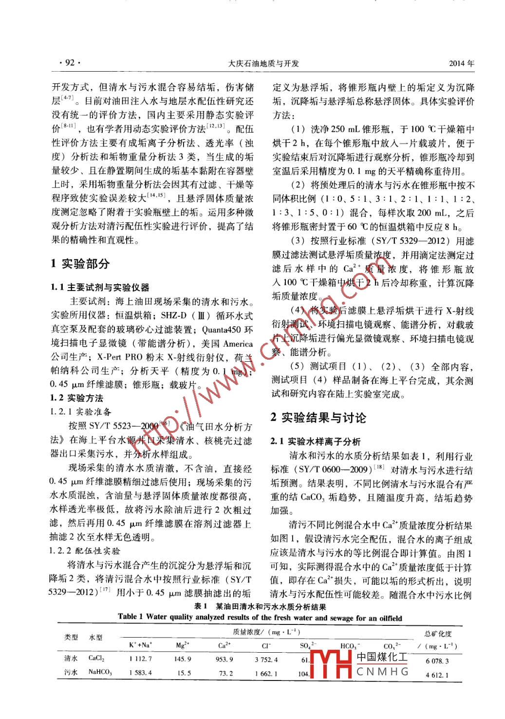 2014年8月大慶石油地質(zhì)與開(kāi)發(fā)Aug,2014第33卷第4期Petroleum Geology and Oilfield Development in DaqingVol. 33 No. 4DOI: 10. 3969/J. ISSN.1000-3754. 2014. 04. 019清水與污水配伍性微觀評(píng)價(jià)方法高建崇’劉義剛’.山金城'張嶺'文鑫’唐洪明3(1.中海石油(中國(guó))有限公司天津分公司,天津300452; 2.中海石油(中國(guó))有限公司深圳分公司廣州研究院,廣東廣州510240; 3. 西南石油大學(xué)油氣藏地質(zhì)及開(kāi)發(fā)工程國(guó)家重點(diǎn)實(shí)驗(yàn)室,四川成都610500)摘要:清、污水混注是海上中高含水油田普遍采用的注水開(kāi)發(fā)方式,但清水與污水混合容易結(jié)垢,傷害儲(chǔ)層。為評(píng)價(jià)清污混注過(guò)程中清水與污水的配伍性,對(duì)垢物重量法加以改進(jìn),將懸浮固體分為沉降垢和懸浮垢,運(yùn)用偏光顯微鏡、X-射線衍射、掃描電鏡和能譜分析等微觀分析手段,建立了一套系統(tǒng)評(píng)價(jià)清污配伍性的新方法和實(shí)驗(yàn)流程。評(píng)價(jià)結(jié)果準(zhǔn)確、可靠且直觀。關(guān)鍵詞:清污配伍性;評(píng)價(jià)方法;垢物重量法; X-射線衍射;掃描電鏡中圖分類號(hào): TE992. 2文獻(xiàn)標(biāo)識(shí)碼: A文章編號(hào): 1000-3754 (2014) 04-0091-05MICROSCOPIC EVALUATING METHOD OF THE COMPATIBILITYBETWEEN THE FRESH WATER AND SEWAGEGAO Jianchong', LIU Yigang' ,SHAN Jincheng' , ZHANG ling' ,WEN Xin2,TANG Hongming'(1. Tianjin Branch of CNOOC China Limited , Tianjin 300452, China; 2. Research Instiute of Shenzhen Branchof CNOOC China Limited,Guangzhou 510240, China; 3. National Key Laboratory in Petroleum Geologyand Development Engineering of Southwest Petroleum Universiy, Chengdu 610500, China)Abstract: The mixed injection between the fresh water and sewage is generally adopted waterflooding method in theoffshore oilfields in the periods of medium and high water cuts, but the mixture is prone to scale and damage thereservoirs. In order to evaluate the compatibility between the fresh water and sewage in the process of the abovemixed ijetion, the scale gravimetric method is improved, thus the suspended solids can be divided into the stledand suspended scales, with the help of the fllowingg microscopic analyzing methods such as POM (polarizing mi-croscope), XRD, SEM, EDAX (energy dispersive analysis X-ray) and so on, a set of new methods and experi-mental flow charts are established to systeaically evaluate the above compatibility. The evaluated results are pre-cise , reliable and intuitive.Key words: fresh water sewage compatibility ; evaluating method; scale weight/ gravimetric method; XRD (X-raydiffraction); SEM ( scanning electron microscope )產(chǎn)出污水中含有大量的懸浮物、油、無(wú)機(jī)鹽以境污染 和水資源浪費(fèi),最好的方法是回注地層['3。及各種難分解的有機(jī)物,直接排放會(huì)造成嚴(yán)重的環(huán)清、污水混注是海上中高含水油田普遍采用的注水收稿日期: 2013-08-11改回日期: 2013-11-25中國(guó)煤化工作者簡(jiǎn)介:高建崇,男,1979 年生,工程師,現(xiàn)主要從事采油工藝方面的研HCNMHGE-mail :gaojch@ cnooc. com. cn.92●大慶石油地質(zhì)與開(kāi)發(fā)2014年.開(kāi)發(fā)方式,但清水與污水混合容易結(jié)垢,傷害儲(chǔ)定義為懸浮垢,將錐形瓶?jī)?nèi)壁上的垢定義為沉降層(4+7]。目前對(duì)油田注人水與地層水配伍性研究還垢,沉降垢與懸浮垢總稱懸浮固體。具體實(shí)驗(yàn)評(píng)價(jià)沒(méi)有統(tǒng)一的評(píng)價(jià)方法,國(guó)內(nèi)主要采用靜態(tài)實(shí)驗(yàn)評(píng)方法:價(jià)8-1],也有學(xué)者用動(dòng)態(tài)實(shí)驗(yàn)評(píng)價(jià)方法[12.13]。配伍(1)洗凈250 mL錐形瓶,于100 C干燥箱中性評(píng)價(jià)方法主要有成垢離子分析法、透光率(濁.烘干2h,在每個(gè)錐形瓶中放入一片載玻片,便于.度)分析法和垢物重量分析法3類,當(dāng)生成的垢實(shí)驗(yàn)結(jié)束后對(duì)沉降垢進(jìn)行觀察分析,錐形瓶冷卻到量較少、且在靜置期間生成的垢基本黏附在容器壁室溫后采用精度為0.1 mg的天平精確稱重待用。上時(shí),采用垢物重量分析法會(huì)因其有過(guò)濾、干燥等(2)將預(yù)處理后的清水與污水在錐形瓶中按不程序致使實(shí)驗(yàn)誤差較大14.15],且懸浮固體質(zhì)量濃同體積比例(1 :0、5:1. 3:1、2:1、1:1、1:2、度測(cè)定忽略了附著于實(shí)驗(yàn)瓶壁上的垢。運(yùn)用多種微1:3、1 :5、0:1) 混合,每樣次取200 mL,之后觀分析方法對(duì)清污配伍性實(shí)驗(yàn)進(jìn)行評(píng)價(jià),提高了結(jié)將錐形瓶密封置于60 C的恒溫烘箱中反應(yīng)8 h。果的精確性和直觀性。(3)按照行業(yè)標(biāo)準(zhǔn)(SY/T 5329- -2012) 用濾膜過(guò)濾法測(cè)試懸浮垢質(zhì)量濃度,并用滴定法測(cè)定過(guò)1實(shí)驗(yàn)部分濾后水樣中的Ca2+ 質(zhì)量濃度,將錐形瓶放人100 C干燥箱中烘干2 h后冷卻稱重,計(jì)算沉降1.1主要試劑與實(shí)驗(yàn)儀器主要試劑:海上油田現(xiàn)場(chǎng)采集的清水和污水。垢質(zhì)量濃度。實(shí)驗(yàn)所用儀器:恒溫烘箱; SHZ-D ( I)循環(huán)水式(4)將實(shí)驗(yàn)后濾膜上懸浮垢烘干進(jìn)行X-射線真空泵及配套的玻璃砂心過(guò)濾裝置; Quanta450 環(huán)衍射測(cè)試、環(huán)境掃描電鏡觀察、能譜分析,對(duì)載玻境掃描電子顯微鏡(帶能譜分析),美國(guó)America.片上沉降垢進(jìn)行偏光顯微鏡觀察、環(huán)境掃描電鏡觀公司生產(chǎn); X-Pert PRO粉末X-射線衍射儀,荷蘭察、能譜分