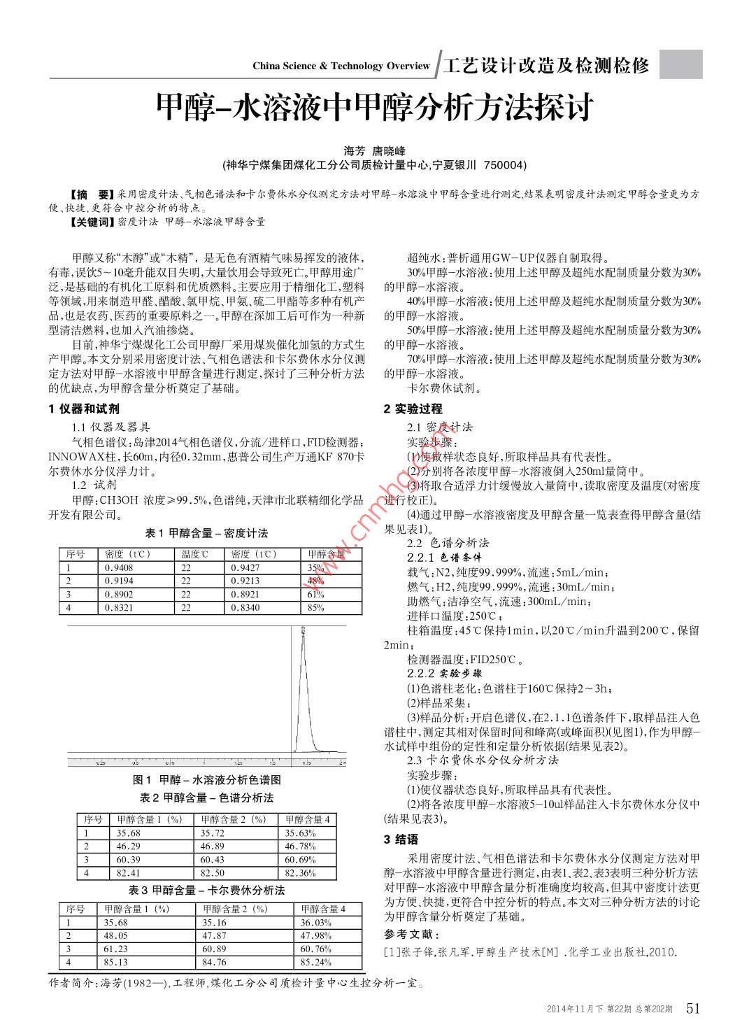 China Science& Technology Over藝設(shè)計(jì)改造及檢測(cè)檢修甲醇-水溶液中甲醇分析方法探讠海芳唐曉峰(神華寧煤集團(tuán)煤化工分公司質(zhì)檢計(jì)量中心寧夏銀川750004)令【摘要】采用密度計(jì)法、氣相色譜法和卡爾費(fèi)休水分儀測(cè)定方法對(duì)甲醇一水溶液中甲醇含量進(jìn)行測(cè)定結(jié)果表明密度計(jì)法測(cè)定甲醇含量更為方捷,更符合中控分析的特點(diǎn)【關(guān)鍵詞】密度計(jì)法甲醇一水溶液甲醇含量甲醇又稱(chēng)“木醇”或“木精”,是無(wú)色有酒精氣味易揮發(fā)的液體,超純水:普析通用GW-UP儀器自制取得有毒,誤飲5~10毫升能雙目失明,大量飲用會(huì)導(dǎo)致死亡。甲醇用途30%甲醇一水溶液:使用上述甲醇及超純水配制質(zhì)量分?jǐn)?shù)為30%泛,是基礎(chǔ)的有機(jī)化工原料和優(yōu)質(zhì)燃料。主要應(yīng)用于精細(xì)化工,塑料的甲醇一水溶液等領(lǐng)域,用來(lái)制造甲醛、醋酸、氯甲烷、甲氨、硫二甲酯等多種有機(jī)產(chǎn)40%甲醇一水溶液:使用上述甲醇及超純水配制質(zhì)量分?jǐn)?shù)為3090品,也是農(nóng)藥、醫(yī)藥的重要原料之一。甲醇在深加工后可作為一種新的甲醇一水溶液型清潔燃料,也加入汽油摻燒5%甲醇-水溶液:使用上述甲醇及超純水配制質(zhì)量分?jǐn)?shù)為3090目前,神華寧煤煤化工公司甲醇廠采用煤炭催化加氫的方式生的甲醇一水溶液產(chǎn)甲醇。本文分別采用密度計(jì)法、氣相色譜法和卡爾費(fèi)休水分儀測(cè)70%甲醇一水溶液:使用上述甲醇及超純水配制質(zhì)量分?jǐn)?shù)為3096定方法對(duì)甲醇-水溶液中甲醇含量進(jìn)行測(cè)定,探討了三種分析方法的甲醇一水溶液的優(yōu)缺點(diǎn),為甲醇含量分析奠定了基礎(chǔ)??栙M(fèi)休試劑。1儀器和試劑2實(shí)驗(yàn)過(guò)程1.1儀器及器具密度計(jì)法氣相色譜儀:島津2014氣相色譜儀,分流/進(jìn)樣口,FID檢測(cè)器;實(shí)驗(yàn)步驟NNOWAX柱,長(zhǎng)60m,內(nèi)徑0.32mm,惠普公司生產(chǎn)萬(wàn)通KF870卡(1)使做樣狀態(tài)良好,所取樣品具有代表性。爾費(fèi)休水分儀浮力計(jì)。(2)分別將各濃度甲醇一水溶液倒入250m量筒中1.2試劑(3)將取合適浮力計(jì)緩慢放入量筒中,讀取密度及溫度(對(duì)密度甲醇:CH3OH濃度≥99.5%,色譜純,天津市北聯(lián)精細(xì)化學(xué)品進(jìn)行校正)開(kāi)發(fā)有限公司。(4通過(guò)甲醇一水溶液密度及甲醇含量一覽表査得甲醇含量(結(jié)表1甲醇含量一密度計(jì)法果見(jiàn)表1)2色譜分析法「序號(hào)密度(t℃)溫度℃密度(t℃)甲醇含量2.2.1色譜條件0.9408載氣:N2,純度99.999%,流速:5mL/min;20.919422燃?xì)?H2,純度99.999%,流速:30mL/min;0.8340助燃?xì)?潔凈空氣,流速:300mL/min;進(jìn)樣口溫度:250℃;柱箱溫度:45℃保持1min,以20℃/min升溫到200℃,保留min檢測(cè)器溫度:FID250℃(1)色譜柱老化:色譜柱于160℃保持2~3h;(2)樣品采集(3)樣品分析:開(kāi)啟色譜儀,在2.1.1色譜條件下,取樣品注入色譜柱中,測(cè)定其相對(duì)保留時(shí)間和峰高(或峰面積見(jiàn)圖1),作為甲醇水試樣中組份的定性和定量分析依據(jù)(結(jié)果見(jiàn)表2)。23卡爾費(fèi)休水分儀分析方法圖1甲醇-水溶液分析色譜圖實(shí)驗(yàn)步驟表2甲醇含量-色譜分析法(1)使儀器狀態(tài)良好,所取樣品具有代表性。(2)將各濃度甲醇一水溶液5-10ul樣品注入卡爾費(fèi)休水分儀中「序號(hào)甲醇含量1(%)「甲醇含量2(%)甲醇含量4(結(jié)果見(jiàn)表3)。135.6835.63%3結(jié)語(yǔ)采用密度計(jì)法、氣相色譜法和卡爾費(fèi)休水分儀測(cè)定方法對(duì)甲82,36%醇一水溶液中甲醇含量進(jìn)行測(cè)定,由表1、表2、表3表明三種分析方法表3甲醇含量一卡爾費(fèi)休分析法對(duì)甲醇一水溶液中甲醇含量分析準(zhǔn)確度均較高,但其中密度計(jì)法更序號(hào)甲醇含量1(%)甲醇含量2(%)甲醇含量4為方便、快捷,更符合中控分析的特點(diǎn)。本文對(duì)三種分析方法的討論35.1636.03%為甲醇含量分析奠定了基礎(chǔ)47.98參考文獻(xiàn)60.8960.76[1]張子鋒,張凡軍,甲醇生產(chǎn)技術(shù)[M].化學(xué)工業(yè)出版社,201085.13作者簡(jiǎn)介:海芳(1982—),工程師,煤化工分公司質(zhì)檢計(jì)量中心生控分析一室2014年11月下第22期總第202期51