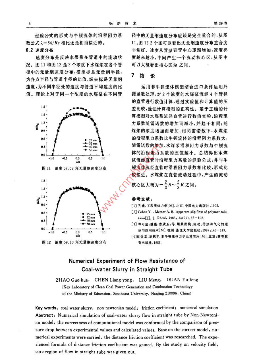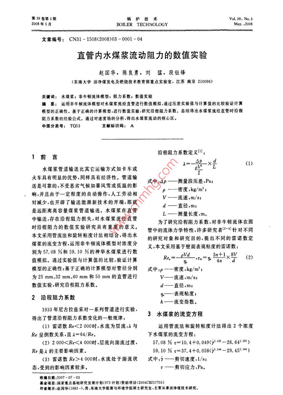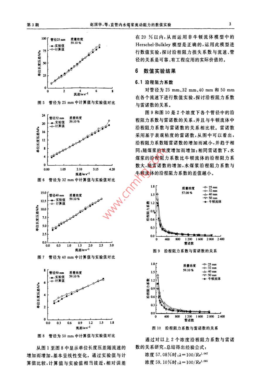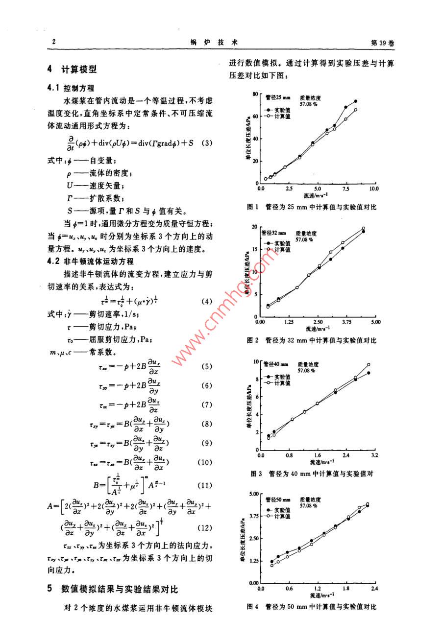 第39卷第3期鍋爐技術(shù)VoL, 39, No. 32008年5月BOILER TECHNOLOGY文章編號:CN31-1508(2008)03-0001-04直管內(nèi)水煤漿流動阻力的數(shù)值實(shí)驗(yàn)趙國華,陳良勇,劉猛,段鈺鋒(東南大學(xué)潔凈煤發(fā)電及燃燒技術(shù)教育部重點(diǎn)實(shí)驗(yàn)室,江蘇南京210096)關(guān)鍵詞:水煤漿;非牛頓流體模型;阻力系數(shù);數(shù)值實(shí)驗(yàn)摘要:運(yùn)用非牛頓流體模型對水煤漿流經(jīng)直管進(jìn)行數(shù)值模擬,通過壓差實(shí)驗(yàn)值與計(jì)算值的比較驗(yàn)證計(jì)算模型的正確性?;谡_的計(jì)算模型,進(jìn)行數(shù)值實(shí)驗(yàn)研究沿程阻力系數(shù)??偨Y(jié)得出水煤漿流經(jīng)直管時(shí)沿程阻力系數(shù)的經(jīng)驗(yàn)公式。通過對速度場的分析得出水煤漿流動的核心區(qū)。中圖分類號:TQ53文獻(xiàn)標(biāo)識碼:A沿程阻力系數(shù)定義[:1前言水煤漿管道輸送比其它運(yùn)輸方式如卡車或火車具有明顯的優(yōu)勢,同樣具有經(jīng)濟(jì)性。管道輸送是可靠的不受惡劣氣候如暴風(fēng)雪或低溫的影式中4D一測量段壓差Pa響,并且由于一定程度的自動操作,人工勞動相p—密度,kg/m2;V—流速,m/s;對減少,也開辟了輸送能源新技術(shù)的開端,那就是遠(yuǎn)距離高容量煤漿管道輸送。水煤漿在直管L—測量長度,m中輸送,存在沿程阻力損失,對水煤漿流經(jīng)直管為了研究沿程阻力系數(shù),對非牛頓流體在圓時(shí)沿程阻力的數(shù)值實(shí)驗(yàn)研究具有重要的意義。管中的流體力學(xué)特性,許多研究者針對不同本文采用管流法和旋轉(zhuǎn)粘度計(jì)法相結(jié)合得出水煤漿的流變方程,運(yùn)用非牛頓流體模型對濃度分的研究對象和研究目的,提出不同的雷諾數(shù)定義,本文采用基于壁面表觀粘度的雷諾數(shù):別為57.08%和59.10%的神華水煤漿進(jìn)行數(shù)值模擬。通過實(shí)驗(yàn)值與計(jì)算值的比較,驗(yàn)證計(jì)算a-,t=n+1×8(2)模型的正確性;基于正確的計(jì)算模型對管徑分別式中:P—密度kg/m為25mm32mm、40mm和50mm的直管進(jìn)行流速,m/s;數(shù)值實(shí)驗(yàn),研究沿程阻力系數(shù)。d—直徑2沿程阻力系數(shù)孫—表現(xiàn)粘度;h一流變指數(shù)1933年尼古拉茲采對一系列管道進(jìn)行實(shí)驗(yàn),得出了管道沿程阻力系數(shù)變化的一般規(guī)律:3水煤漿的流變方程(1)雷諾數(shù)Re<2000時(shí),水流為層流,λ與運(yùn)用管流法和旋轉(zhuǎn)粘度計(jì)法得出2個(gè)濃度Re呈倒數(shù)關(guān)系,且λ=64/Re。下水煤漿的流變方程:(2)20004000時(shí),水流處于湍流狀式中:Y—剪切速度態(tài),受到的影響因素較多。剪切應(yīng)力,Pa。收稿日期:2007-07-03基金項(xiàng)目:國家重點(diǎn)基礎(chǔ)研究發(fā)展計(jì)劃(973計(jì)劃)資助項(xiàng)目(2004CB217701)作者簡介:趙國華(1983-),男,東南大學(xué)能源與環(huán)境學(xué)院碩士研究生主要從事潔凈煤技術(shù)研究第39卷計(jì)算模型進(jìn)行數(shù)值模擬。通過計(jì)算得到實(shí)驗(yàn)壓差與計(jì)算壓差對比如下圖4.1控制方程水煤漿在管內(nèi)流動是一個(gè)等溫過程,不考慮管徑25m量濃度溫度變化,直角坐標(biāo)系中定常條件、不可壓縮流實(shí)驗(yàn)值體流動通用形式方程為:at pp)+div(pUs)=divgrad)+S(3)式中:—自變量P—流體的密度U—速度矢量r—擴(kuò)散系數(shù);s—源項(xiàng)量r和S與ψ值有關(guān)。圖1管徑為25mm中計(jì)算值與實(shí)驗(yàn)值對比當(dāng)∮=1時(shí),通用微分方程變?yōu)橘|(zhì)量守恒方程;當(dāng)=L、、時(shí)分別為坐標(biāo)系3個(gè)方向上的動普徑32量方程。u2、42為坐標(biāo)系3個(gè)方向上的速度。154.2非牛頓流體運(yùn)動方程描述非牛頓流體的流變方程,建立應(yīng)力與剪切速率的關(guān)系,表達(dá)式為:r2=+(py)式中:y—剪切速率,1/sr——剪切應(yīng)力,Pa;流速/m-1屈服剪切應(yīng)力,Pa;圖2管徑為32mm中計(jì)算值與實(shí)驗(yàn)值對比m、、c—常系數(shù)Tx=-p+2B 5管徑40質(zhì)量濃度Tx=-P+2B=x(6)r=r =B(2+-)BTn=tn=BO流速/m-13管徑為40mm中計(jì)算值與實(shí)驗(yàn)值對+uA-1(11)A=「2()2+2m2)2+2(y+(+ky+管徑50量濃度實(shí)驗(yàn)值+物y++2(12)出rx、r、r為坐標(biāo)系3個(gè)方向上的法向應(yīng)力rx、rs、rx、rs、ra、ra為坐標(biāo)系3個(gè)方向上的切向應(yīng)力5數(shù)值模擬結(jié)果與實(shí)驗(yàn)結(jié)果對比對2個(gè)濃度的水煤漿運(yùn)用非牛頓流體模塊圖4管徑為50mm中計(jì)算值與實(shí)驗(yàn)值對比第3期趙國華,等直管內(nèi)水煤漿流動阻力的數(shù)值實(shí)驗(yàn)管徑25mm質(zhì)量濃度在20%以內(nèi),從而運(yùn)用非牛頓流體模型中的實(shí)驗(yàn)值Herschel- Bulkley模型是正確的,運(yùn)用此模型進(jìn)行數(shù)值實(shí)驗(yàn),探討沿程阻力損失系數(shù)與流速、管徑的關(guān)系是可靠、有工程應(yīng)用的實(shí)際價(jià)值的。6數(shù)值實(shí)驗(yàn)結(jié)果6.1沿程阻力系數(shù)對管徑為25mm、32mm、40mm和50mm在各個(gè)流速下進(jìn)行數(shù)值實(shí)驗(yàn),探討沿程阻力系數(shù)圖5管徑為25mm中計(jì)算值與實(shí)驗(yàn)值對比與雷諾數(shù)的關(guān)系。圖9和圖10是2個(gè)濃度下各個(gè)管徑中的沿管徑32mm質(zhì)量濃度實(shí)驗(yàn)值程阻力系數(shù)與雷諾數(shù)的關(guān)系,并且與牛頓流體中沿程阻力系數(shù)與雷諾數(shù)的關(guān)系相比較。