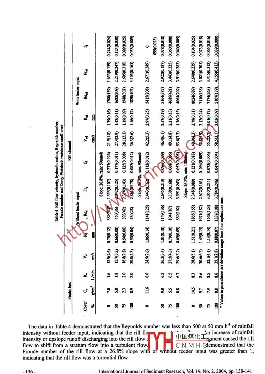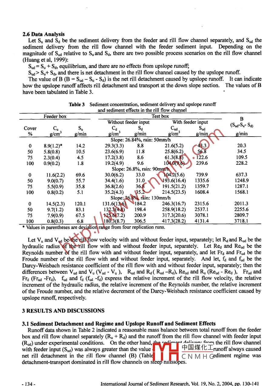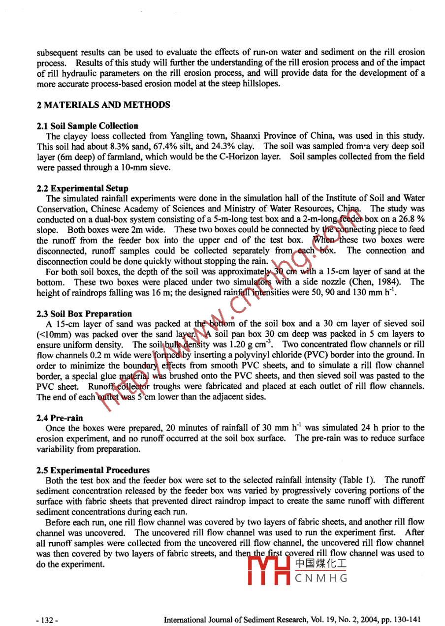 RILL EROSION PROCESS ANDRILL FLOW HYDRAULIC PARAMETERSFen-li ZHENG', Pei-qing XIAO2 and Xue-tian GAO'ABSTRACTIn the rill erosion process, run-on water and sediment from upslope areas, and rill flow hydraulicparameters have significant effects on sediment detachment and transport. However, there is a lackof data to quantify the effects of run-on water and sediment and rill flow hydraulic parameters on rillerosion process at steep hillslopes, especially in the Loess Plateau of China. A dual-box system,consisting of a 2-m-long feeder box and a 5-m-long test box with 26.8% slope gradient was used toquantify the effects of upslope runoff and sediment, and of rill flow hydraulic parameters on the rillerosion process. The results showed that detachment-transport was dominated in ril erosionprocesses; upslope runoff always caused the net rill detachment at the downslope rill flow channel,and the net rill detachment caused by upslope runoff increased with a decrease of runoff sedimentconcentration from the feeder box or an increase of rainfall intensity. Upslope runoff discharginginto the rill flow channel or an increase of rainfall intensity caused the rill flow to shift from astratum flow into a turbulent flow. Upslope runoff had an important effect on rill flow hydraulicparameters, such as rill flow velocity, hydraulic radius, Reynolds number, Froude number and theDarcy-Weisbach resistance coefficient. The net rill detachment caused by upslope runoff increasedas the relative increments of rill flow velocity, Reynolds number and Froude number caused byupslope runoff increased. In contrast, the net rill detachment decreased with an increase of therelative decrement of the Darcy- Weisbach resistance coefficient caused by upslope runoff. Thesefindings will help to improve the understanding of the effects of run-on water and sediment on theerosion process and to find control strategies to minimize the impact of run-on water.Key Words: Rill erosion process, Rill flow hydraulic parameters, Run-on water effects, The LoessPlateau of China1 INTRODUCTIONIn the rill erosion process, run- on water and sediment from the upslope area, and rill flow hydraulicparameters have significant effects on rill detachment and transport. However, there was few dataavailable to quantify the effects of run-on water and sediment as well as rill flow hydraulic parameters onthe rill erosion process at steep hillslopes, especially in the Loess Plateau of China. Therefore, it isnecessary to study the effects of upslope runoff and sediment and rill flow hydraulic parameters ondetachment and transport by rill flows.As compared to water flows in rivers and streams, the bed gradient of a rill flow is steeper, the flowdepth is shallower, and the channel shape is more irregular. It is necessary to determine whichparameters can be used to describe rill flow hydraulics and hydrodynamics. Moss et al.(1979) proposedthat the rill flow's basic mechanisms of erosion, transport, and deposition were similar to that of flows inriver channels. Therefore, the theories and methods for streams and rivers may be employed in studyingrill flows. The corresponding variables used to characterize flow dynamics, such as flow velocity,hydraulic radius, Reynolds number, Froude number, as well as the resistance coefficient, can be used tocharacterize rill flows.Several studies have been conducted to investigate the resistance coefficient of rill flows. Foster et al.1984) reported that the resistance cofficient was not greater than 0.5 for slope gradients of 1.7°0 to 5.16*,indicating that the resistance coefficient of rill flows did not vary greatly. However, Gilley et al. (GilleyResearch Prof, 2 Ph.D. Student and 3 Associate Prof, State KexI aharatnry nf Soil Frnein _and Dryland Farmingon Loess Plateaus, Institute of Soil and Water Conservation中國煤化工ces and Ministry ofWater Resources, Yangling, Shaanxi 712100, China), E-ml-rthwesterm Sci-TechCNM H G'University of Agriculture and Forestry, 26 Xinong Rd, YanglilNote: The original manuscript of this paper was received in May 2003. The revised version was received inMarch 2004. Discussion open until June 2005.-130-Intermational Journal of Sediment Research, Vol. 19, No. 2, 2004, pp. 130-141et al, 1990) proposed that when the Reynolds number was between 300 to 10000, the resistancecoefficient of rill flows varied greatly with runoff discharge and bed gradient.Subsequently, Abrahamset al. (1996) reported that for slopes of 0.74° to 3.2", the Darcy-Weisbach resistance cofficient in wideand shallow rills range from 0.2 to 2.84 in rill flows. Recently, Nearing and co-workers (Nearing, 1997)concluded that the Reynolds number was not a consistent predictor of hydraulic friction in rills. On thesteep hillslopes of the Loess Plateau of China, lttle information is currently available on the resistancecofficient of rill flows. Therefore, it is necessary to quantitatively study the resistance coefficient of rillflows, and the relationship between rill detachment and a rill flow's resistance coefficient.An early model concept of the effect of sediment in the eroding water on the erosion processes wasproposed more than 50 years ago by Ellison (1947) and Ellison and Ellison (1947a, 1947b). 'This modelconsiders sediment particles in the water as abrading agents and the detachment capacity of the flowingwater increases as the sediment content is increased. On the other hand, the flow also has a limitedsediment carrying capacity. Therefore, clear water has a high transporting capacity, a low detachingcapacity and causes very litte erosion. When the water is full of sediment, it has a high detachingcapacity, a low transporting capacity and again very lttle erosion. Maximum erosion occurs when theflow contains just enough abrasive sediment to detach as much soil as the flow will carry.For over so years, Ellison hypothesized how sediment in runoff water would affect erosion processes,but lttle work has been done to test