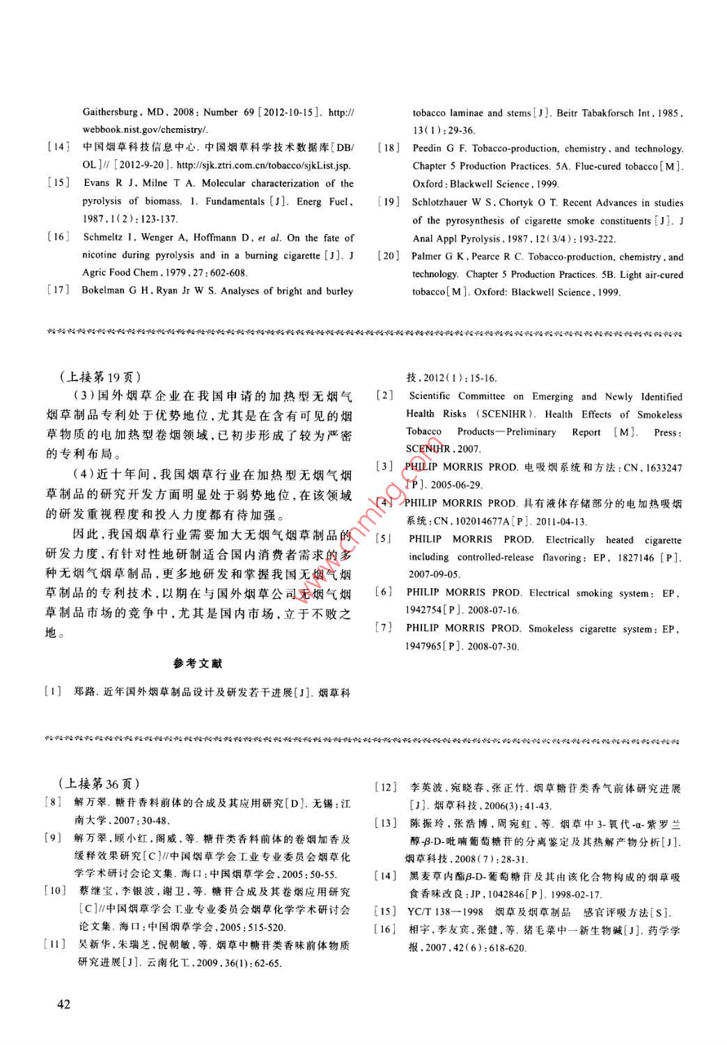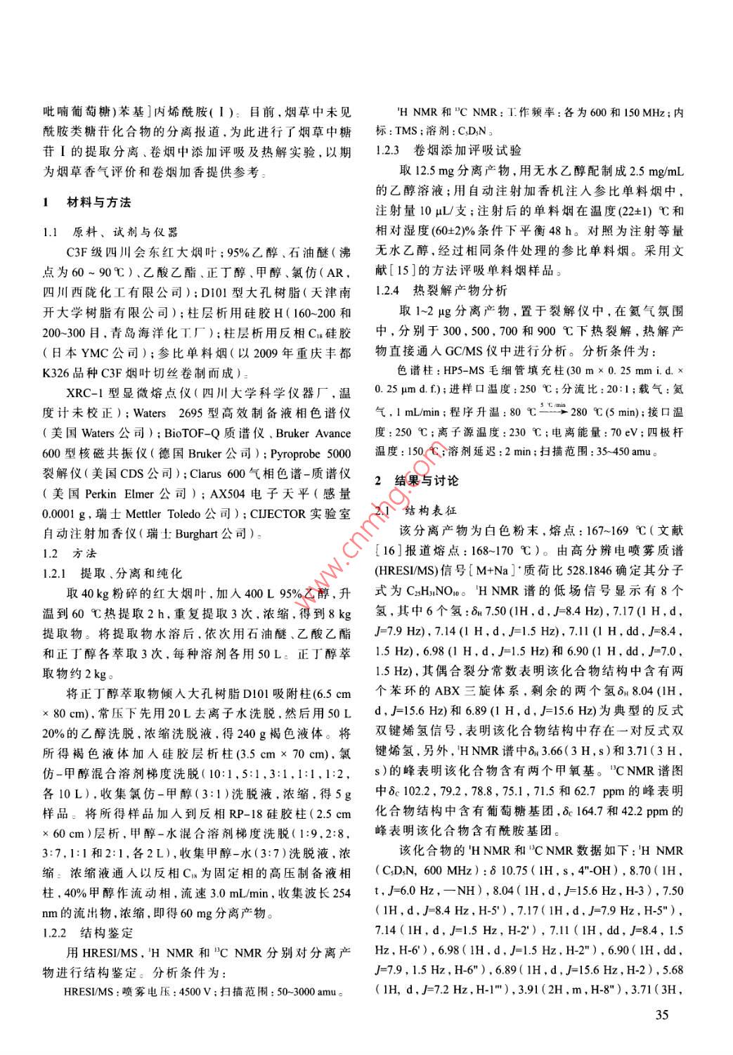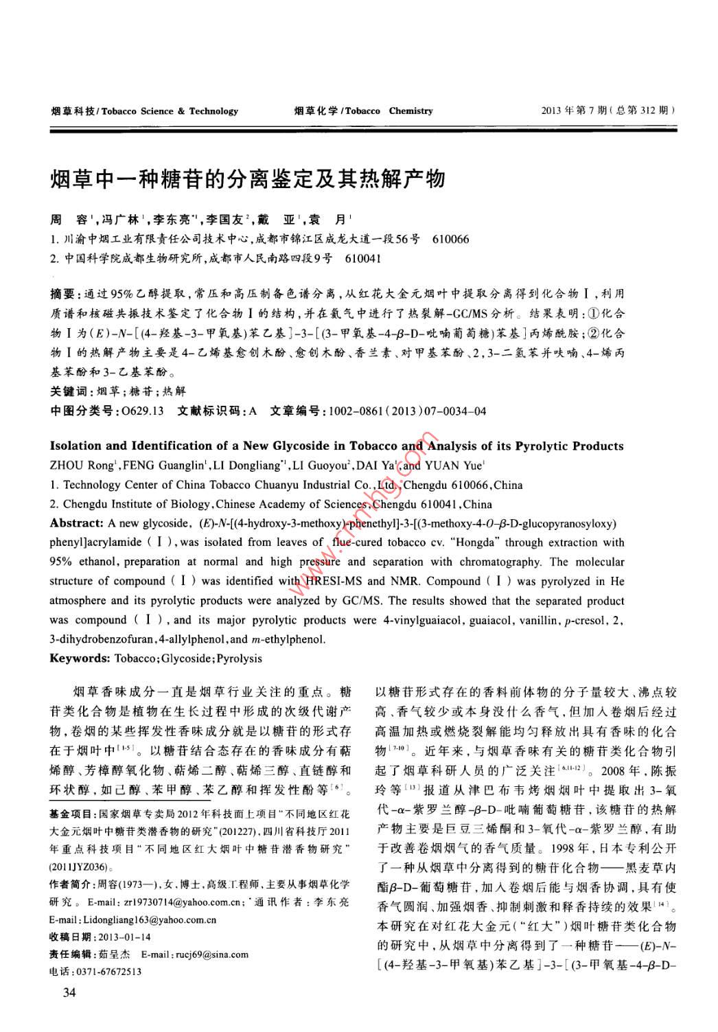 煙草科技/Tobacco Science & Technology煙草化學(xué)/Tobacco Chemnistry2013年第7期(總第312期)煙草中一種糖苷的分離鑒定及其熱解產(chǎn)物周容',馮廣林',李東亮",李國友’,戴亞',袁月'1.川渝中煙工業(yè)有限責(zé)任公司技術(shù)中心,成都市錦江區(qū)成龍大道一-段56號 6100662.中國科學(xué)院成都生物研究所,成都市人民南路四段9號610041摘要:通過95%乙醇提取,常壓和高壓制備色譜分離,從紅花大金元煙葉中提取分離得到化合物I ,利用質(zhì)譜和核磁共振技術(shù)鑒定了化合物I的結(jié)構(gòu),并在氦氣中進(jìn)行了熱裂解-CCMS分析。結(jié)果表明:①化合物I為(E)-N-[(4-羥基-3-甲氧基)苯乙基]-3-[(3-甲氧基-4-B-D-吡喃葡萄糖)苯基]丙烯酰胺;②化合物[的熱解產(chǎn)物主要是4-乙烯基愈創(chuàng)木酚、愈創(chuàng)木酚、香蘭素、對甲基苯酚、2,3-二氫苯并呋喃、4-烯丙基苯酚和3-乙基苯酚。關(guān)鍵詞:煙草;糖苷;熱解.中圖分類號:0629.13文獻(xiàn)標(biāo)識碼:A文章 編號: 1002-0861( 2013 )07-0034- 04Isolation and Identification of a New Glycoside in Tobacco and Analysis of its Pyrolytic ProductsZHOU Rong' , FENG Guanglin' , LI Dongliang",LI Guoyou2 ,DAI Ya' , and YUAN Yue'1. Technology Center of China Tobacco Chuanyu Industrial Co.,Ltd., Chengdu 610066,China2. Chengdu Institute of Biology , Chinese Academy of Sciences , Chengdu 610041 ,ChinaAbstract: A new glycoside, (E)-N-(4-hydroxy-3-methoxy)-phenethyI]-(3-methoxy-4-0 B-D-glucopyranosyloxy)phenyl]acrylamide ( I ), was isolated from leaves of flue- cured tobacco cv.“Hongda" through extraction with95% ethanol, preparation at normal and high pressure and separation with chromatography. The molecularstructure of compound ( I ) was identified with HRESI-MS and NMR. Compound (I ) was pyrolyzed in Heatmosphere and its pyrolytic products were analyzed by GC/MS. The results showed that the separated productwas compound ( I ) , and its major pyrolytic products were 4-vinylguaiacol, guaiacol, vanillin, p-cresol, 2,3-dihydrobenzofuran, 4-allylphenol , and m- ethylphenol.Keywords: Tobacco;Glycoside ;Pyrolysis煙草香昧成分一直是煙草行業(yè)關(guān)注的重點(diǎn)。粗以糖苷形式存在的香料前體物的分子量較大、沸點(diǎn)較苷類化合物是植物在生長過程中形成的次級代謝產(chǎn)高、香氣較少或本身沒什么香氣,但加人卷煙后經(jīng)過物,卷煙的某些揮發(fā)性香味成分就是以糖苷的形式存高溫加熱或燃燒裂解能均勻釋放出具有香味的化合在于煙葉中1.51。以糖苷結(jié)合態(tài)存在的香味成分有萜物1210]。近年來,與煙草香味有關(guān)的糖苷類化合物引烯醇、芳樟醇氧化物、萜烯二醇、萜烯三醇、直鏈醇和起了煙草科研人員的廣泛關(guān)注011)。2008年,陳振環(huán)狀醇,如己醇、苯甲醇、苯乙醇和揮發(fā)性酚等「*]。玲 等()報(bào)道從津巴布韋烤煙煙葉中提取出3-氧基金項(xiàng)目:國家煙草專賣局2012年科技面上項(xiàng)目“不同地區(qū)紅花代-a-紫羅蘭醇-B-D-吡喃葡萄糖苷,該糖苷的熱解大金元煙葉中糖苷類潛香物的研究(0122)四川省科技廳2011產(chǎn)物主要是巨豆三烯酮和3-氧代-a-紫羅 蘭醇,有助年重點(diǎn)科技項(xiàng)目“不同地區(qū)紅大煙葉中糖苷潛香物研究"于改善卷煙煙氣的香氣質(zhì)量。1998年, 日本專利公開(201 1JYZ036)。了一種從煙草中分離得到的糖苷化合物一黑麥草內(nèi)作者簡介:周容(1973- -),女.博士,高級工程師、主要從事煙草化學(xué)酯β_D-葡萄糖苷,加人卷煙后能與煙香協(xié)調(diào),具有使研究。E-mail: zr19730714@yahoo.com.cn; "通訊作者:李東亮香氣圓潤、加強(qiáng)煙香、抑制刺激和釋香持續(xù)的效果|4)。E-mail: Lidongliangl63@yahoo.com.cn本研究在對紅花大金元(“紅大”)煙葉糖苷類化合物收稿日期:2013-01-14的研究中,從煙草中分離得到了一種糖苷一(E)-N-責(zé)任編輯:茹呈杰E-mail:rucj69@sina.com,[(4-羥基-3-甲氧基)苯乙基]-3-[(3-甲氧基-4-B-D-電話:0371-6767251334吡喃葡萄糖)苯基]丙烯酰胺( I ):目前,煙草中未見'HNMR和"CNMR:工作頻率:各為600和150MHz;內(nèi)酰胺類糖苷化合物的分離報(bào)道,為此進(jìn)行了煙草中糖標(biāo):TMS;溶劑:C.D,N。苷I的提取分離、卷煙中添加評吸及熱解實(shí)驗(yàn),以期1.2.3卷煙添加評吸試驗(yàn)為煙草香氣評價(jià)和卷煙加香提供參考。取12.5mg分離產(chǎn)物,用無水乙醇配制成2.5mg/mL的乙醇溶液;用自動注射加香機(jī)注入?yún)⒈葐瘟蠠熤校?材料與方法注射量l0μL支;注射后的單料煙在溫度(22+1) C和1.1 原料、 試劑與儀器相對濕度(60+2)%條件下平衡48h。對照為注射等量C3F級四川會東紅大煙葉;95%乙醇、石油醚(沸無水乙醇,經(jīng)過相同條件處理的參比單料煙。采用文點(diǎn)為60~ 90C)、乙酸乙酯、正丁醇、甲醇、氯仿(AR,獻(xiàn)[15]的方法評吸單料煙樣品。四川西隴化工有限公司);DI01型大孔樹脂(天津南1.2.4熱裂解產(chǎn)物分析開大學(xué)樹脂有限公司);柱層析用硅膠H(160-200和取1~2 ug分離產(chǎn)物,置于裂解儀中,在氦氣氛圍200-300目,青島海洋化工廠);柱層析用反相Cis硅膠中,分別于300, 500, 700和900 C下熱裂解,熱解產(chǎn)(日本YMC公司);參比單料煙(以2009年重慶豐都物直接通人GC/MS儀中進(jìn)行分析。分析條件為:K326品種C3F煙葉切絲卷制而成):色譜柱:HP5-MS毛細(xì)管填充柱(30mx0.25 mmid. xXRC-1型顯微熔點(diǎn)儀(四川大學(xué)科學(xué)儀器廠,溫0. 25 μmd.f);進(jìn)樣口溫度:250 C;分流比:20:|;載氣:氨度計(jì)未校正); Waters 2695 型高效制備液相色譜儀氣.