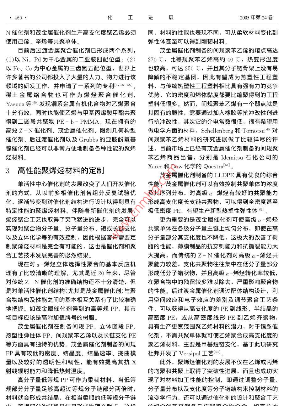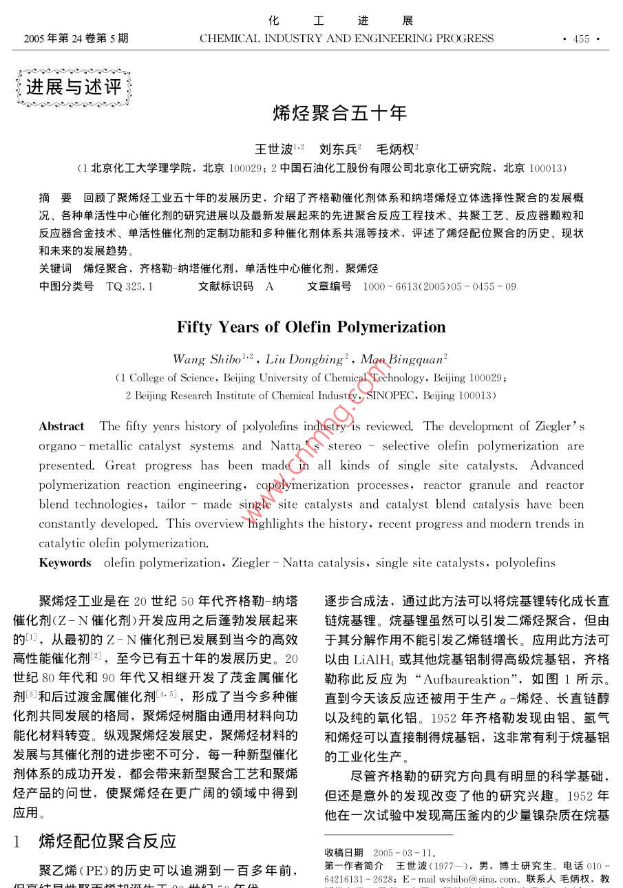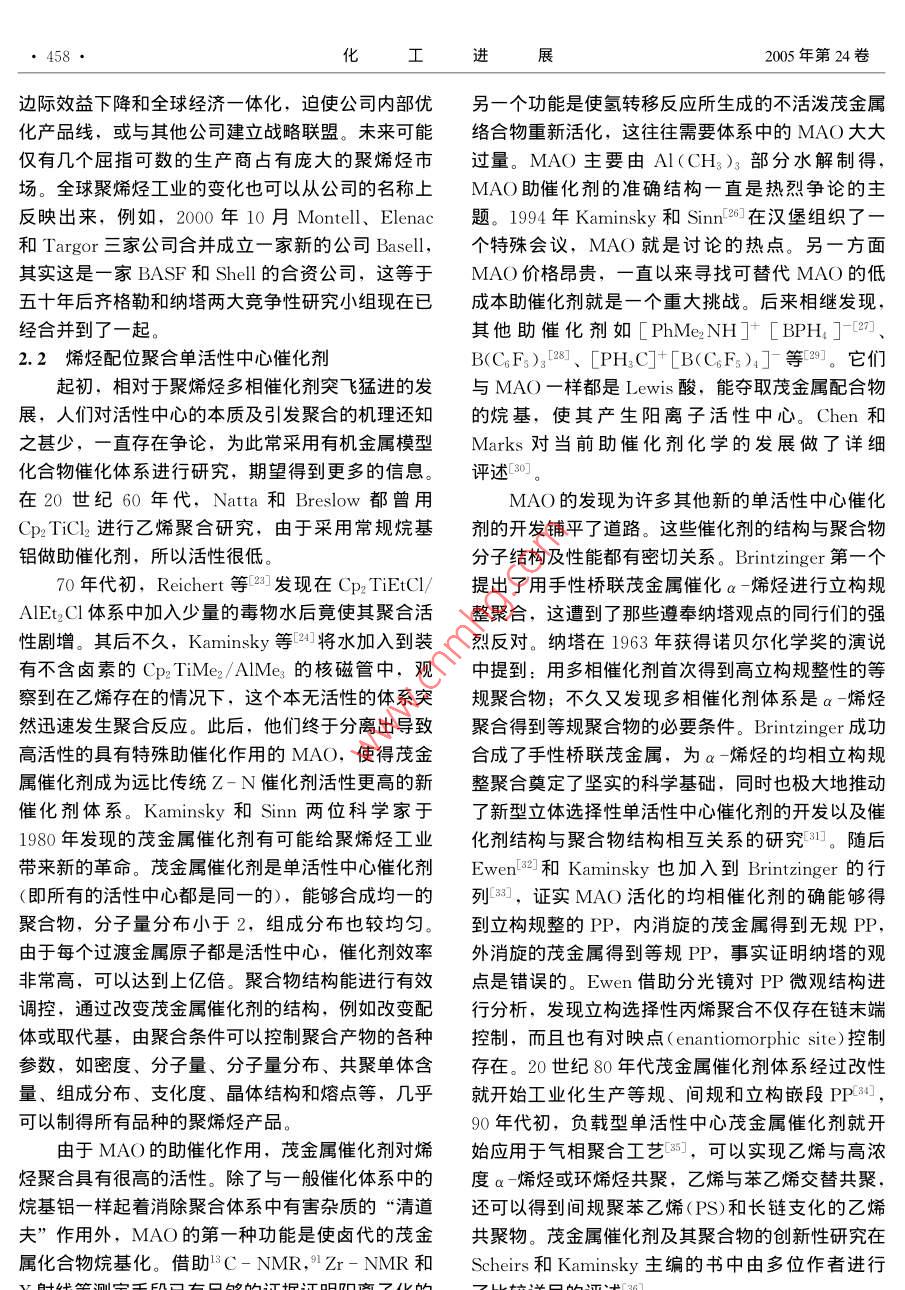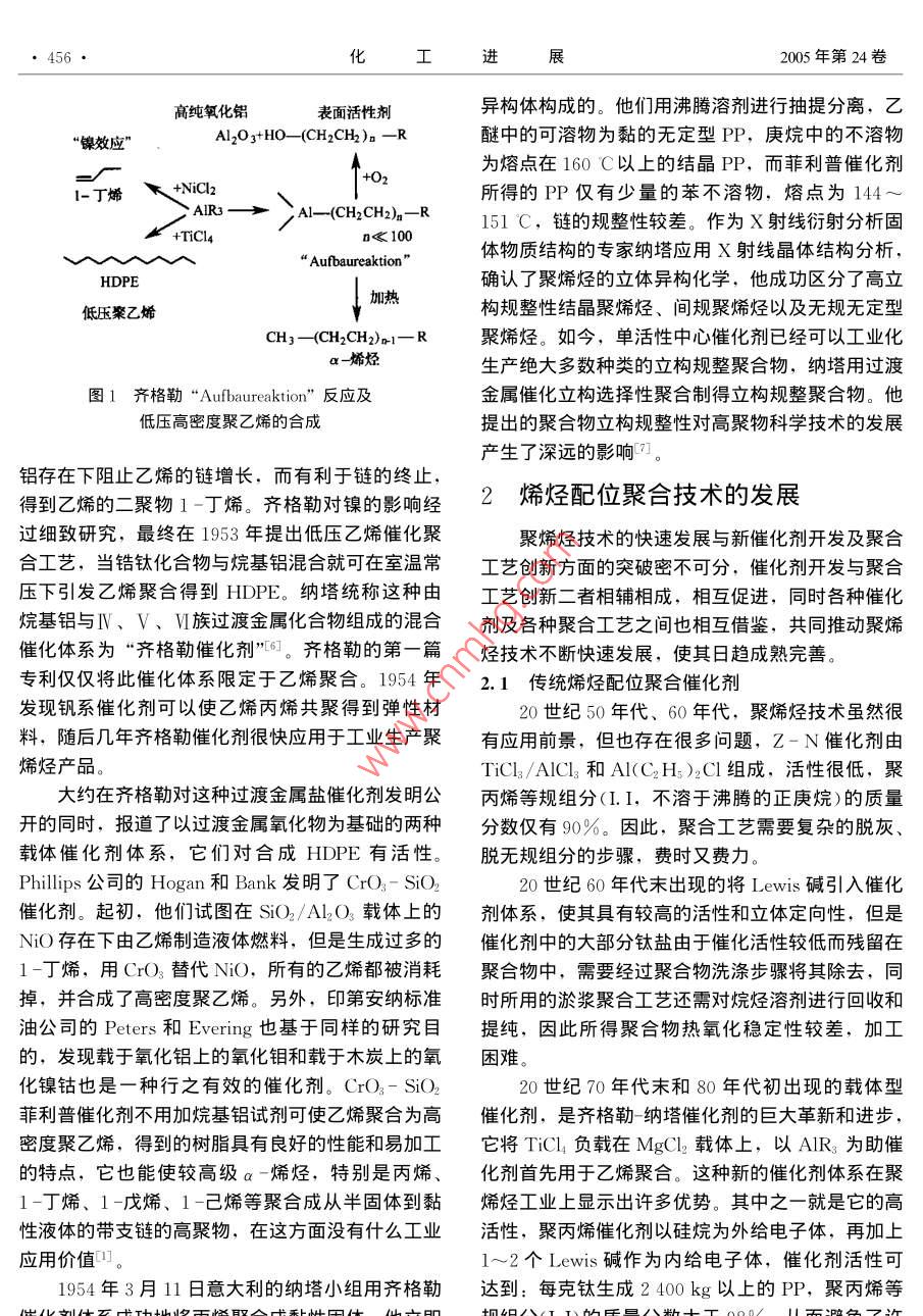 456●化進(jìn)展2005年第24卷高純氧化鋁表面活性劑異構(gòu)體構(gòu)成的。他們用沸騰溶劑進(jìn)行抽提分離,乙“鎳效應(yīng)”Al2O3+HO- (CH2CH2)。 -R醚中的可溶物為黏的無定型PP,庚烷中的不溶物為熔點(diǎn)在160 C以上的結(jié)晶PP,而菲利普催化劑↑+O21-丁烯t +NiCl2所得的PP僅有少量的苯不溶物,熔點(diǎn)為144~AIR3一 戶Al- -(CH2CH2)n-R151 C,鏈的規(guī)整性較差。作為X射線衍射分析固*+TiCl4n< 100體物質(zhì)結(jié)構(gòu)的專家納塔應(yīng)用X射線晶體結(jié)構(gòu)分析,MM“Aufbaureaktion”HDPE確認(rèn)了聚烯烴的立體異構(gòu)化學(xué),他成功區(qū)分了高立低壓聚乙烯構(gòu)規(guī)整性結(jié)晶聚烯烴、間規(guī)聚烯烴以及無規(guī)無定型.CH3- (CH2CH2)n1-R聚烯烴。如今,單活性中心催化劑已經(jīng)可以工業(yè)化a-烯烴生產(chǎn)絕大多數(shù)種類的立構(gòu)規(guī)整聚合物,納塔用過渡圖1齊格勒 “Aufbaureaktion”反應(yīng)及金屬催化立構(gòu)選擇性聚合制得立構(gòu)規(guī)整聚合物。他低壓高密度聚乙烯的合成提出的聚合物立構(gòu)規(guī)整性對(duì)高聚物科學(xué)技術(shù)的發(fā)展產(chǎn)生了深遠(yuǎn)的影響2]。鋁存在下阻止乙烯的鏈增長,而有利于鏈的終止,2烯烴配位聚合技術(shù)的發(fā)展得到乙烯的二聚物1 -丁烯。齊格勒對(duì)鎳的影響經(jīng)過細(xì)致研究,最終在1953年提出低壓乙烯催化聚聚烯烴技術(shù)的快速發(fā)展與新催化劑開發(fā)及聚合合工藝,當(dāng)鋯鈦化合物與烷基鋁混合就可在室溫常工藝創(chuàng)新方面的突破密不可分,催化劑開發(fā)與聚合壓下引發(fā)乙烯聚合得到HDPE。納塔統(tǒng)稱這種由工藝創(chuàng)新二者相輔相成,相互促進(jìn),同時(shí)各種催化烷基鋁與IV、V、VI族過渡金屬化合物組成的混合劑及各種聚合工藝之間也相互借鑒,共同推動(dòng)聚烯催化體系為“齊格勒催化劑”[6]。齊格勒的第一篇烴技術(shù)不斷快速發(fā)展,使其日趨成熟完善。專利僅僅將此催化體系限定于乙烯聚合。1954 年2.1傳統(tǒng)烯烴配位聚合催化劑發(fā)現(xiàn)釩系催化劑可以使乙烯丙烯共聚得到彈性材20世紀(jì)50年代、60年代,聚烯烴技術(shù)雖然很料,隨后幾年齊格勒催化劑很快應(yīng)用于工業(yè)生產(chǎn)聚有應(yīng)用前景,但也存在很多問題,Z- N催化劑由烯烴產(chǎn)品。TiCI3/AICs和Al(C2H)2Cl組成,活性很低,聚大約在齊格勒對(duì)這種過渡金屬鹽催化劑發(fā)明公丙烯等規(guī)組分(I. I,不溶于沸騰的正庚烷)的質(zhì)量開的同時(shí),報(bào)道了以過渡金屬氧化物為基礎(chǔ)的兩種分?jǐn)?shù)僅有90%。因此,聚合工藝需要復(fù)雜的脫灰、載體催化劑體系,它們對(duì)合成HDPE有活性。脫無規(guī)組分的步驟,費(fèi)時(shí)又費(fèi)力。Phillips公司的Hogan 和Bank發(fā)明了CrO3- SiO220世紀(jì)60年代末出現(xiàn)的將Lewis堿引入催化催化劑。起初,他們?cè)噲D在SiO2/Al2O3載體上的劑體系,使其具有較高的活性和立體定向性,但是NiO存在下由乙烯制造液體燃料,但是生成過多的催化劑中的大部分鈦鹽由于催化活性較低而殘留在1-丁烯,用CrO3替代NiO,所有的乙烯都被消耗聚合物中,需要經(jīng)過聚合物洗滌步驟將其除去,同掉,并合成了高密度聚乙烯。另外,印第安納標(biāo)準(zhǔn)時(shí)所用的淤漿聚合工藝還需對(duì)烷烴溶劑進(jìn)行回收和油公司的Peters和Evering也基于同樣的研究目提純,因此所得聚合物熱氧化穩(wěn)定性較差,加工的,發(fā)現(xiàn)載于氧化鋁上的氧化鉬和載于木炭上的氧困難?;団捯彩?種行之有效的催化劑。CrO3- SiO220世紀(jì)70年代末和80年代初出現(xiàn)的載體型菲利普催化劑不用加烷基鋁試劑可使乙烯聚合為高催化劑,是齊格勒-納塔催化劑的巨大革新和進(jìn)步,密度聚乙烯,得到的樹脂具有良好的性能和易加工它將TiCl4負(fù)載在MgCl2載體上,以AlR:為助催的特點(diǎn),它也能使較高級(jí)a-烯烴,特別是丙烯、化劑首先用于乙烯聚合。這種新的催化劑體系在聚1-丁烯、1-戊烯、1-己烯等聚合成從半固體到黏烯烴工業(yè)上顯示出許多優(yōu)勢(shì)。其中之一就是它的高性液體的帶支鏈的高聚物,在這方面沒有什么工業(yè)活性,聚丙烯催化劑以硅烷為外給電子體,再加上應(yīng)用價(jià)值。1~2個(gè)Lewis堿作為內(nèi)給電子體,催化劑活性可1954年3月11日意大利的納塔小組用齊格勒達(dá)到:每克鈦生成2400 kg以上的PP,聚丙烯等催化劑體系成功地將丙烯聚合成黏性固體。他立即規(guī)組分(I. I)的質(zhì)量分?jǐn)?shù)大于98%,從而避免了許意識(shí)到得到的聚丙烯(PP)是由不同性能的非對(duì)映多后處理工序。選擇MgCl2作為載體,-方面可第5期王世波等:烯烴聚合五十年457●能是受菲利普聚乙烯催化劑用硅膠做載體的啟發(fā),進(jìn),如聚合時(shí)加入少量烷基鋁可以大大提高活性,另一方面MgCl2與γ-TiCl3具有相同的晶型能有在催化劑中加入鈦、鋯、鋁、硼和氟的化合物作為效負(fù)載鈦系活性中心,并且可活化鈦系配合物,使改性劑,可以改善和提高催化劑的活性以及聚合物其在高比表面的無定形MgCl2上充分分散,同時(shí)的性能。除了這種負(fù)載的無機(jī)鉻催化劑外,Union產(chǎn)生空配位。由于催化劑的復(fù)制效應(yīng),80年代中Carbide公司( UCC)的Karapinka和Karol等[19] 還期出現(xiàn)的球形載體催化劑可以生產(chǎn)出具有固定尺寸開