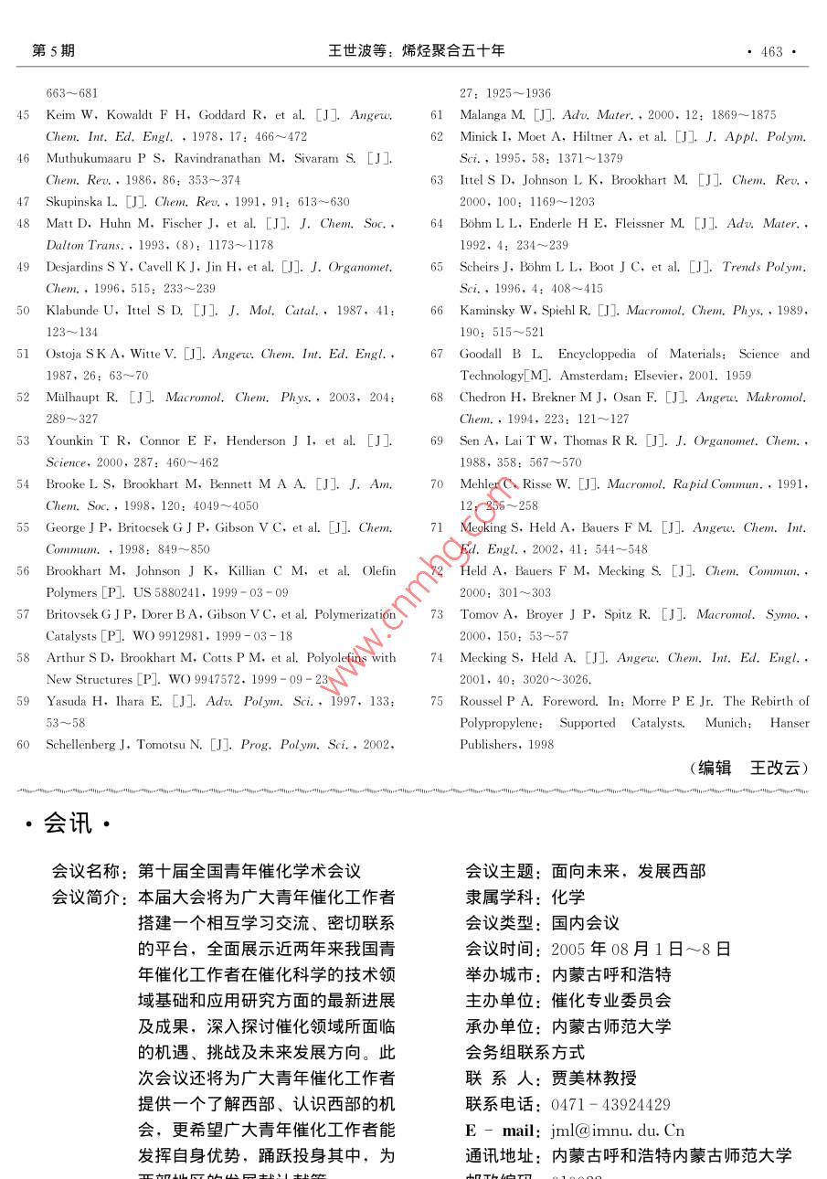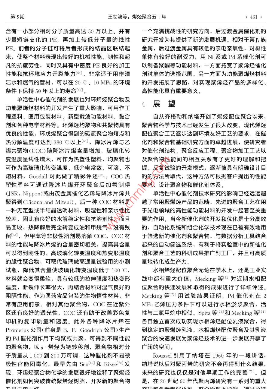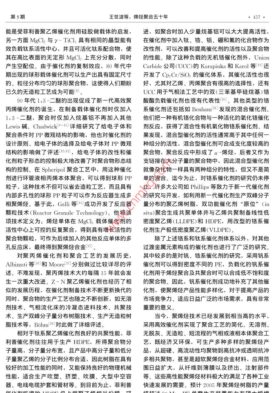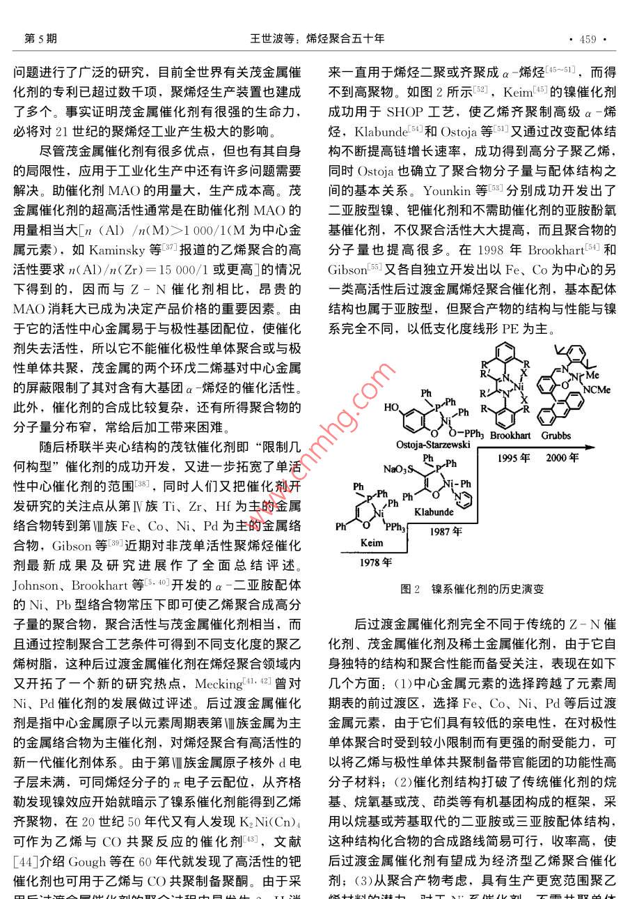 456●化進(jìn)展2005年第24卷高純氧化鋁表面活性劑異構(gòu)體構(gòu)成的。他們用沸騰溶劑進(jìn)行抽提分離,乙“鎳效應(yīng)”Al2O3+HO- (CH2CH2)。 -R醚中的可溶物為黏的無定型PP,庚烷中的不溶物為熔點(diǎn)在160 C以上的結(jié)晶PP,而菲利普催化劑↑+O21-丁烯t +NiCl2所得的PP僅有少量的苯不溶物,熔點(diǎn)為144~AIR3一 戶Al- -(CH2CH2)n-R151 C,鏈的規(guī)整性較差。作為X射線衍射分析固*+TiCl4n< 100體物質(zhì)結(jié)構(gòu)的專家納塔應(yīng)用X射線晶體結(jié)構(gòu)分析,MM“Aufbaureaktion”HDPE確認(rèn)了聚烯烴的立體異構(gòu)化學(xué),他成功區(qū)分了高立低壓聚乙烯構(gòu)規(guī)整性結(jié)晶聚烯烴、間規(guī)聚烯烴以及無規(guī)無定型.CH3- (CH2CH2)n1-R聚烯烴。如今,單活性中心催化劑已經(jīng)可以工業(yè)化a-烯烴生產(chǎn)絕大多數(shù)種類的立構(gòu)規(guī)整聚合物,納塔用過渡圖1齊格勒 “Aufbaureaktion”反應(yīng)及金屬催化立構(gòu)選擇性聚合制得立構(gòu)規(guī)整聚合物。他低壓高密度聚乙烯的合成提出的聚合物立構(gòu)規(guī)整性對(duì)高聚物科學(xué)技術(shù)的發(fā)展產(chǎn)生了深遠(yuǎn)的影響2]。鋁存在下阻止乙烯的鏈增長,而有利于鏈的終止,2烯烴配位聚合技術(shù)的發(fā)展得到乙烯的二聚物1 -丁烯。齊格勒對(duì)鎳的影響經(jīng)過細(xì)致研究,最終在1953年提出低壓乙烯催化聚聚烯烴技術(shù)的快速發(fā)展與新催化劑開發(fā)及聚合合工藝,當(dāng)鋯鈦化合物與烷基鋁混合就可在室溫常工藝創(chuàng)新方面的突破密不可分,催化劑開發(fā)與聚合壓下引發(fā)乙烯聚合得到HDPE。納塔統(tǒng)稱這種由工藝創(chuàng)新二者相輔相成,相互促進(jìn),同時(shí)各種催化烷基鋁與IV、V、VI族過渡金屬化合物組成的混合劑及各種聚合工藝之間也相互借鑒,共同推動(dòng)聚烯催化體系為“齊格勒催化劑”[6]。齊格勒的第一篇烴技術(shù)不斷快速發(fā)展,使其日趨成熟完善。專利僅僅將此催化體系限定于乙烯聚合。1954 年2.1傳統(tǒng)烯烴配位聚合催化劑發(fā)現(xiàn)釩系催化劑可以使乙烯丙烯共聚得到彈性材20世紀(jì)50年代、60年代,聚烯烴技術(shù)雖然很料,隨后幾年齊格勒催化劑很快應(yīng)用于工業(yè)生產(chǎn)聚有應(yīng)用前景,但也存在很多問題,Z- N催化劑由烯烴產(chǎn)品。TiCI3/AICs和Al(C2H)2Cl組成,活性很低,聚大約在齊格勒對(duì)這種過渡金屬鹽催化劑發(fā)明公丙烯等規(guī)組分(I. I,不溶于沸騰的正庚烷)的質(zhì)量開的同時(shí),報(bào)道了以過渡金屬氧化物為基礎(chǔ)的兩種分?jǐn)?shù)僅有90%。因此,聚合工藝需要復(fù)雜的脫灰、載體催化劑體系,它們對(duì)合成HDPE有活性。脫無規(guī)組分的步驟,費(fèi)時(shí)又費(fèi)力。Phillips公司的Hogan 和Bank發(fā)明了CrO3- SiO220世紀(jì)60年代末出現(xiàn)的將Lewis堿引入催化催化劑。起初,他們?cè)噲D在SiO2/Al2O3載體上的劑體系,使其具有較高的活性和立體定向性,但是NiO存在下由乙烯制造液體燃料,但是生成過多的催化劑中的大部分鈦鹽由于催化活性較低而殘留在1-丁烯,用CrO3替代NiO,所有的乙烯都被消耗聚合物中,需要經(jīng)過聚合物洗滌步驟將其除去,同掉,并合成了高密度聚乙烯。另外,印第安納標(biāo)準(zhǔn)時(shí)所用的淤漿聚合工藝還需對(duì)烷烴溶劑進(jìn)行回收和油公司的Peters和Evering也基于同樣的研究目提純,因此所得聚合物熱氧化穩(wěn)定性較差,加工的,發(fā)現(xiàn)載于氧化鋁上的氧化鉬和載于木炭上的氧困難?;団捯彩?種行之有效的催化劑。CrO3- SiO220世紀(jì)70年代末和80年代初出現(xiàn)的載體型菲利普催化劑不用加烷基鋁試劑可使乙烯聚合為高催化劑,是齊格勒-納塔催化劑的巨大革新和進(jìn)步,密度聚乙烯,得到的樹脂具有良好的性能和易加工它將TiCl4負(fù)載在MgCl2載體上,以AlR:為助催的特點(diǎn),它也能使較高級(jí)a-烯烴,特別是丙烯、化劑首先用于乙烯聚合。這種新的催化劑體系在聚1-丁烯、1-戊烯、1-己烯等聚合成從半固體到黏烯烴工業(yè)上顯示出許多優(yōu)勢(shì)。其中之一就是它的高性液體的帶支鏈的高聚物,在這方面沒有什么工業(yè)活性,聚丙烯催化劑以硅烷為外給電子體,再加上應(yīng)用價(jià)值。1~2個(gè)Lewis堿作為內(nèi)給電子體,催化劑活性可1954年3月11日意大利的納塔小組用齊格勒達(dá)到:每克鈦生成2400 kg以上的PP,聚丙烯等催化劑體系成功地將丙烯聚合成黏性固體。他立即規(guī)組分(I. I)的質(zhì)量分?jǐn)?shù)大于98%,從而避免了許意識(shí)到得到的聚丙烯(PP)是由不同性能的非對(duì)映多后處理工序。選擇MgCl2作為載體,-方面可第5期王世波等:烯烴聚合五十年457●能是受菲利普聚乙烯催化劑用硅膠做載體的啟發(fā),進(jìn),如聚合時(shí)加入少量烷基鋁可以大大提高活性,另一方面MgCl2與γ-TiCl3具有相同的晶型能有在催化劑中加入鈦、鋯、鋁、硼和氟的化合物作為效負(fù)載鈦系活性中心,并且可活化鈦系配合物,使改性劑,可以改善和提高催化劑的活性以及聚合物其在高比表面的無定形MgCl2上充分分散,同時(shí)的性能。除了這種負(fù)載的無機(jī)鉻催化劑外,Union產(chǎn)生空配位。由于催化劑的復(fù)制效應(yīng),80年代中Carbide公司( UCC)的Karapinka和Karol等[19] 還期出現(xiàn)的球形載體催化劑可以生產(chǎn)出具有固定尺寸開