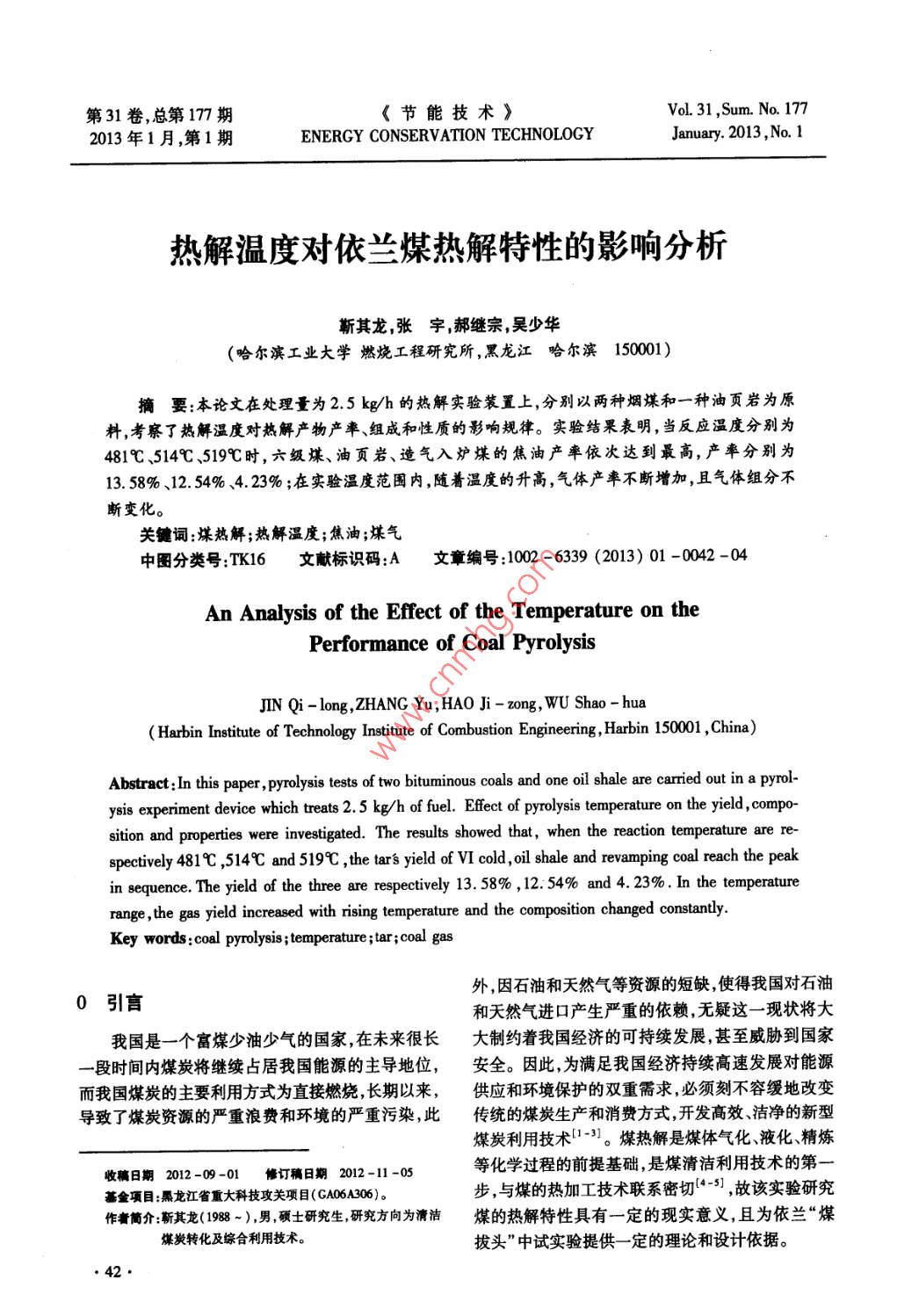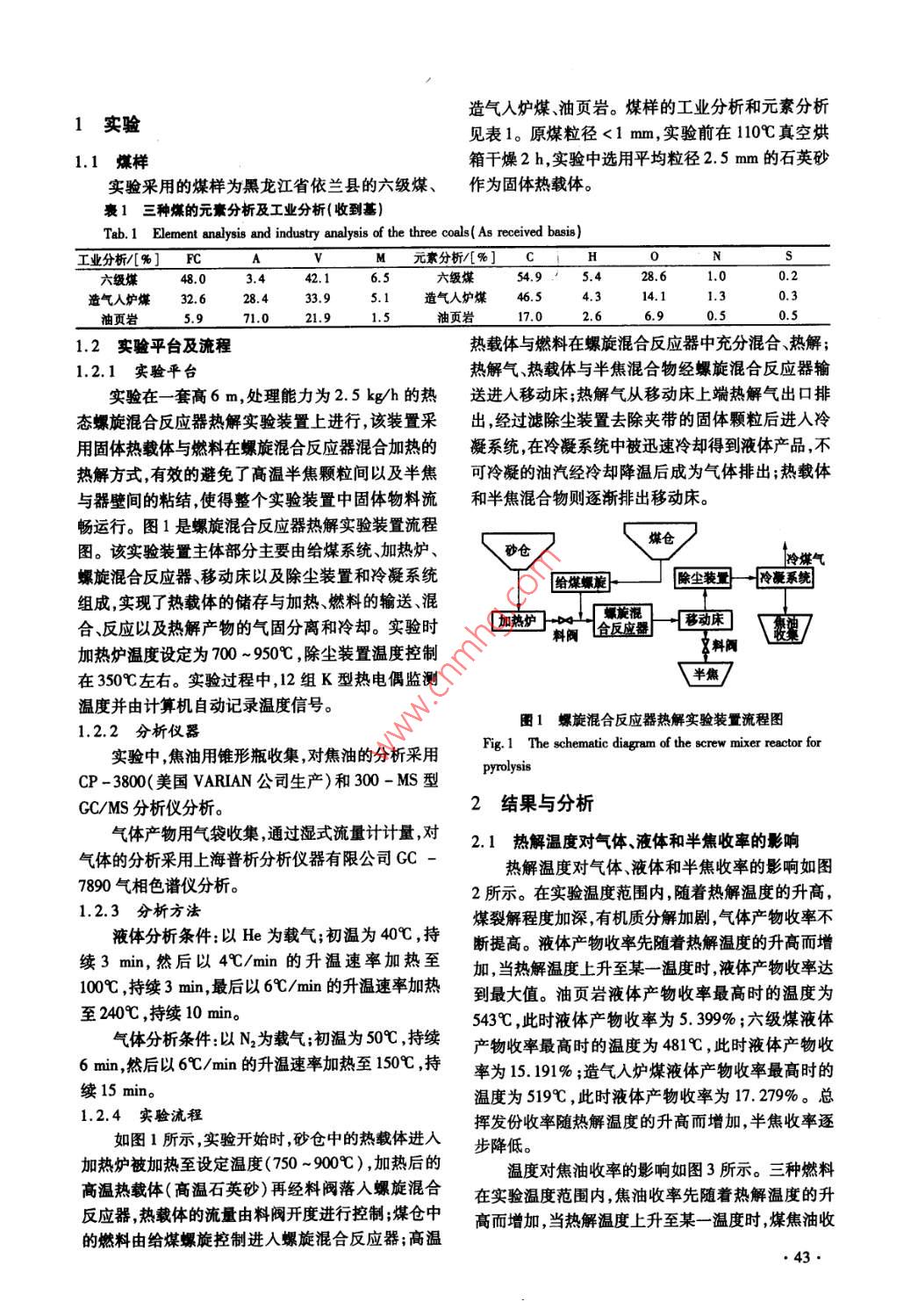 第31卷,總第177期《節(jié)能技術(shù)》Vol. 31 ,Sum. No. 1772013年1月,第1期ENERGY CONSERVATION TECHNOLOGYJanuary. 2013 ,No. 1熱解溫度對依蘭煤熱解特性的影響分析靳其龍,張字,郝繼宗,吳少華(哈爾濱工業(yè)大學(xué)燃燒工程研究所,黑龍江哈爾濱150001)摘要:本論文在處理量為2.5 kg/h的熱解實(shí)驗(yàn)裝置上,分別以兩種煙煤和一種油頁巖為原料,考察了熱解溫度對熱解產(chǎn)物產(chǎn)率、組成和性質(zhì)的影響規(guī)律。實(shí)驗(yàn)結(jié)果表明,當(dāng)反應(yīng)溫度分別為4819、514C、519時,六級煤、油頁巖、造氣入爐煤的焦油產(chǎn)率依次達(dá)到最高,產(chǎn)率分別為13. 58%、12.54%、4. 23%;在實(shí)驗(yàn)溫度范圍內(nèi),隨著溫度的升高,氣體產(chǎn)率不斷增加,且氣體組分不斷變化。關(guān)鍵詞:煤熱解;熱解溫度;焦油;煤氣中圈分類號:TK16文獻(xiàn)標(biāo)識碼:A文章編號:1002 -6339 (2013) 01 -0042 -04An Analysis of the Effect of the Temperature on thePerformance of Coal PyrolysisJIN Qi - long,ZHANG Yu,HAO Ji - zong, WU Shao - hua( Harbin Institute of Technology Institute of Combustion Engineering , Habin 150001 ,China)Abstract:In this paper , pyrolysis tests of two bituminous coals and one oil shale are crried out in a pyrol-ysis experiment device which treats 2.5 kg/h of fuel. Effect of pyrolysis temperature on the yield , compo-sition and properties were investigated. The results showed that, when the reaction temperature are re-spectively 4819 ,514C and 519C ,the tar's yield of VI cold ,oil shale and revamping coal reach the peakin sequence. The yield of the three are repectively 13. 58% , 12.54% and 4. 23% . In the temperaturerange,the gas yield increased with rising temperature and the composition changed constantly.Key words :coal pyrolysis ;temperature;tar;coal gas外,因石油和天然氣等資源的短缺,使得我國對石油0引言和天然氣進(jìn)口產(chǎn)生嚴(yán)重的依賴,無疑這一現(xiàn)狀將大我國是一-個富煤少油少氣的國家,在未來很長大制約著我國經(jīng)濟(jì)的可持續(xù)發(fā)展,甚至威脅到國家一段時間內(nèi)煤炭將 繼續(xù)占居我國能源的主導(dǎo)地位,安全。因此,為滿足我國經(jīng)濟(jì)持續(xù)高速發(fā)展對能源而我國煤炭的主要利用方式為直接燃燒,長期以來,供應(yīng)和環(huán)境保護(hù)的雙重需求,必須刻不容緩地改變導(dǎo)致了煤炭資源的嚴(yán)重浪費(fèi)和環(huán)境的嚴(yán)重污染,此傳統(tǒng)的煤炭生產(chǎn)和消費(fèi)方式,開發(fā)高效、潔凈的新型煤炭利用技術(shù)1-3]。煤熱解是煤體氣化、液化、精煉等化學(xué)過程的前提基礎(chǔ),是煤清潔利用技術(shù)的第-收稿日期2012-09-01 修訂稿日期 2012-11 -05基金項(xiàng)目:黑龍江省重大科技攻關(guān)項(xiàng)目(GA06A306)。步,與煤的熱加工技術(shù)聯(lián)系密切(4-5] ,故該實(shí)驗(yàn)研究作者簡介:靳其龍( 1988 -),男,碩士研究生,研究方向?yàn)榍鍧嵜旱臒峤馓匦跃哂?定的現(xiàn)實(shí)意義,且為依蘭“煤煤炭轉(zhuǎn)化及綜合利用技術(shù)。拔頭”中試實(shí)驗(yàn)提供- -定 的理論和設(shè)計(jì)依據(jù)?!?2●造氣入爐煤、油頁巖。煤樣的工業(yè)分析和元素分析1實(shí)驗(yàn)見表1。原煤粒徑<1 mm,實(shí)驗(yàn)前在110C真空烘1.1煤樣箱干燥2 h,實(shí)驗(yàn)中選用平均粒徑2.5 mm的石英砂實(shí)驗(yàn)采用的煤樣為黑龍江省依蘭縣的六級煤、作為固體熱載體。表1三種煤的元素分析及工業(yè)分析( 收到基)ab. 1 Element analysis and industry analysis of the three coals( As received basis)工業(yè)分析/[% ]FCAM元素分析/[%] C H0S六級煤48.03.442.16.554.9/ 5.428.61.00.2造氣入爐煤32.628.433.9.1造氣人爐煤46.54.314.11.0.油頁巖5.971.021.91.517.02.6,0.51.2實(shí)驗(yàn)平臺及流程熱載體與燃料在螺旋混合反應(yīng)器中充分混合、熱解;1.2.1實(shí)驗(yàn)平臺熱解氣熱載體與半焦混合物經(jīng)螺旋混合反應(yīng)器輸實(shí)驗(yàn)在一套高6 m,處理能力為2.5 kg/h的熱:送進(jìn)入移動床;熱解氣從移動床上端熱解氣出口排態(tài)螺旋混合反應(yīng)器熱解實(shí)驗(yàn)裝置上進(jìn)行,該裝置采出,經(jīng)過濾除塵裝置去除夾帶的固體顆粒后進(jìn)人冷用固體熱載體與燃料在螺旋混合反應(yīng)器混合加熱的凝系統(tǒng),在冷凝系統(tǒng)中被迅速冷卻得到液體產(chǎn)品,不熱解方式,有效的避免了高溫半焦顆粒間以及半焦可冷凝的油汽經(jīng)冷卻降溫后成為氣體排出;熱載體與器壁間的粘結(jié),使得整個實(shí)驗(yàn)裝置中固體物料流和半焦混合物則逐漸排出移動床。暢運(yùn)行。圖1是螺旋混合反應(yīng)器熱解實(shí)驗(yàn)裝置流程煤倉圖。該實(shí)驗(yàn)裝置主體部分主要由給煤系統(tǒng)加熱爐、砂倉螺旋混合反應(yīng)器移動床以及除塵裝置和冷凝系統(tǒng)給煤螺旋-除塵裝量+冷凝系統(tǒng)組成,實(shí)現(xiàn)了熱載體的儲存與加熱燃料的輸送、混合、反應(yīng)以及熱解產(chǎn)物的氣固分離和冷卻。實(shí)驗(yàn)時料閥合反應(yīng)器&料閥加熱爐溫度設(shè)定為700 ~ 950C ,除塵裝置溫度控制在350C左右。實(shí)驗(yàn)過程中,12組K型熱電偶監(jiān)測半焦/溫度并由計(jì)算機(jī)自動記錄溫度信號。圈1螺旋混合反應(yīng)器熱解實(shí)驗(yàn)裝置流程圖1.2.2分析儀器Fig.1 The schematic diagram of the screw mixer reactor for實(shí)驗(yàn)中,焦油用錐形瓶收集,對焦油的分析采用pyrolysisCP -3800(美國VARIAN公司生產(chǎn))和300 -M