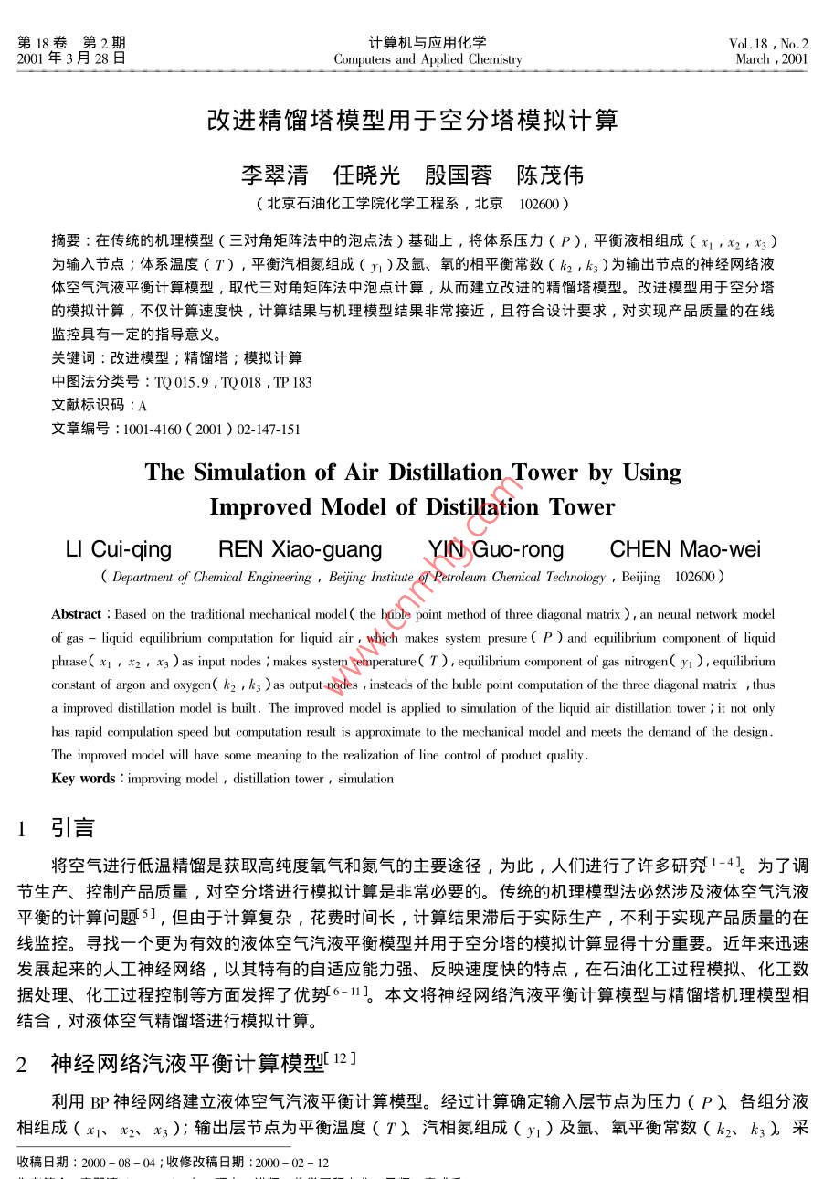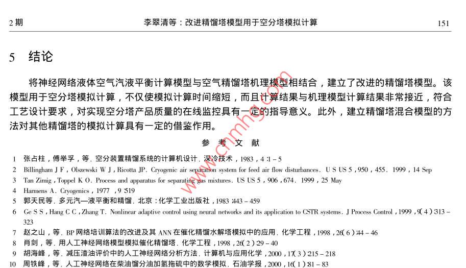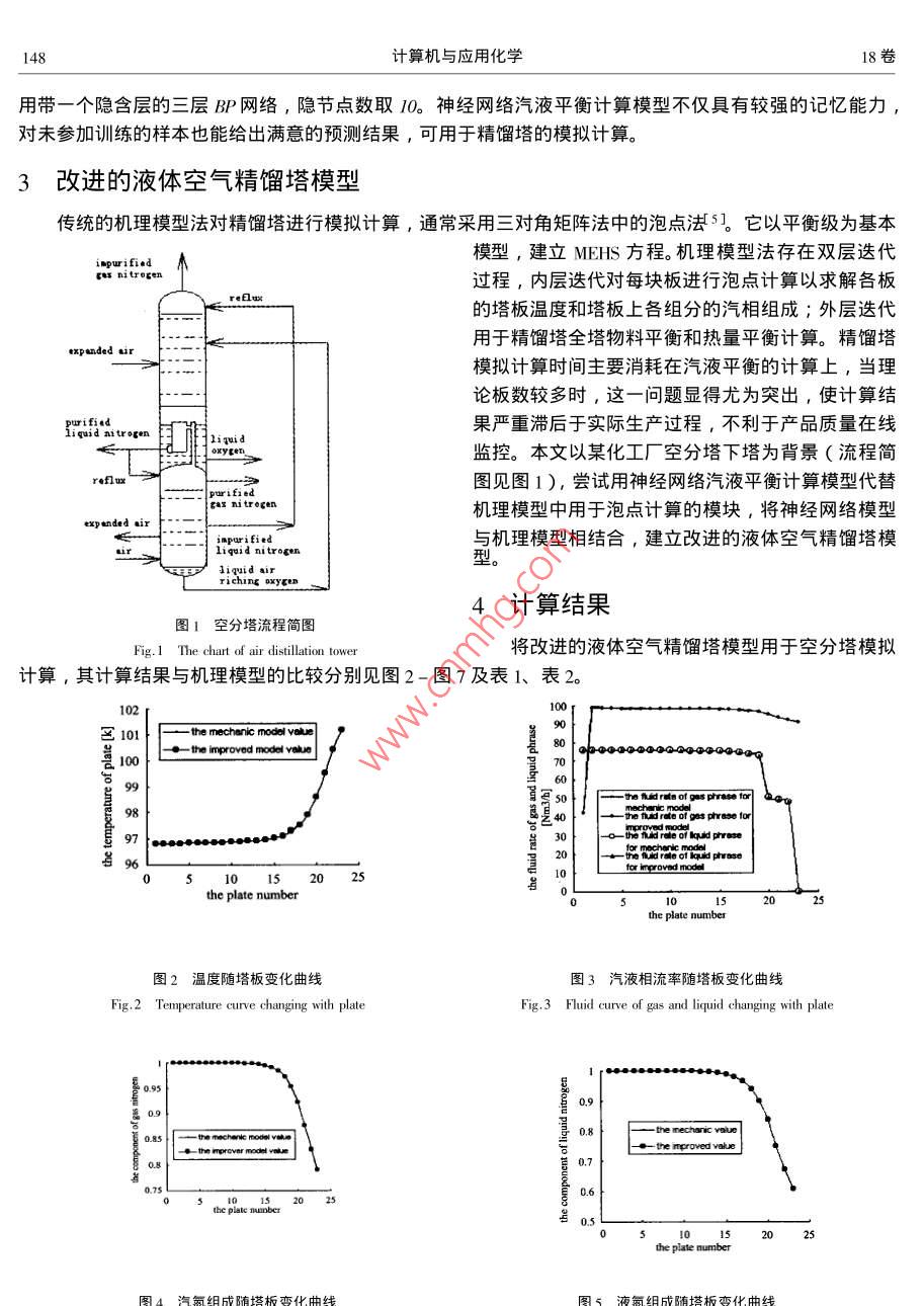 第18卷第2期計(jì)算機(jī)與應(yīng)用化學(xué)Vol. 182001年3月28日d Applied ChemistryMarck改進(jìn)精餾塔模型用于空分塔模擬計(jì)算李翠清任曉光殷國(guó)蓉陳茂偉北京石油化工學(xué)院化學(xué)工程系,北京102600)摘要∶在傳統(tǒng)的機(jī)理模型(三對(duì)角矩陣法中的泡點(diǎn)法)基礎(chǔ)上,將體系壓力(P),平衡液相組成(x,x2,x3)為輸入節(jié)點(diǎn);體系溫度(T),平衡汽相氮組成(y)及氬、氧的相平衡常數(shù)(k2,k3)為輸岀節(jié)點(diǎn)的神經(jīng)網(wǎng)絡(luò)液體空氣汽液平衡計(jì)算模型,取代三對(duì)角矩陣法中泡點(diǎn)計(jì)箅,從而建立改進(jìn)的精餾塔模型。改進(jìn)模型用于空分塔的模擬計(jì)算,不僅計(jì)算速度快,計(jì)算結(jié)果與機(jī)理模型結(jié)果非常接近,且符合設(shè)計(jì)要求,對(duì)實(shí)現(xiàn)產(chǎn)品質(zhì)量的在線監(jiān)控具有一定的指導(dǎo)意義。關(guān)鍵詞∶改進(jìn)模型;精餾塔;模擬計(jì)箅中圖法分類號(hào):TQ015.9,TQ018,TP183文獻(xiàn)標(biāo)識(shí)碼:A文章編號(hào):1001-4160(201)02-147-15The Simulation of Air Distillation Tower by UsingImproved Model of Distillation TowerLI Cui-qIngRENXⅰ ao-guauang YIN Guo-rong CHEN Mao-WeiDepartment of Chemical Engineering, Beijing Institute of Petroleum Chemical Technology, Beijing 102600)Abstract: Based on the traditional mechanical model( the buble point method of three diagonal matrix ) an neural network modelof gas-liquid equilibrium computation for liquid air, which makes system presure( P)and equilibrium component of liquidphrase( xi,x2,x3) as input nodes makes system temperature( T), equilibrium component of gas nitrogen( yi), equilibriumonstant of argon and oxygen k?, k3 )as output nodes, insteads of the buble point computation of the three diagonal matrix thusa improved distillation model is built. The improved model is applied to simulation of the liquid air distillation tower it not onlyhas rapid compulation speed but computation result is approximate to the mechanical model and meets the demand of the designto the realization of line control of product qu:Key words: improving model distillate1引言將空氣進(jìn)行低溫精餾是獲取高純度氧氣和氮?dú)獾闹饕緩?為此,人們進(jìn)行了許多研究1-4。為了調(diào)節(jié)生產(chǎn)、控制產(chǎn)品質(zhì)量,對(duì)空分塔進(jìn)行模擬計(jì)算是非常必要的。傳統(tǒng)旳杋理模型法必然涉及液體空氣汽液平衡的計(jì)算問題5,但由于計(jì)算復(fù)雜,花費(fèi)時(shí)間長(zhǎng),計(jì)算結(jié)果滯后于實(shí)際生產(chǎn),不利于實(shí)現(xiàn)產(chǎn)品質(zhì)量的在線監(jiān)控。尋找一個(gè)更為有效的液體空氣汽液平衡模型并用于空分塔的模擬計(jì)算顯得十分重要。近年來迅速發(fā)展起來的人工神經(jīng)網(wǎng)絡(luò),以其特有的自適應(yīng)能力強(qiáng)、反映速度快的特點(diǎn),在石油化工過程模擬、化工數(shù)據(jù)處理、化工過程控制等方面發(fā)揮了優(yōu)勢(shì)δ-]本文將神經(jīng)網(wǎng)絡(luò)汽液平衡計(jì)算模型與精餾塔機(jī)理模型相結(jié)合,對(duì)液體空氣精餾塔進(jìn)行模擬計(jì)算。2神經(jīng)網(wǎng)絡(luò)汽液平衡計(jì)算模型1利用BP神經(jīng)網(wǎng)絡(luò)建立液體空氣汽液平衡計(jì)算模型。經(jīng)過計(jì)算確定輸入層節(jié)點(diǎn)為壓力(P)各組分液相組成(x1、x2、x3);輸出層節(jié)點(diǎn)為平衡溫度(T)汽相氮組成(y1)及氬、氧平衡常數(shù)(k2、k3)采000-08-04日期:2000-02-12148計(jì)算機(jī)與應(yīng)用化學(xué)18卷用帶一個(gè)隱含層的三層B網(wǎng)絡(luò),隱節(jié)點(diǎn)數(shù)取10。神經(jīng)網(wǎng)絡(luò)汽液平衡計(jì)算模型不僅具有較強(qiáng)的記憶能力,對(duì)未參加訓(xùn)練的樣本也能給岀滿意的預(yù)測(cè)結(jié)果,可用于精餾塔旳模擬計(jì)算。3改進(jìn)的液體空氣精餾塔模型傳統(tǒng)的杋理模型法對(duì)精餾塔進(jìn)行模擬計(jì)算,通常采用三對(duì)角矩陣法中的泡點(diǎn)法5。它以平衡級(jí)為基本模型,建立MEHS方程。機(jī)理模型法存在雙層迭代nitr。gn過程,內(nèi)層迭代對(duì)每塊板進(jìn)行泡點(diǎn)計(jì)算以求解各板的塔板溫度和塔板上各組分的汽相組成;外層迭代用于精餾塔全塔物料平衡和熱量平衡計(jì)算。精餾塔expanded air模擬計(jì)算時(shí)間主要消耗在汽液平衡的計(jì)算上,當(dāng)理論板數(shù)較多時(shí),這一問題顯得尤為突出,使計(jì)算結(jié)ifi.dquid nitro果嚴(yán)重滯后于實(shí)際生產(chǎn)過程,不利于產(chǎn)品質(zhì)量在線監(jiān)控。本文以某化工廠空分塔下塔為背景(流程簡(jiǎn)圖見圖1),嘗試用神經(jīng)網(wǎng)絡(luò)汽液平衡計(jì)算模型代替機(jī)理模型中用于泡點(diǎn)計(jì)算的模塊,將神經(jīng)網(wǎng)絡(luò)模型與機(jī)理模型相結(jié)合,建立改進(jìn)的液體空氣精餾塔模seE liquidriching oxycen4計(jì)算結(jié)果圖1空分塔流程簡(jiǎn)圖將改進(jìn)的液體空氣精餾塔模型用于空分塔模擬計(jì)算,其計(jì)算結(jié)果與機(jī)理模型的比較分別見圖2-圖7及表1、表2。101mechanic modelprayer meot1015dthe plate number圖2溫度隨塔板變化曲線板變化曲線Fig 2 Temperature curve changing with plateg 3 Fluid curve of gas and liquid chang期李翠清等:改進(jìn)精餾塔模型用于空分塔模擬計(jì)算1492.50E016.11圖6液氧組成隨塔板變化曲線圖7塔板壓力隨塔板變化曲線Fig. 6 The compoent curve 
