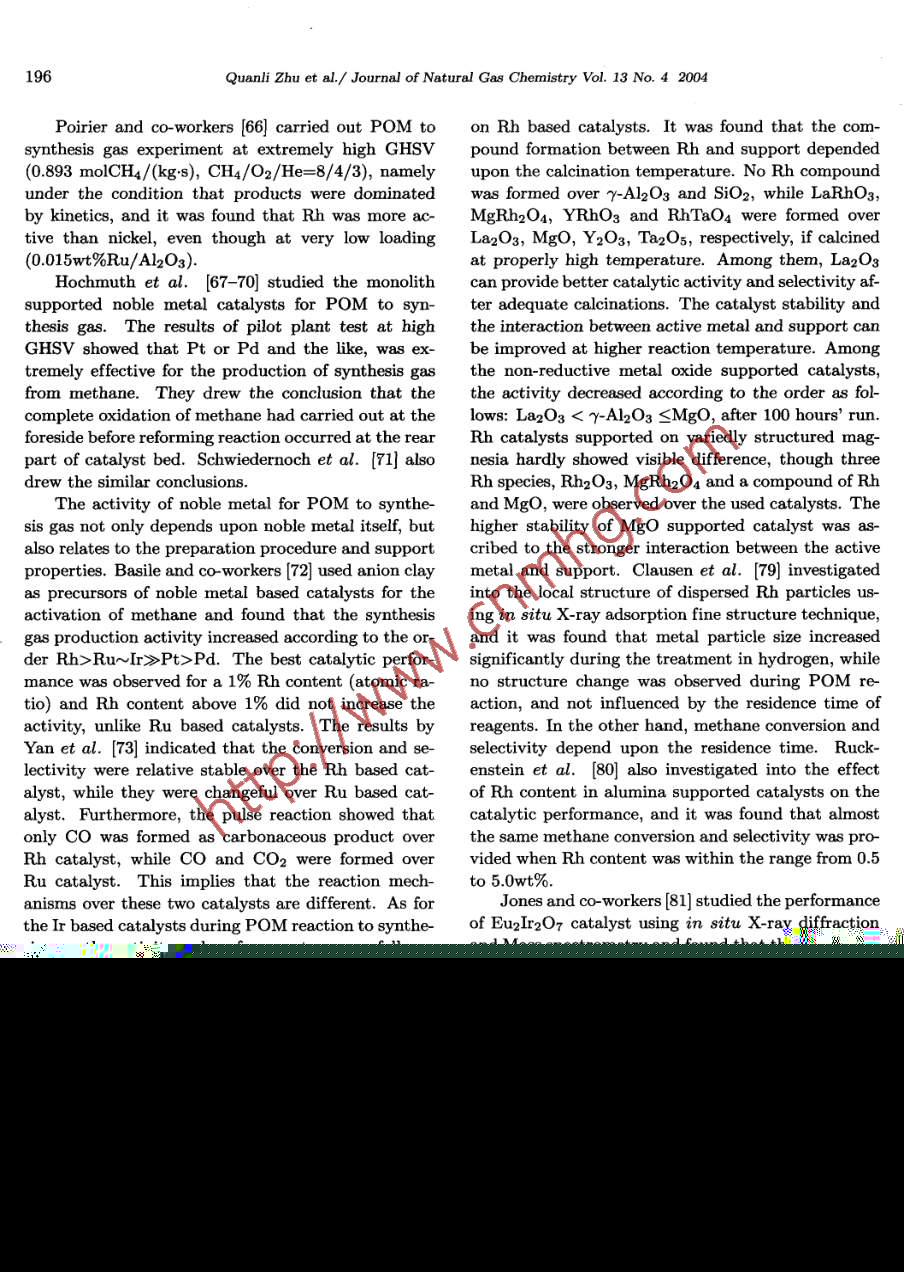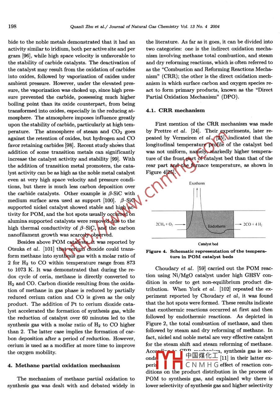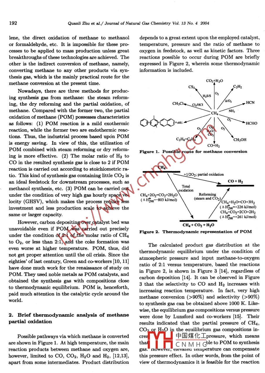 Journal of Natural Gas Chemistry 13(2004)191-203SCIENCE PRESSAdvances in the Partial Oxidation of Methane to Synthesis GasQuanli Zhu,2, Xutao Zhao, Youquan Deng1. Petrochemical Research Institute of Lanzhou Petrochemical Company, China National Petroleun CorporatLanzhou 790060, China; 2. State Key Laboratory for Oro Symthesis and Selective Oxidation, LanzhouInstitute of Chemical Physics, Chinese Academy of Sciences, Lanzhou 730000, ChinaManuscript received November 10, 2004; revised November 26, 2004Abstract: The conversion and utilization of natural gas is of significant meaning to the national economy,even to the everyday life of people. However, it has not become a popular industrial process as expecteddue to the technical obstacles. In the past decades, much investigation into the conversion of methane,predominant component of natural gas, has been carried out. Among the possible routes of methaneconversion, the partial oxidation of methane to synthesis gas is considered as an effective and economicallyfeasible one. In this article, a brief review of recent studies on the mechanism of the partial oxidation ofmethane to synthesis gas together with catalyst development is wherein presentedKey words: methane partial oxidation, synthesis gas, catalyst, reaction mechanism1. Introductionrate was no more than 30%[2, 3, and in the pro-cess of direct oxidation of methane to methanol 4]orNatural gas, which is. mainly composed of formaldehyde 5], the highest productive rate was 8%methane, is an abundant resource found: over the and 4%, respectively. It was recently reported that aworld and is predicated to outlast the oil reserves 50% of methanol productive rate was achieved by aby a significant margin 1]Most of these reserves,pilot plant in homogeneous catalysis, but still lowerhowever,are situated in the areas far away from the than what is expected (6, 7 ] On the other hand, themarkets of highest energy consumption, and the ex- mercury and concentrated sulfuric acid was used inpensive cost of compression, transportation and stor- this process, and the resulted sulfuric dioxide shouldage,makes the utilization of natural gas as an unpre- to be re-oxidized for recycle. Although there are inpossessing proposition. Contrary to it, petroleum is dustrial processes of the direct conversion of methane,elatively cheap and it can be conveniently disposed. such as the oxidation of methane and ammonium orIn order to make the utilization of natural gas more amine to cyanide [8 and the pyrolysis of methane toeconomically viable, a large amount of investigation acetylene[9, their marked disadvantage is that theseinto the conversion of methane to liquids or higher hy- processes are needed to operate at very high temperadrocarbons has been carried out in the past decades. ture, usually above 1300 K. Because of these reasons,Unfortunately, the productive rate in these processes it is very difficult for natural gas to compete withis still lower than what is expected, because these petroleum at presentproducts resulted from methane partial oxidation areIn order to elevate the additional value ofusually more chemically active than methane, which meth中國煤化工 hane can be theoretlimits methane converting to the expected products. ically-ways: one is the diFor example, in the process of direct oxidative cou- rectCNMHGch as as mentionedpling of methane to ethylene, the highest productive above, the oxidative coupling of methane to ethyCorrespondingauthorE-mail:qlzhu0001@sina.com192Quanli Zhu et al. /Journal of Natural Gas Chemistry Vol. 13 No. 4 2004lene the direct oxidation of methane to methanol depends to a great extent upon the employed catalystor formaldehyde, etc. It is impossible for these pro temperature, pressure and the ratio of methane tocesses to be applied to mass production unless great oxygen in feedstock, as well as kinetic factors. Threebreakthroughs of these technologies are achieved. The reactions possible to occur during POM are brieflyother is the indirect conversion of methane namely, expressed in Figure 2, wherein some thermodynamicconverting methane to any other products via syn- information is includedthesis gas, which is the mainly practical route for themethane conversion at the present time.COz+H2OC2H2Nowadays, there are three methods for produc-ing synthesis gas from methane: the steam reform-H2s/Sing, the dry reforming and the partial oxidation, ofCH]Cl Cl-HCI△O2HCNmethane. Compared with the former two, the partialoxidation of methane(Pom) possesses characteristicsas follows: (1) POM reaction is a mild exothermicetc.aHCHOreaction while the former two are endothermic reac-tions. Thus, the industrial process based upon POMC2H6tCaHACH3OHis energy saving. In view of this, the utilization ofCO+H2POM combined with steam reforming or dry reformFigure 1. Possible route for methane conversioning is more effective. (2)The molar ratio of H2 toCO in the resulted synthesis gas is close to 2 if POMreaction is carried out according to stoichiometric ra-CH4tio. This kind of synthesis gas containing little co 2 is1/202; partial oxidationan ideal feedstock for downstream processes, such asCo+Hmethanol synthesis, etc. ( 3) POM can be carried outTotalunder the condition of very high gas hourly space ve- CH4+202=CO2+2H20locity(GHSV), which makes the process require less (AH298-803 k/mol)(steam and cOCH4+H20-CO+3H2investment and less production scale to achieve thesame or larger capacity.CH4+CO2"2C0-+2H(△H98=+261kmo)However, carbon depositing over catalyst bed wasCHa+ CO,+H?0unavoidable even if POM was carried out precisely Figure 2. Thermodynamic representation of POMunder the condition of 2: 1 of the molar ratio of CHto o2, or less than 2: 1, and the coke formation waseven worse at higher temperature. POM, thus, didThe calculated product gas distribution at thenot get proper attention until the oil crisis. Since thethermodynamic equilibrium under the condition ofeighties'of last century, Green an