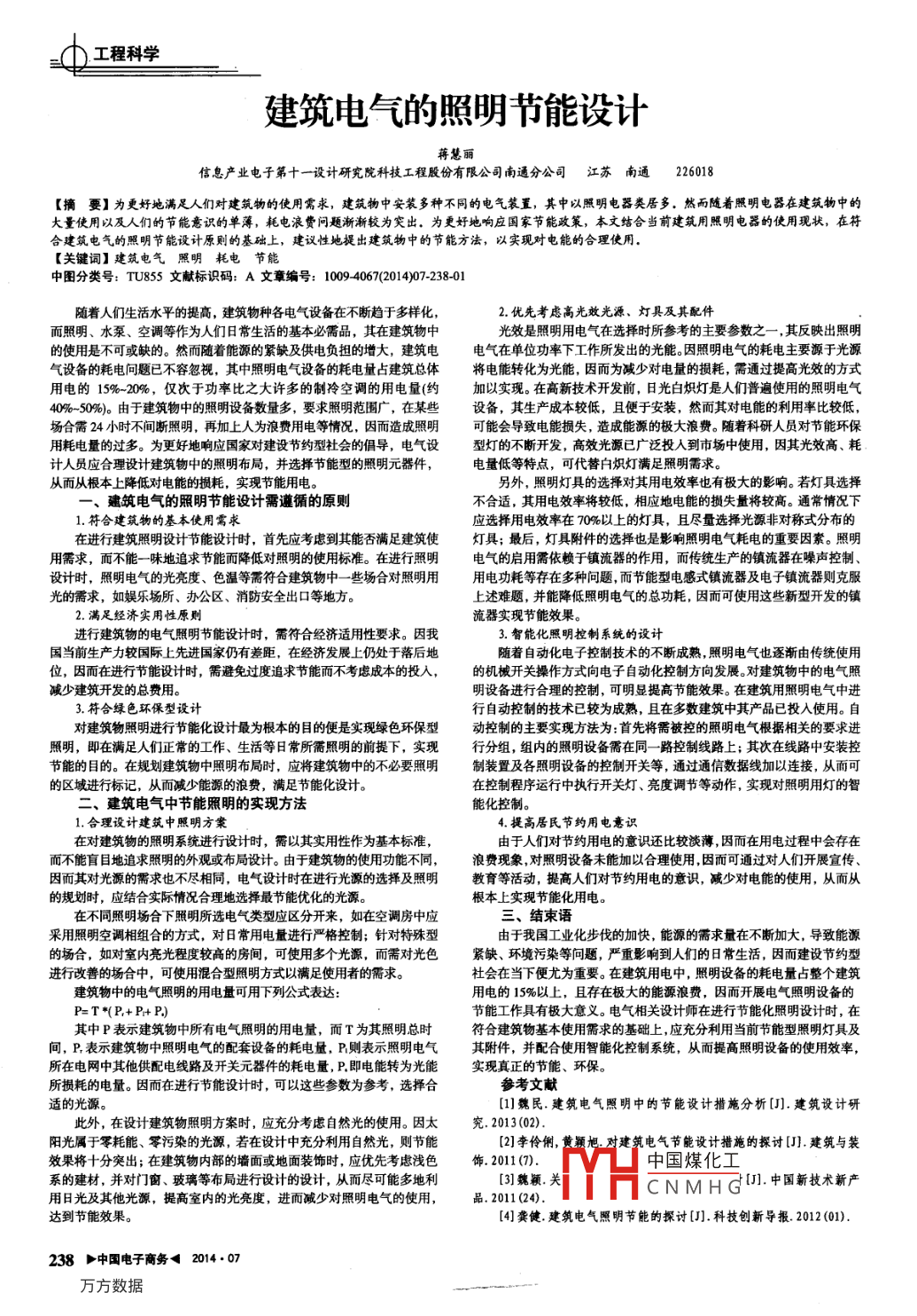 工程科學(xué)建筑電氣的照明節(jié)能設(shè)計(jì)蔣慧麗信息產(chǎn)業(yè)電子第十一設(shè)計(jì)研究院科技工程殷份有限公司南通分公司江蘇南通226018【摘要】為更好地滿足人們對建筑物的使用需求,建筑物中安裝多種不同的電氣笮置,其中以照明電器類居多。然而隨著照明電器在建筑物中的大量使用以及人們的節(jié)能意識的單薄,耗電浪費(fèi)問題漸漸較為突出,為更妤地響應(yīng)國家節(jié)能政策,本文結(jié)合當(dāng)前建筑用照明電器的使用現(xiàn)狀,在符合建筑電氣的照明節(jié)能設(shè)計(jì)原則的基礎(chǔ)上,建議性地提出建筑物中的節(jié)能方法,以實(shí)現(xiàn)對電能的合理使用【關(guān)鍵詞】建筑電氣照明耗電節(jié)能中圖分類號:TU855文獻(xiàn)標(biāo)識碼:A文章編號:10094067(2014)07-23801隨著人們生活水平的提高,建筑物種各電氣設(shè)備在不斷趨于多樣化,2.優(yōu)先考慮高光效光源、燈具及其配件而照明、水泵、空調(diào)等作為人們?nèi)粘I畹幕颈匦杵?其在建筑物中光效是照明用電氣在選擇時所參考的主要參數(shù)之一,其反映出照明的使用是不可或缺的。然而隨著能源的緊缺及供電負(fù)擔(dān)的增大,建筑電電氣在單位功率下工作所發(fā)出的光能。因照明電氣的耗電主要源于光源氣設(shè)備的耗電問題已不容忽視,其中照明電氣設(shè)備的耗電量占建筑總體將電能轉(zhuǎn)化為光能,因而為減少對電量的損耗,需通過提高光效的方式用電的15%-20%,僅次于功率比之大許多的制冷空調(diào)的用電量(約加以實(shí)現(xiàn)。在高新技術(shù)開發(fā)前,日光白熾燈是人們普遍使用的照明電氣40%-50%。由于建筑物中的照明設(shè)備數(shù)量多,要求照明范圍廣,在某些設(shè)備,其生產(chǎn)成本較低,且便于安裝,然而其對電能的利用率比較低,場合需24小時不間斷照明,再加上人為浪費(fèi)用電等情況,因而造成照明可能會導(dǎo)致電能損失,造成能源的極大浪費(fèi)。隨著科研人員對節(jié)能環(huán)保用耗電量的過多。為更好地響應(yīng)國家對建設(shè)節(jié)約型社會的倡導(dǎo),電氣設(shè)型燈的不斷開發(fā),高效光源已廣泛投入到市場中使用,因其光效高、耗計(jì)人員應(yīng)合理設(shè)計(jì)建筑物中的照明布局,并選擇節(jié)能型的照明元器件電量低等特點(diǎn),可代替白熾燈滿足照明需求。從而從根本上降低對電能的損耗,實(shí)現(xiàn)節(jié)能用電另外,照明燈具的選擇對其用電效率也有極大的影響。若燈具選擇建筑電氣的照明節(jié)能設(shè)計(jì)需遵循的原則不合適,其用電效率將較低,相應(yīng)地電能的損失量將較高。通常情況下1.符合建筑物的基本使用需求應(yīng)選擇用電效率在70%以上的燈具,且盡量選擇光源非對稱式分布的在進(jìn)行建筑照明設(shè)計(jì)節(jié)能設(shè)計(jì)時,首先應(yīng)考慮到其能否滿足建筑使燈具;最后,燈具附件的選擇也是影響照明電氣耗電的重要因素。照明用需求,而不能一味地追求節(jié)能而降低對照明的使用標(biāo)準(zhǔn)。在進(jìn)行照明電氣的啟用需依賴于鎮(zhèn)流器的作用,而傳統(tǒng)生產(chǎn)的鎮(zhèn)流器在噪聲控制設(shè)計(jì)時,照明電氣的光亮度、色溫等需符合建筑物中一些場合對照明用用電功耗等存在多種問題,而節(jié)能型電感式鎮(zhèn)流器及電子鎮(zhèn)流器則克服光的需求,如娛樂場所、辦公區(qū)、消防安全出口等地方。上述難題,并能降低照明電氣的總功耗,因而可使用這些新型開發(fā)的鎮(zhèn)滿足經(jīng)濟(jì)實(shí)用性原則流器實(shí)現(xiàn)節(jié)能效果進(jìn)行建筑物的電氣照明節(jié)能設(shè)計(jì)時,需符合經(jīng)濟(jì)適用性要求。因我3.智能化照明控制系統(tǒng)的設(shè)計(jì)國當(dāng)前生產(chǎn)力較國際上先進(jìn)國家仍有差距,在經(jīng)濟(jì)發(fā)展上仍處于落后地隨著自動化電子控制技術(shù)的不斷成熟,照明電氣也逐漸由傳統(tǒng)使用位,因而在進(jìn)行節(jié)能設(shè)計(jì)時,需避免過度追求節(jié)能而不考慮成本的投入,的機(jī)械開關(guān)操作方式向電子自動化控制方向發(fā)展。對建筑物中的電氣照減少建筑開發(fā)的總費(fèi)用。明設(shè)備進(jìn)行合理的控制,可明顯提高節(jié)能效果。在建筑用照明電氣中進(jìn)3.符合綠色環(huán)保型設(shè)計(jì)行自動控制的技術(shù)已較為成熟,且在多數(shù)建筑中其產(chǎn)品已投入使用。自對建筑物照明進(jìn)行節(jié)能化設(shè)計(jì)最為根本的目的便是實(shí)現(xiàn)綠色環(huán)保型動控制的主要實(shí)現(xiàn)方法為:首先將需被控的照明電氣根據(jù)相關(guān)的要求進(jìn)照明,即在滿足人們正常的工作、生活等日常所需照明的前提下,實(shí)現(xiàn)行分組,組內(nèi)的照明設(shè)備需在同一路控制線路上;其次在線路中安裝控節(jié)能的目的。在規(guī)劃建筑物中照明布局時,應(yīng)將建筑物中的不必要照明制裝置及各照明設(shè)備的控制開關(guān)等,通過通信數(shù)據(jù)線加以連接,從而可的區(qū)域進(jìn)行標(biāo)記,從而減少能源的浪費(fèi),滿足節(jié)能化設(shè)計(jì)。在控制程序運(yùn)行中執(zhí)行開關(guān)燈、亮度調(diào)節(jié)等動作,實(shí)現(xiàn)對照明用燈的智建筑電氣中節(jié)能照明的實(shí)現(xiàn)方法