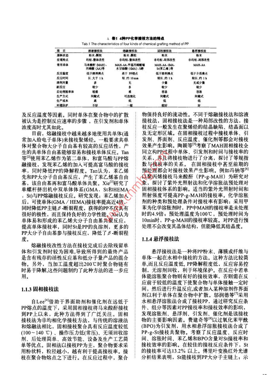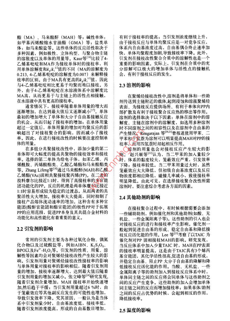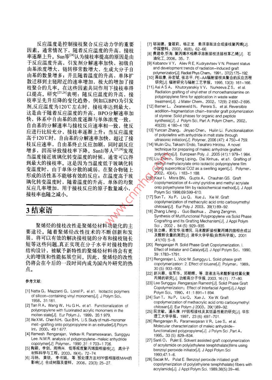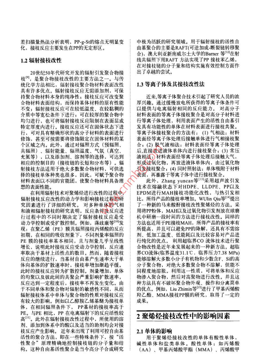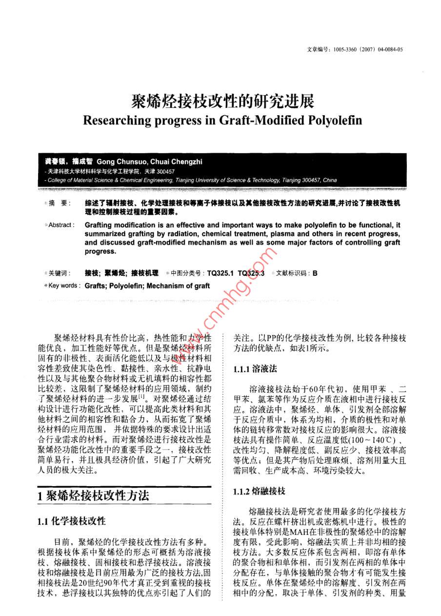 文章編號: 105-3360 (2007) 04-0084-05聚烯烴接枝改性的研究進展Researching progress in Graft -Modified Polyolefin龔春鎖,揣成智Gong Chunsuo, Chuai Chengzhi.天津科技大學(xué)材料科學(xué)與化學(xué)工程學(xué)院,天津300457. Collge of Materia Science & Chemical Engineering. Tianjing University of Science & Technology Tianjing 300457, Chinae摘要:綜述了輻射接枝、化學(xué)處理接枝和等離子體接枝以及其他接枝改性方法的研究進展,并討論了接枝改性機理和控制接枝過程的要因素。* Abstract: Grafting modification is an effective and important ways to make polyolefin to be functional, itsummarized grafting by radiation, chemical treatment, plasma and others in recent progress,and discussed graft-modified mechanism as well as some major factors of controlling graftprogress.生關(guān)鍵詞:接枝;聚烯烴;接枝機理#中圖分類號 : TQ325.1 TQ325.3 o 文獻標識碼: B日Key words: Grafts; Polyolefin; Mechanism of graft聚烯烴材料具有性價比高,熱性能和力學(xué)性關(guān)注。以PP的化學(xué)接枝改性為例,比較各種接枝能優(yōu)良,加工性能好等優(yōu)點。但是聚烯烴材料所方法的優(yōu)缺點,如表1所示。固有的非極性、表面活化能低以及與極性材料相容性差致使其染色性、黏接性、親水性、抗靜電1.1.1溶液法性以及與其他聚合物材料或無機填料的相容性都比較差,這限制了聚烯烴材料的應(yīng)用領(lǐng)域,制約溶液接枝法始于60年代初,使用甲苯、. 二了聚烯烴材料的進一-步發(fā)展"。對聚烯烴通過結(jié)甲苯、氯苯等作為反應(yīng)介質(zhì)在液相中進行接枝反構(gòu)設(shè)計進行功能化改性,可以提高此類材料和其應(yīng)。溶液法中,聚烯烴、單體、引發(fā)劑全部溶解他材料之間的相容性和黏合力,從而拓寬了聚烯于反應(yīng)介質(zhì)中,體系為均相,介質(zhì)的極性和對單烴材料的應(yīng)用范圍,并依據(jù)特殊的要求設(shè)計出適體的鏈轉(zhuǎn)移常數(shù)對接枝反應(yīng)的影響很大。溶液接合行業(yè)需求的材料。而對聚烯烴進行接枝改性是枝法具有操作簡單、反應(yīng)溫度低(100~ 140C)、聚烯烴功能化改性中的重要手段之一- ,接枝改性改性均勻、降解程度低、副反應(yīng)少、接枝效率高簡單易行,并且極具經(jīng)濟價值,引起了廣大研究等優(yōu)點;但是其產(chǎn)物后處理麻煩、溶劑用量大且人員的極大關(guān)注。需回收、生產(chǎn)成本高、環(huán)境污染較大。1聚烯烴接枝改性方法1.1.2 熔融接枝熔融接枝法是研究者使用最多的化學(xué)接枝方1.1化學(xué)接枝改性法。反應(yīng)在螺桿擠出機或密煉機中進行。極性的接枝單體特別是MAH在非極性的聚烯烴中的溶解目前,聚烯烴的化學(xué)接枝改性方法有多種。度有限,受此影響,熔融法實質(zhì)上并非均相的接根據(jù)接枝體系中聚烯烴的形態(tài)可概括為溶液接枝方法。大多數(shù)反應(yīng)體系包含兩相,即溶有單體枝、熔融接枝、固相接枝和懸浮接枝法。溶液接.的聚合物相和單體相,而引發(fā)劑在兩相的單體中枝和熔融接枝是目前應(yīng)用最為廣泛的接枝方法,固分配存在,與單體接觸的聚合物才有可能發(fā)生接相接枝法是20世紀90年代才真正受到重視的接枝枝反應(yīng)。單體在聚烯烴中的溶解度、引發(fā)劑在兩技術(shù),懸浮接枝以其獨特的優(yōu)點亦引起了人們的相中的分配, 取決于單體、引發(fā)劑的種類、用量8(收明男數(shù)據(jù)-12-5 尸表1 4種PP化學(xué)核方法的特點Tab.1 The characteristics of four kinds of chemical grafting method of PP項且濤液換枝法培融接枝法固相技枝祛暴浮揍枝法原料狀態(tài)粉末、顆粒粉末、順杜粉末宏觀特點均相整體改性非均相.整體改性豐均相咼部改性非均相局部改性常用單體馬來酸酐QMAH)MARH.AA.甲基丙烯酸熘MAH.AA丙婚酸(AA)等水甘油酯(QMA).S好S(苯乙著)等反應(yīng)溫度低于洛劑糖點高于PP熔點低于治利拂點低于介質(zhì)德點反應(yīng)時間長.大于1h魍約10mm較長,約1h無咸少量較少較難,容易生產(chǎn)方式間歇式可連域化間歌式高低環(huán)境保護.不好一好及反應(yīng)溫度等因素。同時單體在聚合物中的擴散物保持良好的流動性。不同于熔融接枝法和溶液被認為是控制反應(yīng)速率的步驟,在引發(fā)劑和單體接枝法,固相接枝法是一種局部改性的方法,接濃度高時尤其如此。枝反應(yīng)一般發(fā)生在聚烯烴的結(jié)晶缺陷、結(jié)晶面以目前,熔融接枝中越來越多地使用共單體(通及無定形區(qū)域。在固相接枝過程中接枝單體、引常加入給電子單體)來接枝聚烯烴。- -般要求共單發(fā)劑、界面劑、反應(yīng)溫度、催化劑等都會對接枝體對聚合物大分子自由基有較高的反應(yīng)活性,產(chǎn)效果產(chǎn)生影響。陶穎等[5)考察了MAH固相接枝全生的共單體自由基能夠容易和接枝單體反應(yīng)。Tan同立構(gòu)PP過程中單體、引發(fā)劑和時間與接枝率的等']使用苯乙烯作為第二單體,和富馬酸與PP熔關(guān)系,并且將接枝物進行了分離,探討了等規(guī)指融接枝,發(fā)現(xiàn)苯乙烯的加入可提高富馬酸的接枝數(shù)與接枝率的關(guān)系。在固相接枝中甚至前期的率,同時降低PP的降解程度。Tan認為,苯乙烯預(yù)處理都會對接枝效果產(chǎn)生影響。例如馮鈉等06]先和PP大分子自由基反應(yīng),產(chǎn)生了苯乙烯基自由以聚丙烯接枝馬來酸酐(PP-g-MAH) 為研究對基,該自由基再