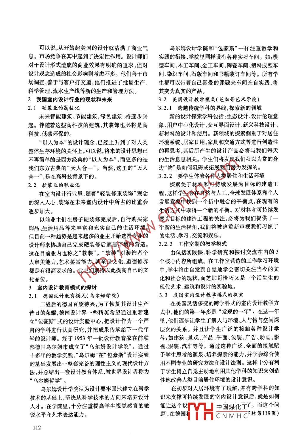 2013年9月山西經(jīng)濟(jì)管理干部學(xué)院學(xué)報(bào)Sept. 2013第21卷第3期JOURNAL OF SHANXI ISTTTUTET OF ECONOMIC MANAGEMENTVol.21 No.3從設(shè)計(jì)到室內(nèi)設(shè)計(jì)教學(xué)口李冬(山西經(jīng)濟(jì)管理干部學(xué)院,山西太原030024)[摘要]在我國目前多數(shù)室內(nèi)設(shè)計(jì)專業(yè)教學(xué)中,第一年為設(shè)計(jì)基礎(chǔ)教育。典型課程有(設(shè)計(jì)素描〉《設(shè)計(jì)色彩><平面構(gòu)成》《立體構(gòu)成)《色彩構(gòu)成》。這其中特別是“三大構(gòu)成”課,一直是“包豪斯”以來幾乎所有設(shè)計(jì)專業(yè)的經(jīng)典課程,但就目前課程開設(shè)的情況看,它并沒有與創(chuàng)造人居生存環(huán)境的室內(nèi)設(shè)計(jì)專業(yè)建立起直接關(guān)聯(lián),更多的只是訓(xùn)練造型和審美。[關(guān)鍵詞]室內(nèi)設(shè)計(jì);體系;教學(xué)[中圖分類號] J525. 1;G712[文獻(xiàn)標(biāo)識碼] A(文章編號] 1008 -9101(2013)03 -0111 -02長期以來,室內(nèi)設(shè)計(jì)師們一直在尋找自身的哲民主主義精神,從改變設(shè)計(jì)觀念開始,改變了設(shè)計(jì)風(fēng)學(xué)觀,但在關(guān)于他們該做什么,如何做這些基本問題格和形式。具體體現(xiàn)在建筑材料、建筑方式等方面上,一直處在一種不確定的假設(shè)當(dāng)中,因而造成室內(nèi)的探索。這其中最具代表性的是“包豪斯”進(jìn)行的設(shè)計(jì)的價(jià)值取向存在著不同的甚至相悖的各種觀念。而探索這個(gè)問題最直接的方法,就是從現(xiàn)代設(shè)“包豪斯”創(chuàng)始人格羅皮烏斯試圖在“包豪斯”計(jì)體系的形成,了解當(dāng)今室內(nèi)設(shè)計(jì)行業(yè)的發(fā)展趨勢,內(nèi)將建筑藝術(shù)與建造技術(shù)這兩個(gè)已被長期分隔的領(lǐng)進(jìn)一步探索室內(nèi)設(shè)計(jì)教育。域重新結(jié)合起來。為了達(dá)到這個(gè)目的,他要“包豪1世界兩大設(shè)計(jì)體 系的形成斯”與工業(yè)生產(chǎn)緊密聯(lián)系,完全按照工業(yè)生產(chǎn)目的當(dāng)今世界有兩大設(shè)計(jì)體系:- -是以觀念為中心、安排課程。以解決問題為目的的理想主義的歐洲設(shè)計(jì)體系;二“包豪斯”廣泛采用工作作坊形式進(jìn)行教學(xué),成是注重風(fēng)格和形式,目標(biāo)集中在設(shè)計(jì)的表達(dá)效果、市立金工作坊、陶藝作坊、木工作坊紡織作坊等。通場效應(yīng).上的商業(yè)主義的美國設(shè)計(jì)體系。過工作作坊這個(gè)特殊的教學(xué)場所,完全改變了以往1.1 理想主義的歐洲設(shè)計(jì)體系那種只繪畫,不動手制作的陳舊教育方式。在實(shí)踐19世紀(jì)到20世紀(jì),歐洲在工業(yè)化、現(xiàn)代化的驅(qū)中學(xué)生提高了動手能力,掌握了生產(chǎn)技術(shù)與職業(yè)技使下,都市化成為必然。大量農(nóng)村人口涌人城市,致能,并且實(shí)踐教學(xué)成果亦以產(chǎn)品的方式直接展現(xiàn)。使20世紀(jì)初歐洲產(chǎn)生了兩個(gè)急待解決的社會問題。當(dāng)時(shí)“包豪斯”各個(gè)作坊里的產(chǎn)品暢銷在德國甚至.第一是如何利用現(xiàn)代城市規(guī)劃理論、現(xiàn)代建筑結(jié)構(gòu)歐洲,如家具.墻紙、燈具等。至今我們依然能看到與形式來解決城市的交通擁擠,居住環(huán)境惡化等問它們流行過的痕跡。題。第二是針對往昔設(shè)計(jì)只是強(qiáng)調(diào)為社會權(quán)貴服1.2 商業(yè)主義的美國設(shè)計(jì)體系務(wù),如何把設(shè)計(jì)的重心從為權(quán)貴服務(wù)轉(zhuǎn)移到為社會第二次世界大戰(zhàn)前后和期間,大量歐洲設(shè)計(jì)家廣大群眾服務(wù)這個(gè)新的重心去。(多為“包豪斯”成員)流亡到美國,成功地把歐洲的為解決這兩問題,20世紀(jì)初在德國、俄國、荷蘭現(xiàn)代主義設(shè)計(jì)哲學(xué)與美國廣闊的市場需求結(jié)合,在和其他幾個(gè)西歐國家的建筑師們開始探索代表新時(shí)戰(zhàn)后掀起了國際主義風(fēng)格高潮,直至用商業(yè)流行的代的建筑形式和城市規(guī)劃方法。他們在設(shè)計(jì)中引人模式風(fēng)靡全球。收稿日期:2013 -05 -21中國煤化工作者簡介:李冬(1977-).男,山西長治人碩士 ,現(xiàn)工作于山西經(jīng)濟(jì)管理干部學(xué).MYHCNMHG111可以說,從開始起美國的設(shè)計(jì)就沾滿了商業(yè)氣烏爾姆設(shè)計(jì)學(xué)院和“包豪斯”-樣注重教學(xué)和息。市場競爭在其中起到了決定性作用。設(shè)計(jì)師們實(shí)踐的銜接,學(xué)院里同樣設(shè)有各種實(shí)習(xí)車間。如:模對于設(shè)計(jì)形式造成的商業(yè)效果有明確的追求,但對型車間、木工車間金工車間、陶瓷車間、塑料成型車設(shè)計(jì)觀念造成的社會影響則考慮不多。他們善于市間、染織車間、石版車間和書籍裝訂車間等。所有學(xué)場調(diào)查,善于與客戶打交道,他們推進(jìn)了批量生產(chǎn)、生都可以帶著自己喜愛的課題來車間親自實(shí)踐,將科學(xué)管理、流水生產(chǎn)線等新的生產(chǎn)和管理方法。其變?yōu)檎鎸?shí)的產(chǎn)品。2我國室 內(nèi)設(shè)計(jì)行業(yè)的現(xiàn)狀和未來3.2 美國設(shè)計(jì)教學(xué)模式(芝加哥藝術(shù)學(xué)院)2.1硬裝業(yè)的高技化3.2.1跨越傳統(tǒng)學(xué)科的界線 ,探索新的領(lǐng)域未來智能建筑、節(jié)能建筑,綠