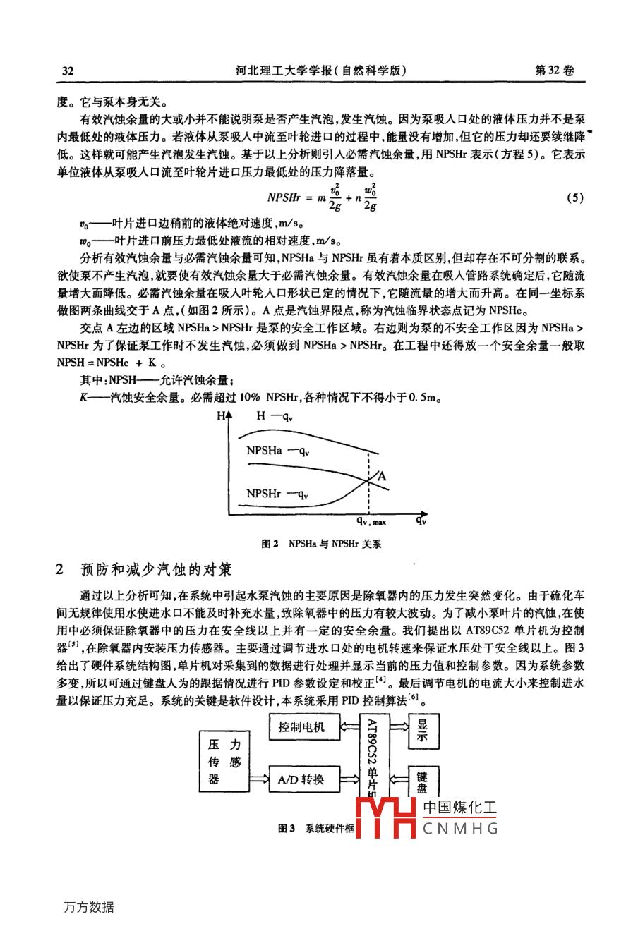 第32卷第2期河北理工大學(xué)學(xué)報(bào)(自然科學(xué)版)VoL. 32 No. 22010年5月Journal of Hebei Polytechnic University( Natural Science Edition)May. 2010文章編號(hào):1674-0262(2010)02-0030-05風(fēng)神輪胎高溫循環(huán)水泵腐蝕現(xiàn)象李泉溪' ,銀兵”,許根山(1.河南理工大學(xué)計(jì)算機(jī)科學(xué)與技術(shù)學(xué)院,河南焦作45403;2.河南理工大學(xué)電氣工程與自動(dòng)化學(xué)院,河南焦作4003;3.3風(fēng)神輪胎股份有限公司,河南焦作454003 )關(guān)鍵詞:水泵;汽蝕;高溫循環(huán)水;對(duì)策摘要:硫化是輪胎生產(chǎn) 工藝中極其重要的一個(gè)環(huán)節(jié),高壓過(guò)熱水的供給對(duì)其硫化至關(guān)重要。高溫循環(huán)水泵的穩(wěn)定運(yùn)行則是最基本的保障,但在實(shí)際生產(chǎn)過(guò)程中水泵卻極易發(fā)生腐蝕造成系統(tǒng)不穩(wěn)定。對(duì)風(fēng)神輪胎股份有限公司的現(xiàn)場(chǎng)高溫水泵葉片腐蝕情況和水質(zhì)進(jìn)行了研究,通過(guò)伯努利方程等對(duì)高溫循環(huán)水泵汽蝕現(xiàn)象進(jìn)行了定型分析,提出采用PID算法控制除氧器水壓來(lái)減小或避免葉片腐蝕的發(fā)生。中圖分類號(hào):TH 117.1文獻(xiàn)標(biāo)志碼:A0引言河南風(fēng)神輪胎集團(tuán)是全國(guó)有名的輪胎生產(chǎn)企業(yè),隨著經(jīng)濟(jì)高速發(fā)展企業(yè)的規(guī)模不斷壯大,以前-些系統(tǒng)的小缺陷隨著規(guī)模的壯大也突顯出來(lái),成了生產(chǎn)工藝的主要矛盾。在硫化系統(tǒng)中高溫循環(huán)水泵的汽蝕就是一個(gè)重要的表現(xiàn)。在輪胎的硫化過(guò)程中高壓過(guò)熱水的穩(wěn)定供給極重要,在其完整的閉路環(huán)循環(huán)系統(tǒng)中,熱水循環(huán)泵如同人體的心臟不可出現(xiàn)故障。但是,實(shí)際的情況難免意外,汽蝕不僅造成水泵的損傷,尤其能導(dǎo)致循環(huán)系統(tǒng)產(chǎn)生大的壓力波動(dòng),甚至頓時(shí)失壓對(duì)其硫化期間的輪胎造成致命的傷害。所以對(duì)汽蝕的研究則刻不容緩。通過(guò)對(duì)現(xiàn)場(chǎng)的調(diào)查,高溫循環(huán)水呈現(xiàn)出弱酸性且水泵葉片的使用壽命大大縮短。在使用不到一一個(gè)月的時(shí)間就不得不更換新葉輪。這無(wú)形中給企業(yè)利潤(rùn)造成重大的損失。本文接合實(shí)際情況對(duì)汽蝕做了理論的研究并對(duì)企業(yè)提出- -些避免汽蝕的方法1泵汽蝕現(xiàn)象分析1.1水泵汽蝕定性分析水泵在運(yùn)轉(zhuǎn)時(shí),水沿著吸水管進(jìn)人吸人室水流入葉輪。水在流動(dòng)的過(guò)程中由于速度的增加和勢(shì)能的提高及克服阻力,水流的壓力越來(lái)越低。當(dāng)水流流到水泵的某-位置時(shí),水流的壓力已經(jīng)下降至水的飽和壓力時(shí)則水流開(kāi)始汽化,溶解于水中的汽體同時(shí)逸出,形成蒸汽或汽體泡。充滿著蒸汽和汽體泡的空泡很快脹大并在壓力較高點(diǎn)迅速凝縮、潰滅??张轁鐣r(shí),水以高速填補(bǔ)空泡的位置。水流彼此發(fā)生撞擊形成局部水擊,壓力可達(dá)數(shù)千萬(wàn)帕。同時(shí),逸出的汽體中的氧汽,藉助空泡凝縮時(shí)放出的熱量,對(duì)材料產(chǎn)生化學(xué)腐蝕。若這種現(xiàn)象發(fā)生在泵的過(guò)流部件.上則將造成過(guò)流部件的損壞,同時(shí)造成泵出水壓力波動(dòng),嚴(yán)重時(shí)失壓(2)。.水泵腐蝕主要是由于汽蝕所造成。通過(guò)對(duì)現(xiàn)場(chǎng)分析,水泵發(fā)生汽蝕的原因有如下幾種情況:(1)供人除氧器的蒸汽壓突然降低。(2)供入除氧器的蒸汽溫度突然降低。中國(guó)煤化工(3)大量地向除氧器中補(bǔ)充低溫的涼水。MHCNMHG收稿日期2009-10-09第2期李泉溪,等:風(fēng)神輪胎高溫循環(huán)水泵腐蝕現(xiàn)象31(4)硫化車間用水量突然加大。(5)泵出水口以外直至循環(huán)回除氧器管網(wǎng)中管路阻力突然大幅度減小。(6)整個(gè)循環(huán)水中存在雜質(zhì)或微小固體顆粒。若在使用過(guò)程中出現(xiàn)以上某些情況都將使高溫循環(huán)水泵發(fā)生汽蝕。1.2高 溫循環(huán)水泵汽蝕現(xiàn)象定性分析泵的吸上真空高度是泵是否發(fā)生汽蝕的一一個(gè)重要因素。在高溫循環(huán)水系統(tǒng)中合理確定除氧器的高度是必要的。圖1為風(fēng)神輪胎廠高溫循環(huán)水除氧加熱示意圖。補(bǔ)水蒸汽硫化/2車間H除氧器丁)熱水泵圖1高溫循環(huán)水除氧加熱系統(tǒng)在圖1中,取水泵人口為“1-1”,除氧器內(nèi)液面為“2- -2”。設(shè)除氧器的高度為Hg。列液面及泵人口“1--1”截面的伯努利方程"p-pg+z-H,+h.(1)式中: .P除氧器液面壓力,Pa;泵吸人口壓力,Pa;泵吸人口處液體的平均流速,m/s;-*1-1"面到“2--- -2”面的高度,m;h.- -液體從除 氧器中吸人液面到泵人口處的管網(wǎng)阻力損失,m。通過(guò)以上方程可計(jì)算得到除氧器的安裝高度,在實(shí)際應(yīng)用中為了保證離心泵運(yùn)轉(zhuǎn)的可靠性,除氧器的幾何安裝高度應(yīng)該以離心泵運(yùn)行時(shí)可能出現(xiàn)的最大工況流量進(jìn)行計(jì)算,-般規(guī)定留0.3 m的安全量。即有方程2計(jì)算得到。這樣才能大大的降低泵運(yùn)轉(zhuǎn)時(shí)產(chǎn)生汽泡的可能性。-Hg=H,-(號(hào)+h.) .(2)但只知除氧器的安裝高度是遠(yuǎn)遠(yuǎn)不夠的,要研究泵的汽蝕問(wèn)題,還應(yīng)該分析泵的自身的情