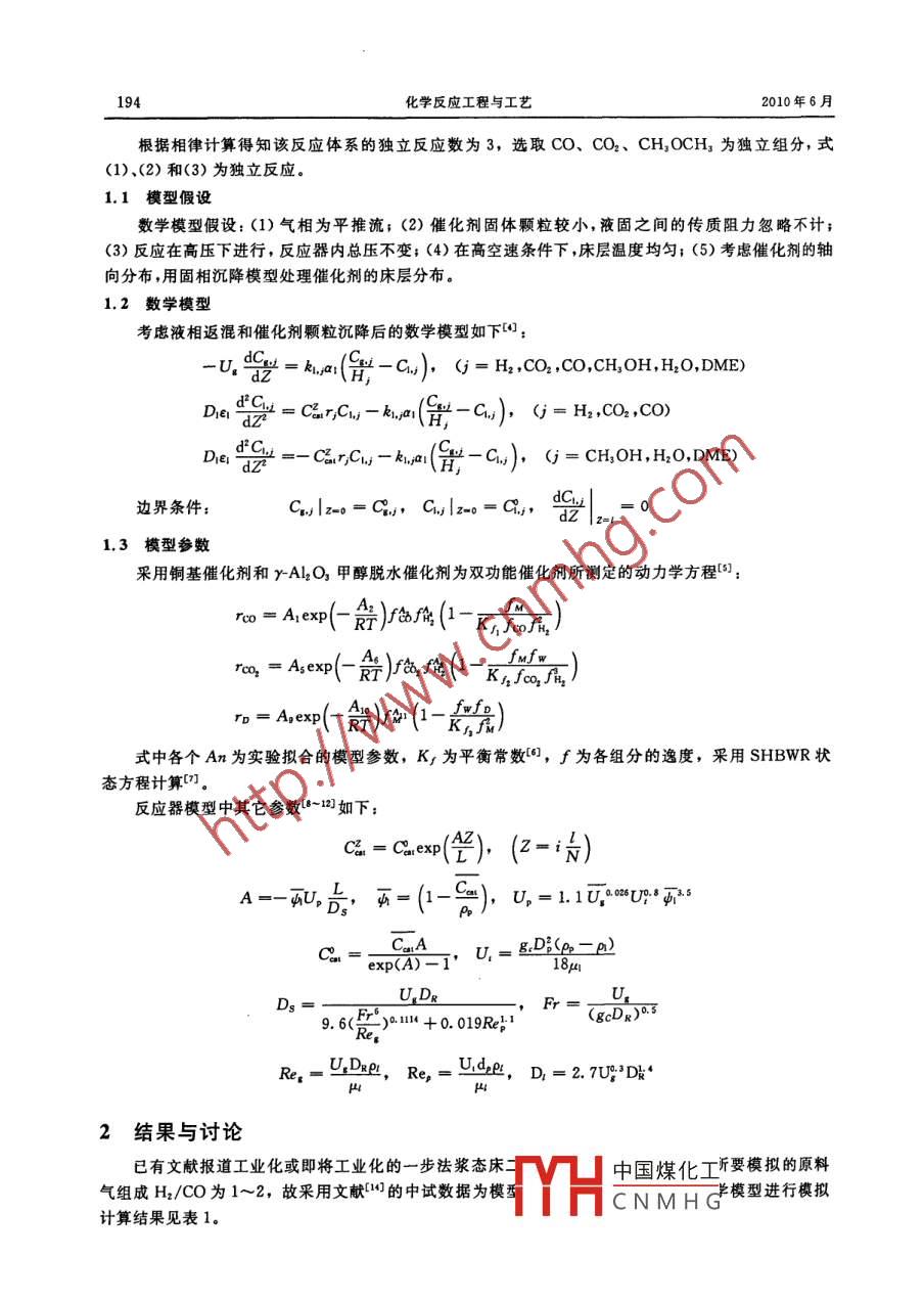 第26卷第3期化學(xué)反應(yīng)工程與工藝Vol 26. No 32010年6月Chemical Reaction Engineering and TechJune 2010文拿編號(hào):1001-7631(2010)03-0193-0漿態(tài)床合成氣制二甲醚反應(yīng)器數(shù)學(xué)模擬胡智力1劉殿華房鼎業(yè)1潘強(qiáng)2顏蜀雋2羅春桃(1.華東理工大學(xué)大型工業(yè)反應(yīng)器工程教育部工程研充中心,化學(xué)工程聯(lián)合國(guó)家重點(diǎn)實(shí)驗(yàn)室,上海2002372.神華寧煤集團(tuán)煤化工公司研發(fā)中心,寧夏銀川750411)搞要:建立了包括液相返混和催化劑顆教沉降的合成氣一步法制二甲醚漿態(tài)床反應(yīng)器的數(shù)學(xué)模型,模擬計(jì)算了空速、原料氣組成、反應(yīng)溫度、反應(yīng)壓力等反應(yīng)條件對(duì)反應(yīng)的影響,計(jì)算結(jié)果表明,CO轉(zhuǎn)化率和二甲醚的選擇性隨溫度增加、壓力增大而提高,在一定溫度、壓力條件下,CO轉(zhuǎn)化率隨空速增大而減小,合成氣含有一定量的CO2有利于CO轉(zhuǎn)化率增加關(guān)鵪詞:漿態(tài)床;食成氣;二甲:學(xué)橫型中圖分樊號(hào);TQ018文獻(xiàn)標(biāo)識(shí)碼:A合成氣二步法制二甲醚(DME)要經(jīng)過(guò)合成氣制甲醇和甲醇脫水兩個(gè)步驟,流程較長(zhǎng),設(shè)備投資大,產(chǎn)品成本較高,目前國(guó)內(nèi)外都在大力開展由合成氣一步法制二甲醚的研究。合成氣一步法制二甲醚是放熱反應(yīng),在固定床反應(yīng)器中進(jìn)行時(shí)反應(yīng)熱不易移出,存在溫度控制難等缺點(diǎn),若使用貧氫合成氣,則反應(yīng)溫度高,催化劑易結(jié)炭,因此固定床中氣相一步法反應(yīng)只能在轉(zhuǎn)化率較低情況下操作,大量的未反應(yīng)合成氣必須循環(huán),并使用富氫合成氣。漿態(tài)床中合成氣一步法制二甲醚是在三相體系中進(jìn)行的,CO、H2和DME等為氣相,惰性溶劑為液相,懸浮于溶劑中的催化劑為固相。氣相CO和H2穿過(guò)液相油層到達(dá)懸浮的固體催化劑表面進(jìn)行反應(yīng),由于液相的熱容大,液相一步法很易實(shí)現(xiàn)恒溫操作,而且催化劑顆粒表面為溶劑所包圍,結(jié)炭現(xiàn)象大為緩解,因而液相法可使用貧氫合成氣,適合我國(guó)以煤為原料制合成氣的現(xiàn)狀。鑒于三相漿態(tài)床在合成二甲醚中的熱力學(xué)、工藝條件及反應(yīng)器等方面的優(yōu)勢(shì),國(guó)內(nèi)外已將二甲醚的工業(yè)化研究集中于三相漿態(tài)床合成反應(yīng)器上,漿態(tài)床合成氣制二甲醚是未來(lái)工業(yè)化二甲醚生產(chǎn)的技術(shù)發(fā)展趨勢(shì)口-3。本工作建立了年產(chǎn)10萬(wàn)噸二甲醚漿態(tài)床反應(yīng)器模型,在合成氣H2和CO體積比為1~2,反應(yīng)壓力4~6MPa,溫度230~300℃條件下,模擬研究了反應(yīng)條件對(duì)反應(yīng)的影響,以期為工業(yè)反應(yīng)器的設(shè)計(jì)提供依據(jù)。漿態(tài)床反應(yīng)器數(shù)學(xué)模型合成氣一步法制二甲醚是一個(gè)復(fù)雜的反應(yīng)體系,主要反應(yīng)有:CO+2H,=CH3 OHCO2+3H2=CH,OH+H2O2CH,OH=CH, OCH,+H2O3C0+3H2=CH3 OCH,+CO22c0+4H,=CH, OCH,+H,OCO+H2 O=CO,+H2中國(guó)煤化工(6)收稿日期:2010-04-21;修訂日期:2010-05-23CNMHG作著簡(jiǎn)介:胡智力(1986),男,碩士研究生;劉殿華(1970-),男,副教授,通訊聯(lián)系人,Emal;delia@ecust.eud.cn薔金項(xiàng)目:國(guó)家科技支撐計(jì)劃資助(2007BAAo8B04)194化學(xué)反應(yīng)工程與工藝2010年6月根據(jù)相律計(jì)算得知該反應(yīng)體系的獨(dú)立反應(yīng)數(shù)為3,選取CO、CO2、 CH, OCH3為獨(dú)立組分,式(1)、(2)和(3)為獨(dú)立反應(yīng)1.1模型假設(shè)數(shù)學(xué)模型假設(shè):(1)氣相為平推流;(2)催化劑固體顆粒較小,液固之間的傳質(zhì)阻力忽略不計(jì);(3)反應(yīng)在高壓下進(jìn)行,反應(yīng)器內(nèi)總壓不變;(4)在高空速條件下,床層溫度均勻;(5)考慮催化劑的軸向分布,用固相沉降模型處理催化劑的床層分布。1.2數(shù)學(xué)模型考慮液相返混和催化劑顆粒沉降后的數(shù)學(xué)模型如下:klai(Ht-Cl. ), (j= H2, CO2, CO, CH,OH, H, O, DMED,rGi= H2, CO2, CO)-c-(,-c),0-c0,H0DNB邊界條件Cx=c,clxn-c,。z|2-013模型參數(shù)采用銅基催化劑和yAl2O甲醇脫水催化劑為雙功能催化劑所測(cè)定的動(dòng)力學(xué)方程:對(duì)()(-K/元)4舞)角(-xrrp Ag expR)(-m式中各個(gè)An為實(shí)驗(yàn)擬合的模型參數(shù),K為平衡常數(shù),f為各組分的逸度,采用 SHBWR狀態(tài)方程計(jì)算(。反應(yīng)器模型中其它參數(shù)-12如下:(4),(2-1)A-cb,頁(yè)=(-),=1,U了,U=Dp=P)U. Dg9.6()01+0.019R}1Re- U,DRpt, Re.=U.dee, D, =2. 7U'D2結(jié)果與討論已有文獻(xiàn)報(bào)道工業(yè)化或即將工業(yè)化的一步法漿態(tài)床中國(guó)煤化工斤要模擬的原料氣組成H2CO為1~2,故采用文獻(xiàn)的中試數(shù)據(jù)為模型CNMHG模型進(jìn)行模擬計(jì)算結(jié)果見表1。第26卷第3期胡智力等.漿態(tài)床合成氣制二甲醚反應(yīng)器數(shù)學(xué)模擬表1反應(yīng)器模擬計(jì)算數(shù)據(jù)與文獻(xiàn)值的比較Table. 1 The comparison of computational results with pllot plant dataH:/COT/CXoo,Err.%Computational results607.1表1結(jié)果表明,反應(yīng)器模擬計(jì)算數(shù)據(jù)與文獻(xiàn)中試數(shù)據(jù)比較的相對(duì)誤差為7.1%,表明建立模型與參數(shù)選擇合理,能較好地模擬反應(yīng)器實(shí)際狀況。2.1空速的影響在反應(yīng)壓力5MPa,反應(yīng)溫度250℃C條件下,模擬計(jì