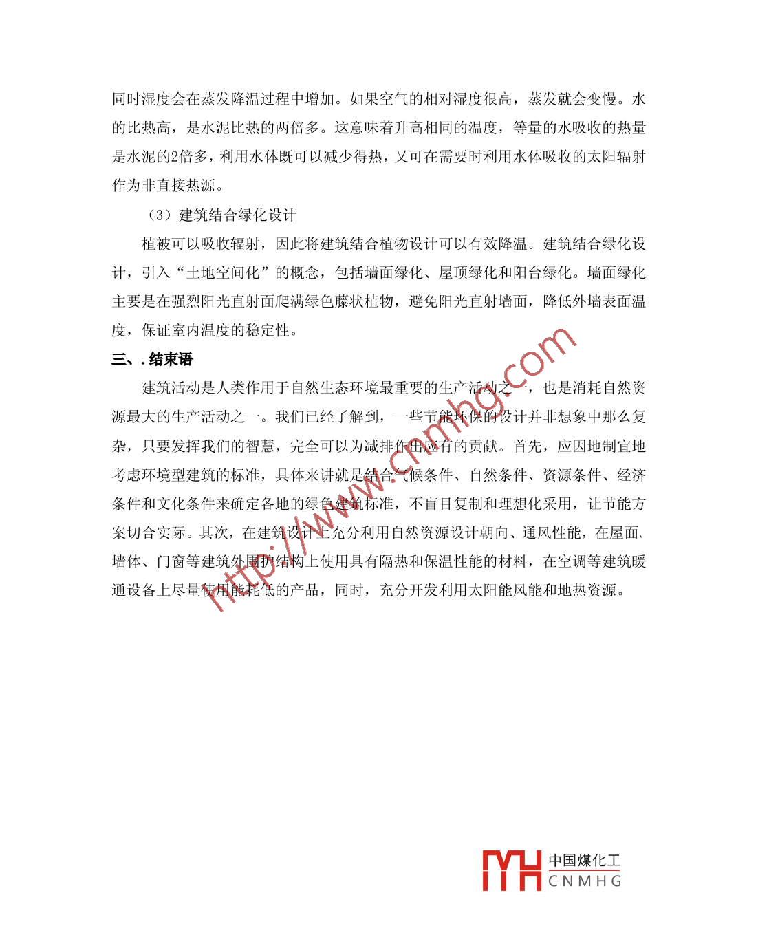 試論建筑設(shè)計(jì)中低碳設(shè)計(jì)田苗’周香俊21.機(jī)械工業(yè)第六設(shè)計(jì)研究院有限公司河南鄭州 4500002.河南智博建筑設(shè)計(jì)有限公司河南洛陽(yáng) 471000摘要:從傳統(tǒng)設(shè)計(jì)走向低碳之路的革新需要各領(lǐng)域的通力合作。我們不能只關(guān)注直觀的設(shè)計(jì)而忽略了那些設(shè)計(jì)背后的意義。本論文對(duì)低碳建筑中低碳設(shè)計(jì)與應(yīng)用進(jìn)行了分析研究,對(duì)今后在低碳設(shè)計(jì)應(yīng)用方面的研究具有一定的借鑒意義。關(guān)鍵詞:建筑設(shè)計(jì);低碳建筑;低碳應(yīng)用中圖分類號(hào): TU2文獻(xiàn)標(biāo)識(shí)碼: A文 章編號(hào):一、建筑低碳研究及應(yīng)用現(xiàn)狀目前對(duì)于節(jié)能建筑研究較多的是建筑外窗、玻璃幕墻的應(yīng)用,而對(duì)外墻、屋頂以及樓地板的研究較為欠缺。另外,夏熱冬冷地區(qū)的研究較寒冷地區(qū)、嚴(yán)寒地區(qū)的研究多,主要是因?yàn)橄臒岫涞貐^(qū)采暖和空調(diào)能耗均較高,節(jié)能設(shè)計(jì)需同時(shí)考慮圍護(hù)結(jié)構(gòu)的保溫和隔熱性能,而這兩者是相互矛盾的,所以,要想達(dá)到既保溫又隔熱的目的,有很多困難需要解決。當(dāng)前對(duì)于建筑物排放CO2的研究普遍認(rèn)為:建筑物的日常耗能占建筑生命周期CO*排放量的絕大部分,比例約為60%--80%,其次重要的部分即建材的生產(chǎn)與運(yùn)輸階段的CO排放量。由此可得出建筑節(jié)能減排首先要從降低日常能耗開(kāi)始,這也是最能立竿見(jiàn)影的一環(huán),其次就是建材的生產(chǎn)和運(yùn)輸,也是建筑節(jié)能減排中相當(dāng)重要的一部分。位于不列顛群島最北端的安斯特島因一對(duì)退休夫婦邁克爾●雷和多羅西●雷建造的“零碳屋”,成為全球環(huán)保人士的矚目之地。該房屋設(shè)有吸收太陽(yáng)能、儲(chǔ)存太陽(yáng)能的裝置,有一-根不銹鋼管與地下風(fēng)力渦輪機(jī)和地能收集系統(tǒng)相連,這些裝置可以通過(guò)收集空氣和地面的能量,給房屋提供電能、熱能。即使冰天雪地,有地板下的廢氣轉(zhuǎn)化的暖氣系統(tǒng)供熱,屋內(nèi)也是溫暖如春。在英國(guó),邁克爾的環(huán)保屋已成為政府典范,愛(ài)丁堡當(dāng)局也據(jù)此制訂了環(huán)保守則。而據(jù)英國(guó)《衛(wèi)報(bào)》報(bào)道,中國(guó)廣州市也有官員對(duì)雷氏夫婦的“零碳屋”感興趣,正研究采用中國(guó)煤化工容納YHCNM HG5000戶的新型環(huán)保城。由此可見(jiàn),這座環(huán)保屋在世界范圍內(nèi)的影響。中國(guó)境內(nèi)首個(gè)零碳公共建筑就是去年在上海世博會(huì).上落成的“零碳館”,據(jù)該館的主設(shè)計(jì)師介紹,該建筑使用的建材是混合型水泥,此類水泥含有大約50%的建筑廢料,諸如煤灰、煤矸石、礦渣等。這些廢料制成的混合水泥保溫性好,能減少熱滲透,吸收室內(nèi)多余熱量,使建筑主體冬暖夏涼。除了利用傳統(tǒng)的太陽(yáng)能、風(fēng)能實(shí)現(xiàn)能源自給自足外,“ 零碳館”還能取用黃浦江水,利用水源熱泵作為房屋的天然空調(diào);用餐后留下的剩飯剩菜被降解為生物質(zhì)能,用于發(fā)電。二、低碳建筑低碳設(shè)計(jì)應(yīng)用探討1.大力發(fā)展環(huán)境型建筑低碳應(yīng)用(1)關(guān)注普通建筑目前,在中國(guó)發(fā)展節(jié)能建筑、綠色建筑,或者是低碳生態(tài)建筑,重要的并不在于做幾個(gè)示范性的建筑,而是要切合實(shí)際地解決當(dāng)前建筑的問(wèn)題,例如冬天保溫、夏季防熱、自然通風(fēng)的,就是低碳生態(tài)的;建筑隔聲、垃圾堆砌、降低采暖費(fèi)用、太陽(yáng)能與建筑結(jié)合的,就是低碳生態(tài)的。所以,技術(shù)策略要抓主要矛盾。不能技術(shù)堆砌,片面追求節(jié)能。8億農(nóng)民居住的農(nóng)村住宅也應(yīng)該進(jìn)入減碳發(fā)展的視野。(2)優(yōu)化建筑設(shè)計(jì)建筑造型及圍護(hù)結(jié)構(gòu)形式對(duì)建筑物性能有決定性影響。直接的影響包括建筑物與外環(huán)境的換熱量、自然通風(fēng)狀況和自然采光水平等。而這三方面涉及的內(nèi)容將構(gòu)成70%以上的建筑采暖通風(fēng)空調(diào)能耗。不同的建筑設(shè)計(jì)形式會(huì)造成能耗的巨大差別。然而,建筑物是個(gè)復(fù)雜系統(tǒng),各方面因素相互影響,很難簡(jiǎn)單地確定建筑設(shè)計(jì)的優(yōu)劣。例如,加大外窗面積可改善自然采光,在冬季還可獲得太陽(yáng)能量,但冬季的夜間會(huì)增大熱量消耗,同時(shí)在夏季會(huì)由于太陽(yáng)輻射通過(guò)窗戶進(jìn)入室內(nèi)使空調(diào)能耗增加。這就需要利用動(dòng)態(tài)熱模擬技術(shù)對(duì)不同的方案進(jìn)行詳細(xì)地模擬測(cè)試和比較。(3)開(kāi)發(fā)節(jié)能建筑圍護(hù)構(gòu)件開(kāi)發(fā)新的建筑圍護(hù)結(jié)構(gòu)部件,以更好地滿足保溫、隔熱、透光、通風(fēng)等各種需求,甚至可根據(jù)外界條件的變化隨時(shí)改變其物理性能,達(dá)到維持室內(nèi)良好的物理環(huán)境、同時(shí)降低能源消耗的目的。這是實(shí)現(xiàn)建筑節(jié)能的基礎(chǔ)鹽術(shù)和辛F十西涉及的中國(guó)煤化工產(chǎn)品有:外墻保溫和隔熱、屋頂保溫和隔熱、熱物理性能YHCNMHG嗇、智能外遮陽(yáng)裝置