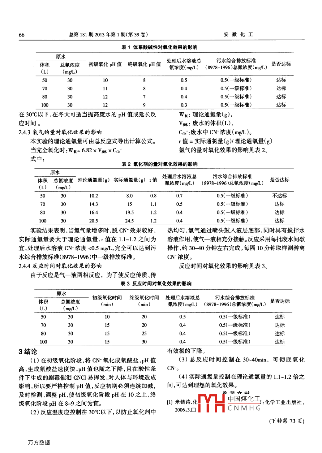 第39卷,第1期安徽化工Vol.39,No.1552013年2月ANHUI CHEMICAL INDUSTRYFeb.2013●環(huán)保與循環(huán)經(jīng)濟.煤氣化過程中含氰廢水的處理,劉暉(安慶市環(huán)保局,安徽安慶246002)摘要:采用二步氯化氧化法對煤氣化過程中產(chǎn)生的含氰廢水進行處理,控制反應(yīng)溫度在30以下,反應(yīng)時間30-~40min,通氯量是理論通氯量1.1-1.2倍,分步驟控制溶液pH值,可以使煤氣化廢水中總氰濃度小于0.5mg/L,達標排放。關(guān)鍵詞:煤氣化;合成氣;氰化物;氯氣;廢水doi: 103969/.ssn.1008 -53X.2013.01.019中圖分類號:X703文獻標識碼:A文章編號: 1008 -553X<(2013)01-0065- -031前言CNCI在堿性條件下水解為CNO。我國的資源特點是缺油、少氣、富煤,因此以煤為主Cl2 + H20 =HCl + HCIO的原料結(jié)構(gòu)(占到產(chǎn)量的75% )是我國氮肥工業(yè)發(fā)展的CN-+ClO-+H20=CNCl+20H-特點和優(yōu)勢。CNCl+20H= CNO- +Cl+H2O煤氣化是指煤在氣化爐內(nèi),將固體煤轉(zhuǎn)化為含有第二階段:終級氧化C0.H2.CH4等可燃氣體和CO2、N2等非可燃氣體的過程",2CNO*+H20+3Cl0 =N2 +2CO2 +3CI*+20H-是工業(yè)燃氣、民用煤氣和燃料油合成原料氣的主要生產(chǎn)總反應(yīng)方程式為:方法。在煤氣化過程中,常用的氣化劑是空氣或富氧空2CN~+80H- +5C]=10 CI- +4H20 +N2 +2CO2氣,氣化生成的混合氣稱為“煤氣”。在煤氣化過程中可2.3實驗方法產(chǎn)生副反應(yīng): 2C+H2+N2-→2HCN ,生成的含氰化物“煤氣”將原水(煤氣化洗滌水,原水總氰濃度30mg/L)加經(jīng)水洗滌除去,產(chǎn)生了含有氰化物的洗滌廢水。氰化物人到一級破氰反應(yīng)池中,調(diào)節(jié)溫度與pH值,通人氯氣,是劇毒物質(zhì),目前國內(nèi)煤氣化生產(chǎn)裝置的廢水很難做到通過氯化反應(yīng)使上述有毒物質(zhì)得以消減,達到規(guī)定反應(yīng)零排放,特別是當處于酸性pH值范圍內(nèi)時,它變成劇時間,將- -級 破氰反應(yīng)池中的水溶液泵人二級反應(yīng)池毒的氫氰酸。含氰廢水必需先經(jīng)預(yù)處理除氰,以防止氰中,調(diào)整pH值,繼續(xù)通人氯氣反應(yīng),控制反應(yīng)時間和絡(luò)合物影響廢水的進-一步處理 。pH值,檢測總氰濃度。含氰廢水通常的處理方法有堿性氯化法、電解法、2.4結(jié)果與討論離子交換法、活性炭法。堿性氯化法以其運行成本低、處2.4.1體系酸堿性對氧化效果的影響理效果穩(wěn)定等優(yōu)點廣泛應(yīng)用于工程中。上述初級氧化反應(yīng)在任何pH條件下均能迅速完2實驗部分成,在酸性條件下生成極易揮發(fā)的劇毒物CNCI而造成2.1實驗藥品危害,在堿性條件下只要有足夠的氧化劑,則CNCI會氯氣:工業(yè)品,含量≥99.6% ,安徽氯堿化工集團。很快水解轉(zhuǎn)化成微毒的CNO ,pH越高轉(zhuǎn)化越快。體系煤氣化洗滌水:原水,總氰濃度30mg/L,安慶石化酸堿性對氧化效果的影響見表1。公司。在第一階段反應(yīng)(初級氧化),水溶液pH通??刂?.2實驗原理在11~12之間,當進行到第二階段反應(yīng)(終級氧化)時,針對煤氣化廢水水質(zhì)采用二步氧化破氰法,即向含CNO-進一步降解,水溶液pH通??刂圃?~9之間。氰廢水中投加氯系氧化劑(氯氣),首先將氰化物部分氧2.4.2溫度對氧化效果的影響化成毒性較低的氰酸鹽;其次將氰酸鹽完全氧化成二氧由于CN--→CNO 這一氧化過程進行得十分迅速,化碳和氮,去除廢水中的氰化物。放熱使溫度升高。次氯酸鈉的熱穩(wěn)定差,40以上時發(fā)第一段:初級氧化,CN-與CI0-反應(yīng)生成CNCI,生如下反應(yīng):中國煤化立常氯氧反應(yīng)控制MHCNMH G收稿日期:2012-11-23作者簡介:劉暉(1972-),男.1992年畢業(yè)于安徽化工學(xué)校,工程師,從事環(huán)境保護和環(huán)境監(jiān)察工作, 13013188033 ,blh72@163.com..6總第181期2013年第1期(第39卷)安徽化工表1體系酸堿性對氧化效果的影響原水處理后水溶液總污水綜合排放標準體積總氰濃度初級氧化pH值終級氧化 pH值是否達標氰濃度(mg/L) (8978-1996)總氰濃度( mg/L)(L)50301080.50.5(- -級標準)達標010.0.5(一級標準)120.400在30公以下,在冬天可適當提高廢水的pH值或延長反Wm:理論通氯量(g),應(yīng)時間。V脈:廢水的體積(L),2.4.3氯氣的量對氧化效果的影響Cav:廢水中CN-濃度(mg/L)。本實驗的理論通氯量可由總反應(yīng)式導(dǎo)出計算公式。r值=實際通氯量(g)/理論通氯量(g)當完全氧化時:W∞= 6.82 x V麒xCav氯氣的量對氧化效果的影響見表2。式中:表2氧化劑的對氧化效果的影響體積總氰濃度理論通氯量(g)實際通氯量(g) r值氰濃度(mg/L) (8978-1996)總氰濃度(mg/L)(mg/L)5(310.28.00.7不達標714.315.10.5(-級標準)8(16.419.51.220.524.5實驗結(jié)果表明,當氯氣量增多時,脫CN-效果較好,熱均勻,氯氣通過噴頭鼓人液層底部,同時具有攪拌水實際通氯量要大于理論通氯量,r值在1.1-1.2 之間為溶液作用,使氣-液相充分接觸。 反應(yīng)采用每批廢水間歇宜,處理后水溶液CN-濃度<0.5 mg/L,完全可以達到污操作,約30~40分鐘左右完成。每隔10分鐘取樣測游離水綜合排放標準(8978- 1996)中一級排放標準。CN-濃度。2.4.4反應(yīng)時間對氧化效果的影響反應(yīng)時間對氧化效果的影響見表3。由于反應(yīng)是氣一液兩相反應(yīng),為了使反應(yīng)傳質(zhì)、傳表3反應(yīng)時間對氧化效果的影響初級氧化時間終級 氧化時間處理 后水溶液總( min)(min)520達標.253結(jié)論有效氯的下降。(1)在初級氧化階段,將CN-氧化成氰酸鹽,pH值(3)總反應(yīng)時間控制在30~40min,可徹底氧化高,生
