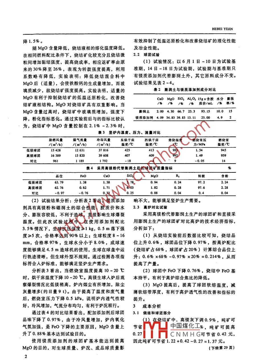 總第162期河北冶金Total 1622007 年第6期HEBEI METALLURGY2007 .ber6.燒結球團配加鎂質添加劑的試驗盂延軍',黃偉青',關昕', 趙永利2(1.河北工業(yè)職業(yè)技術學院,河北石家莊 050091; 2.唐山松汀鋼鐵有限公司煉鐵廠, 河北唐山064415)摘要:饒結球團配加鎂質黍加劑后,提高了球團礦中的MgO含量,酸性球團礦的軟化性能得到改善,使高爐內軟熔帶變窄,爐內壓差降低,有利于高爐順行,噸鐵綜合成本降低14. 42元。關鍵詞:燒結;球團;鐨舔加劑中圍分類號: TF046.4文獻標識碼: A文章編號: 1006-5008 (2007) 06 -0001 -02TEST TO ADD MAGNESIUM ADDITIONREAGENT IN SINTERED PELLETMeng Yanjun' , Huang Weiqing' , Guan Xin' , Zhao Yongli'(1. Hebei Instute of Vocational and Technique, Shjazhuang, Hebei, 050091; 2. lronworks, TangshanSongting lron and Sicel Co. , Ltd. , Tangshan, Hebei, 064415)Abstract: With magnesium - aition - reagent added in sintered pellet the conteat of MgO is increased, thesoftening performance of acid pellet improved, and consequently in blast furnace the soft melting region be-comes narrow, the pressure drop in furnace reduced. It is beneficial to the smooth operation of blast fumace,the cost per ton of iron reduced by 14. 42 yuan.Key Words: sintering; pellet; magnesium - addition - reagent1前言料搭配種類不變,不影響其它指標穩(wěn)定的情況下,隨著高爐人爐礦石品位的不斷提高,爐渣中將燒結礦中MgO含量由2.59%下調0.3%(即達.Al2O3的相對含量增加,使得渣的流動性變差,脫到2.2% -2.3%)的試驗。硫能力下降。為適應高ALO,冶煉條件,通常在燒(2)試驗結果與分析: 6月15日9: 00高鎂灰結配料中添加白云石等物質,提高渣中的MgO含配比由3.1%降至2.5%, 16日9: 00高鈣灰配比降量改善爐渣的流動性和脫硫能力。但MgO對燒結至2.25%;穩(wěn)定后,燒結礦MgO含量已降至2.2%工藝以及燒結礦強度、高溫軟化熔融性能等都有一~2.3%。試驗前后各項生產指標對比見表1。定的影響,而MgO同時又能改善球團礦軟熔與滴褰1試驗前后各項生產指標對比落性能、球團礦高溫還原度、球團礦低溫還原粉化TFe FcO 8-16mm 焦比/利用系數率和膨脹率,本文討論將燒結礦的MgO向球團礦1% /% 粒級/% (kg/t) /(Um'●d)試驗前轉加,使燒結礦和球團礦的質量獲得雙贏,從而改(6月10日)57.2 10.3 314.1.62善鎂質球團和低鎂燒結礦搭配爐料結構的熔滴性試驗后能,達到提高高爐經濟技術指標的目的。為此,唐(6月16日)57.810.4 30.33 4.1.61山松汀鋼鐵有限公司在第一煉鐵廠 豎爐車間、燒結由表1可以看出,燒結礦質量有所提高。由于車間、二煉車間在2007年6月進行了工業(yè)試驗。高鎂灰配比降低,對混合料制粒產生一定影響,使2試驗 內容及結果制粒I中國煤化工加,料層透氣性2.1 燒綃試驗降低MHCNMHG抽風門開度有所(1)試驗情況:根據生產需要,燒結車間在物工川干∞lwu心阡土刀觀,使燒結礦產量下收稿日期: 2007 -10-191HEBEI YEJIN降1.5%。有效抑制了低溫還原粉化和改善燒結礦的理化性能隨MgO含量降低,燒結液相的熔化溫度降低。及冶金性能。在相同燃料配比條件下,燒結礦化較充分且燒結微2.2 球團試驗粒間增加黏結強度,提高燒成率,相應返礦率由原(1)試驗情況:以6月1日-10日為試驗基來的30%降至26%,表現為轉鼓強度提高,利用.準期,14日-18日為試驗期,試驗期與基準期只系數略有降低,實驗表明:降低燒結混合料中.有鎂質添加劑代替膨潤土外,其它原料成分不變。MgO后(適量),會使鐵酸鈣的生成量增加,而玻試驗結果見表2-4。璃質減少,故燒結礦強度提高。實驗表明,適量的表2膨潤土與鎂質添加劑成分對比MgO有利于抑制燒結礦的低溫還原粉化,改善燒CaO MgO SiO2 Al2Os 15g$含膠水分膨脹結礦液相結構。MgO對燒結礦具有雙重影響。當/%/%1%/%質價/mL/%事/%MgO含量過高時,燒結礦中玻璃質增加,強度下影潤土2.00 4.30 66.7 23.393.1510.0 15降,粉化指標惡化。通過實驗前后與的指標比較認.鎂質添加劑 4.09 34.839.8313.11 25.0 4.9 2為,燒結礦中MgO含量控制在2.1% ~2.3% 時,表3豎爐內溫度、壓力、流量對比助燃風量煤氣流量冷卻風量東烘干床西烘干床焙燒溫度.燃燒室壓燃燒室/(m'/h)/m'/h)/(m'/b)溫度/溫度/心力/MPn低鎖球團15 42812 63137816425983945高鎂球團16 38913 82039 60807409991.49.959對比9611189.1 792-1849-0.0514表4采用高鎂粉代替膨潤土后的球團礦質量指標%品位FcOCaOSiO2MgORy轉鼓含粉低鎂球團63. 791.38s. 780.940.2497.22.24高鏌球團62. 760.626.031.820.2897.62.28-0.97-0.760.330. 250.880.040.4(2)試驗結果分析:分析表2看出,鎂質添加響不大,能夠滿足豎爐生產需要。劑具有高鎂粉和硼潤土的綜合性能、膠質價和水2.3離爐對比試驗分膨脹容較低,不利于造球,直接影響生球燦裂采用高鎂粉代替膨潤土生產的球團礦和直接采溫度。但此次試驗過程中,在使用添加劑配比用膨潤土生產的球團礦對比高爐的技術經濟指標,3.5%情況下,生球抗壓強度≥1kg, 0.5m落下強分析如下:度≥5次,合格率達到90%以上;生球粒度8~16(1)從燒結實驗前后數據比較可知,燒結品mm,合格率97%,生球水分小于8. 0%,成球速位上升0.6%,球團品位下降0.97%,按高爐配比度能夠滿足4.5 m造球機的使用,生球在球盤中運(燒結礦占68%,球團礦占20%)計算綜合品位上行軌跡清晰,但生球外型不規(guī)則。通過檢測各項指升: 0.6% x68% -0.97% x20% =0.214%, 從而標符合人爐標準,能夠滿足豎爐生產需求。.提高了產量。分析表3看出,當燃燒室溫度提高10~20 C(2)球團中FeO下降0.76%,燒結中FeO基時,烘干床溫度下降10~20 C。高鎂生球人爐后觀本持平,有利于高爐綜合焦比的降低。察