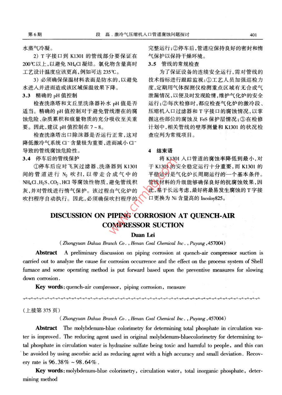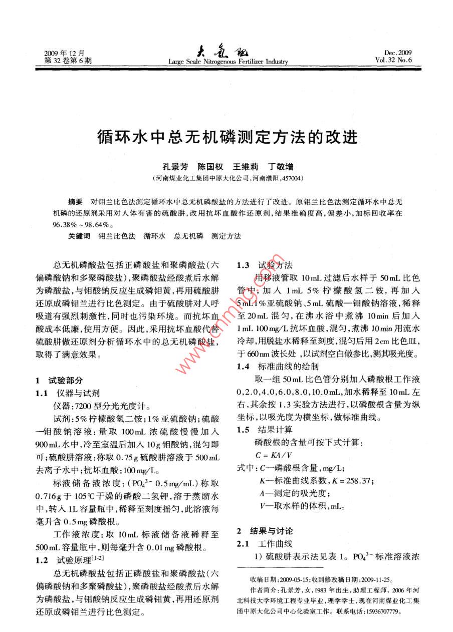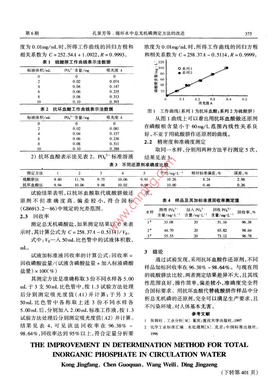 2009年12月.大氛能Dec.2009第32卷第6期Large Scale Nitrogenous Fertilizer IndustryVol.32 No.6循環(huán)水中總無機磷測定方法的改進孔景芳陳國權王維莉丁敬增(河南煤業(yè)化工集團中原大化公司,河南濮陽,457004)摘要對鉬蘭比色法測定循環(huán)水中總無機磷酸鹽的方法進行了改進。原鋁蘭比色法測定循環(huán)水中總無機磷的還原劑采用對人體有害的硫酸肼.改用抗壞血酸作還原劑,結果準確度高,偏差小,加標回收率在96.38% ~ 98.64%。關鍵詞鉬蘭比色法 循環(huán)水總無機磷測定方法總無機磷酸鹽包括正磷酸鹽和聚磷酸鹽(六1.3試驗方法偏磷酸鈉和多聚磷酸鹽) ,聚磷酸鹽經(jīng)酸煮后水解用移液管取10ml過濾后水樣于50mL比色為磷酸鹽,與鉬酸鈉反應生成磷鉬黃,再用硫酸肼管中,加入1mL 5%檸檬酸氫二銨,再加入還原成磷鉬蘭進行比色測定。由于硫酸肼對人呼5mL1%亞硫酸鈉、5mL硫酸--鉬酸鈉溶液,稀釋吸道有強烈刺激性,同時也污染環(huán)境。而抗壞血;至20mL混勻,在沸水浴中煮沸10min 后加入酸成本低廉,使用方便。因此,采用抗壞血酸代替1ml.100mg/L抗壞血酸,混勻,煮沸10min用流水硫酸肼做還原劑分析循環(huán)水中的總無機磷酸鹽,冷卻,用脫鹽水稀釋至刻度,混勻后用2cm比色皿,取得了滿意效果。于660nm波長處,以試劑空白做參比,測其吸光度。1.4標準曲線的繪制1試驗部分取一組50mL比色管分別加入磷酸根工作液1.1儀器與試劑0,2.0,4.0,6.0,8.0, 10.0mL,加水稀釋至10mL左儀器:7200型分光光度計。右,其余按1.3實驗方法進行,以磷酸根含量為縱試劑:5%檸檬酸氫二銨;1%亞硫酸鈉;硫酸坐標,以吸光度為橫坐標,做標準曲線。-鉬酸鈉溶液:量取100mL.濃硫酸慢慢加入1.5結果計算900mL水中,冷至室溫后加入10g鉬酸鈉,混勻即磷酸根的含量可按下式計算:可;硫酸肼溶液:稱取0.75g硫酸肼溶液于500mLC= KA/V去離子水中;抗壞血酸: 100mg/L。式中:C-磷酸根含量,mg/L;標液儲備液濃度:(P03-0.5mg/mL)稱取K一標準曲線系數(shù), K = 258.37;0.716g于105C干燥的磷酸二氫鉀,溶于蒸餾水A一測定的吸光度;中,轉人1L容量瓶中,稀釋至刻度搖勻,此溶液每V一取水樣的體積,mL。毫升含0.5 mg磷酸根。工作液濃度:取10mL 標液儲備液稀釋至2結果與討論500mL容量瓶中,則每毫升含0.01mg磷酸根。2.1工作曲線1.2試驗原理[12]1)硫酸肼表示法見表1。P0.3- 標準溶液濃收稿日期:2009-05-15;收到修改稿日期2009-11-25.偏磷酸鈉和多聚磷酸鹽),聚磷酸鹽經(jīng)酸煮后水解作者簡介:孔最芳.女1983年出生,助理工程師,2006 年河為磷酸鹽,與鋁酸鈉反應生成磷鉬黃,再用還原劑北科技大學環(huán)境工程專業(yè)畢業(yè),理學學士,現(xiàn)在河南煤業(yè)化工集還原成磷鉬蘭進行比色測定。團中原大化公司中心化驗室工作。聯(lián)系電話: 1953707779第6期孔景芳等.循環(huán)水中總無機磷測定方法的改進375度為0.01mg/mL時,所得工作曲線的回歸方程和濃度為0.01mg/mL時,所得工作曲線的回歸方程相關系數(shù)為C=252.54A + 1.0922, R=0.9993。和相關系數(shù)為C= 258.37A -0.5114, R=0.9999。表1硫酸肼工作曲線表示法數(shù)據(jù)標液體積/ml.P023-含量/mg吸光度A00 t口系列]。80060 t0.020.0740.04 .0.1470.060.2350.080.3130.100.3930.消光值A0.3.4表2抗壞血酸工作 曲線表示法數(shù)據(jù)圖1工作曲線(系列1為抗壞血酸;系列2為硫酸肼)PO2-含量/mg從圖1曲線上可以看出用抗壞血酸做還原劑在磷酸根含量小于60mg/L范圍內線性關系良0.0810.040.157好,不亞于用硫酸肼作還原劑的曲線。0.2360.3112.2精密度和準確度測定0.388取同一水樣,分別用兩種方法平行測定5次,2)抗壞血酸表示法見表2。P03- 標準溶液結果見表3。表3不同還原劑準確度比較測定方法45平均/mg.L-1相對標準偏差.%誤差,%硫酸肼法9.8011.769.7510.069.9110.268.242.96抗壞血酸法9.949.9810.020.460.26試驗結果表明,以抗壞血酸取代硫酸肼做還求。原劑不但準確度高、偏差較小,符合國標表4樣品及其加標準液回收率測定值(GB6913.2- -86)中 規(guī)定的允差范圍。水樣測得PO3-加入 PO3-回收 PO2'-回收率,%2.3回收率含量/mg*L-'含量/mg:L-! 含量/mg*L-'133.082051.1696.38測定總無機磷酸鹽,如果測定結果以C來表示時,其計算公式為C= 258.37A -0.5114)/Vg。2144.7063.8298.64_55.5573.12. 96.78式中: Vo一入50mL比色管中的試液體積數(shù),mL。試液加標準液回收率的計算公式:回收率=3結論通過試驗發(fā)現(xiàn),采用抗壞血酸作還原劑,不同回收磷酸鹽量/(試液含磷酸鹽量+加入標液磷酸樣品加標回收率在96.38% ~ 98.64%。與現(xiàn)在用鹽量)x 100(%)其測定方法是準確稱取3份不同水樣各5.00的硫酸肼法比較,兩者測定結果差異不大,且其線mL于3支50mL比色管中,按1.3試驗方法處理性范圍良好,操作簡單,偏差較小,準確度完全符后分別測定吸光度值(A1)并計算;于另3支合國標要求。用抗壞血酸代替硫酸肼作樣品中分50mL比色管中各稱取上述3份不同水樣各析總無機磷的還原劑,完全可以滿足生產要求,且5.00mL后,分別加入2.00mL標準工作液,按1.3不污染環(huán)境,對人體基本無害。參考文獻試驗方法處理后分別測定吸光度值(A2)并計算。1張錦柱.工業(yè)分析[ M].重慶:重慶大學出版社, 1997結果見表4,可見該法回收率在96.38% ~2化學工業(yè)標準匯編.水處理劑[s].北京:中國標準出版社,98.64% ,回收率達到95%以上,符合定量分析要1996THE IMPROVEMENT IN DETERMINATION METHOD FOR TOTALINORGANIC PHOSPHATE IN CIRCULATION WATERKong Jingfang, Chen Guoquan, Wang Weili, Ding Jingzeng(下轉第401頁)第6期段磊.激