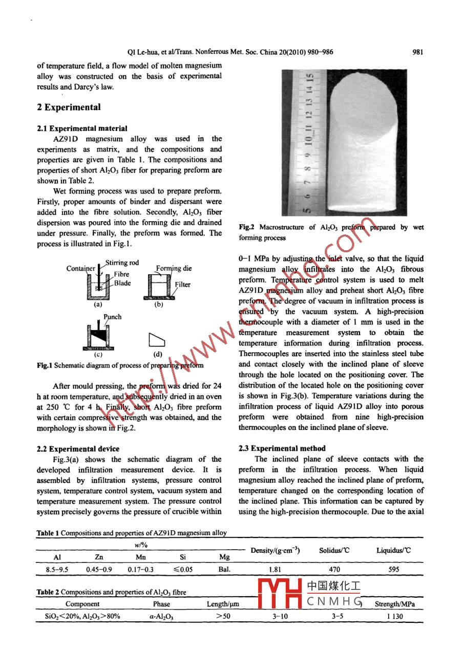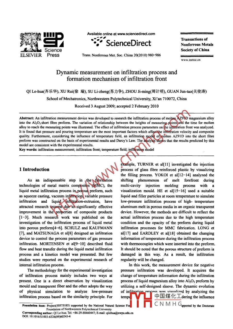 Available online at www.sciencedirect.comTransactions of罵ScienceDirectNonferrous MetalsSociety of ChinaEL SEVIER PressTrans. Nonferrous Met. Soc. China 20(2010) 980-986www.nmsc.cnDynamic measurement on infiltration process andformation mechanism of infiltration frontQI Le-hua(齊樂(lè)華),XU Rui(徐瑞), sU Li-zheng(蘇力爭(zhēng)), ZHOU ji-ming(周計(jì)明), GUAN Jun-tao(關(guān)俊濤)School of Mechatronics, Northwestern Polytechnical University, Xi'an 710072, ChinaReceived 3 August 2009; accepted 2 February 2010Abstract: An infiltration measurement device was developed to research the infiltration process of molten AZ9ID magnesium alloyinto the Al2O3 short fbre preform. The variation of relationship between the heights of measuring points and the time for moltenalloy to reach the measuring points was ilustrated. The effect of infilration process parameters on the infiltration front was analyzed.It is found that pressure and pouring temperature are the most important factors which affect the infiltration velocity and compositequality. Furthermore, considering the infuence of temperature field, an infiltration model of molten AZ91D into the short fibrepreform was constructed on the basis of experimental results and Darcy's Law. The analysis shows that the results predicted by thismodel are consistent with the experimental results.Key words: infiltration measurement; infiltration front; temperature field; infltration modelexample, TURNER et al[1] investigated the injection1 Introductionprocess of glass fibre reinforced plastic by visualizingthe flling process.YOKOI et al[12-14] analyzed theAs an indispensable step in the fabricationshifing phenomenon of melt forefront duringtechnologies of metal matrix composites (MMC), themulti-cavity injection molding processliquid metal infilration process in porous preform, suchvisualization mould. HE et al[15-16] used a suitableas squeeze casting, vacuum infiltration, variable pressureliquid and filler particles at room temperature to simulateinfiltration and liquid infiltration- extrusion, havelow-pressure infiltration process of high- temperatureattracted research interest due to significantly effectivealuminum melt in porous media in an organic transparentimprovement in the properties of composite productsdevice. However, the methods are difficult to reflect the[1-3]. Much research work was published on theactual infitration process due to the high temperatureinvestigation of the infiltration process of liquid metalcondition and the opacity of the preform during liquidinto porous preform[4- 6]. SCHULZ and KAUFMANNinfiltration processes for MMC fabrication. LONG et[7], and MATSUNAGA et al[8] designed an infiltrational[17] and EARDLEY et a[18] obtained the changingdevice to control the process parameters of gas pressureinformation of temperature during the infiltration processinfilration. MORTENSEN et a[9 - -10] described fluicwith thermocouples which were inserted into the preform.flow and heat transfer during the liquid metal infiltrationIt should be noted that the porous structure of preform isprocess and a kinetics model was presented. But fewdamaged in this way. As a result, the infiltrationstudies were reported on the experimental research ofregularity will be changed.intermnal infilration process.In this work, the measurement device for negativeThe methodology for the experimental investigationpressure infilration was developed. It acquires theof infiltration process mainly includes two ways atchange of temperature information during the infiltrationpresent. One is a direct observation by visualizationprocess of liquid magnesium alloy into Al2O3 preform bymould and transparent fiber and the other adopts the wayutilizing a self- designed sleeve. The dynamic evolutionof physical simulation to analyze low-pressureof infiltration nrcece was vinalized by analyzing theinfiltration process based on the similarity principle. Fortemp中國(guó)煤化工dering the influenceFoundntion item: Project(50575185) supported by the National Natual Science FoTYHCNMHGoporedbytheDoteFoundation of Northwestern Polytechnical UniversityCorresponding author: QI Le-hua; Tel: +86. 29-88460447; E-mail: qilehua@nwpu.cdu.cnDOI: 10.1016/S1003-6326(09)60245-4QI Le-hua, et al/Trans. Nonferrous Met. Soc. China 20(2010) 980-986981of temperature field, a flow model of molten magnesiumalloy was constructed on the basis of experimentalnresults and Darcy's law.2 Experimental2.1 Experimental materialAZ9ID magnesium alloy was used in thexperiments as matrix, and the compositions andproperties are given in Table 1. The compositions andproperties of short Al2O3 fiber for preparing preform areshown in Table 2.Wet forming process was used to prepare preform.Firstly, proper amounts of binder and dispersant wereadded into the fibre solution. Secondly, Al2O3 fberdispersion was poured into the forming die and drainedFig.2 Macrotructure of Al2O3 preform prepared by wetunder pressure. Finally, the preform was formed. Theforming processprocess is ilustrated in Fig.1.0- -1 MPa by adjusting the inlet valve, so that the liquidContainerStirring rodForming diemagnesium alloy infiltrates into the Al2O3 fbrous, Fibre。Bladeiterpreform. Temperature control system is used to meltAZ91D magnesium alloy and preheat short Al2O3 fbrepreform. The degree of vacuum in infiltration process is(aensured by the vacuum system. A high-precisionPunchthermocouple with a diameter of 1 mm is used in thetemperature measurement system to obtain thetemperature information during infiltration process.口(c(d)Thermocouples are inserted into the stainless steel tubeFig.1 Schematic diagram of process of preparing preformand contact closely with the inclined plane of sleevethrough the hole located on the positioning cover. TheAfter mould pressing, the preform was dried for 24distribution of the located hole on the positioning coverh at room temperature, and subsequently dried in an ovenis sbown in Fig.3(b). Temp