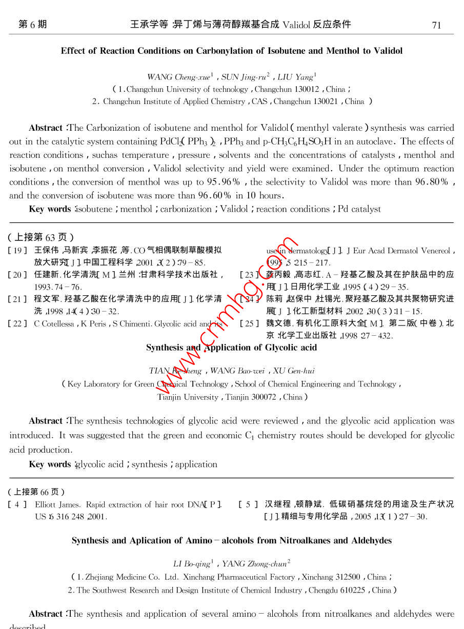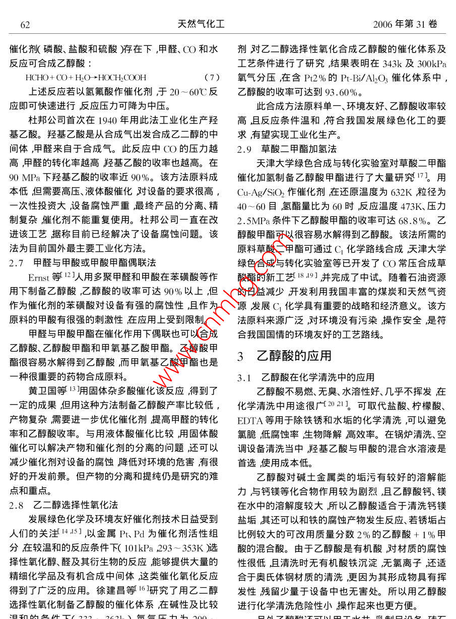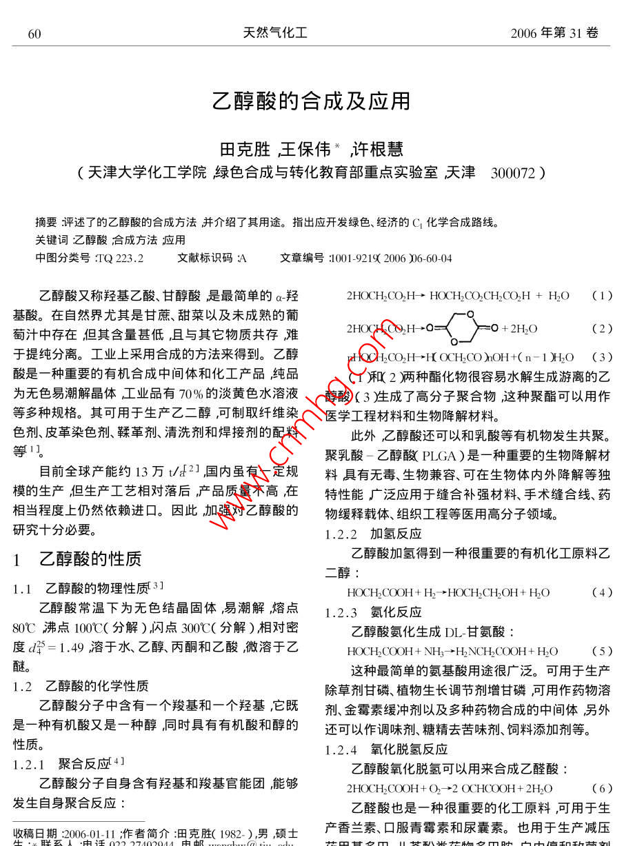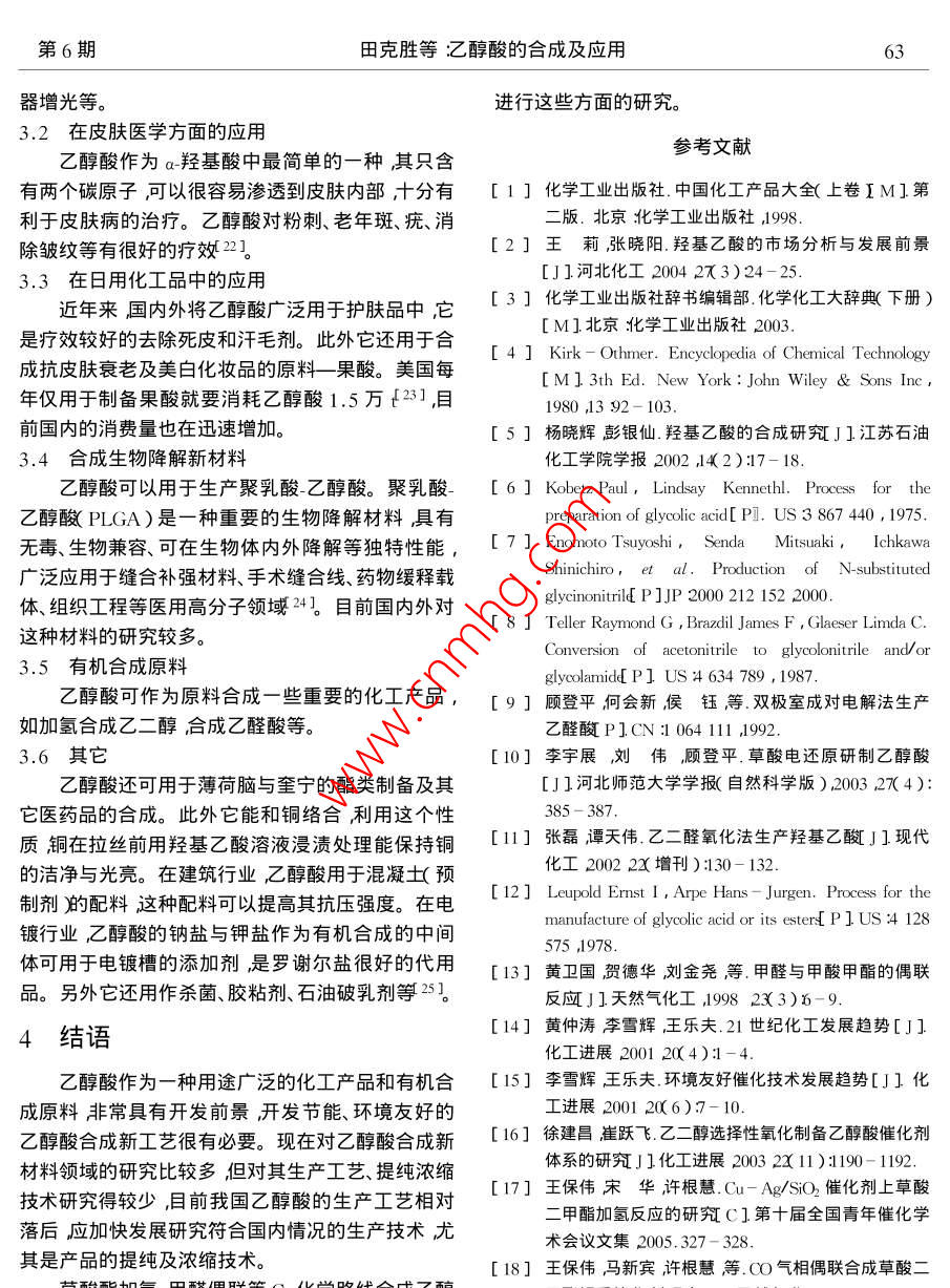 60天然氣化工2006年第31卷乙醇酸的合成及應(yīng)用田克勝王保偉許根慧(天津大學(xué)化工學(xué)院綠色合成與轉(zhuǎn)化教育部重點(diǎn)實(shí)驗(yàn)室天津300072摘要評述了的乙醇酸的合成方法并介紹了其用途指出應(yīng)開發(fā)綠色、經(jīng)濟(jì)的C1化學(xué)合成路線。關(guān)鍵詞乙醇酸合成方法應(yīng)用中圖分類號TQ223.2文獻(xiàn)標(biāo)識碼A文章編號1001-92120066-60-04乙醇酸又稱羥基乙酸、甘醇酸是最簡單的a-羥 2HOCH2CO2HHOCH2CO2CH2CO2H+H2O (1)基酸。在自然界尤其是甘蔗、甜菜以及未成熟的葡萄汁中存在但其含量甚低,且與其它物質(zhì)共存難 2HOCH2CO2HO=+2H2O(2)于提純分離。工業(yè)上采用合成的方法來得到。乙醇 nHOCH2COH→HOCH2COOH+(n-1)H2O(3)酸是一種重要的有機(jī)合成中間體和化工產(chǎn)品純品(1)和(2)兩種酯化物很容易水解生成游離的乙為無色易潮解晶體工業(yè)品有70%的淡黃色水溶液醇酸(3)成了高分子聚合物這種聚酯可以用作等多種規(guī)格。其可用于生產(chǎn)乙二醇可制取纖維染醫(yī)學(xué)工程材料和生物降解材料。色劑、皮革染色劑、鞣革劑、清洗劑和焊接劑的配料此外,乙醇酸還可以和乳酸等有機(jī)物發(fā)生共聚。等聚乳酸-乙醇酸(PLGA)是一種重要的生物降解材目前全球產(chǎn)能約13萬t/2國內(nèi)雖有一定規(guī)料具有無毒生物兼容、可在生物體內(nèi)外降解等獨(dú)模的生產(chǎn)但生產(chǎn)工藝相對落后產(chǎn)品質(zhì)量不高在特性能廣泛應(yīng)用于縫合補(bǔ)強(qiáng)材料、手術(shù)縫合線、藥相當(dāng)程度上仍然依賴進(jìn)口。因此加強(qiáng)對乙醇酸的物緩釋載體組織工程等醫(yī)用高分子領(lǐng)域研究十分必要。1.2.2加氫反應(yīng)1乙醇酸的性質(zhì)乙醇酸加氫得到一種很重要的有機(jī)化工原料乙二醇:1.1乙醇酸的物理性質(zhì)3(4)乙醇酸常溫下為無色結(jié)晶固體易潮解熔點(diǎn)1.2.3氨化反應(yīng)80℃沸點(diǎn)100℃(分解)閃點(diǎn)300℃(分解)相對密乙醇酸氨化生成DL-甘氨酸:度d2=1.49溶于水、乙醇、丙酮和乙酸微溶于乙醚。這種最簡單的氨基酸用途很廣泛??捎糜谏a(chǎn)1.2乙醇酸的化學(xué)性質(zhì)除草劑甘磷、植物生長調(diào)節(jié)劑增甘磷可用作藥物溶乙醇酸分子中含有一個(gè)羧基和一個(gè)羥基,它既劑金霉素緩沖劑以及多種藥物合成的中間體另外是一種有機(jī)酸又是一種醇,同時(shí)具有有機(jī)酸和醇的還可以作調(diào)味劑糖精去苦味劑飼料添加劑等。性質(zhì)。1.2.4氧化脫氫反應(yīng)1.2.1聚合反應(yīng)4乙醇酸氧化脫氫可以用來合成乙醛酸:乙醇酸分子自身含有羥基和羧基官能團(tuán)能夠 2HOCH2COOH+O2-2 OCHCOOH+2H2O (6)發(fā)生自身聚合反應(yīng):乙醛酸也是一種很重要的化工原料可用于生收稿日期:2006-0-11作者簡介田克勝(1982)男碩士產(chǎn)香蘭素、口服青霉素和尿囊素。也用于生產(chǎn)減壓生聯(lián)系話7000郵花田米花腫值苗劉第6期田克勝等乙醇酸的合成及應(yīng)用612合成方法研究進(jìn)展性低設(shè)備檢修困難。氫氰酸和甲醛的羥甲基化反應(yīng)在常溫下能自發(fā)進(jìn)行加入催化劑的目的是控制2.1氯乙酸水解法反應(yīng)速度減少副反應(yīng)的發(fā)生7 Witzemanr4早在1916年就采用氯乙酸在碳羥基乙腈水解合成乙醇酸工藝簡單產(chǎn)品質(zhì)量酸鈣或碳酸鋇作用下水解制乙醇酸,用這種方法制較好生產(chǎn)成本低但由于羥基乙腈合成的過程中使備乙醇酸收率可達(dá)88.7%。但是該方法生產(chǎn)乙醇用氰化物環(huán)境污染與安全壓力較大酸存在著反應(yīng)時(shí)間過長,過濾緩慢,鈣離子或鋇離2.3微生物催化法生產(chǎn)羥基乙酸子的除去要消耗大量的草酸或硫酸等缺點(diǎn)由此造上海生物化學(xué)工程研究中心在繼七五”八成生產(chǎn)周期長成本太高不宜于工業(yè)化生產(chǎn)。目前五九五期間成功研究開發(fā)了微生物催化法生產(chǎn)工業(yè)生產(chǎn)多以氫氧化鈉代替碳酸鈣或碳酸鋇。氯乙丙烯酰胺產(chǎn)業(yè)化技術(shù)之后承擔(dān)了國家十五期間酸水解法是國內(nèi)最傳統(tǒng)的生產(chǎn)工藝。的973攻關(guān)項(xiàng)目微生物催化轉(zhuǎn)化腈類化合物的酶也有人研究以氯乙酸為原料在氫氧化鈉與甲學(xué)研究及產(chǎn)業(yè)化技術(shù)開發(fā)”又成功研究開發(fā)了微生醇存在下反應(yīng)得到乙醇酸甲酯然后再水解得到乙物催化法生產(chǎn)羥基乙酸的產(chǎn)業(yè)化技術(shù)。該工藝技術(shù)醇酸21。該工藝流程長收率低,僅適用于小規(guī)模通過微生物發(fā)酵生產(chǎn)含有特定腈水解酶的微生物,的生產(chǎn)。在常溫常壓下利用該特定的腈水解酶催化羥基乙腈楊曉輝等研究了氯乙酸氫氧化鈉催化水解生成羥基乙酸該工藝具有底物選擇性專一產(chǎn)品純制備羥基乙酸考察了反應(yīng)中氫氧化鈉的質(zhì)量分?jǐn)?shù)、度高反應(yīng)條件溫和產(chǎn)物提純簡單設(shè)備要求不高反應(yīng)溫度和反應(yīng)時(shí)間等條件對反應(yīng)的影響。尤其對等化學(xué)法不可比擬的優(yōu)點(diǎn)。反應(yīng)溫度和氫氧化鈉的質(zhì)量分?jǐn)?shù)等條件進(jìn)行了篩2.4草酸電還原法選有效地控制了聚合反應(yīng)的進(jìn)行同時(shí)使得氯乙酸草酸電還原合成乙醛酸在20世紀(jì)90年代已實(shí)原料中的雜質(zhì)二氯乙酸反應(yīng)