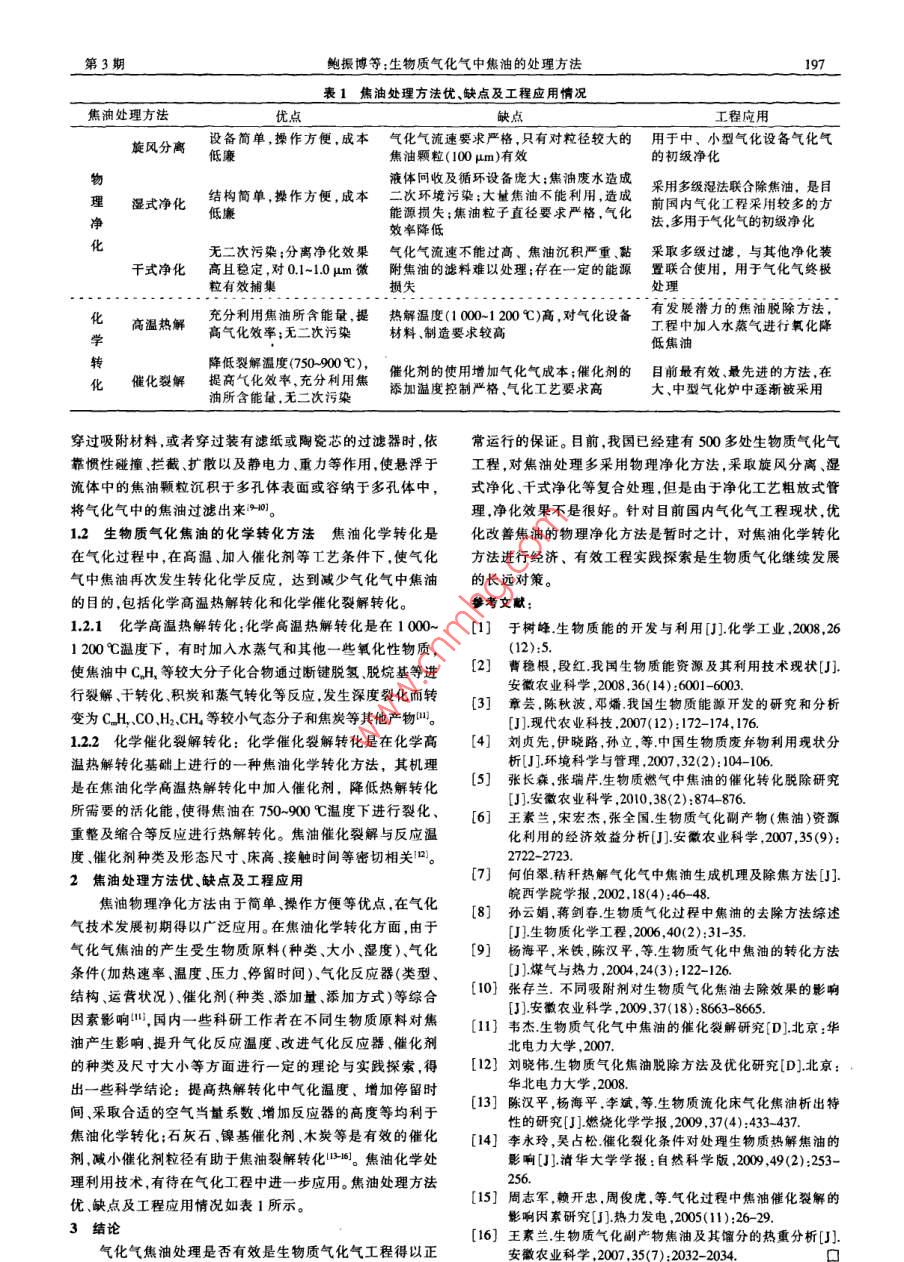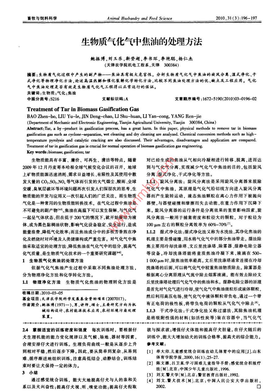 畜牧與簡料科學(xué)A nimal Husbandry and Feed Science2010,31 (3):196-197生物質(zhì)氣化氣中焦油的處理方法鮑振博,劉玉樂,靳登超,李書環(huán),李艷聰,楊仁杰(天津農(nóng)學(xué)院機(jī)電工程系,天津300384)摘要:生物質(zhì)氣化過程中產(chǎn)生的副產(chǎn)物--焦油具有極大危害性。 分析生物質(zhì)氣化氣中焦油的旋風(fēng)分離、濕式凈化、干式凈化等物理凈化方法,論述高溫?zé)峤夂痛呋呀饣瘜W(xué)轉(zhuǎn)化方法,比較不同焦油處理方法的優(yōu)、缺點(diǎn)及工程應(yīng)用。氣化氣中焦油處理是否有效是生物質(zhì)氣化氣工程得以正常運(yùn)行的保證。關(guān)鍵詞:生物質(zhì):氣化;焦油中國分類號:S216文獻(xiàn)標(biāo)識碼:A文章順序編號:1672- -5190(2010)03- -0196- 02Treatment of Tar in Biomass Gasification GasBAO Zhen-bo, LIU Yu-le, JIN Deng -chao, LI Shu- -huan, LI Yan- .cong, YANG Ren-jie(Department of Mechanic and Electronie Engineering, Tianjin Agricultural University, Tianjin 300384, China)Abstract:Tar, a by -product in gasifcation process, has a great harm. In this paper, physical methods to remove tar in biomassgasification gas such a cyclone-separation, wet cleaning and dry cleaning are analyzed. Chemical conversion methods such a high-temperature pyrolysis and catalytic cracking are also discussed. Their advanlages, disadvantages and application are compared.Treatment of tar in gasification gas is crucial for nomal operation of biomass gasification gas engineering.Key words :biomass; gasification; tar生物質(zhì)能具有豐富、廉價、可再生、清潔等特點(diǎn),隨著對已經(jīng)生成的焦油從氣相向冷凝相進(jìn)行轉(zhuǎn)移、脫離,進(jìn)而達(dá)2009年12丹麥哥本哈根全球氣候變化會議的召開,地球到與氣化氣分離,實現(xiàn)減少氣化氣中焦油的目的,包括旋風(fēng)上礦物質(zhì)能源迅速消耗需求日益增長、有限性及其使用中散分離濕式凈化、干式凈化等方法。發(fā)大量的CO2、SO2.NO,等氣體而引發(fā)的大氣煙塵、酸雨、全球1.1.1旋風(fēng)分離法:旋風(fēng)分離法是采用旋風(fēng)分離器來脫除變暖臭氧層破壞等環(huán)境問題再次引發(fā)人們深層次的思考,生氣化氣中焦油,其原理是氣化氣沿切線方向進(jìn)人旋風(fēng)分離物質(zhì)能的開發(fā)與應(yīng)用又- -次引起人們的廣泛關(guān)注,而生物質(zhì)器而產(chǎn)生旋轉(zhuǎn)運(yùn)動,液態(tài)焦油顆粒在離心力作用下被拋向氣化是一種常用的生物質(zhì)能轉(zhuǎn)換技術(shù),在氣化過程中焦油是器壁,與器壁碰撞和摩擦而失去動能,在重力作用下沉降下不可避免的副產(chǎn)物1叫)。焦油在高溫下可以發(fā)生裂解,與氣化氣來。旋風(fēng)分離器的運(yùn)行條件是分離效果的重要影響因素,旋一起呈氣體狀態(tài),但在低于200 C的情況下,就開始凝結(jié)為液風(fēng)分離法一般用于捕集密度和粒徑大的顆粒,對于粒徑為體,成為黑色黏稠油狀物影響氣化設(shè)備穩(wěn)定、安全運(yùn)行,造成100 μm左右的顆粒分離效率為60%-70%7。能量浪費(fèi),降低氣化效率;而且焦油成分中的多核芳香族在凈1.1.2濕式凈 化法:濕式凈化法又稱為水洗法,其凈化焦油的化及燃燒時對環(huán)境及人類健康構(gòu)成嚴(yán)重危害。對氣化氣中焦機(jī)理主要是慢碰撞,用水將氣化氣中的部分焦油帶走。濕法除油采取適宜的處理方法,降低焦油在氣化氣中的組分,提高氣焦主要用冷卻洗滌塔、文丘里洗滌塔、除霧器、濕靜電除塵器化氣質(zhì)量,是生物質(zhì)氣化技術(shù)的一個重要研究課題的。等設(shè)備。冷卻洗滌塔能將重質(zhì)焦油冷凝下來,液滴在500~1生物質(zhì)氣化焦油的處理方法1000μm時,除焦油效率最高。文丘里洗滌塔通常連接在冷卻依據(jù)氣化氣焦油產(chǎn)生過程中采取不同焦油處理方法,洗滌塔的后面,可以將氣化氣中較重焦油物質(zhì)除去。除霧器是分為物理凈化方法和化學(xué)轉(zhuǎn)化方法。根據(jù)離心分離原理從氣流中除去煙霧液滴,能有效去除經(jīng)文1.1物理凈化方法生物質(zhì)氣化焦 油的物理轉(zhuǎn)化方法是丘里洗滌塔處理后氣化氣中的焦油和水。濕靜電除塵器的原理是首先對氣化氣進(jìn)行冷卻,使氣化氣中焦油微粒形成液體顆粒,收稿日期:2010-03-05基金項目:天津農(nóng)學(xué)院科學(xué)發(fā)展基金資助項目(2007017)。然后利用高壓電場,使氣化氣中液體顆粒帶負(fù)電,通過一個帶作者簡介:鮑振博(1971- -).男,講師,碩士,主要研究方向為機(jī)有正電荷的極性板,將帶負(fù)電荷的顆粒從氣化氣中除去閣。械結(jié)構(gòu)設(shè)計.、農(nóng)村能源技術(shù)應(yīng)用、農(nóng)村環(huán)境污染處理1.1.3干式凈化法:干式凈化法又稱過濾法,其除焦油機(jī)理裝置。是將吸附性強(qiáng)的材料(如活性炭等)裝在容器中,當(dāng)氣化氣2.4掌握適宜的訓(xùn)練密度和強(qiáng)度 每次訓(xùn)練時, 要根據(jù)仔欲與探求欲;增強(qiáng)仔犬體能和提高仔犬膽量。在仔犬隨后的犬生理機(jī)能的能力變化規(guī)律以及氣候、場地、器材等因素,訓(xùn)練中 ,能大大增加幼犬的訓(xùn)練合格率,提高犬的綜合能力。合理安排仔犬進(jìn)行訓(xùn)練。生理負(fù)荷曲線一般是從逐步上升參考文獻(xiàn):到相對平穩(wěn),然后逐步下降。因此,要從簡單到復(fù)雜、從易到[1]單大卵兒童感覺統(tǒng)合訓(xùn)練在幼兒體育中的應(yīng)用[J].山東難、循序漸進(jìn)地組