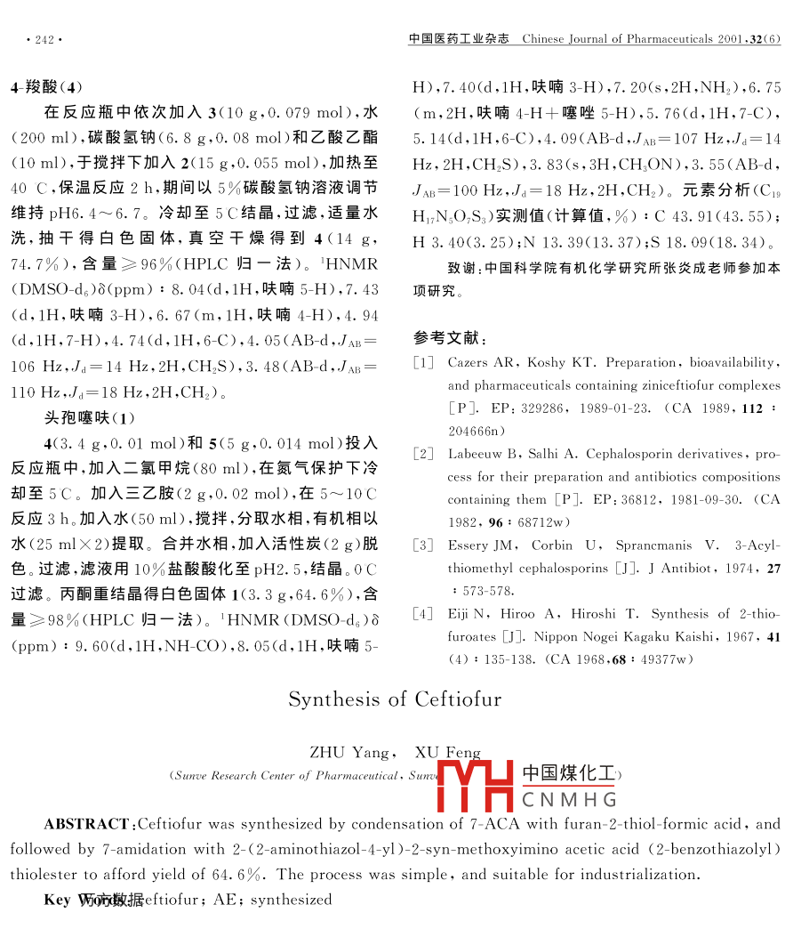 中國醫(yī)藥工業(yè)雜志Chinese Journal of Pharmaceuticals 2001.32(6)A工藝研究:文章編號:1001-8255<2001 )06 -0241-02頭孢噻呋的合成朱陽,許峰(上海三維制藥有限公司三維藥物研究中心,上海200331).摘要:頭孢噻呋可以7-ACA為原料,先與2-呋喃甲硫羥酸縮合得到7-氨基-3-[(2-呋喃基羰基)硫甲基]-3-頭孢烯-4-羧酸,再以活性硫酯(5)取代需用三苯甲基保護氨基的2-氨基噻唑- 4羧酸的1H-苯并三唑- 1- 基活性酯,進行7-位酰胺化反應制得。5為反應劑可縮短反應時間(3h),簡化操作,收率可由34%提高至64.6%。產(chǎn)品質量較好,成本較低,易于工業(yè)化生產(chǎn)。關鍵詞:頭孢噻呋;活性硫酯;合成中圖分類號: R978. 1+1文獻標識碼:A頭孢噻呋(ceftiofur, 1),化學名:(6R,7R)-7-處理復雜;另外還要增加脫保護基反應(用50%甲[2- (2- 氨基噻唑4- 基)-(Z)-2- (甲氧亞胺基)乙酰胺酸),收率低,且質量不易控制。4的合成雖有文獻報基]-3-[(2-呋喃基羰基)硫甲基]-3-頭孢烯4羧酸,道[3],但具體操作不詳。是美國Pharmacia&.Upjohn公司開發(fā)的頭孢菌素本文參考有關文獻[1,對合成方法進行了摸索類獸藥,主要用于治療牲畜的細菌性呼吸道感染.與改進。以7-ACA(2)為原料,與2- 呋喃甲硫羥酸等凹。有關此藥的合成報道很少,且在合成與質量控(3)縮合反應制得4,再用已有工業(yè)化生產(chǎn)的活性硫制上有一定難度。酯(5,河北省石家莊金通醫(yī)藥化工有限公司提供)進文獻2]合成1時需使用氨基以三苯甲基保護的行7-位酰胺化反應制得1(圖1)。無須進行氨基保2-氨基噻唑-4-羧酸的1H-苯并三唑-1-基活性酯與.護,簡化了反應步驟,酰胺化反應時間由20h[3]減至7-氨基-3-[(2-呋喃基羰基)硫甲基]-3-頭孢烯-4-羧3h,最后一步收率可由34%[2提高到64.6%,且質酸(4)在EtN存在下反應,反應時間長(20 h),后量有所保證,成本較低,易于工業(yè)化生產(chǎn)。NH2NHoOAc + HSCOOH0COOH 034SHN-NOCH3NHrot -Nv1圖11的合成路中國煤化工YHCNMHG分收稿日期:2000-06-19作者簡介:朱陽(1963),男,工程師,主要從事頭孢菌素類藥物2-呋喃甲硫羥酸(3)的研究開發(fā)。按文獻[4]合成,收率70%,bp 91C/1. 33 kPaTel:021序芳數(shù)據(jù)1039(文獻[4:收率75%,bp 101 C/2.1 kPa)。E- mail: sunve @ pub. sioc. ac. cn7-氨基3-[(2呋喃基羰基)硫甲基]-3-頭孢烯_●242●中國醫(yī)藥工業(yè)雜志Chinese Journal of Pharmaceuticals 2001 ,32(6)4羧酸(4)H),7.40(d,1H,呋喃3- H),7.20(s ,2H,NH2),6.75在反應瓶中依次加入3(10 g,0.079 mol),水(m,2H,呋喃4-H+噻唑5-H),5. 76(d,1H,7-C),(200 ml),碳酸氫鈉(6.8 g,0. 08 mol)和乙酸乙酯5. 14(d,1H,6-C),4. 09(AB-d,JAB=107 Hz,J.=14.(10ml),于攪拌下加入2(15 g,0. 055 mol),加熱至Hz, 2H,CH2S),3.83(s,3H,CH,ON),3.55(AB-d,40C,保溫反應2h,期間以5%碳酸氫鈉溶液調節(jié)J AB= 100 Hz,.Js= 18 Hz,2H,CH2)。元素分析(C。維持pH6.4~6.7。冷卻至5C結晶,過濾,適量水HrN,O,S3)實測值(計算值,%) :C 43. 91(43. 55);洗,抽干得白色固體,真空干燥得到4(14 g,H 3. 40(3. 25);N 13. 39(13. 37);S 18. 09(18. 34)。74.7%),含量≥96%(HPLC歸一法)。 HNMR致謝:中國科學院有機化學研究所張炎成老師參加本(DMSO- d;)δ(ppm) : 8. 04(d,1H,呋喃5-H),7. 43項研究。(d,1H,呋喃3-H),6. 67(m,1H,呋喃4-H),4. 94(d,1H,7-H),4.74(d,1H,6-C),4. 05(AB-d,JAB=參考文獻:106 Hz,Js= 14 Hz,2H,CH2S),3. 48(AB- d,JAB=[1] Cazers AR,Koshy KT. Preparation, bioavailability,110 Hz..Js= 18 Hz ,2H,CH2)。and pharmaceuticals containing ziniceftiofur complexes[P]. EP: 329286, 1989-01-23. (CA 1989, 112頭孢噻呋(1)204666n)4(3.4 g,0.01 mol)和5(5 g,0.014 mol)投入[2] Labeeuw B, Salhi A. Cephalosporin derivatives, pro-反應瓶中,加入二氯甲烷(80 ml),在氮氣保護下冷cess for their preparation and antibiotics compositions卻至5C。加入三乙胺(2 g,0.02 mol),在5~10Ccontaining them [P]. EP:36812, 1981-09-30. (CA反應3h。加入水(50ml),攪拌,分取水相,有機相以1982, 96 : 68712w)水(25 mlX2)提取。合并水相,加入活性炭(2 g)脫[3] Essery JM,Corbin U, Sprancmanis V. 3- Acyl-色。過濾,濾液用10%鹽酸酸化至pH2.5,結晶。0Cthiomethyl cephalosporins [J]. J Antibiot, 1974, 27過濾。丙酮重結晶得白色固體1(3.3g,64. 6%),含: 573-578.量≥98%(HPLC歸一法)。'HNMR (DMSO -d;)δ .[4] EjiIN, Hiroo A,Hiroshi T. Synthesis of 2-thio-furoates [J]. Nippon Nogei Kagaku Kaishi, 1967, 41(ppm) : 9. 60(d,1H,NH CO),8.05(d,1H,呋喃5-(4) : 135-138. (CA 1968 ,68: 49377w)Synthesis of CeftiofurZHU Yang,XU Feng(Sunve Research Center of Pharmaceutical, Su中國煤化工)YHCNMH G .ABSTRACT :Ceftiofur was synthesized by condensation of 7-ACA with furan-2 thiol-formic acid, andfollowed by 7-amidation with 2- (2- aminothiazol-4-yl )-2- syn- methoxyimino acetic acid (2- benzothiazolyl)thiolester to afford yield of 64. 6%. The process was simple,and suitable for industrialization.Key嚦市敝據(jù)eftiofur; AE; synthesized