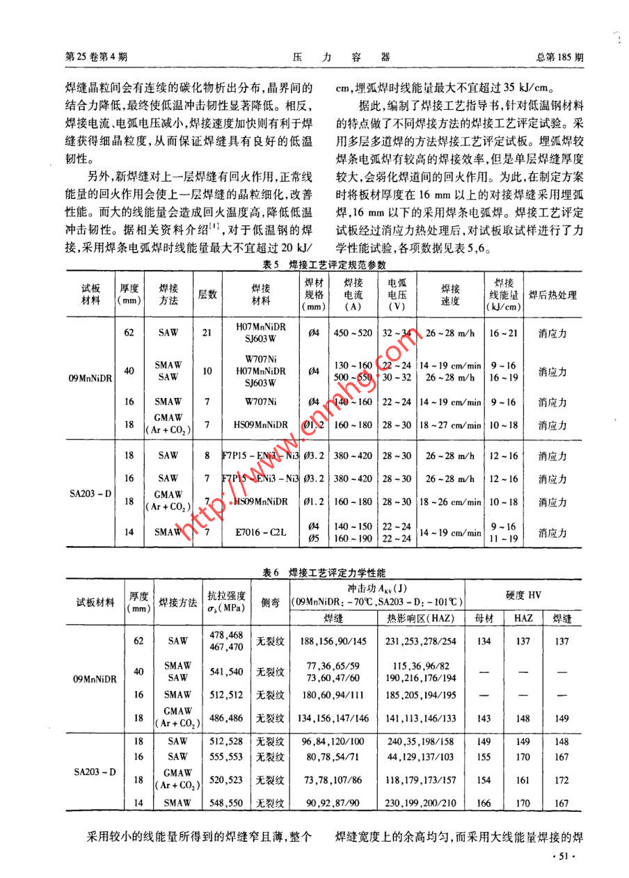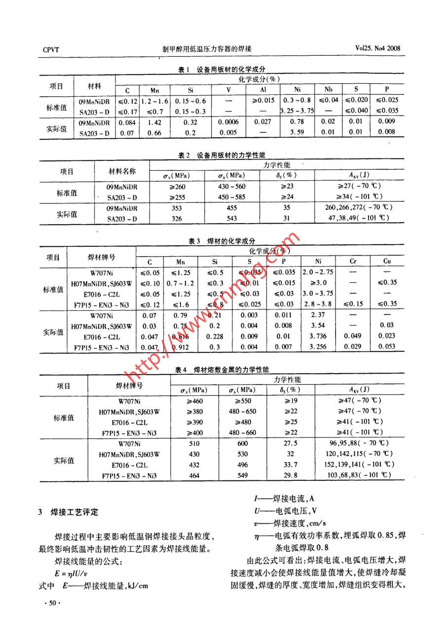經(jīng)驗交流制甲醇用低溫壓力容器的焊接楊志軍,王日晗,郭焱霞(錦西化工機械(集團)有限責(zé)任公司,遼寧葫蘆島125001)摘要:通過對國產(chǎn)09MnNiDR及采用ASME規(guī)范的SA203 -D等低溫材料的焊接試驗及生產(chǎn)應(yīng)用,闡述了控制焊接線能量對低溫鋼焊接的重要性。關(guān)鍵詞:低溫鋼;焊接材料;焊接工藝評定試驗;焊接制造中圖分類號:TG113.26文獻標(biāo)識碼:B文章 編號:1001 - 4837(2008)04 -0049 -04Welding of Low - temperature Pressure VesselUsed for Producing MethanolYANG Zhi - jun, WANG Ri - han,GUO Yan - xia(Jinxi Chemical Machinery( Croup)Co. ,Ltd. ,Huludao 125001 ,China )Abstract: After the test and manufacture of the low - temperature material, such as domestic material09MnNiDR and ASME Code material SA203 - D, we acknowledge the character of the low - temperaturesteel and we also find the reliable problems ocurred during welding. This text emphasized the importantpoint during welding.Key words:low - temperature seel; welding material; welding process speification tet; welding manu-facture著。低溫鋼在回火時,沿晶會有碳化物析出分布,回1前言火溫度高會使碳化物長大而影響低溫沖擊韌性。某公司近期承接了一批制甲醇用低溫壓力容器低溫鋼主要用于低溫下工作的壓力容器、管道設(shè)備的制造任務(wù),其中甲醇洗滌塔是目前國內(nèi)采用等,工作溫度常在-20 C以下。低溫鋼主要分不含09MnNiDR材料制造的容積最大的低溫壓力容器設(shè)Ni及含Ni兩大類,對低溫鋼的主要性能要求是保備,設(shè)計溫度最低為-70 C。還有采用ASME規(guī)范證在使用溫度下具有足夠的韌性及抵抗脆斷破壞的材料SA203 - D(名義使用溫度為- 101 C)制造的能力。低溫用鋼一般是合金元素的固溶強化和晶粒-些塔設(shè)備。細化,并通過正火或正火加回火(調(diào)質(zhì)處理)處理細化晶粒.均勻組織,而獲得良好的低溫韌性。2材料低溫鋼中的Ni,Mn等元素可抑制脆性轉(zhuǎn)變溫度的提高,對材料保持好的低溫沖擊性能有利。而設(shè)備用板材的化學(xué)成分和力學(xué)性能分別如表C,P,S,Si,0等則會提高脆性轉(zhuǎn)變溫度,對材料的低1,2所示,焊材的化學(xué)成分和力學(xué)性能分別如表3,4溫沖擊韌性產(chǎn)生不利影響,其中C,P的影響尤為顯所示。.49.CPVT制甲醇用低溫壓力容器的焊接Vol25. No4 2008表1設(shè)備用板材的化學(xué)成分化學(xué)成分(% )材料CMnSiV_Al_NNbs__P標(biāo)準(zhǔn)值O9MnNiDR≤0. 121.2-1.6 0.15~0.6≥0.015 0.3~0.8 ≤0.04 | ≤0.020≤0.025 .SA203-D | ≤0.17|≤0.70.15 ~0.3- _ .3.25~3.75一≤0.040 ≤0. 035實際值09MnNiDR 0. 0841.420.320.00060.020.780.010.009SA203-D| 0.070.660.20.0053.590.008表2設(shè)備用板材的力學(xué)性能力學(xué)性能項目材料名稱σ,( MPa)σ。( MPa)8.(%)Axv(J)09MnNiDR≥260430 -560≥23≥27( -70 C)SA203- D≥255450 ~ 585≥24≥34( -101 C)3534535260,266 ,272( -70 C)SA203-D3265433147 ,38.49( -101 C)表3焊材的化學(xué)成分化學(xué)成分(%)焊材牌號_NiCrCuW707Ni≤0.05 <1.25≤0.5≤0.035|≤0.035 2.0-2.75一-HO7MnNiDR, ,SJ603W|≤0. 100.7-1.2≤0.3≤0.01≤0.015≥3.0≤0. 35E7016 - C2L≤0.05|≤1.25≤0.03≤0.03 3.0~3.75F7PI5 - ENi3 - Ni3≤0.12≤1.6≤0.8≤0.0252.8~3.8≤0. 150.070.790.210.0030.0112.37H07MnNiDR, SJ603w 0.030.750.0040. 008.3. 540.03E7016- C2L0.047 0. 6160. 2280.01 .3. 7360. 0490.023F7PI5- EN3-Ni30.047 0.9120.0073. 2560. 0290. 053表4焊材熔敷金屬的力學(xué)性能項目.σs( MPa)8(%) .≥460≥550≥I9≥47(-70 C)HO7MnNiDR , SJ603W≥380480 -650≥22≥390≥480≥25≥41( -101 C)F7P15 - ENi3 - Ni3≥400480 ~ 660≥41(-101 C)51060027.596,95,88( - 70 C)H07MnNiDR. ,SJ603W430303120,142,115( -70 C)4329633.7152 ,139,141( -101 C)F7PI5- ENi3 - Ni34644929.8103 ,68,83( -101 C)一~焊接電流,A3焊接工藝評定U_ - -電弧電壓,V焊接速度, cm/s焊接過程中主要影響低溫鋼焊接接頭晶粒度、-電弧有效功率系數(shù),埋弧焊取0.85,焊.最終影響低溫沖擊韌性的工藝因素為焊接線能量。條電弧焊取0.8焊接線能量的公式:由此公式可看出:焊接電流電弧電壓增大,焊E =ηIU/v接速度減小會使焊接線能量值增大,使焊縫冷卻凝式中E-焊接線能量 ,kJ/cm固緩慢,焊縫的厚度、寬度增加,焊縫組織變得粗大,●50.第25卷第4期壓力容器總第185期焊縫晶粒間會有連續(xù)的碳化物析出分布,晶界間的cm,埋弧焊時線能量最大不宜超過35 kJ/cm。結(jié)合力降低,最終使低溫沖擊韌性顯著降低。相反,據(jù)此,編制了焊接工藝指導(dǎo)書,針對低溫鋼材料焊接電流.電弧電壓減小,焊接速度加快則有利于焊的特點做了不同焊接方法的焊接工藝評定試驗。采縫獲得細晶粒度,從而保證焊縫具有良好的低溫用多層多道焊的方法焊接工藝評定試板。埋弧焊較韌性。焊條電弧焊有較高的焊接效率,但是單層焊縫厚度另外,新焊縫對上一層焊縫有回火作用,正常線較大,會弱化焊道間的回火作用。為此,在制定方案能量的回火作用會使上一層焊縫的晶粒細化,改善時將板材厚度在16mm以上的對接焊縫采用埋弧性能。而大的線能量會造成回火溫度高,降低低溫焊,16 mm以下的采用焊條電弧焊。焊接工藝評定沖擊韌性。據(jù)相關(guān)資料介紹",對于低溫鋼的焊試板經(jīng)過消應(yīng)力熱處理后,對試板取試樣進行了力接,采用焊條電弧焊時線能量最大不宜超過20 kJ/學(xué)性能試驗 ,各項數(shù)據(jù)見表5,6。表5焊接工藝評定規(guī)范參 數(shù)試板|厚度焊接燁接焊材焊接電弧(mm)|方法.層材料規(guī)格電流電壓速度線能量| 焊后熱處理(mm)| (A)(V)( kJ/cm)H07MnNiDR52SAW|2SJ603W04| 450-520 32~