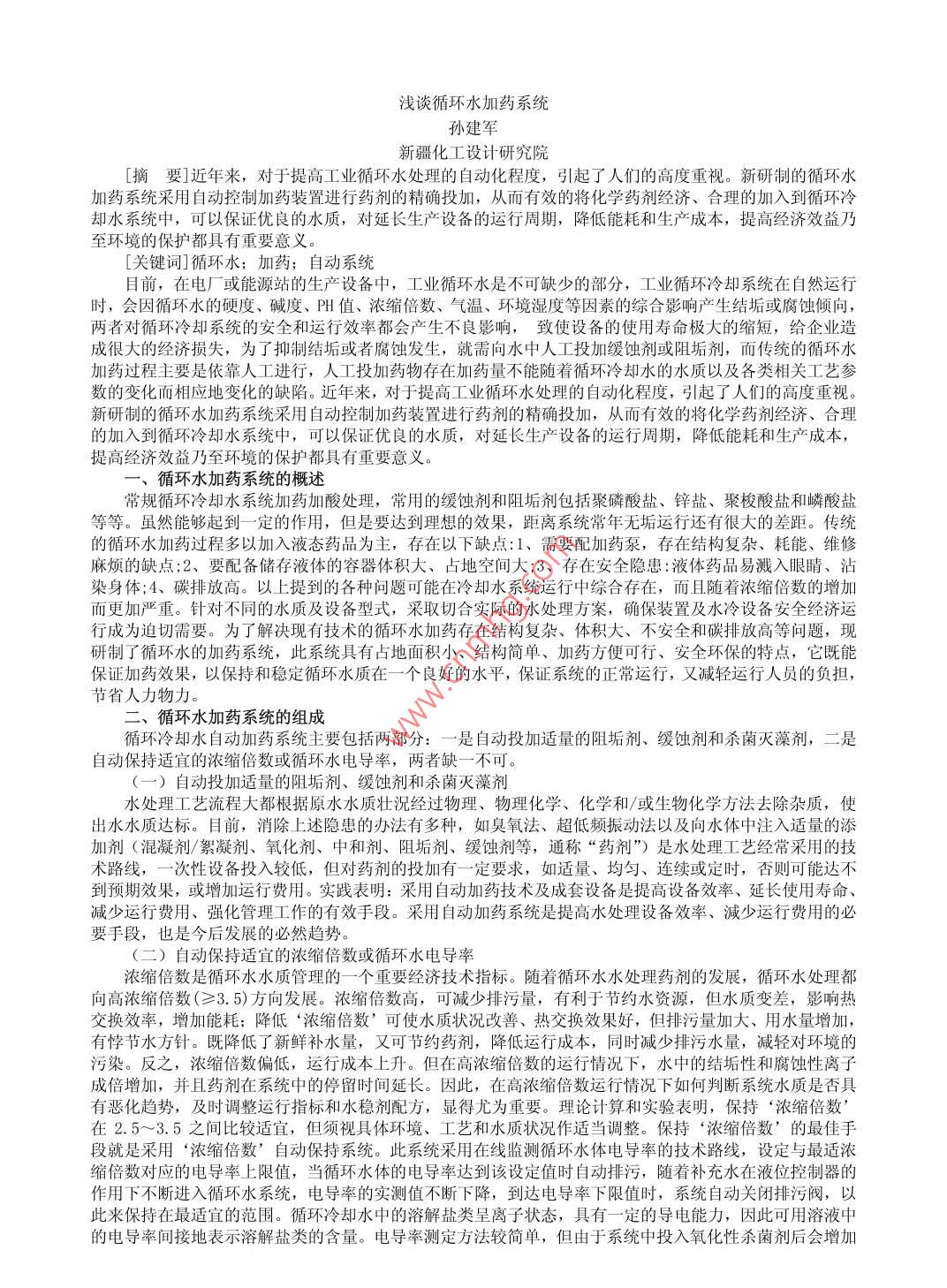 淺談循環(huán)水加藥系統(tǒng)孫建軍新疆化工設(shè)計(jì)研究院[摘要]近年來,對于提高工業(yè)循環(huán)水處理的自動化程度,引起了人們的高度重視。新研制的循環(huán)水加藥系統(tǒng)采用自動控制加藥裝置進(jìn)行藥劑的精確投加,從而有效的將化學(xué)藥劑經(jīng)濟(jì)、合理的加入到循環(huán)冷卻水系統(tǒng)中,可以保證優(yōu)良的水質(zhì),對延長生產(chǎn)設(shè)備的運(yùn)行周期,降低能耗和生產(chǎn)成本,提高經(jīng)濟(jì)效益乃至環(huán)境的保護(hù)都具有重要意義。[關(guān)鍵詞]循環(huán)水;加藥;自動系統(tǒng)目前,在電廠或能源站的生產(chǎn)設(shè)備中,工業(yè)循環(huán)水是不可缺少的部分,工業(yè)循環(huán)冷卻系統(tǒng)在自然運(yùn)行時,會因循環(huán)水的硬度、堿度、門值、濃縮倍數(shù)、氣溫、環(huán)境濕度等因素的綜合影響產(chǎn)生結(jié)垢或腐蝕傾向兩者對循環(huán)冷卻系統(tǒng)的安全和運(yùn)行效率都會產(chǎn)生不良影響,致使設(shè)備的使用壽命極大的縮短,給企業(yè)造成很大的經(jīng)濟(jì)損失,為了抑制結(jié)垢或者腐蝕發(fā)生,就需向水中人工投加緩蝕劑或阻垢劑,而傳統(tǒng)的循環(huán)水加藥過程主要是依靠人工進(jìn)行,人工投加藥物存在加藥量不能隨著循環(huán)冷卻水的水質(zhì)以及各類相關(guān)工藝參數(shù)的變化而相應(yīng)地變化的缺陷。近年來,對于提高工業(yè)循環(huán)水處理的自動化程度,引起了人們的高度重視新硏制的循環(huán)水加藥系統(tǒng)采用自動控制加藥裝置進(jìn)行藥劑的精確投加,從而有效的將化學(xué)藥劑經(jīng)濟(jì)、合理的加入到循環(huán)冷卻水系統(tǒng)中,可以保證優(yōu)良的水質(zhì),對延長生產(chǎn)設(shè)備的運(yùn)行周期,降低能耗和生產(chǎn)成本,提高經(jīng)濟(jì)效益乃至環(huán)境的保護(hù)都具有重要意義、循環(huán)水加藥系統(tǒng)的概述常規(guī)循環(huán)冷卻水系統(tǒng)加藥加酸處理,常用的緩蝕劑和阻垢劑包括聚磷酸鹽、鋅鹽、聚梭酸鹽和嶙酸鹽等等。雖然能夠起到一定的作用,但是要達(dá)到理想的效果,距離系統(tǒng)常年無垢運(yùn)行還有很大的差距。傳統(tǒng)的循環(huán)水加藥過程多以加入液態(tài)藥品為主,存在以下缺點(diǎn):1、需要配加藥泵,存在結(jié)構(gòu)復(fù)雜、耗能、維修麻煩的缺點(diǎn);2、要配備儲存液體的容器體積大、占地空間大;3、存在安全隱患:液體藥品易濺入眼睛、沾染身體;4、碳排放高。以上提到的各種問題可能在冷卻水系統(tǒng)運(yùn)行中綜合存在,而且隨著濃縮倍數(shù)的增加而更加嚴(yán)重。針對不同的水質(zhì)及設(shè)備型式,采取切合實(shí)際的水處理方案,確保裝置及水冷設(shè)備安全經(jīng)濟(jì)運(yùn)行成為迫切需要。為了解決現(xiàn)有技術(shù)的循環(huán)水加藥存在結(jié)構(gòu)復(fù)雜、體積大、不安全和碳排放高等問題,現(xiàn)研制了循環(huán)水的加藥系統(tǒng),此系統(tǒng)具有占地面積小、結(jié)構(gòu)簡單、加藥方便可行、安全環(huán)保的特點(diǎn),它既能保證加藥效果,以保持和穩(wěn)定循環(huán)水質(zhì)在一個良好的水平,保證系統(tǒng)的正常運(yùn)行,又減輕運(yùn)行人員的負(fù)擔(dān),節(jié)省人力物力。循環(huán)水加藥系統(tǒng)的組成環(huán)冷卻水自動加藥系統(tǒng)主要包括兩部分:一是自動投加適量的阻垢劑、緩蝕劑和殺菌滅藻劑,二是j保持適宜的濃縮倍數(shù)或循環(huán)水電導(dǎo)率,兩者缺一不可。(一)自動投加適量的阻垢劑、緩蝕劑和殺菌滅藻劑水處理工藝流程大都根據(jù)原水水質(zhì)壯況經(jīng)過物理、物理化學(xué)、化學(xué)和/或生物化學(xué)方法去除雜質(zhì),使出水水質(zhì)達(dá)標(biāo)。目前,消除上述隱患的辦法有多種,如臭氧法、超低頻振動法以及向水體中注入適量的添加劑(混凝劑/絮凝劑、氧化劑、中和劑、阻垢劑、緩蝕劑等,通稱“藥劑”)是水處理工藝經(jīng)常采用的技術(shù)路線,一次性設(shè)備投入較低,但對藥劑的投加有一定要求,如適量、均勻、連續(xù)或定時,否則可能達(dá)不到預(yù)期效果,或增加運(yùn)行費(fèi)用。實(shí)踐表明:采用自動加藥技術(shù)及成套設(shè)備是提高設(shè)備效率、延長使用壽命減少運(yùn)行費(fèi)用、強(qiáng)化管理工作的有效手段。采用自動加藥系統(tǒng)是提高水處理設(shè)備效率、減少運(yùn)行費(fèi)用的必要手段,也是今后發(fā)展的必然趨勢(二)自動保持適宜的濃縮倍數(shù)或循環(huán)水電導(dǎo)率濃縮倍數(shù)是循環(huán)水水質(zhì)管理的一個重要經(jīng)濟(jì)技術(shù)指標(biāo)。隨著循環(huán)水水處理藥劑的發(fā)展,循環(huán)水處理都向高濃縮倍數(shù)(≥3.5)方向發(fā)展。濃縮倍數(shù)髙,可減少排污量,有利于節(jié)約水資源,但水質(zhì)變差,影響熱交換效率,增加能耗;降低‘濃縮倍數(shù)’可使水質(zhì)狀況改善、熱交換效果好,但排污量加大、用水量增加,有悖節(jié)水方針。既降低了新鮮補(bǔ)水量,又可節(jié)約藥劑,降低運(yùn)行成本,同時減少排污水量,減輕對環(huán)境的污染。反之,濃縮倍數(shù)偏低,運(yùn)行成本上升。但在高濃縮倍數(shù)的運(yùn)行情況下,水中的結(jié)垢性和腐蝕性離子成倍增加,并且藥劑