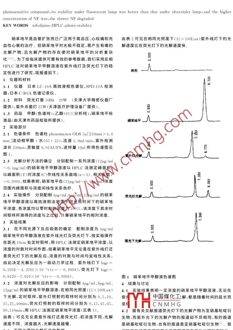 4總結(jié)與討論重要依據(jù)。種子的峰形相似,只是吸收強(qiáng)度不同。經(jīng)與龍眼比較,區(qū)別如下4.5據(jù)文獻(xiàn),二者在薄層色譜圖上也有差別4.1性狀特征綜上所述,龍茘果實(shí)在果皮表面,假種皮厚薄及韌性、種龍荔龍眼子等性狀特征,在果皮分泌腔的大小、假種皮的外層表皮細(xì)表面有疣鱗狀突起較平滑胞、種子有無(wú)纖維及油滴等顯微特征,在紫外光譜、薄層斑點(diǎn)假種內(nèi)壁不光滑,無(wú)光澤厚,有光澤,光滑較薄上與龍眼果實(shí)均有明顯區(qū)別,尤其是假種皮的成分組成。但粘手,難剝離有韌性,易剝離龍茘與龍眼種子的紫外吸收峰形相似,僅吸收強(qiáng)度有差別,種子種皮與種仁不易分離易分離說(shuō)明龍眼種子與其成分相似,但含量不同,可能也有一定的4.2顯微特征毒性,這個(gè)問(wèn)題還有待進(jìn)一步探討龍眼參考文獻(xiàn)果皮分泌腔較大,100m較小外層表皮細(xì)胞壁波狀有黃棕色塊狀物1崔同寅.補(bǔ)益中藥的鑒別與正確應(yīng)用.中國(guó)醫(yī)藥科技出版社,紅棕色塊狀1992,283有纖維,無(wú)油滴,厚壁細(xì)無(wú)纖維,有油滴,厚2孟楣,段全新.時(shí)珍國(guó)醫(yī)國(guó)藥.荔枝核——偽品桂圓核的生藥壁細(xì)胞13~15列學(xué)鑒別.1998.9(5):4404.3理化反應(yīng)①二者的斐林反應(yīng)均有紅色沉淀,說(shuō)明均孫法麗,徐凌川,馬萍.時(shí)珍國(guó)醫(yī)國(guó)藥.桂圓肉及其偽品的鑒含有糖類成分。②二者的假種皮與FeCl3無(wú)反應(yīng),說(shuō)明不含別.1998.9(4):38鞣質(zhì)。③二者的核與FeCl3、NaoH產(chǎn)生不同顏色反應(yīng),說(shuō)明可4平忠明,趙宇萍.中藥材,龍眼與偽品龍荔的鑒別.1993,16(9)能有不同類型的鞣質(zhì)。以上差別可作為鑒別的依據(jù)之一。收稿日期:2000-09-194.4紫外光譜二者假種皮峰形區(qū)別明顯,可作為鑒別的硝苯地平光解動(dòng)力學(xué)的研究張瑤紓李明強(qiáng)王軍郭艷娟(天津300203天津醫(yī)科大學(xué)藥學(xué)院;天津300120天津第二中心醫(yī)院;天津醫(yī)科大學(xué)s屆畢業(yè)生)摘要目的:研究硝苯地平在紫外線燈及日光色熒光燈下的光解動(dòng)力學(xué)。方法:用反相高效液相色譜法對(duì)4μg/ml~12μg/ml濃度范圍硝苯地平甲醇溶液的光解動(dòng)力學(xué)進(jìn)行了研究。結(jié)果:硝苯地平甲醇溶液在4μg/m~12μg/ml濃度范圍時(shí),不論是在紫外線燈照射下還是在熒光燈照射下光解均呈線性降解。濃度分別為4rg/ml、8"g/ml、12μg/ml硝苯地平甲醇溶液在相同光照度下(15×10Lux),其在紫外燈下的k分別為113.54×10-min-1、87.26×10min-1、52.21×10-min-1。在熒光燈下的分別為22.57×10-min-、、21.61×10-min-1、18.08×10-min-。結(jié)論:不論是在紫外線燈照射下還是在熒光燈照射下硝苯地平甲醇溶液都極易光解,且濃度越大光解速度越慢。在相同光照度下熒光燈對(duì)硝苯地平甲醇溶液光解速度旳影響比紫外線燈小關(guān)鍵詞硝苯地平;HPLC;光穩(wěn)定性Studies on Photo-degradation Kinetics of NifedipineZHANG Yao-Shu, LI Ming-Qiang, WANG Jun, GUO Yan-JuanDept. of Pharmacy, Tianjin medical university, Tianjin, 300203; The second Central Hospital Tianjin, 300120)ABSTRACT OBJECTIVE: Photo-stability of nifedipine (NF)中國(guó)煤化工 scent lamps were studiedMETHOD: The photo-degraded dynamics of NF in methanol solutCNMHGC. RESULTS: The photdegradation of NF at 4/g/ml-12/g/ml was described by linear degradation, when concentrations of NF were 4u g/ml,8 gml, 12 ug/ml the k of NF under the ultraviolet lamp(15* 100Lux)were 113. 54*10-min,87. 26*10min Iand 52.21*10 I respectively. K of NF methanol solutions containing the same amount of NF under the fluorescent lamp(15*10)數(shù)據(jù)×10mm,21.061×10 min and 18.08x1 min respectively. CONC0:NF中國(guó)現(xiàn)代應(yīng)用藥學(xué)雜志2001年12月第18卷第6期Chin JMAP, 2001 December, Vol 18 No6.445photosensitive compound, its stability under fluorescent lamp was better than that under ultraviolet lamp, and the higherof NF was, the slower NF degradedKEY WORDS nifedipine, HPLC, photo-stability硝苯地平是血管擴(kuò)張劑已廣泛用于高血壓、心絞痛和充由表2可見(jiàn)在相同光照度下(15×100Lux)紫外線燈下的光血性心衰的治療。但硝苯地平對(duì)光極不穩(wěn)定,易產(chǎn)生有毒的解速度比在熒光燈下的光解速度快光解產(chǎn)物,且光解產(chǎn)物的存在使對(duì)硝苯地平的分析復(fù)雜化2。為了給臨床提供可靠有效的參考數(shù)據(jù),我們采用反相HPLC法對(duì)硝苯地平甲醇溶液在紫外線燈及熒光燈下的穩(wěn)了研究,現(xiàn)報(bào)道如下1儀器和材料1.1儀器日本LC-10A高效液相色譜儀:SPD-10A檢測(cè)器;日本C-R6A色譜記錄儀1.2材料熒光燈管50Hz20W(天津大學(xué)精密儀器廠提供):紫外殺菌燈25W(天津醫(yī)療護(hù)理設(shè)備廠提供)。1.3藥品甲醇(色譜純);乙醇(95%分析純);硝苯地平標(biāo)準(zhǔn)品(由天津市藥品檢驗(yàn)所提供)硝苯地平2實(shí)驗(yàn)部分2.1色譜條件色譜柱 phenomenex ODS5[250mm×4.6mm流動(dòng)相甲醇:水(65:35),流速1.oml/min,紫外檢測(cè)波長(zhǎng)236mn,靈敏度o.o1AUFS,進(jìn)樣量10所得色譜圖見(jiàn)圖1。紫外燈光解2.3光解分析方法的確立分別配制一系列濃度(12g/mlnl)的硝苯地平甲醇溶液以HPLC法測(cè)定峰面積以峰面積(Y)對(duì)濃度(C)作線性關(guān)系曲線(n=3)。相關(guān)系數(shù)r0.9999結(jié)果表明:硝苯地平在(12gg/ml~0.4g/ml)濃度范圍內(nèi)峰面積與濃度間線性關(guān)系良好