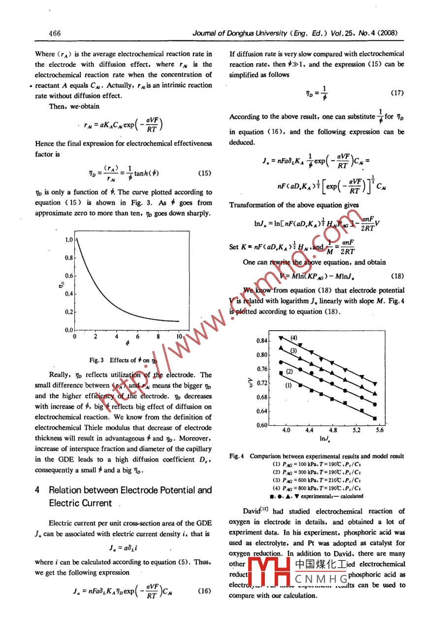 Joumal of donghua University(Eng. Ed. )Vol. 25, No 4(2008) 463A Mathematic Model of Gas-diffusion Electrodes in Contact withLiquid ElectrolytesLI Jun(李俊)1·, XI Dan-i奚旦立), SHI Yong(石勇), wU Xi-hui吳錫慧)I Department of Chemical Engineering, Shanghai Institute of Technology, Shanghai 200235, ChinaInstitute of Environment Science and Engineering, Donghua University, Shanghai 201620, ChinaAbstract: a mathematic model is developed which is applied reactants decrease gradually and reaction rate falto analyze the main factors that affect electrode performance inchmeal if mass transfer rate is lower than chemical orand to account for the process of reaction and mass transfer electrochemical reaction rate. It is expected that smin gas-diffusion electrodes in contact with liquid difference of reactants concentration in the capillary canelectrolytes. Electrochemical Thiele modulus p and balance consumption for surface reaction if reaction rate iselectrochemical effectiveness factor "o are introduced to slow but diffusion coefficient is high enough, and thuselucidate the effects of diffusion on electrochemical reaction reactant concentration along the capillary is nearly equaland utilization of the gasdiffusion electrode. Profile of the In contrary, reactant in the capillary will be used up in areactant along axial direction k discussed, dependence of short distance from the entrance if reaction rate is quickelectrode potential V on current density J, are predicated by enough, so, concentration grads of reactants alongans of the newly developed mathematical modelcapillary have to be high for quick reaction. Moreover, themajority of electrochemical reaction completes in a thinelectrolyte gasdiffusion electrode; mathematical modelactive layer of the GDE for quick reaction, reactantCLC number: TM 911. 4Document code: aArticle l:1672-5220(2008)04-0463-05concentration in the rest of the gDe is very low, the gDecan not function fully, and efficiency of the gde will bevery poor in this case.IntroductionIt is necessary to study the aforementioned processes inorder to increase efficiency of the electrode and makeas-diffusion electrodes(GDEs)are the key devices in catalysts in the electrode work very well. Many models offuel cells (FC). In recent years, they have also beendifferent complexity have been proposed to describeincreasingly used to synthesis, separation processes and fuel diffusion and reaction in the electrodes. Some authorsfavccell membrane reactors (FCMR). FCMR can be used toco-generate electric energy and useful chemicals1-s3. heterogeneous moder s. 103. The primary models, whichDepending on the application, electrodes of FC or FCMRwere used for analysing the performance of electrode inare often made into porous structure or gas-diffusioncontact with liquid electrolyte, were heterogeneous modelelectrodes. There are complicatedtransfer and such as single-pore model, thin-film model, cross-porereaction in the electrodes. GDEs may contact with liquidmodel, etc. These heterogeneous models often containrolyte infor hydrogen peroxide generation, benzene oxidation for contains length, diameter of the hole, and pore numbersphenol production, and partial oxidation of cyclohexane per unit area. Due to the limited accuracy of experimentfor cyclohexanone and electricity co-generation. The mosdata, some of the model parameters have little statisticalimportant processes taking place in GDEs are as follows: significance. It is hard to obtain these parameters through(a)dissolution and diffusion of reactant:(b)adsorption experiment. In this paper, a macroscopic model will beand electrochemical reaction of the reactants atderived and be used to analyse diffusion and reactionelectrochemical active layer (gas-liquid-solid three phaprocess happened in electrodes in contact withsection):(c) desorption and diffusion of products.Internal diffusion and chemical reaction take placecollaterally in electrochemical active layer, in other words, 1 Mathematical Modelreactants diffuse along capillary in the electrode while theytake part in electrochemical reaction. Concentration ofH中國煤化工liquid electrolyte is22CNMHGReceived date: 2007This research is supported by Shanghai Education Committee(06-OZ-003)and Shanghai Key Subject(pl501)CorrespondenceshouldbeaddressedtoLiJun,Dr,E-mail:lijun@sit.edu.cn464Joumal of Donghua University(Eng. Ed. ) Vol 25, No 4(2008)divided into two sections, namely gas-solid section or gas.CA=HAPAGlid layer, and gas-liquid-solid or electrochemical active Where Pag is the partial pressure of the component A inlayer. See Fig. 1the gas bulk(5)The electrode is a good conductor, heat fromgas-solidelectrochemicalchemical reaction can move out in time, and temperatureactive laverof the electrode keeps constant on the whole. Otherwiseliquid electrolyte is considered to be nonvolatile(6)In order to decrease effects of ion concentrationand electrical resistance on chemical reactionliquidconcentration of reactants in electrolyte is high enoughreactants concentration in electrochemical active layer canbe thought to be constant.Diffusion and reaction in electrochemical active layerof the electrode are similar to that in porous catalysts if theabove-mentioned hypotheses are metInevitably, many parameters will be introduced in themathematical model of a GDE if considering mass transferFig 1 Schematic representation of a gas diffusion electrodein three dimensions, and it is often very difficult to get anHypothesesanalytical resolution of the model equation. Moreover(1) There is no chemical reaction in gas-solid layer ofDE is axially symmetric in general. Mass transfer in axialthe GDE. Moreover, gas diffusion rate in gas-solid layer is direction is decisive. Based on steady state materialmuch faster than that of gas dissolving and diffusion inbalance, The following diffusion-reaction equation (3)canliquid, Gas-solid layer is considered as pseudo-homogeneousbe developed if considering diffusion