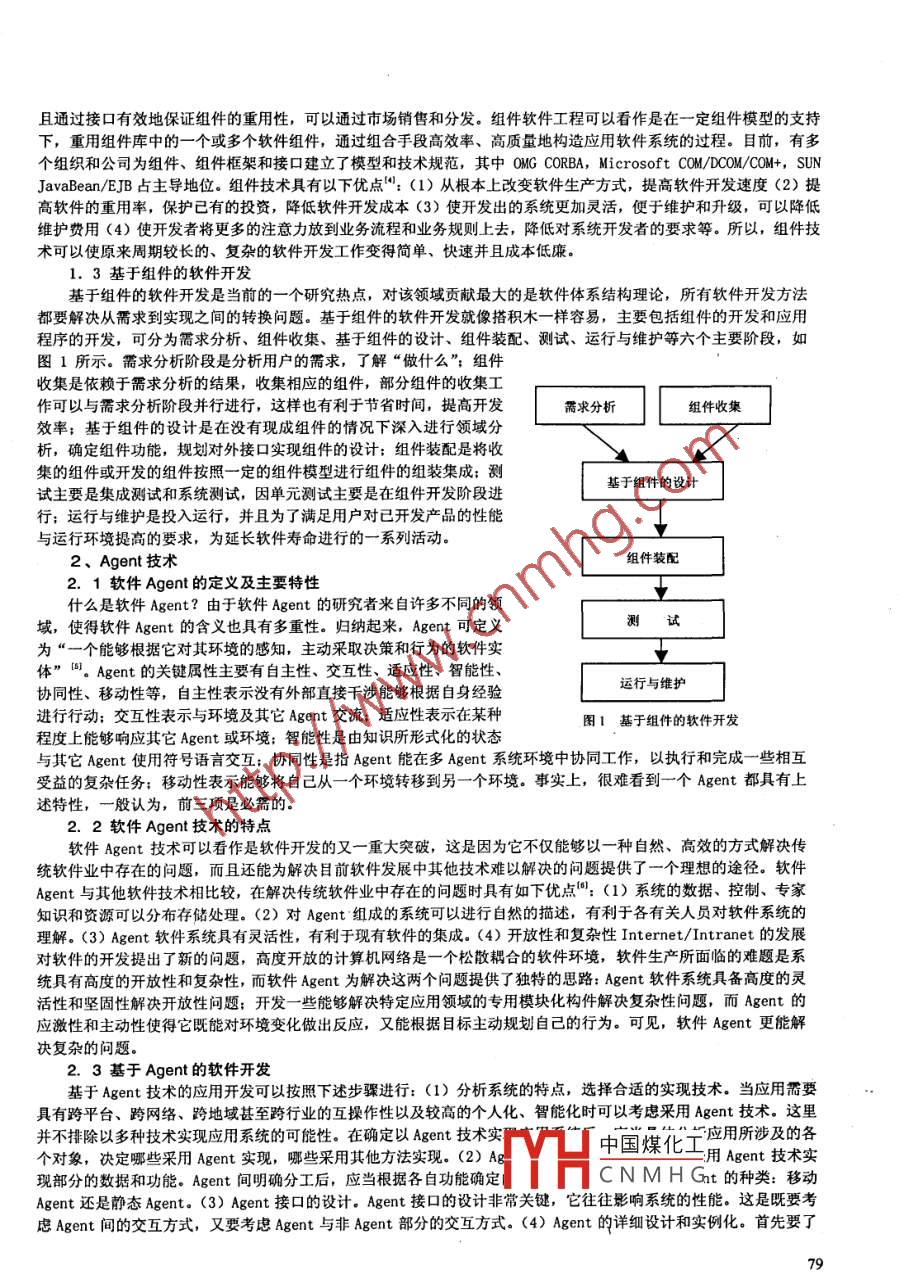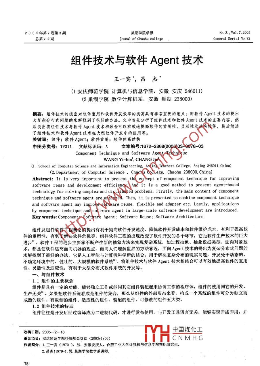 2005年第7卷第3期.巢湖學(xué)院學(xué)報No. 3.. Vol.7. 2005總第7 2期Joumal of Chaohu collegeGeneral Serial No. 72組件技術(shù)與軟件Agent技術(shù)王一賓',昌杰2(1安慶師范學(xué)院計算機與信息學(xué)院,安徽安慶246011)(2巢湖學(xué)院數(shù)學(xué)計算機系,安徽巢湖238000)摘要:組件技術(shù)的提出對軟件重用和軟件開發(fā)效率的提高具有非常重要的意義;而軟件Agent技術(shù)的提出為復(fù)雜分布式問題的求解找到了很好的辦法。文中首先分析了組件技術(shù)和軟件Agent技術(shù)的主要內(nèi)容,然后提出將組件技術(shù)與軟件Agent技術(shù)相融合可以有效地提高軟件的重用性、靈活性及適應(yīng)性等,最后簡述了組件技術(shù)和軟件Agent技術(shù)在大型軟件開發(fā)中的應(yīng)用等。關(guān)鍵詞:組件;軟件Agent;軟件重用;軟件體系結(jié)構(gòu)中圖分類號: TP311文獻(xiàn)標(biāo)識碼: A文章編號:1672- -2868(2005)03 -0078 03Component Technique and Software Agent TechniqueWANG Yi-bin', CHANG Jice'(1.. . School of Computer Science and Information Engineering, Anqing Teachers College, Anqing 246011, China)(2. Department of Computer Science ,Chaohu College, Chaohu 238000 China)Abstract: It is very important to present the concept of component technique for improvingsoftware reuse and development efficiency. And it is a good method to present agent-basedtechnology for solving complex and distributed problems. Firstly, the main content of componenttechnique and software agent are analyzed. Then, it is presented to combine component techniqueand software agent may improve software reuse, flexible and adapter etc. Lastly, appl icat ionsby component technique and software agent in large - -scale software developnent are introduced.Key words: Component; Software Agent; Software Reuse; Sof tware Architecture組件及組件軟件工程概念的提出有利于提高軟件開發(fā)速度、降低軟件開發(fā)成本和軟件維護(hù)成本,有利于提高軟件的重用性,有利于解決軟件危機等,組件軟件工程的出現(xiàn)改變了軟件開發(fā)的各個環(huán)節(jié),它是軟件生產(chǎn)技術(shù)的巨大進(jìn)步"。軟件工程的進(jìn)步主要靠不斷產(chǎn)生新的抽象方法來實現(xiàn)復(fù)雜系統(tǒng),如過程抽象、抽象數(shù)據(jù)類型、面向?qū)ο蠹夹g(shù),都是使軟件遠(yuǎn)離面向機器的觀點,而向人們理解世界的方法靠近,面向Agent技術(shù)的提出為復(fù)雜分布式問題的求解找到了很好的辦法,它是人工智能與計算機科學(xué)新的結(jié)合,用于解決復(fù)雜分布的現(xiàn)實問題,開發(fā)處于動態(tài)的、不確定環(huán)境中的、健壯的、大規(guī)模的軟件系統(tǒng)”。將組件技術(shù)與軟件Agent 技術(shù)相結(jié)合可以有效地提高軟件的重用性、靈活性及適應(yīng)性,有利于大型分布式軟件系統(tǒng)的開發(fā)等。一、與組件技術(shù)1.1組件的主要概念組件是具有-定的功能,能夠獨立工作或能同其它組件裝配起來協(xié)調(diào)工作的程序體,組件的使用同它的開發(fā)、生產(chǎn)無關(guān)"。如果把軟件系統(tǒng)看成是組件的集合,那么從組件的外部形態(tài)來看,構(gòu)成- -個系統(tǒng)的組件可分為獨立而成熟的組件、有限制的組件、適應(yīng)性的組件、裝配的組件、可修改的組件五大類。1.2組件技術(shù)的特點組件往往是開發(fā)后經(jīng)過編譯成為二進(jìn)制代碼,才進(jìn)行發(fā)布使用,與開發(fā)工具語言無關(guān),能夠?qū)崿F(xiàn)即插即用,井中國煤化工收稿日期: 2005- -2- -18基金項目:安慶師范學(xué)院科研基金資助(2003y1y06)MYHCNMHG作者簡介: 1.王一賓 (1970-), 兄安徽安慶人,合肥工業(yè)大學(xué)計算機與信息學(xué)院在職研究生。2.昌杰(1979-),男巢湖學(xué)院數(shù)學(xué)系講師.78且通過接口有效地保證組件的重用性,可以通過市場銷售和分發(fā)。組件軟件工程可以看作是在一定組件模型的支持下,重用組件庫中的一-個或多個軟件組件,通過組合手段高效率、高質(zhì)量地構(gòu)造應(yīng)用軟件系統(tǒng)的過程。目前,有多個組織和公司為組件、組件框架和接口建立了模型和技術(shù)規(guī)范,其中OMG CORBA, Microsoft COM/DC0M/COM+, SUNJavaBean/EJB占主導(dǎo)地位。組件技術(shù)具有以下優(yōu)點": (1) 從根本上改變軟件生產(chǎn)方式,提高軟件開發(fā)速度(2)提高軟件的重用率,保護(hù)已有的投資,降低軟件開發(fā)成本(3) 使開發(fā)出的系統(tǒng)更加靈活,便于維護(hù)和升級,可以降低維護(hù)費用(4)使開發(fā)者將更多的注意力放到業(yè)務(wù)流程和業(yè)務(wù)規(guī)則上去,降低對系統(tǒng)開發(fā)者的要求等。所以,組件技術(shù)可以使原來周期較長的、復(fù)雜的軟件開發(fā)工作變得簡單、快速并且成本低廉。1.3基于組件的軟件開發(fā)基于組件的軟件開發(fā)是當(dāng)前的一個研究熱點,對該領(lǐng)域貢獻(xiàn)最大的是軟件體系結(jié)構(gòu)理論,所有軟件開發(fā)方法都要解決從需求到實現(xiàn)之間的轉(zhuǎn)換問題?;诮M件的軟件開發(fā)就像搭積木- -樣容易, 主要包括組件的開發(fā)和應(yīng)用程序的開發(fā),可分為需求分析、組件收集、基于組件的設(shè)計、組件裝配、測試、運行與維護(hù)等六個主要階段,如圖1所示。需求分析階段是分析用戶的需求,了解“做什么”:組件收集是依賴于需求分析的結(jié)果,收集相應(yīng)的組件,部分組件的收集工作可以與需