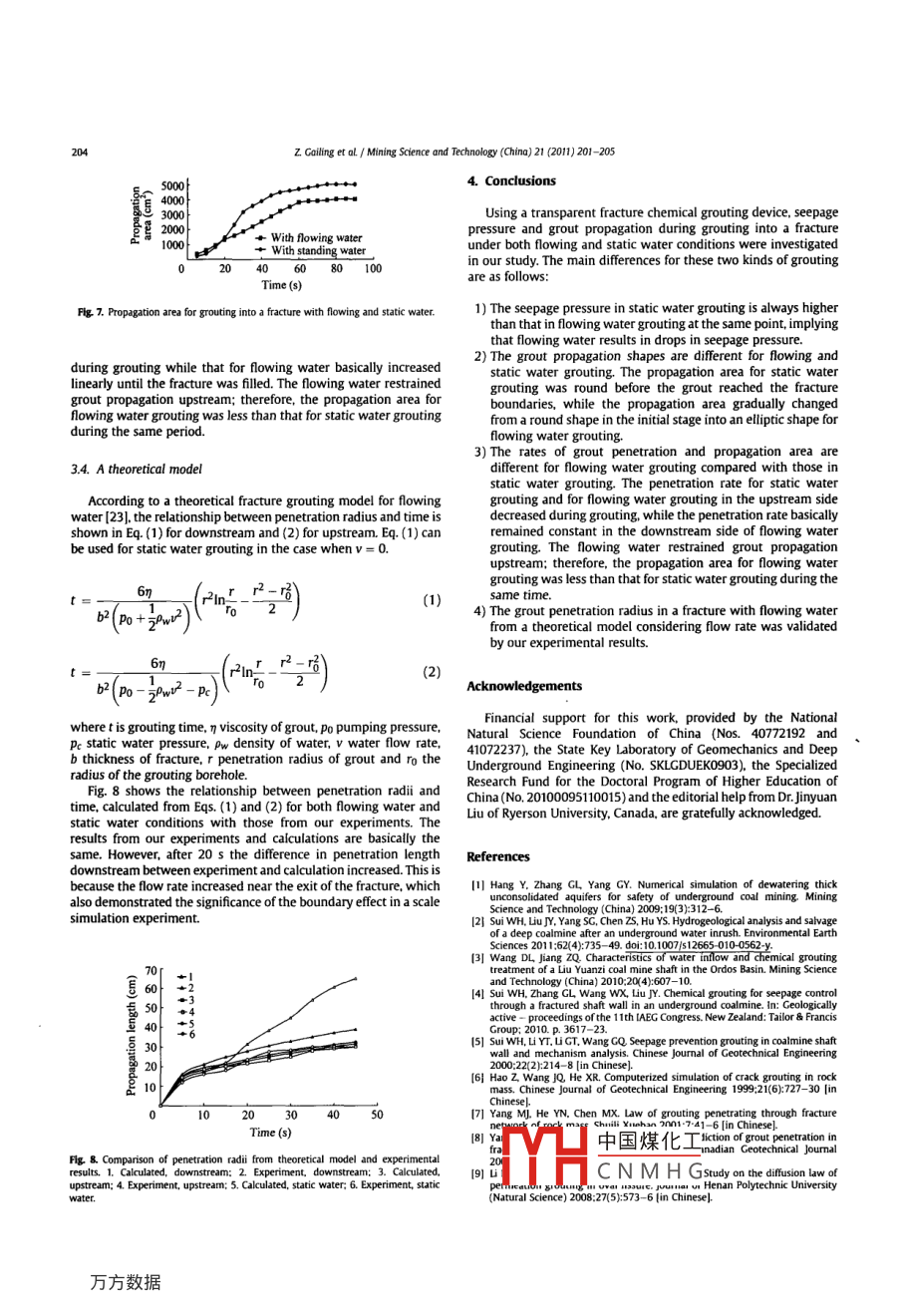 Mining Science and Technology (China) 21 (011)201 -205Contents lists available at ScienceDirectMining Science and Technology (China)ELSEVIERjournal homepage: www. elsevier. com/locate/mstcComparative.experimental investigation of chemical grouting intoa fracture with flowing and static waterZhang Gailinga*, Zhan Kaiyuab, Gao Yue a, Wang Wenxuea"State Key Laberatory of Geomechanics and Deep Underground Eng ineering School of Resources and Ceosciences, China University of Mining 6 Technology. Xuzhou 221008. China"Choneqing Design 5 Research Institute. Sino Coal hermarional Engineering Croup. Chongqing 400016. ChinaARTICLE 1 NFOABSTRACTArticle history:We present a series of experimental tests on chemical grouting into a fracture with flowing and starticReceived 2 August 2010water, using a transparent fracture grouting experimental device. Variations of seepage pressure andReceived in revised formgrout propagation were compared in our investigation. The results show that flowing water results inAcceRealiorober 2010drops of seepage pressure, development of penetration radi in the upstream side and drops of propa-gation area during the same period, compared with grouting in static water. The propagation area instatic water is always round before grouts reach the joint boundaries. However, the propagation shapeKeywords:changes from round to an lliptic shape for grouting into a fracture with flowing water. A theoreticalRock fracturemodel for the grout penetration radius in a fracture considering flowing velocity was developed andChemical groutingvalidated by our experimental results. These results are helpful in improving understanding of fractureFlowing water groutinggrouting mechanism and in guiding engineering practices.Static water groutingCopyright。2011, China University of Mining & Technology. All rights reserved.Scale model test1. Introductionexplosion efect of cement and chemically grouted material of thesurrounding rocks in a tunnel [16],Groundwater hazards in underground coalmines in China haveGrouting in flowing water is a common problem encountered inresulted in thousands of fatalities and threatened mining safety,practice, especially in the treatment of groundwater, sudden inrushsocial stability and sustainable development. Grouting for sealingand seepage control [2.4,17- -21]. However, the effect of flowoff groundwater pathways can mitigate environmental effects andvelocity on grout propagation has not been thoroughly consideredgroundwater resource loss due to long term drainage. Therefore, itin grouting design and implementation. Ren derived a propagationis one of the most widely used groundwater hazard treatmentformula for chemical grout in flowing water [22 His result showsalternatives, including dewatering. constructing bulkheads andthat grout propagation is a series of columns with increasing radigrouting|1-5].and moving the center of the circles downstream. However, thisMany researchers have studied grouting theory for fssured rockmass. For instance, Hao et aL and Yang et al developed a theoreticalorder to identify the mechanism and to establish a grouting modelmodel to simulate grout propagation in fractured networks based onfor fracture grouting with flowing water, it is important to inves-the Monte-Carlo approach[6- -8].Liet al. derived a grout propagationtigate comparatively the propagation and seepage pressure varia-formula for grouting into an lliptic fssure [9]. Yang et al experi-tions during grouting into fractures with flowing and static water.mentally studied the factors affecting cement-based grout propa-We present a comparative study on fracture grouting under thegation both in a single fracture and a fracture network [10] Funehagconditions of both flowing and static water, using scaled modelet al. developed a new method for calculating the penetration lengthtests and theoretical analysis.and radius for fracture grouting with silica sol and validated themethod by experiments and in-situ measurements [11-13]. Gothall2. Experimentalet al. investigated fracture dilation and fracture- fracture interactionduring grouting [14,15]. Zhu et al. experimentally studied the anti-2.1. EquipmentFigs. 1 and 2 show the experimental equipment, which includesE-mail address: gailing-zhang0cumtedu.cn (億Calilingh(8-11中國(guó)煤化工2), a grouting system: data acquisition system1674-52641S - see fron matter Copyright。2011 China Universiy of Mining 8 Technology. ATYHCNMHGdol10.1016/j.mstc.201102 021202z Glling et al/ Mining Scene and Tchnolo (Chino)21 (011)201 -205Dat aquistionSeepage pressure transducerGrouing ystem雖--F83| 887Grout hole一nImagc squisiton;Flow rate'10000Water resoureTransparent fracturem3. Layout of sepage pessre transducers (mm)電1. Test equipmentin a gllig time of 75 s. The total volume of the grout was2L for(12- -15 in Fig. 2). A slot is located in the front of the simulated each test and the pumping rate 14.8 mL/s. The water flow rate wasfracture, which can transfer the conduit flow from the water source2 m/s during grouting. A standing water condition was reachedtank into a plate flow fling the fracture.When the water tank was iowered to the same level of the simu-when the water tank was lowered tothe sametevetorunesmusThe simulated fracture has a length of 1000 mm, a width of lated fracture and the flow stopped. Grout propagation and seepage500 mm and a variable thickness. Four seepage pressure trans- pressure were recorded during grouting into the fracture withducers are located at -15 cm, +15 cm, +30cm and +45 cm fromthe flowing and static water.grout hole, where "+"or"- " indicates the upstream or downstreamside from the center of the grout hole (Fig. 3).3. Results and discussion22. Procedure3.1. Seepage pressureThe experimental parameters are the same for both flowingFig. 4 shows seepage pressure variation during grouting into thewater and static water conditions. The thickness of the fracture in fracture with flowing and static water. The seep