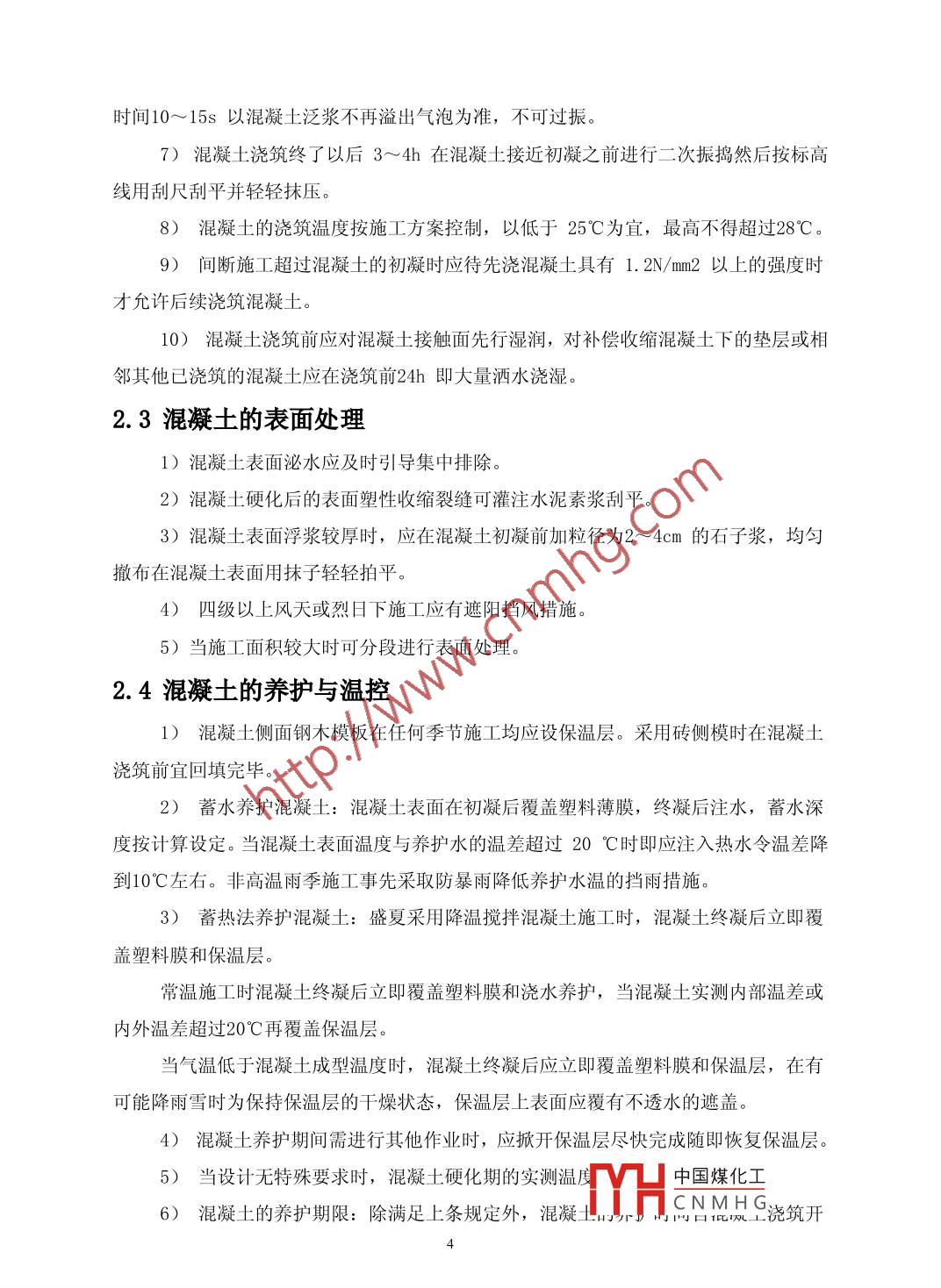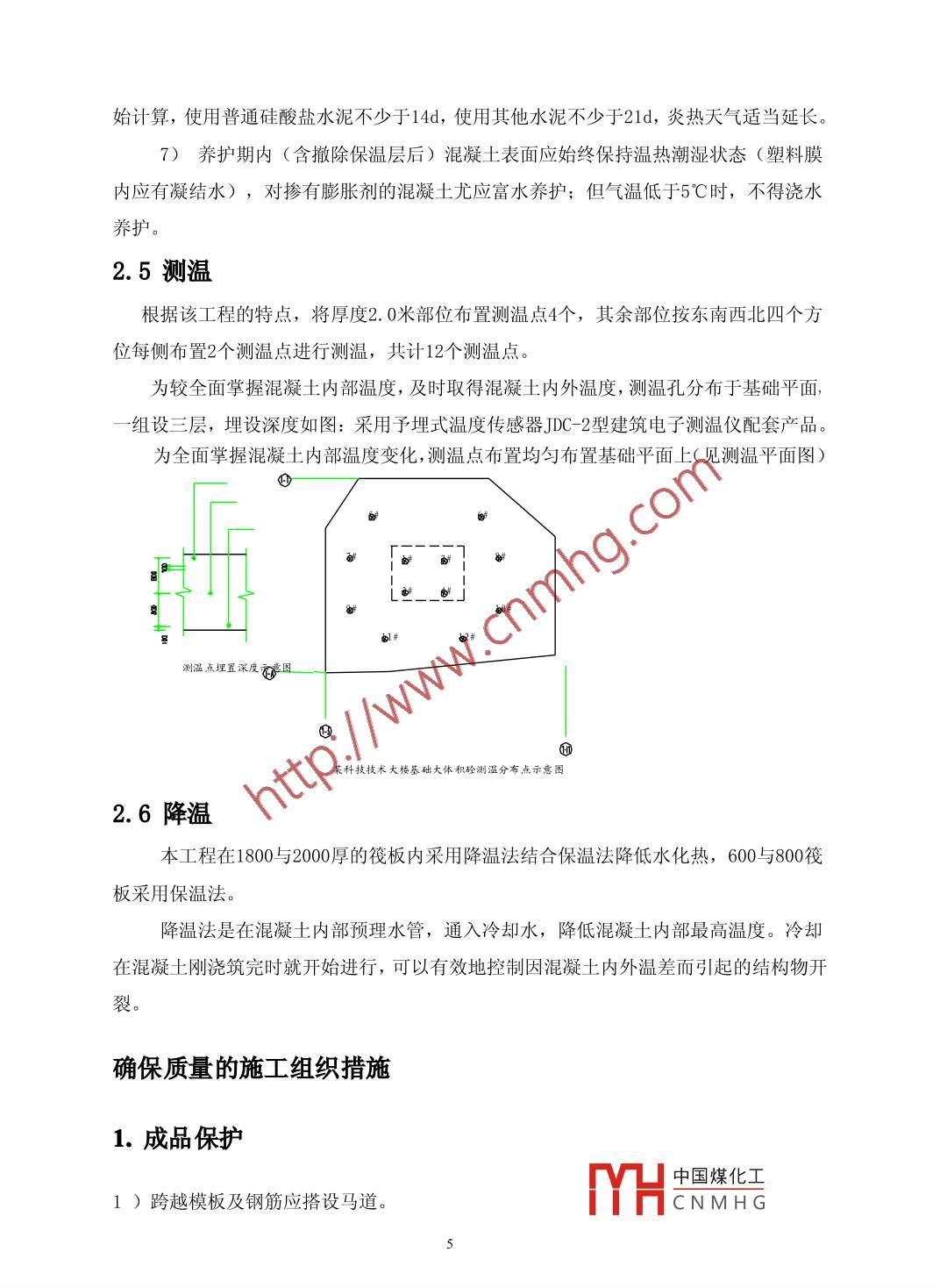 某科技技術(shù)大樓底板大體積砼工程施工方案劉雷陳潔山東省建設(shè)監(jiān)理咨詢有限公司250021摘要本文對(duì)某工程底板的大體積混凝士工程的施工內(nèi)容、工藝及確保工程質(zhì)量的施工組織措施進(jìn)行了較為詳細(xì)的總結(jié)。關(guān)鍵詞大體積混凝土澆筑混凝土養(yǎng)護(hù)混凝土裂縫處理工程概況某科技技術(shù)大樓為占地9690M*,建筑面積43409M,其中地上約26662M,地下約16717M。建筑層數(shù):地上14層,地下3層。建筑高度: 49. 7m。地下三、二層層高3.6m;地下一層至地上一層層高4.9m;地上二層層高4.8m;地上三層至頂層層高3.3m。施工方案(一)施工內(nèi)容:施工內(nèi)容包括:大體積砼的制作、運(yùn)輸、澆筑、測(cè)溫、降溫、養(yǎng)護(hù)等全部過程。因采用預(yù)拌商品砼,本方案重點(diǎn)指導(dǎo)大體積砼的澆筑、測(cè)溫、降溫、養(yǎng)護(hù)等過程。本工程底板砼根據(jù)設(shè)計(jì)后澆帶留設(shè)位置及區(qū)段劃分,暫分為六段施工,具體分段劃分如”下圖:中國(guó)煤化工YHCNMH G1第四邊就段(二)施工工藝2.1混凝土的場(chǎng)內(nèi)運(yùn)輸與布料采用固定泵(地泵)場(chǎng)內(nèi)運(yùn)輸與布料:①受料斗必須配備孔徑為50mm X 50mm的振動(dòng)篩防止個(gè)別大顆粒骨料流入泵管,料斗內(nèi)混凝土上表面距離上口宜為200mm左右以防止泵入空氣。②泵送混凝土前,先將儲(chǔ)料斗內(nèi)清水從管道泵出,以濕潤(rùn)和清潔管道,然后壓入純水泥漿或1: 1~1: 2水泥砂漿滑潤(rùn)管道后,再泵送混凝土。③開始?jí)核突炷習(xí)r速度宜慢,待混凝土送出管子端部時(shí),速度可逐漸加快,并轉(zhuǎn)入用正常速度進(jìn)行連續(xù)泵送。遇到運(yùn)轉(zhuǎn)不正常時(shí),可放慢泵送速度。進(jìn)行抽吸往復(fù)推動(dòng)數(shù)次,以防堵管。④泵送混凝土澆筑入模時(shí),端部軟管均勻移動(dòng),使每層布料均勻,不應(yīng)成堆澆筑。⑤泵管向下傾斜輸送混凝土?xí)r,應(yīng)在下斜管的下端設(shè)置相當(dāng)于5倍落差長(zhǎng)度的水平配管,若與上水平線傾斜度大于7。時(shí)應(yīng)在斜管上端設(shè)置排氣活塞。如因施工長(zhǎng)度有限,下斜管無法按上述要求長(zhǎng)度設(shè)置水平配管時(shí),可用彎管或軟管代替,但換算長(zhǎng)度仍應(yīng)滿足5倍落差的要求。⑥沿地面鋪管,每節(jié)管兩端應(yīng)墊50mmX100mm方木,以便拆裝;向下傾斜輸送時(shí),應(yīng)搭設(shè)寬度不小于1m的斜道,上鋪腳手板, 管兩端墊方木支承,泵管不應(yīng)直接鋪設(shè)在模板、鋼筋上,而應(yīng)擱置在馬凳或臨時(shí)搭設(shè)的架子上。中國(guó)煤化工HCNMH G,⑦泵送將結(jié)束時(shí),計(jì)算混凝土需要量,并通知攪拌站,"避無剩汞混蜒工過多。⑧混凝土泵送完畢,混凝土泵及管道可采用壓縮空氣推動(dòng)清洗球清洗,壓力不超過0.7MPa。方法是先安好專用清洗管,再啟動(dòng)空壓機(jī),漸漸加壓。清洗過程中隨時(shí)敲擊輸送管判斷混凝土是否接近排空。管道拆卸后按不同規(guī)格分類堆放備用。⑨泵送中途停歇時(shí)間不應(yīng)多于60min, 如超過60min 則應(yīng)清管。⑥泵管混凝士出口處,管端距模板應(yīng)大于500mm 。2.2混凝土澆筑1)混凝 土澆筑可根據(jù)面積大小和混凝土供應(yīng)能力采取全面分層、分段分層或斜面分層連續(xù)澆筑分層厚度300~500mm且不大于震動(dòng)棒長(zhǎng)1. 25倍。分段分層采取踏步式分層推進(jìn),- -般踏步寬為1. 5~2.5m。斜面分層澆灌每層厚30~35cm,坡度一般取1: 6~1: 7。正02r④.⑥分段分層全面分層斜面分層圖18.6.2底板混凝 土饒筑方式1-分層線; 2-新澆灌的混凝土; 3-一-澆灌方向2)澆筑混凝 土?xí)r間應(yīng)按下表控制。摻外加劑時(shí)由試驗(yàn)確定,但最長(zhǎng)不得大于初凝時(shí)間減90min?;炷翑嚢柚翝仓甑淖畲笱永m(xù)時(shí)間(min)氣溫砼強(qiáng)度≤25°C>25°C≤25 °C> 25"C≤C30120)0>C3090603)混凝土澆筑宜從低處開始,沿長(zhǎng)邊方向自一端向另-端推進(jìn),逐層上升。亦可采取中間向兩邊推進(jìn),保持混凝土沿基礎(chǔ)全高均勻上升。澆筑時(shí),要在下一-層混凝土初凝之前澆筑上- - 層混凝土,避免產(chǎn)生冷縫,并將表面泌水及時(shí)排走。4)局部厚度較大時(shí) 先澆深部混凝土,2~4h后再澆上部混凝土。5)振搗混凝土應(yīng)使用高頻振動(dòng)器,振動(dòng)器的插點(diǎn)間距為1.5倍振動(dòng)器的作用半徑,防止漏振。斜面推進(jìn)時(shí)振動(dòng)棒應(yīng)在坡腳與坡頂處插振中國(guó)煤化工MYHCNMHG6)振動(dòng)混凝 土?xí)r,振動(dòng)器應(yīng)均勻地插拔,插入下層仳處工oum左石,母點(diǎn)振動(dòng)時(shí)間10~15s以混凝土泛漿不再溢出氣泡為準(zhǔn),不可過振。7)混凝土澆筑終了以后3~4h在混凝土接近初凝之前進(jìn)行二次振搗然后按標(biāo)高線用刮尺刮平并輕輕抹壓。8)混凝 土的澆筑溫度按施工方案控制,以低于25°C為宜,最高不得超過28°C。9)間斷 施工超過混凝土的初凝時(shí)應(yīng)待先澆混凝土具有1. 2N/mm2以上的強(qiáng)度時(shí)才允許后續(xù)澆筑混凝土。10)混凝土澆筑前應(yīng)對(duì)混凝土接觸面先行濕潤(rùn),對(duì)補(bǔ)償收縮混凝土下的墊層或相鄰其他已澆筑的混凝土應(yīng)在澆筑前24h即大量灑水澆濕。2.3混凝土的表面處理1)混凝士表面泌水應(yīng)及時(shí)引導(dǎo)集中排除。2)混凝