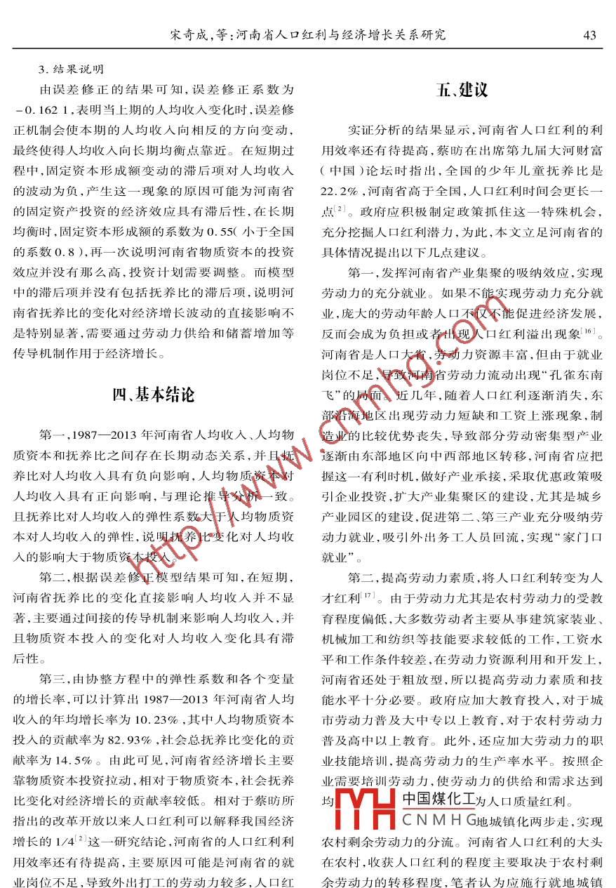 重慶理工大學(xué)學(xué)報(bào)(社會(huì)科學(xué))2016年第30卷第3期經(jīng)濟(jì)學(xué)Journal of Chongqing University of Technology( Social Science) Vol. 30 No. 32016doi: 10. 3969/j. issn. 1674- -8425( s ). 2016. 03. 007河南省人口紅利與經(jīng)濟(jì)增長關(guān)系研究宋奇成,張亞飛(重慶理工大學(xué)經(jīng)濟(jì)與貿(mào)易學(xué)院,重慶400054 )摘要:基于柯布-道格拉斯生產(chǎn)函數(shù)的理論推導(dǎo),建立人均收入、人均物質(zhì)資本和總撫養(yǎng)比三者的計(jì)量模型,利用1987--2013年的時(shí)間序列數(shù)據(jù),通過協(xié)整理論對計(jì)量模型進(jìn)行檢驗(yàn),研究河南省人口紅利與經(jīng)濟(jì)增長的關(guān)系。結(jié)果顯示:三者之間存在長期穩(wěn)定關(guān)系,在長期,總撫養(yǎng)比對人均收入具有負(fù)向影響,人均物質(zhì)資本對經(jīng)濟(jì)增長具有正向影響,并且總撫養(yǎng)比變化對人均收入的影響比物質(zhì)資本投入大;在短期,撫養(yǎng)比變化并未直接作用于經(jīng)濟(jì)增長,物質(zhì)資本的投入對經(jīng)濟(jì)增長的影響具有滯后性。關(guān)鍵詞:人口紅利;經(jīng)濟(jì)增長;總撫養(yǎng)比;協(xié)整理論中圖分類號:C92-05文獻(xiàn)標(biāo)識碼:A文章編號:1674 - 8425( 2016 )03 - 0038 -07Study on Relationship Between tDemographic Dividendand Economic Growth of Henan ProvinceSONG Qi-cheng, ZHANG Ya-fei( College of Economy & Trade, Chongqing University of Technology, Chongqing 400054,China )Abstract : The paper established the econometric model of per capita income , per capita physical cap-ital and total dependency ratio based on the theoretical derivation of Cobb-Douglas production functionto study on the relationship between the demographic dividend and economic growth in Henan prov-ince. Through the cointegration theory,we tested the measurement model by using the time series dataof 1987- -2013. The results show three variables have the long- term stability relationship. In the longterm,the total dependency ratio has negative impact on per capita income, and per capita physicalcapital has a positive impact on economic growth and the total dependency ratio on the impact of in-come per capita is larger than physical capital investment. In short term,the dependency ratio ’schanges has not significant contribution directly to economic growth and the physical capital invest-ment has lagged effect on economic growth.Key words: demographic dividend; economic growth; total dependency ratio; cointegration theory收稿日期:2014-12-29中國煤化工、2014244 )基金項(xiàng)目:重慶理I大學(xué)研究生創(chuàng)新基金項(xiàng)目“人才紅利效應(yīng)作者簡介:宋奇成( 1955- ),男,湖南常德人,教授,研究方向::fHCNMHG引用格式:宋奇成,張亞飛.河南省人口紅利與經(jīng)濟(jì)增長關(guān)系研究[ J].重慶理工大學(xué)學(xué)報(bào)(社會(huì)科學(xué)),2016( 3 ):38Citation format:SONG Qi-cheng, ZHANG Ya-fei. Study on Relationship Between tDemographic Dividend and EconomicGrowth of Henan Province[ J ]. Journal of Chongqing University of Technology( Social Science ), 2016( 3 ):38 -44.宋奇成,等:河南省人口紅利與經(jīng)濟(jì)增長關(guān)系研究39河南省作為人口大省,年齡結(jié)構(gòu)的轉(zhuǎn)變?yōu)槠淞|(zhì)量貢獻(xiàn)占10. 4%[7]。李魁從消費(fèi)、儲(chǔ)蓄、進(jìn)出.提供了人口紅利機(jī)遇期,2013年勞動(dòng)年齡人口占.口三個(gè)方面提出了年齡結(jié)構(gòu)變動(dòng)作用于經(jīng)濟(jì)增長總?cè)丝诘谋戎貫?3.9%,總撫養(yǎng)系數(shù)為43.2%,的“三條子傳導(dǎo)機(jī)制”,實(shí)證分析了年齡結(jié)構(gòu)變動(dòng)老年撫養(yǎng)系數(shù)為9.1%,按照國際統(tǒng)計(jì)標(biāo)準(zhǔn),目前.對消費(fèi)、儲(chǔ)蓄、進(jìn)出口的影響,得出,少兒撫養(yǎng)負(fù)擔(dān)河南省仍處于人口紅利期。由于河南省勞動(dòng)力供對儲(chǔ)蓄率的影響在10%的水平上顯著為負(fù),對消.給充足并且成本較低,勞動(dòng)力主要以輸出為主,年費(fèi)率存在顯著影響;老年贍養(yǎng)負(fù)擔(dān)對儲(chǔ)蓄率的影.齡結(jié)構(gòu)轉(zhuǎn)變下產(chǎn)生的人口紅利主要被東部地區(qū)吸響為正,老年贍養(yǎng)負(fù)擔(dān)對儲(chǔ)蓄率和消費(fèi)率的影響收,將少兒撫養(yǎng)負(fù)擔(dān)和老年贍養(yǎng)負(fù)擔(dān)留在本地。均不顯著;年齡結(jié)構(gòu)變動(dòng)對凈出口貢獻(xiàn)率的影響但是近幾年隨著我國人口紅利逐漸消失,東部沿主要表現(xiàn)為勞動(dòng)力負(fù)擔(dān)的減輕將促使經(jīng)常項(xiàng)目盈海地區(qū)出現(xiàn)勞動(dòng)力短缺和工資水平上漲,勞動(dòng)密.余8。何鶴雄實(shí)證分析了福建省年齡結(jié)構(gòu)變動(dòng)下集型制造業(yè)的比較優(yōu)勢正在喪失,產(chǎn)業(yè)也逐漸由的人口紅利通過勞動(dòng)力供給、人力資本、儲(chǔ)蓄、消東部沿海地區(qū)向中西部轉(zhuǎn)移[]。蔡昉在出席第九.費(fèi)對經(jīng)濟(jì)增長的影響程度,得出結(jié)論認(rèn)為撫養(yǎng)比.屆大河財(cái)富(中國)論壇時(shí)指出,與全國相比,河南的減輕對勞動(dòng)力供給具有促進(jìn)作用。相對于物質(zhì)省的人口紅利延長的時(shí)間可以更長-一些,河南省資本,人力資本的積累和撫養(yǎng)比的下降對經(jīng)濟(jì)增應(yīng)該抓住潛在人口紅利這一特殊機(jī)會(huì),通過改革長的促進(jìn)作用更大,并且老年比重和少兒比重的將人口紅利轉(zhuǎn)變?yōu)橹贫燃t利2。此外,2012年中上升會(hu