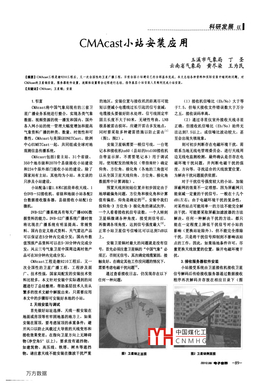 科研發(fā)展CMAcast小站安裝應(yīng)用溪市氣象局丁圣云南省氣象局黃盡染王為民【摘要】 CMAcast工程是繼9210工程后,又一次全國(guó)性的衛(wèi)星廣播工程。目前全國(guó)小站建設(shè)已經(jīng)全部基本憲成,本文總結(jié)各種資料和實(shí)際安裝中碰到的問(wèn)題,對(duì)CMacast的衛(wèi)星鍋安裝,服務(wù)器軟件設(shè)置,流媒體設(shè)置等全過(guò)程進(jìn)行總結(jié),指導(dǎo)基層小站安裝人員順利憲成小站安裝【關(guān)鍵詞】 CMAcast;衛(wèi)星鍋;安裝1.引言的地區(qū)。安裝位置與接收機(jī)的距離盡可能(1)接收機(jī)信噪比(Eb/No)大于等CMAcast將中國(guó)氣象局現(xiàn)有的三套衛(wèi)短以便減小電纜線過(guò)長(zhǎng)引起的信號(hào)衰減,于7.5,但每天接收文件錯(cuò)誤數(shù)大于萬(wàn)分星廣播業(yè)務(wù)系統(tǒng)進(jìn)行整合,實(shí)現(xiàn)各類氣象電纜接頭要做好防水處理。信號(hào)線固定牢之五,接收誤碼率高數(shù)據(jù)、視頻資源的統(tǒng)一播發(fā)和國(guó)內(nèi)、國(guó)外固且長(zhǎng)度不大于80米,無(wú)硬性彎曲。LNB(2)通過(guò)尋星儀室外接收天線尋星各入網(wǎng)小站的統(tǒng)一管理大幅度增加和提高極易被雷擊損壞,應(yīng)避開(kāi)雷擊多發(fā)地點(diǎn),正確,但接收機(jī)信噪比(Eb/No)始終無(wú)氣象資料廣播的種類、數(shù)量、時(shí)效性和可同時(shí)要采取多種避雷措施以防止雷擊1法達(dá)到7.5以上,或信噪比波動(dòng)較大,甚靠性, CMAcast與美國(guó) GEONETCast、歐洲(圖1,圖2)。至?xí)霈F(xiàn)失鎖現(xiàn)象。中心 EUMETCast一起,共同組成全球?qū)Φ匕惭b衛(wèi)星鍋需要一根信號(hào)線,一臺(tái)筆則可初步判斷存在電磁環(huán)境干擾,需觀測(cè)信息傳播系統(tǒng)記本和接收機(jī)hx60(縣站的htd100接收機(jī)聯(lián)系當(dāng)?shù)責(zé)o線電管理委員會(huì),進(jìn)行天線周CMAcast包括1套主站、31個(gè)省級(jí)、自帶顯示屏,不需要筆記本)用于調(diào)試邊無(wú)線電監(jiān)測(cè)檢測(cè),最終確認(rèn)是否存在電350個(gè)地市級(jí)和2070個(gè)縣級(jí)接收小站建設(shè)用。使用配發(fā)的傾角儀(帶指南針)確定磁環(huán)境干擾問(wèn)題,并判斷電磁干擾的強(qiáng)和234個(gè)原外部門接收小站的建設(shè)。除了仰角、方位角、極化角(各地的三角值可度、方向等,尋找適合的天線放置位置國(guó)家局有主站,其他均為小站,本文談的以從全國(guó)衛(wèi)星天線仰角、方位角、極化角為解決干擾問(wèn)題提供依據(jù)只涉及小站建設(shè)。數(shù)據(jù)庫(kù)中計(jì)算調(diào)取)。對(duì)于干擾信號(hào)強(qiáng)度較大的小站,加裝小站配備1套1.8米C波段單收天線、1預(yù)置天線到初始位置并初步固定由于屏蔽網(wǎng)的效果不一定理想,因?yàn)槠帘尉W(wǎng)只臺(tái)DVB-S2接收機(jī)、省級(jí)和地級(jí)小站各配2地球磁偏角問(wèn)題,方位角和極化角和計(jì)算能衰減一定量的干擾信號(hào),一般在十幾個(gè)臺(tái)數(shù)據(jù)接收服務(wù)器,縣級(jí)接收小站配1臺(tái)值有偏差,仰角是確定的2,安裝中我們dBi左右;由于電磁環(huán)境干擾的復(fù)雜性,按仰角》方位角-》極化角的調(diào)試次序,對(duì)某些站點(diǎn)可能用單一的方法不能完全解DVB-S2廣播系統(tǒng)具有每天廣播400G數(shù)一個(gè)人看著接收機(jī)信號(hào)讀數(shù),一個(gè)人轉(zhuǎn)到?jīng)Q干擾,可能要采取屏蔽加濾波器的方法據(jù)資料的能力。DVB-S2廣播系統(tǒng)廣播時(shí)效衛(wèi)星鍋微調(diào)各種角度,接受到信號(hào)后,解決。任何一種解決干擾的方法,都只將比現(xiàn)在廣播系統(tǒng)有明顯提高。常規(guī)資再微調(diào)各項(xiàng)角度,達(dá)到信號(hào)強(qiáng)度最大,能在一定程度上降低干擾信號(hào)對(duì)小站的料、國(guó)內(nèi)自定義格式資料、天氣雷達(dá)產(chǎn)品正常小站衛(wèi)星信號(hào)信噪比可以達(dá)到7dB以影響(更換站址除外),但不能完全排除可以保證在5分鐘內(nèi)完成分發(fā):國(guó)內(nèi)外數(shù)上。干擾,只是將干擾信號(hào)抑制到不影響該站值預(yù)報(bào)產(chǎn)品資料可以在5-30分鐘內(nèi)完成分安裝衛(wèi)星鍋時(shí)最大的問(wèn)題就是沒(méi)有信點(diǎn)的工作,因此,如果場(chǎng)地條件許可,盡發(fā):風(fēng)云三號(hào)氣象衛(wèi)星中國(guó)周邊高時(shí)效產(chǎn)號(hào),首先必須注意衛(wèi)星鍋的“中國(guó)氣象”必量更換天線放置的位置,躲開(kāi)電磁環(huán)境干品可在30分鐘內(nèi)完成分發(fā)須正,否則無(wú)信號(hào)。其次確定線纜緊固,接擾CMAcast工程是繼9210工程后,又一觸良好。在確定其他工作沒(méi)問(wèn)題的情況下,3.接收服務(wù)器軟件安裝次全國(guó)性的衛(wèi)星廣播工程,工程涉及面需要考慮電磁干擾問(wèn)題。小站接受系統(tǒng)由衛(wèi)星接收機(jī)接收衛(wèi)星廣、技術(shù)性強(qiáng),國(guó)家局配發(fā)的安裝技術(shù)資通過(guò)查看接收日志,仍發(fā)現(xiàn)存在以下信號(hào)解碼后傳給接收服務(wù)器通過(guò)數(shù)據(jù)接收料比較多,本文針對(duì)安裝中實(shí)際遇到的問(wèn)任何一種問(wèn)題程序再次解碼并存放在相應(yīng)目錄下(圖題進(jìn)行了總結(jié)整理,幫助基層技術(shù)人員從繁多的技術(shù)文獻(xiàn)中解脫出來(lái),只需要應(yīng)用本文