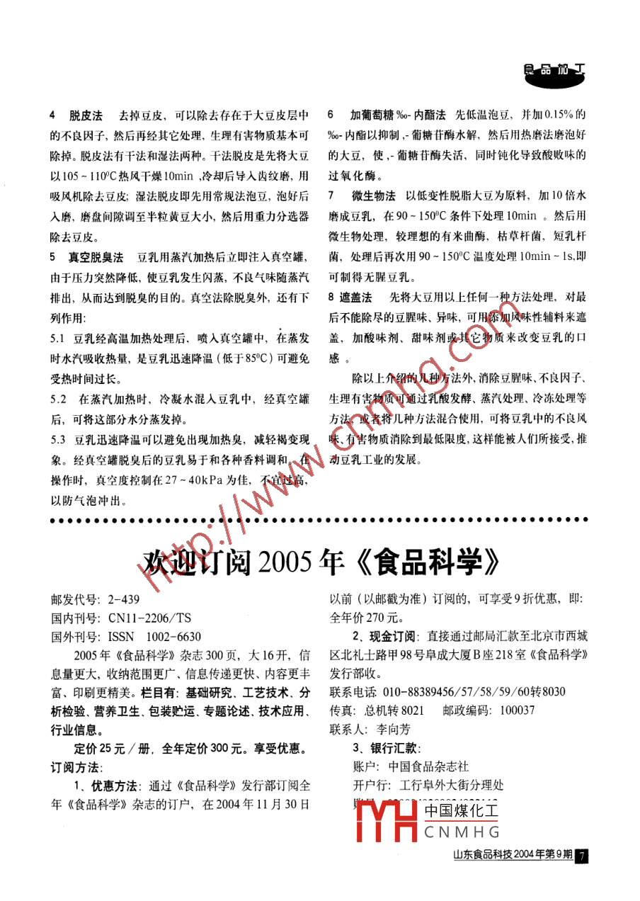 摘要因豆乳產(chǎn)生令人不快的腥味而不為更多人接受,匕本文介紹了幾種豆乳除腥方豆乳除腥工藝法,并指出也可通過乳酸發(fā)醇、蒸汽處理冷凍處理等王敏(紅寧省過中縣遼河化工廠紅中10方法除腥關(guān)鍵詞豆乳;除腥;方法蛋白質(zhì)是構(gòu)成人體組織的物質(zhì)基礎(chǔ),特別是兒氧化不飽和脂肪酸帶來的氣味,這是由于大豆中童、嬰兒成長更為需要。隨著社會發(fā)展,世界人口不所含的脂肪氧化酶在O2存在下催化不飽和脂肪酸形成斷增長,人類蛋白質(zhì)資源將進(jìn)一步緊張起來,因此,氧化物、它是大豆腥味的主要來源開發(fā)蛋白質(zhì),特別是植物蛋白質(zhì)源,具有重要意義。不揮發(fā)氣味組分這類物質(zhì)主要是酚酸、綠原酸大豆起源于我國,目前產(chǎn)量居世界之首。大豆是大豆磷脂酰膽堿等,為豆腥味和苦味的主要來源一種廉價的植物蛋白質(zhì)資源,從大豆的氨基酸組成和必此外,大豆中還含有胰蛋白酶抑制劑,血細(xì)胞激需氨基酸含量來看,它是唯一能替代動物蛋白質(zhì)的人類素,過敏因子,腸胃因子及促甲狀腺腫大因子等有害最理想營養(yǎng)佳品。其次,從目前市場來看,動物乳不能物質(zhì)。這些形成不良?xì)馕兜奈镔|(zhì)和有害物質(zhì)必須除滿足人們生活日益改善的需求,故開發(fā)大豆資源尋找動去。處理方法有熱水磨豆法、浸泡發(fā)芽法、堿水浸泡物乳的代用品是當(dāng)務(wù)之急大豆食品最典型的特點就是法、脫皮法、遮蓋法、真空脫臭法等,現(xiàn)分述如下。蛋白質(zhì)含量高,即使普通豆?jié){中蛋白質(zhì)含量也高于牛1熱磨法即泡豆后,用80-100℃c的熱水磨漿使脂肪大豆蛋白質(zhì)無論從營養(yǎng)價值,還是資源潛在能力及氧化酶鈍化從面防止油脂氧化產(chǎn)生豆腥味。在磨前加工技術(shù)前景來說,都是最安全,最經(jīng)濟(jì)和最有發(fā)展前般進(jìn)行熱燙即在90℃左右水中保持3-5m或在磨前途的蛋白質(zhì)資源。通入100℃蒸汽,保持幾分鐘但要適度,防止蛋白質(zhì)變近年來,豆乳之所以不能為更多的人接受,其主性。磨后豆乳要過80-100目篩,并煮沸。要原因是豆乳有令人不快的豆腥味、苦味、澀味,而豆2浸泡發(fā)芽法大豆室溫下浸泡8h,置于30-35℃乳在我國一直發(fā)展不快。但豆乳中不含膽固醇,而亞油恒溫箱發(fā)芽,每6h灑水一次,3d后待芽長20mm左右酸含量高,對老年人心血管病有一定療效,加上含有豐磨成豆乳,并過膠體磨后用100目篩濾漿,加熱到100富的維生素E和磷脂能促進(jìn)人體激素的分泌,有延緩衰℃,保溫5min或者在發(fā)芽后將發(fā)芽大豆浸入氫氧化鈉老和增加記憶力的功能。此外,豆乳中還有Ca、Zn、槽浸泡4,去皮,再送入過氧化氫槽洗滌然后用弱酸Fe等多種礦物質(zhì)和微量元素,又是堿性食品,可中和中和殘留在大豆中的物質(zhì),中和后清水洗滌最后碾磨肉類、米飯等酸性食品,對調(diào)節(jié)體內(nèi)平衡保持人體健康煮沸發(fā)芽法可改良大豆的維生素將大量豆臭味除去,都是十分重要的。為了改善豆乳的不良風(fēng)味,使人們接過氧化氫也起著除異味作用。受這種蛋白質(zhì)飲料,現(xiàn)將大豆不良?xì)馕兜膩碓醇皫追N圖3堿水浸泡法用01%-0.NaOH或 NaHcO3溶液浸除腥味、苦味、澀味的方法介紹如下泡過夜,瀝干,用100C、0.5%NaOH或 Nahco液燙大豆大豆中的不良?xì)馕吨饕扇愇镔|(zhì)構(gòu)成30min后,常溫磨漿,然后調(diào)pH到7。此法可防止產(chǎn)生揮發(fā)性組分,主要包括正已醛、異戊醛及正庚豆腥味,減少浸泡時間,提高均質(zhì)效果改善豆乳風(fēng)味,醛,這些物質(zhì)是大豆青臭味的主要來源這中國煤化工CNMHG山東食品科技204年第9期4脫皮法去掉豆皮,可以除去存在于大豆皮層中6加葡萄糖‰內(nèi)酯法先低溫泡豆,并加0.15%的的不良因子,然后再經(jīng)其它處理,生理有害物質(zhì)基本可‰o-內(nèi)酯以抑制,葡糖苷酶水解,然后用熱磨法磨泡好除掉。脫皮法有干法和濕法兩種。干法脫皮是先將大豆的大豆,使,葡糖苷酶失活,同時鈍化導(dǎo)致酸敗味的以105-10C熱風(fēng)干燥10min,冷卻后導(dǎo)入齒紋磨,用過氧化酶吸風(fēng)機(jī)除去豆皮;濕法脫皮即先用常規(guī)法泡豆,泡好后7微生物法以低變性脫脂大豆為原料,加10倍水入磨,磨盤間隙調(diào)至半粒黃豆大小,然后用重力分選器磨成豆乳,在90-150C條件下處理lmin。然后用除去豆皮。微生物處理,較理想的有米曲酶,枯草桿菌,短乳桿5真空脫臭法豆乳用蒸汽加熱后立即注入真空罐,菌,處理后再次用90~150°C溫度處理10min-ls即由于壓力突然降低,使豆乳發(fā)生閃蒸,不良?xì)馕峨S蒸汽可制得無腥豆乳排出,從而達(dá)到脫臭的目的。真空法除脫臭外,還有下8遮蓋法先將大豆用以上任何一種方法處理,對最列作用后不能除盡的豆腥味、異味,可用添加風(fēng)味性輔料來遮5.1豆乳經(jīng)高溫加熱處理后、噴入真空罐中,在蒸發(fā)蓋,加酸味劑、甜味劑或其它物質(zhì)來改變豆乳的口時水汽吸收熱量,是豆乳迅速降溫(低于85C)可避免感受熱時間過長。除以上介紹的幾種方法外,消除豆腥味、不良因子5.2在蒸汽加熱時,冷凝水混入豆乳中,經(jīng)真空罐生理有害物質(zhì)可通過乳酸發(fā)酵、蒸汽處理、冷凍處理等后,可將這部分水分蒸發(fā)掉方法,或者將幾種方法混合使用,可將豆乳中的不良風(fēng)5.3豆乳迅速降溫可以避免出現(xiàn)加