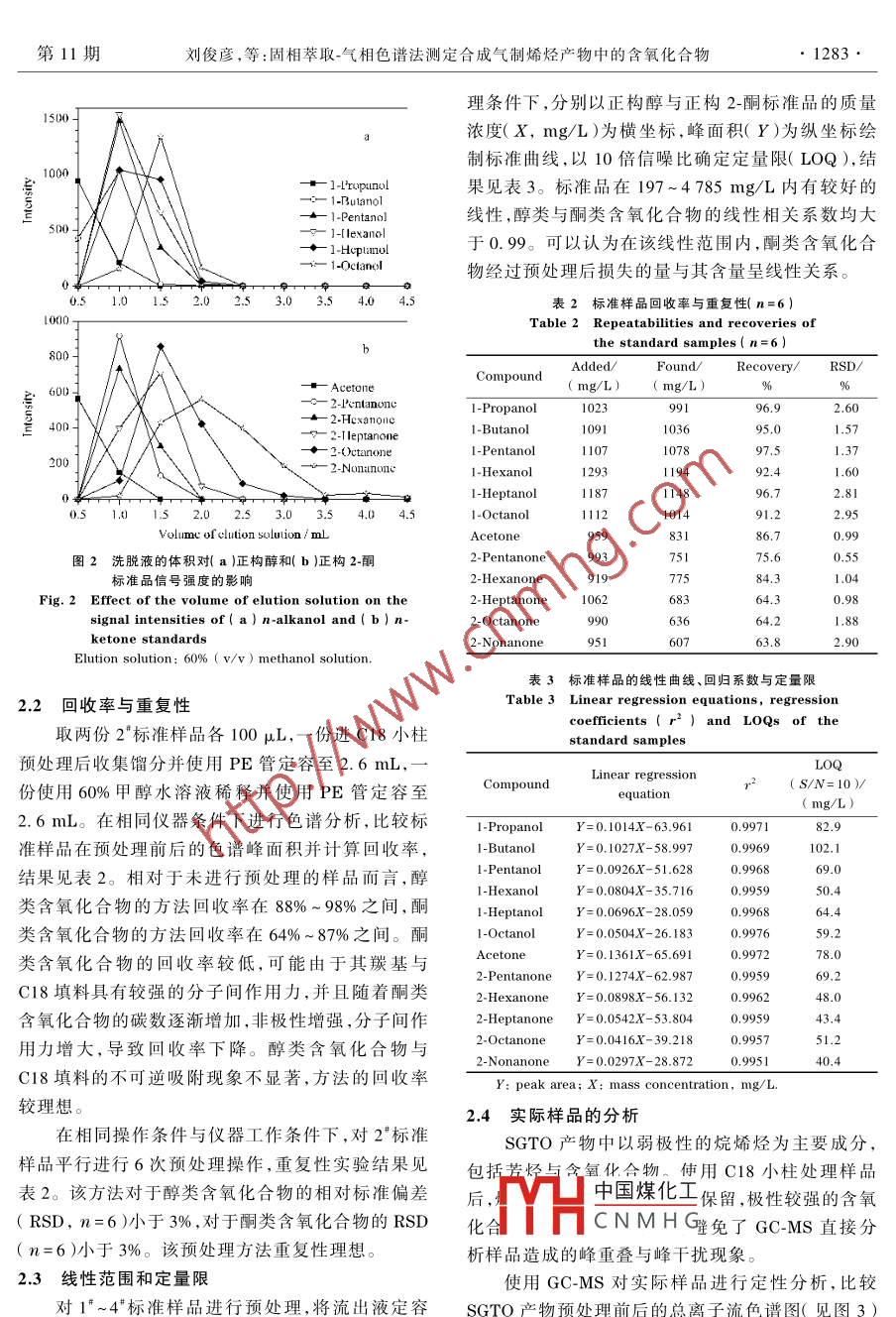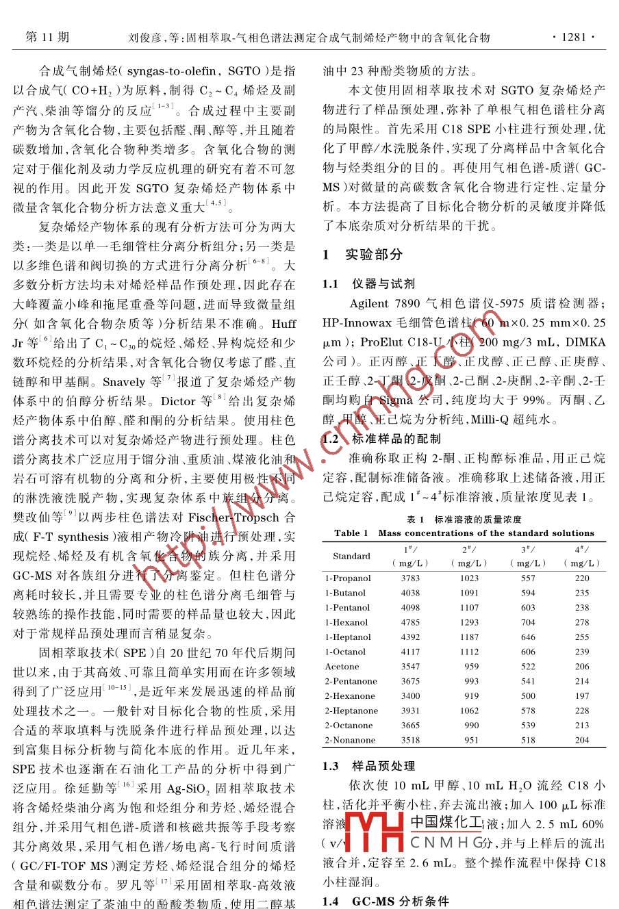 2014年11月語VoL 32 No11November 2014Chinese journal of Chromatography1280~1285技術(shù)與應(yīng)用DOI:10.3724/SPJ.1123.2014.06043固相萃取氣相色譜法測(cè)定合成氣制烯烴產(chǎn)物中的含氧化合物劉俊彥‘,田文卿,李繼文,王川,顧松園(上海石油化工研究院表征分析部,上海201208)摘要:采用C18固相萃取技術(shù)對(duì)合成氣制烯烴(SGTO)的產(chǎn)物進(jìn)行預(yù)處理,將產(chǎn)物分離為含氧化合物與烴類,采用氣相色譜-質(zhì)譜法(GC-MS)考察分離效果并鑒定產(chǎn)物中的含氧化合物,使用氫焰離子化檢測(cè)(FID)定量實(shí)際樣品中的含氧化合物,使用其正構(gòu)2-酮、正構(gòu)醇的響應(yīng)因子作為同碳數(shù)酮、醇的FID響應(yīng)因子。優(yōu)化C18小柱洗脫條件,使用標(biāo)準(zhǔn)樣品比較預(yù)處理前后的方法回收率。醇類標(biāo)準(zhǔn)品回收率為88%~98%,酮類標(biāo)準(zhǔn)品回收率為64%87%。在197~4785mg/L范圍內(nèi),標(biāo)準(zhǔn)品具有較好的線性關(guān)系,相關(guān)系數(shù)均大于0.99。定性并定量測(cè)定了SGTO產(chǎn)物中的67種含氧化合物,發(fā)現(xiàn)正構(gòu)醇、正構(gòu)2-酮為SGTO產(chǎn)物中的主要含氧化合物,同時(shí)存在少量其他異構(gòu)體。該方法操作簡單、快速、樣品需求量小,并能夠在10min內(nèi)完成樣品的預(yù)處理。分析結(jié)果為SGTO工藝催化劑、動(dòng)力學(xué)深入研究提供了必要的基礎(chǔ)數(shù)據(jù)關(guān)鍵詞:固相萃取;氣相色譜;質(zhì)譜;氫焰離子化檢測(cè);含氧化合物;合成氣制烯烴中圖分類號(hào):0658文獻(xiàn)標(biāo)識(shí)碼:A文章編號(hào):1000-8713(2014)11-1280-06Determination of oxygenates in syngas-to-olefin productsby solid phase extraction combined with gaschromatography-mass spectrometryLIU Junyan, TIAN Wenqing, LI Jiwen, WANG Chuan, GU SongyuanCharacterization Analysis Department, Sinopec Shanghai Research Institute ofPetrochemical Technology, Shanghai 201208, ChinaAbstract: The syngas-to-olefin( SGTo)products mainly consist of hydrocarbons along withsmall amounts of oxygenates as the byproducts. A C18 solid-phase extraction( SPE )columnwas used for oxygenates enrichment in SGTo products. As the hydrophobic compoundshydrocarbons had stronger interaction with a c18 SPE column than oxygenates. Under the optimized elution conditions, the oxygenates were first eluted from the c18 SPE column with 60%(v/v)methanol solution. The fraction of oxygenates was then analyzed with gas chromatography-mass spectrometry( GC-MS )for qualification and gas chromatography-hydrogen flame ion-ization detection GC-FID for quantification. The FID response factors of n-alkanol and nketone were used for alkanols and ketones quantitative calculation and the method recotwere 88%-98% and 64%-87% respectively In the range of 197-4785 mg/L, good linear relationships of the FID responses with the corresponding mass concentrations of the standard samples were obtained with the linear regression coefficients greater than 0. 99. Sixty-seven oxygenates were analyzed qualitatively and quantitatively. The results showed that the fraction of theoxygenates mainly consists of alkanols and ketones. The total content of the oxygenates inSGTO products was 6. 2%. The enrichment method only requires a very small amount of sampleand the total process can be completed within 10 min. The analysis results of SgTo productstudies can provide the necessary basic data for SGTO中國煤化工 tudKey words: solid-phase extraction( SPE ) gas chrCNMHGass spectrometryMS ); hydrogen flame ionization detection( FID ) oxygenate; syngas-to-olefin*通訊聯(lián)系人Tel:(021)68462197-6304,E-mail:liuiy.sshy@Sinopec.com收稿日期:2014-0628第11期劉俊彥,等:固相萃取-氣相色譜法測(cè)定合成氣制烯烴產(chǎn)物中的含氧化合物1281合成氣制烯烴( syngas-to- olefin,SGTO)是指油中23種酚類物質(zhì)的方法以合成氣(CO+H2)為原料,制得C2~C4烯烴及副本文使用固相萃取技術(shù)對(duì)SGTO復(fù)雜烯烴產(chǎn)產(chǎn)汽、柴油等餾分的反應(yīng)3。合成過程中主要副物進(jìn)行了樣品預(yù)處理,彌補(bǔ)了單根氣相色譜柱分離產(chǎn)物為含氧化合物,主要包括醛、酮、醇等,并且隨著的局限性。首先采用C18SPE小柱進(jìn)行預(yù)處理,優(yōu)碳數(shù)增加,含氧化合物種類增多。含氧化合物的測(cè)化了甲醇/水洗脫條件,實(shí)現(xiàn)了分離樣品中含氧化合定對(duì)于催化劑及動(dòng)力學(xué)反應(yīng)機(jī)理的研究有著不可忽物與烴類組分的目的。再使用氣相色譜-質(zhì)譜(GC-視的作用。因此開發(fā)SGTO復(fù)雜烯烴產(chǎn)物體系中MS)對(duì)微量的高碳數(shù)含氧化合物進(jìn)行定性、定量分微量含氧化合物分析方法意義重大5。析。本方法提高了目標(biāo)化合物分析的靈敏度并降低復(fù)雜烯烴產(chǎn)物體系的現(xiàn)有分析方法可分為兩大了本底雜質(zhì)對(duì)分析結(jié)果的干擾。類:一類是以單一毛細(xì)管柱分離分析組分;另一類是以多維色譜和閥切換的方式進(jìn)行分離分析大1實(shí)驗(yàn)部分多數(shù)分析方法均未對(duì)烯烴樣品作預(yù)處理,因此存在1.1儀器與試劑大峰覆蓋小峰和拖尾重疊等問題,進(jìn)而導(dǎo)致微量組Agilent7890氣相色譜儀-5975質(zhì)譜檢測(cè)器分(如含氧化合物雜質(zhì)等)分析結(jié)果不準(zhǔn)確。 Huff HP- Innowax毛細(xì)管色譜柱(60mx0.25mm×0.25Jr等給出了C1~C3的烷烴、烯烴、異構(gòu)烷烴和少μm); ProElut cl8-U小柱(200mng/3mL, DIMKA數(shù)環(huán)烷烴的分析結(jié)果,對(duì)含氧化合物僅考慮了醛、直公司)。