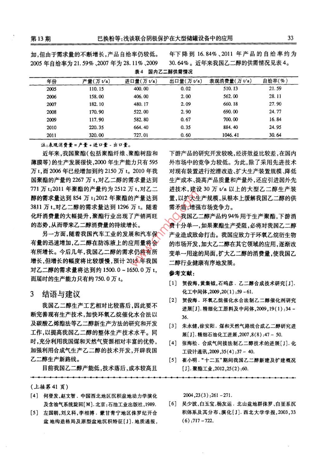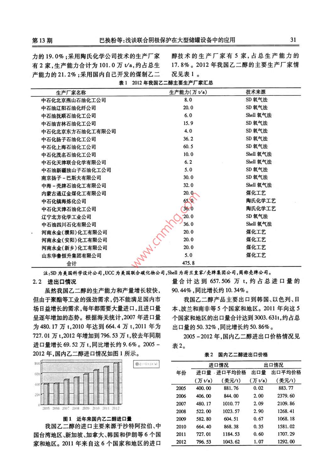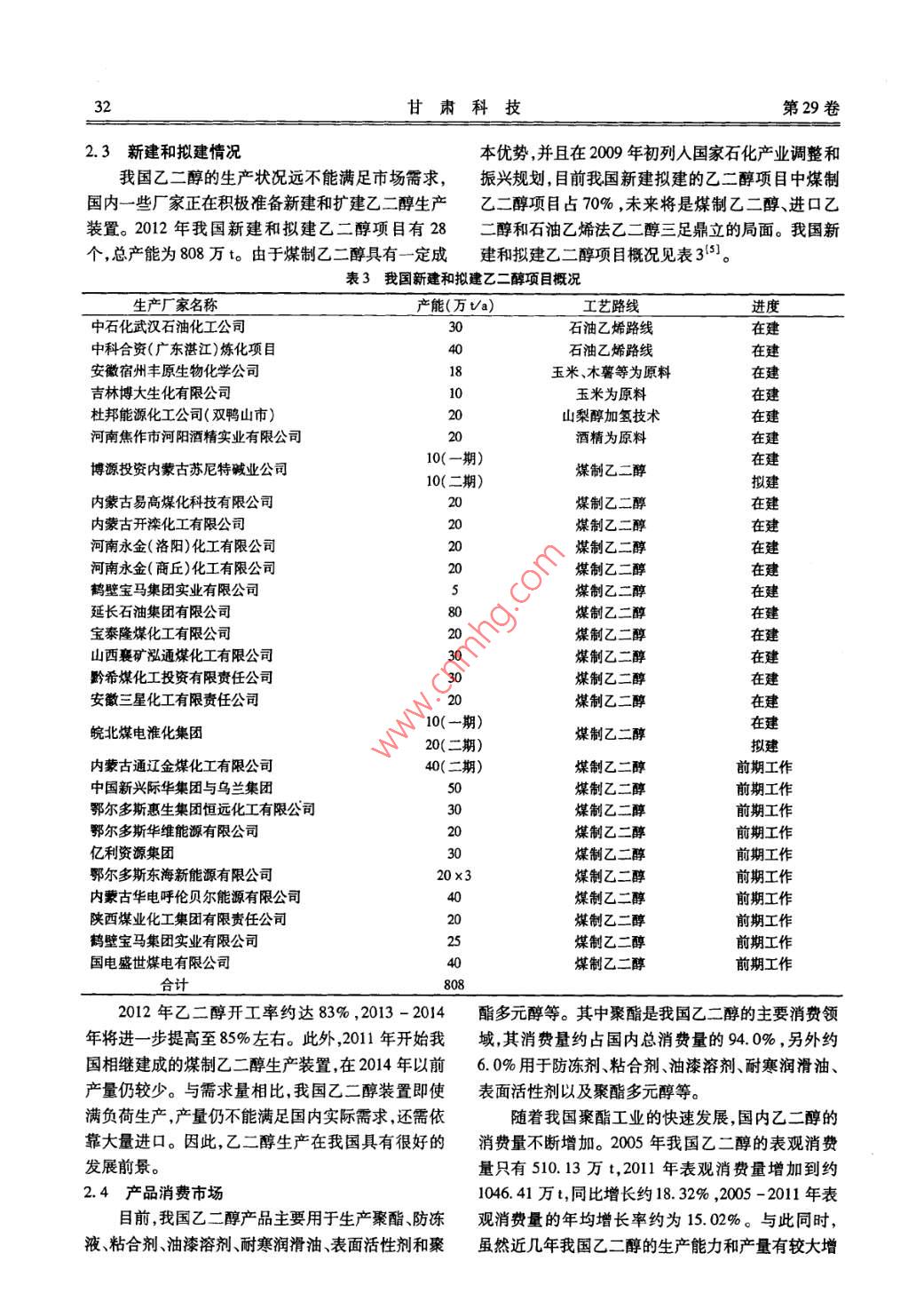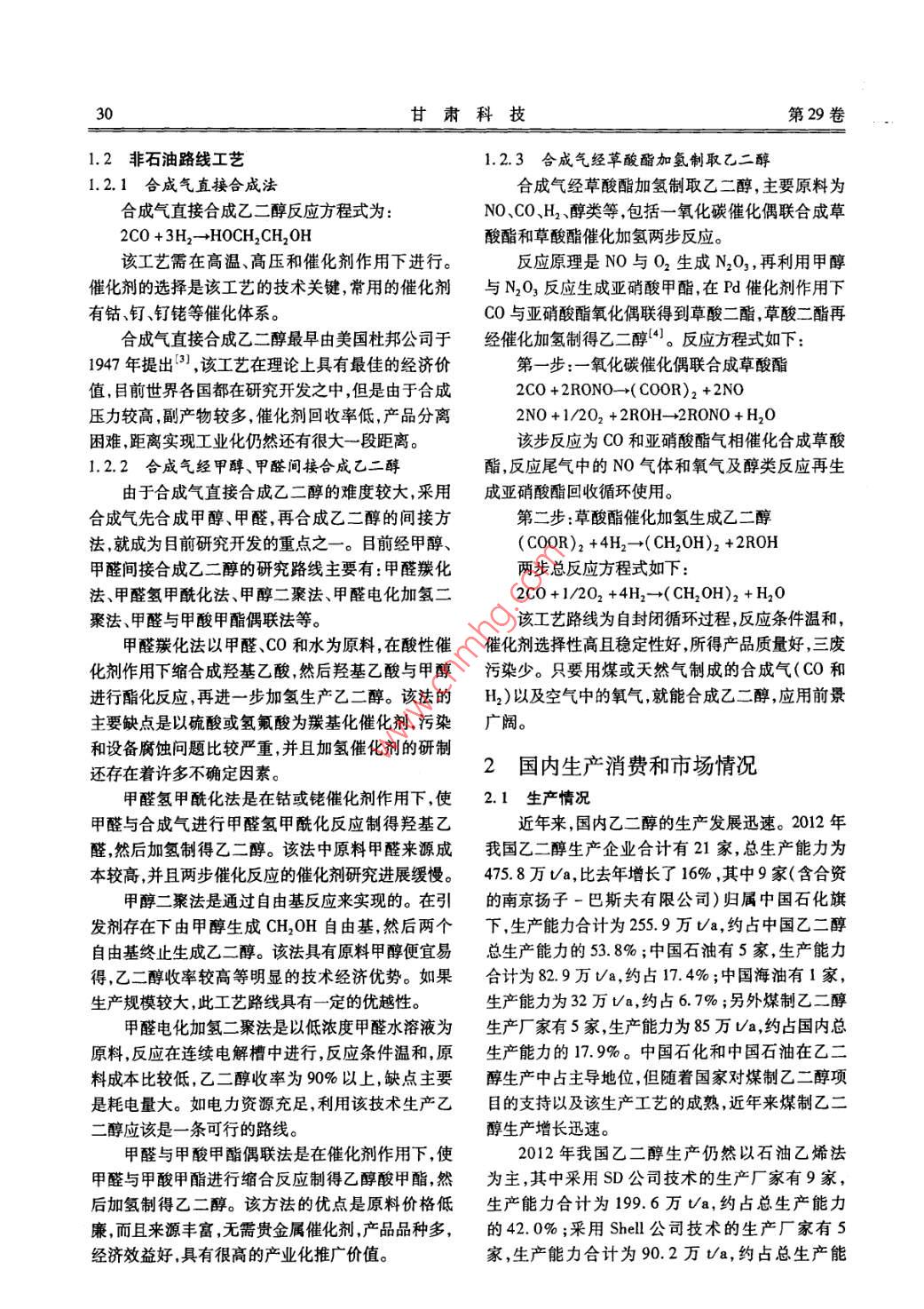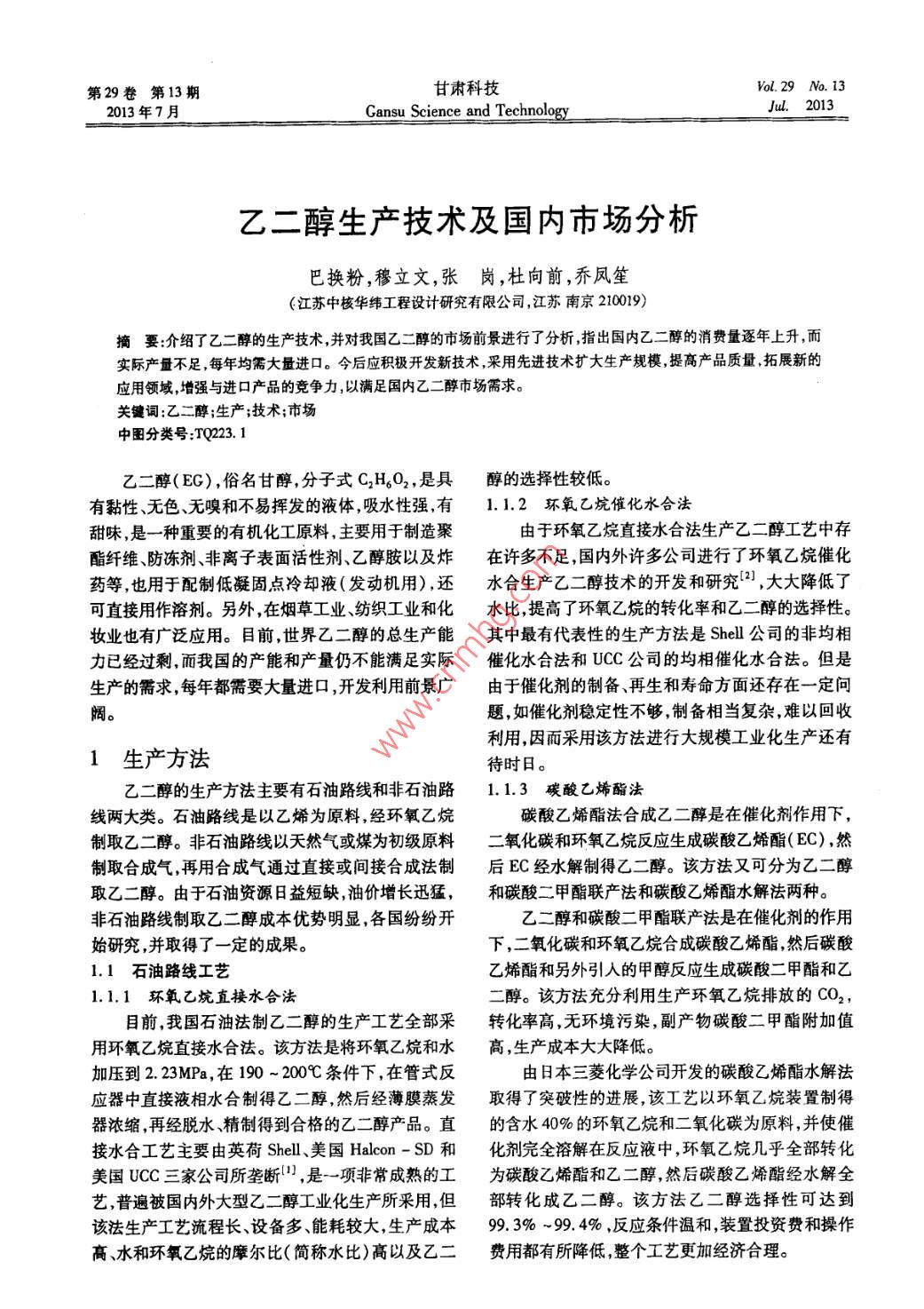 第29卷第13期甘肅科技vol 29 No. 132013年7月Gansu Science and TechnologJ.2013乙二醇生產(chǎn)技術(shù)及國內(nèi)市場分析巴換粉,穆立文,張崗,杜向前,喬鳳笙(江蘇中核華緯工程設(shè)計研究有限公司,江蘇南京210019)摘要:介紹了乙二醇的生產(chǎn)技術(shù),并對我國乙二醇的市場前景進(jìn)行了分析指出國內(nèi)乙二醇的消費量逐年上升,而實際產(chǎn)量不足,每年均需大量進(jìn)口。今后應(yīng)積極開發(fā)新技術(shù),采用先進(jìn)技術(shù)擴(kuò)大生產(chǎn)規(guī)模,提高產(chǎn)品質(zhì)量拓展新的應(yīng)用領(lǐng)域增強(qiáng)與進(jìn)口產(chǎn)品的競爭力以滿足國內(nèi)乙二醇市場需求。關(guān)鍵詞:乙二醇;生產(chǎn);技術(shù);市場中圖分類號:TQ223.1乙二醇(EG),俗名甘醇,分子式C2HO2,是具醇的選擇性較低。有黏性、無色、無嗅和不易揮發(fā)的液體吸水性強(qiáng),有1.1.2環(huán)氧乙烷催化水合法甜味是一種重要的有機(jī)化工原料,主要用于制造聚由于環(huán)氧乙烷直接水合法生產(chǎn)乙二醇工藝中存酯纖維、防凍劑、非離子表面活性劑、乙醇胺以及炸在許多不足,國內(nèi)外許多公司進(jìn)行了環(huán)氧乙烷催化藥等,也用于配制低凝固點冷卻液(發(fā)動機(jī)用),還水合生產(chǎn)乙二醇技術(shù)的開發(fā)和研究),大大降低了可直接用作溶劑。另外,在煙草工業(yè)、紡織工業(yè)和化水比,提高了環(huán)氧乙烷的轉(zhuǎn)化率和乙二醇的選擇性。妝業(yè)也有廣泛應(yīng)用。目前,世界乙二醇的總生產(chǎn)能其中最有代表性的生產(chǎn)方法是Shel公司的非均相力已經(jīng)過剩,而我國的產(chǎn)能和產(chǎn)量仍不能滿足實際催化水合法和UCC公司的均相催化水合法。但是生產(chǎn)的需求,每年都需要大量進(jìn)口,開發(fā)利用前景廣由于催化劑的制備、再生和壽命方面還存在一定問闊題,如催化劑穩(wěn)定性不夠制備相當(dāng)復(fù)雜,難以回收利用,因而采用該方法進(jìn)行大規(guī)模工業(yè)化生產(chǎn)還有生產(chǎn)方法待時日。乙二醇的生產(chǎn)方法主要有石油路線和非石油路1.1.3碳酸乙烯酯法線兩大類。石油路線是以乙烯為原料,經(jīng)環(huán)氧乙烷碳酸乙烯酯法合成乙二醇是在催化劑作用下制取乙二醇。非石油路線以天然氣或煤為初級原料二氧化碳和環(huán)氧乙烷反應(yīng)生成碳酸乙烯酯(EC),然制取合成氣,再用合成氣通過直接或間接合成法制后EC經(jīng)水解制得乙二醇。該方法又可分為乙二醇取乙二醇。由于石油資源日益短缺油價增長迅猛,和碳酸二甲酯聯(lián)產(chǎn)法和碳酸乙烯酯水解法兩種。非石油路線制取乙二醇成本優(yōu)勢明顯,各國紛紛開乙二醇和碳酸二甲酯聯(lián)產(chǎn)法是在催化劑的作用始研究,并取得了一定的成果。下,二氧化碳和環(huán)氧乙烷合成碳酸乙烯酯然后碳酸1.1石油路線工藝乙烯酯和另外引入的甲醇反應(yīng)生成碳酸二甲酯和乙1.1.1環(huán)氧乙烷直接水合法二醇。該方法充分利用生產(chǎn)環(huán)氧乙烷排放的CO2,目前,我國石油法制乙二醇的生產(chǎn)工藝全部采轉(zhuǎn)化率高,無環(huán)境污染,副產(chǎn)物碳酸二甲酯附加值用環(huán)氧乙烷直接水合法。該方法是將環(huán)氧乙烷和水高,生產(chǎn)成本大大降低。加壓到223MPa,在190~200℃條件下,在管式反由日本三菱化學(xué)公司開發(fā)的碳酸乙烯酯水解法應(yīng)器中直接液相水合制得乙二醇,然后經(jīng)薄膜蒸發(fā)取得了突破性的進(jìn)展,該工藝以環(huán)氧乙烷裝置制得器濃縮,再經(jīng)脫水、精制得到合格的乙二醇產(chǎn)品。直的含水40%的環(huán)氧乙烷和二氧化碳為原料,并使催接水合工藝主要由英荷 Shell美國Hlon-SD和化劑完全溶解在反應(yīng)液中,環(huán)氧乙烷幾乎全部轉(zhuǎn)化美國UCC三家公司所壟斷,是一項非常成熟的工為碳酸乙烯酯和乙二醇然后碳酸乙烯酯經(jīng)水解全藝,普遍被國內(nèi)外大型乙二醇工業(yè)化生產(chǎn)所釆用,但部轉(zhuǎn)化成乙二醇。該方法乙二醇選擇性可達(dá)到該法生產(chǎn)工藝流程長、設(shè)備多、能耗較大,生產(chǎn)成本99.3%-9.4%,反應(yīng)條件溫和裝置投資費和操作高、水和環(huán)氧乙烷的摩爾比(簡稱水比)高以及乙二費用都有所降低,整個工藝更加經(jīng)濟(jì)合理。甘肅科技第29卷1.2非石油路線工藝1.2.3合成氣經(jīng)草酸酯加氫制取乙二醇1.2.1合成氣直接合成法合成氣經(jīng)草酸酯加氫制取乙二醇,主要原料為合成氣直接合成乙二醇反應(yīng)方程式為:NO、CO、H2、醇類等,包括一氧化碳催化偶聯(lián)合成草2C0+3H2→HOCH2CH,OH酸酯和草酸酯催化加氫兩步反應(yīng)。該工藝需在高溫、高壓和催化劑作用下進(jìn)行。反應(yīng)原理是NO與O2生成N2O3,再利用甲醇催化劑的選擇是該工藝的技術(shù)關(guān)鍵,常用的催化劑與N2O3反應(yīng)生成亞硝酸甲酯在Pd催化劑作用下有鈷釕、釕銠等催化體系。CO與亞硝酸酯氧化偶聯(lián)得到草酸二酯,草酸二酯再合成氣直接合成乙二醇最早由美國杜邦公司于經(jīng)催化加氫制得乙二醇4。反應(yīng)方程式如下1947年提出3,該工藝在理論上具有最佳的經(jīng)濟(jì)價第一步:一氧化碳催化偶聯(lián)合成草酸酯值,目前世界各國都在研究開發(fā)之中,但是由于合成2C0 +2RONO-( COOR)2+ 2NO壓力較高,副產(chǎn)物較多,催化劑回收率低,產(chǎn)品分離