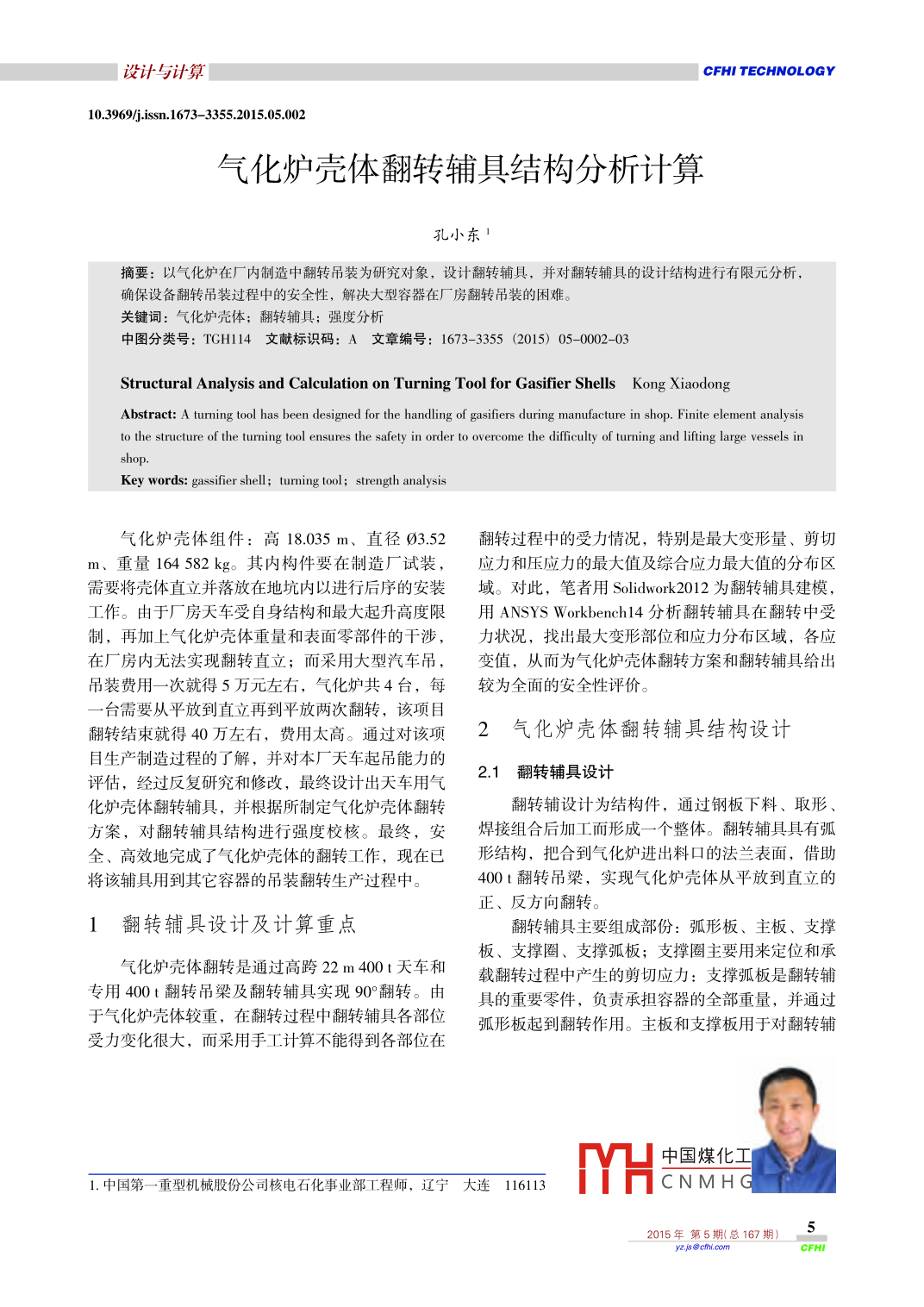 設(shè)計(jì)與計(jì)算CFHI TECHNOLOGY10.396/j.ssn.1673- 3355.2015.05.002氣化爐殼體翻轉(zhuǎn)輔具結(jié)構(gòu)分析計(jì)算孔小東'摘要:以氣化爐在廠內(nèi)制造中翻轉(zhuǎn)吊裝為研究對象,設(shè)計(jì)翻轉(zhuǎn)輔具,并對翻轉(zhuǎn)輔具的設(shè)計(jì)結(jié)構(gòu)進(jìn)行有限元分析,確保設(shè)備翻轉(zhuǎn)吊裝過程中的安全性,解決大型容器在廠房翻轉(zhuǎn)吊裝的困難。關(guān)鍵詞:氣化爐殼體;翻轉(zhuǎn)輔具;強(qiáng)度分析中圖分類號: TCHII4 文獻(xiàn)標(biāo)識碼: A文章編號: 1673-3355 (2015) 05-0002-03Structural Analysis and Calculation on Turning Tool for Gasifier Shells Kong XiaodongAbstract: A turming tool has been designed for the handling of gasifiers during manufacture in shop. Finite element analysisto the structure of the turning tool ensures the safety in order to overcome the difculty of turning and lifting large vessels inshop.Key words: gassifer shell; turning tool; strength analysis氣化爐殼體組件:高18.035 m、直徑03.52翻轉(zhuǎn)過程中的受力情況,特別是最大變形量、剪切m、重量164582kg。其內(nèi)構(gòu)件要在制造廠試裝,應(yīng)力和壓應(yīng)力的最大值及綜合應(yīng)力最大值的分布區(qū)需要將殼體直立并落放在地坑內(nèi)以進(jìn)行后序的安裝域。對此,筆者用Solidwork2012為翻轉(zhuǎn)輔具建模,工作。由于廠房天車受自身結(jié)構(gòu)和最大起升高度限用ANSYS Workbench14分析翻轉(zhuǎn)輔具在翻轉(zhuǎn)中受制,再加上氣化爐殼體重量和表面零部件的干涉,力狀況,找出最大變形部位和應(yīng)力分布區(qū)域,各應(yīng)在廠房內(nèi)無法實(shí)現(xiàn)翻轉(zhuǎn)直立;而采用大型汽車吊,變值,從而為氣化爐殼體翻轉(zhuǎn)方案和翻轉(zhuǎn)輔具給出吊裝費(fèi)用一次就得5萬元左右,氣化爐共4臺,每較為全面的安全性評價(jià)。-臺需要從平放到直立再到平放兩次翻轉(zhuǎn),該項(xiàng)目翻轉(zhuǎn)結(jié)束就得40萬左右,費(fèi)用太高。通過對該項(xiàng)2氣化爐殼體翻轉(zhuǎn)輔具結(jié)構(gòu)設(shè)計(jì)目生產(chǎn)制造過程的了解,并對本廠-天車起吊能力的2.1 翻轉(zhuǎn)輔具設(shè)計(jì)評估,經(jīng)過反復(fù)研究和修改,最終設(shè)計(jì)出天車用氣化爐殼體翻轉(zhuǎn)輔具,并根據(jù)所制定氣化爐殼體翻轉(zhuǎn)翻轉(zhuǎn)輔設(shè)計(jì)為結(jié)構(gòu)件,通過鋼板下料、取形、方案,對翻轉(zhuǎn)輔具結(jié)構(gòu)進(jìn)行強(qiáng)度校核。最終,安焊接組合后加工而形成一個(gè)整體。 翻轉(zhuǎn)輔具具有弧全、高效地完成了氣化爐殼體的翻轉(zhuǎn)工作,現(xiàn)在已形結(jié)構(gòu),把合到氣化爐進(jìn)出料口的法蘭表面,借助將該輔具用到其它容器的吊裝翻轉(zhuǎn)生產(chǎn)過程中。400t翻轉(zhuǎn)吊梁,實(shí)現(xiàn)氣化爐殼體從平放到直立的正、反方向翻轉(zhuǎn)。1翻轉(zhuǎn)輔具設(shè)計(jì)及計(jì)算重點(diǎn)翻轉(zhuǎn)輔具主要組成部份:弧形板、主板、支撐板、支撐圈、支撐弧板;支撐圈主要用來定位和承氣化爐殼體翻轉(zhuǎn)是通過高跨22m400t天車和載翻轉(zhuǎn)過程中產(chǎn)生的剪切應(yīng)力:支撐弧板是翻轉(zhuǎn)輔專用400t翻轉(zhuǎn)吊梁及翻轉(zhuǎn)輔具實(shí)現(xiàn)90°翻轉(zhuǎn)。由具的重要零件,負(fù)責(zé)承擔(dān)容器的全部重量,并通過于氣化爐殼體較重,在翻轉(zhuǎn)過程中翻轉(zhuǎn)輔具各部位弧形板起到翻轉(zhuǎn)作用。主板和支撐板用于對翻轉(zhuǎn)輔受力變化很大,而采用手工計(jì)算不能得到各部位在中國煤化工1.中國第一重型機(jī)械股份公司核電石化事業(yè)部工程師,遼寧大連116113MHCNM HG2015年第5期(總167期) _5rz.s@chi.comCFHI一重技術(shù)設(shè)計(jì)與計(jì)算具的連接、定形和輔助支撐,使輔具能承載點(diǎn)融合,確保幾何模型中有共享的邊,這個(gè)功能加180 000 kg以內(nèi)的超大噸位容器,且不會(huì)產(chǎn)生變強(qiáng)了對大型殼模型劃分網(wǎng)格的穩(wěn)定性和效率。筆者形;針對各零件的不同作用而選用不同材料的目地利用ANSYS Workbench14 網(wǎng)格劃分的亮點(diǎn)之一,既是為了節(jié)約成本,同時(shí)也是為了提高結(jié)構(gòu)的強(qiáng)度多域法(MuliZone) 對翻轉(zhuǎn)輔具分多個(gè)面進(jìn)行多域和穩(wěn)定性,保證在翻轉(zhuǎn)過程中,翻轉(zhuǎn)輔具各部件不掃掠,共劃分了202907個(gè)節(jié)點(diǎn),185 095個(gè)單元,會(huì)發(fā)生屈服、變形或斷裂(見圖1)。單元邊長10mm,最終生成高質(zhì)量的六面體網(wǎng)格。3.2受力分析, 施加載荷與位移約束載荷與位移約束決定了模擬工況與實(shí)際工況的近似程度。正確地施加載荷與位移約束是得到正確計(jì)算結(jié)果的前提條件,也是結(jié)構(gòu)分析技術(shù)應(yīng)用到工程領(lǐng)域中的一個(gè) 關(guān)鍵環(huán)節(jié)。(1) 不同狀態(tài)下的受力分析首先對氣化爐殼體在正、反90°翻轉(zhuǎn)過程中的1-弧形板; 2- 主板; 3-支撐板; 4-支撐圈; 5-支撐弧板。狀態(tài)進(jìn)行受力分析,找出翻轉(zhuǎn)輔具受最大載荷和最圖1翻轉(zhuǎn)輔具模型大應(yīng)力、剪切應(yīng)力時(shí)所處的翻轉(zhuǎn)位置和結(jié)構(gòu)部位。2.2翻轉(zhuǎn)輔具的優(yōu)點(diǎn)在直立時(shí)(見圖2),400t天車副鉤下降的最通過采用翻轉(zhuǎn)輔具,解決了超重、超高、超大初瞬間,翻轉(zhuǎn)輔具受到氣化爐殼體垂直向下的重