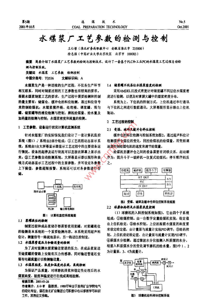 第5期選煤技術(shù)2001年10月OAL PREPARATION TECHNOLOGYOct 2001水媒漿廠工藝參數(shù)的檢測與控制王仁哲(淮北礦務(wù)局職教中心安徽省淮北市235000徐志強(qiáng)(中國曠業(yè)大學(xué)北京校區(qū)北京市100083)搞要簡要介紹了水煤漿廠工藝參數(shù)的檢測與控制技術(shù),設(shè)計(jì)了一套基于PC和工業(yè)PC的水煤漿工藝過程自動(dòng)檢測與控制系統(tǒng)關(guān)鍵詞水煤漿工藝參敷檢測控劊中圖分類號:T536文獻(xiàn)標(biāo)識碼:A水煤漿生產(chǎn)是一種連續(xù)的生產(chǎn)過程,不僅各生產(chǎn)環(huán)節(jié)14儲(chǔ)漿唯不同層位水煤菜密度的檢測相互聯(lián)系,同時(shí)對制漿過程的工藝參數(shù)也有較高的要求采用 AMDEL沉沒式密度計(jì)對儲(chǔ)漿罐不同層位水煤漿密根據(jù)水煤漿制漿工藝的要求,生產(chǎn)過程中需要檢測和控制度進(jìn)行檢測,以便及時(shí)掌握大罐中的煤漿密度分布的量主要有:儲(chǔ)煤倉、緩沖倉的料位檢測,通過料位信號系統(tǒng)為上、下位機(jī)的控制方式,上位機(jī)通過串行通訊來控制給煤機(jī);水煤漿攬拌桶、處理桶、調(diào)漿罐、混勻與下位機(jī)之間進(jìn)行數(shù)據(jù)通訊,大屏幕圖形顯示器由上位機(jī)、儲(chǔ)漿雄等的液位檢測與控制;磨機(jī)給煤量、給水量及驅(qū)動(dòng)加藥量的檢測與控制;水煤漿密度和流量的檢測,2工藝過程的控制1工藝參敗、設(shè)備運(yùn)行狀況計(jì)算機(jī)監(jiān)測系統(tǒng)21受煤、破碎及緩沖倉料位控制針對水煤漿廠的實(shí)際情況我們設(shè)計(jì)了一套計(jì)算機(jī)監(jiān)控緩沖倉的料位檢測與控制系統(tǒng)如圖2,通過超聲料位計(jì)系統(tǒng)(圖1)系統(tǒng)由2部分組成:①工藝流程動(dòng)態(tài)顯示系檢測緩沖倉煤位的變化,回控給煤機(jī)的給煤量。用變頻調(diào)統(tǒng),系統(tǒng)由1臺大屏幕顯示器顯示工藝過程中的主要設(shè)備運(yùn)速器控制給煤電機(jī)的速度來調(diào)節(jié)給煤量行情況。設(shè)備的起停及運(yùn)行狀況可以直接在屏幕上顯示出給煤機(jī)至緩沖倉之間的設(shè)備需要有閉鎖關(guān)系,起動(dòng)順來.②工藝參數(shù)自動(dòng)檢測系統(tǒng)。大屏幕顯示器以圖形和曲序?yàn)?提升斗子→破碎機(jī)→往復(fù)式給煤機(jī);停車順序則反線方式動(dòng)態(tài)顯示工藝過程中的主要參數(shù),并可設(shè)定各參數(shù)之。上下限值,參數(shù)超限報(bào)警,系統(tǒng)還可以對各參數(shù)進(jìn)行存[蟻碳惆國升斗[交頻圖ILT LNIT圖形M示器料計(jì)圖2受煤、破碎及緩沖倉料位控制系統(tǒng)框圖PLC輸出繼電器框22球彥機(jī)料及水煤漿濃度控制圖I計(jì)算機(jī)監(jiān)控系統(tǒng)籥圖(1)球磨機(jī)的入料控制系統(tǒng)如圖3,它由四個(gè)子系統(tǒng)11漿液位的撿測組成:①給煤控制。由一臺數(shù)字定量給煤機(jī)實(shí)現(xiàn),給定值制漿過程和成品漿儲(chǔ)存都需要使用漿罐,對漿罐液位由上位機(jī)給定:②給水控制,上位機(jī)根據(jù)水煤漿的濃度要的檢測是本系統(tǒng)的一個(gè)重要檢測內(nèi)容,本系統(tǒng)采用超聲料設(shè)定給定值,由計(jì)量泵與流量計(jì)實(shí)現(xiàn)PD調(diào)節(jié):⑧給藥控位計(jì)。測量信號一路就地顯示,另一路送往控制室。12水煤漿管道壓力和輸送的檢測④原煤水分檢測。通過微波水分儀檢測入料原煤的水分,為了及時(shí)監(jiān)測水煤漿輸送管道的壓力,在成品漿泵送根據(jù)入料原煤水分的變化調(diào)節(jié)磨機(jī)的給水量。圖3中1、2至儲(chǔ)漿罐的管路上安裝有壓力傳感器,同時(shí)輸送管道還安為計(jì)量象,3.4為流重計(jì),裝有電磁流量計(jì)以檢測輸送量。13水媒漿粘度,濃度和溫度的在線、離線檢測為保證產(chǎn)品質(zhì)量,對球磨機(jī)排漿和穩(wěn)定性處理后的水煤漿濃度、粘度和溫度進(jìn)行在線或離線檢測收稿日期:200140|-26作者筒介:王仁副教,1988年畢業(yè)于淮南礦業(yè)學(xué)院電氣I機(jī)自動(dòng)化專業(yè),現(xiàn)在淮北礦業(yè)集團(tuán)公司職教中恐從事教學(xué)與科研工作,發(fā)表論文多篇圖3球機(jī)給料閉環(huán)控制系統(tǒng)選煤技術(shù)200】年10月COAL PREPARATION TECHNOLOGYOt200】水煤漿工程電氣系統(tǒng)設(shè)計(jì)王秋記李明海齊明強(qiáng)(邢臺礦業(yè)(集團(tuán))公司東龐礦洗煤廠河北省那臺市054201)事少幸(天地科技股份有限公司唐山分公司河北省唐山市063012)摘要介紹了東龐礦水堞漿廠供配電、控制、監(jiān)測等系統(tǒng)的設(shè)計(jì)、安裝及調(diào)試過程的經(jīng)驗(yàn),關(guān)鍵詞水煤漿廠供配電控制監(jiān)測中圖分類號:T536文獻(xiàn)標(biāo)識碼:A邢臺礦業(yè)集團(tuán)公司東龐礦199年1月建成年產(chǎn)18萬中球磨機(jī)內(nèi)裝有44鋼球,加上待磨漿體,磨機(jī)屬重載起型水煤漿廠·二期擴(kuò)建能力可達(dá)到50萬t,現(xiàn)已生產(chǎn)出合格動(dòng)設(shè)備,設(shè)計(jì)院與球磨機(jī)廠家一般選用繞線式交流電動(dòng)成品漿,供北京燕山石化燃油鍋爐燃料。筆者就水煤漿工機(jī)從實(shí)際運(yùn)行看,球磨機(jī)負(fù)荷率在65%以下,6kV程電氣系統(tǒng)設(shè)計(jì)、安裝、調(diào)試談一些體會(huì)630kW電機(jī)額定電流797A,起動(dòng)電流為480A.一般廠礦高壓系統(tǒng)母線容量較大,能滿足鼠籠電機(jī)直接